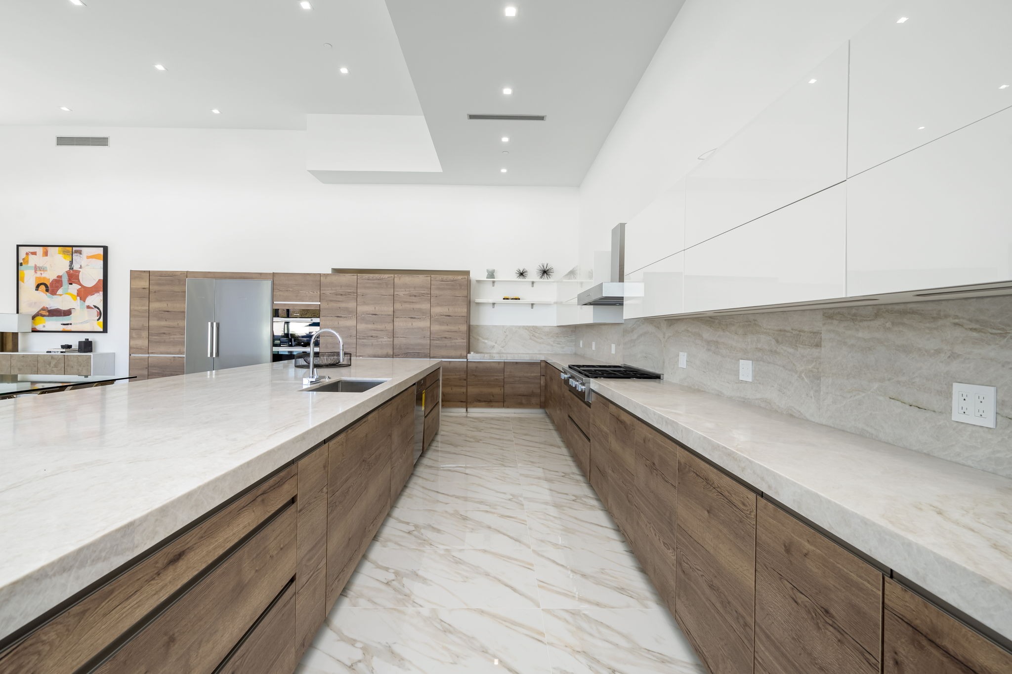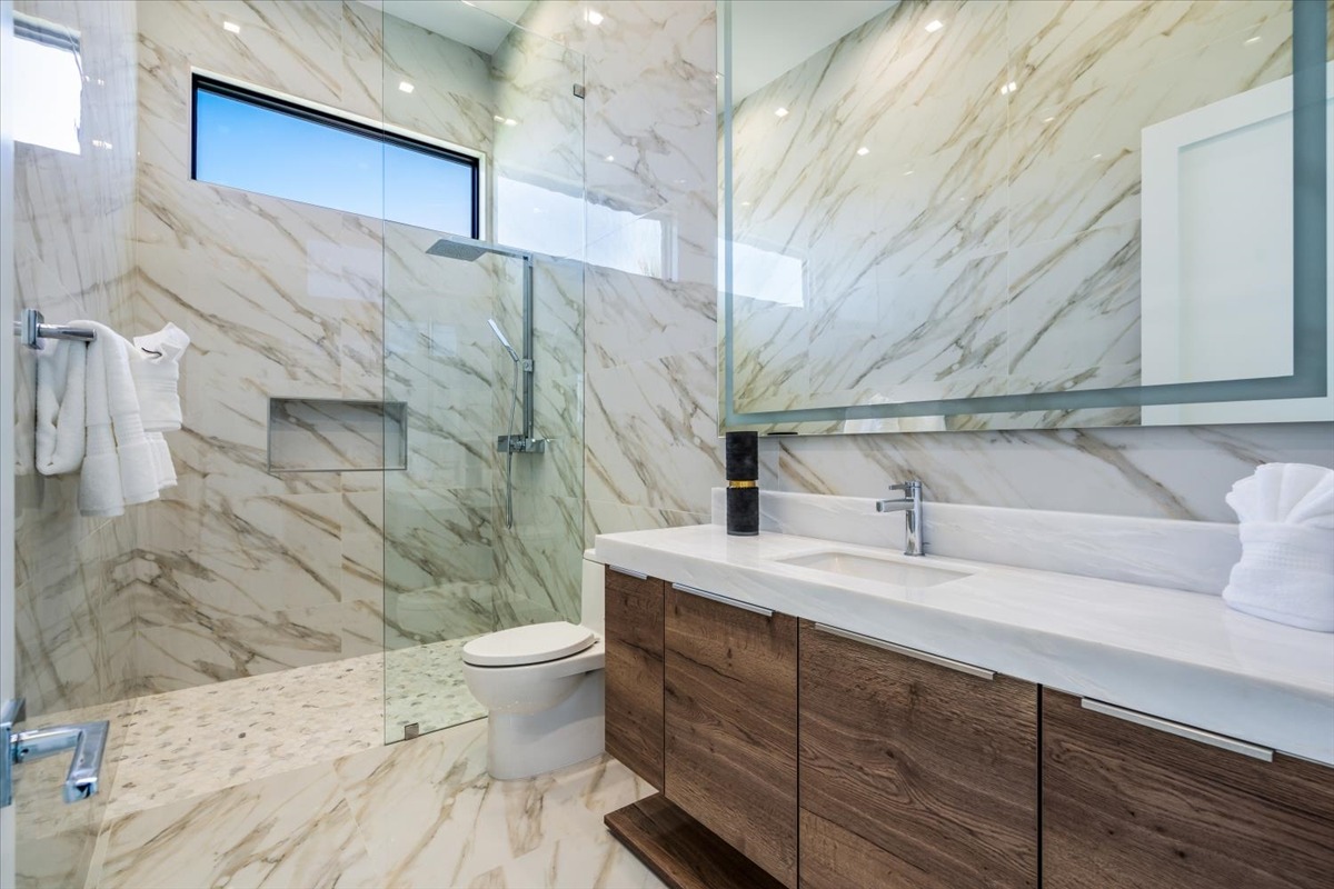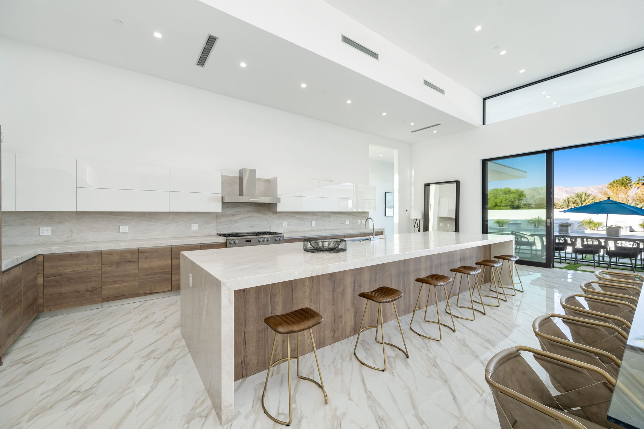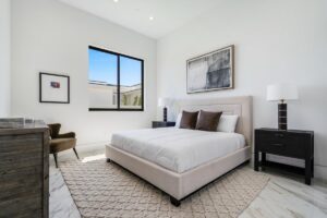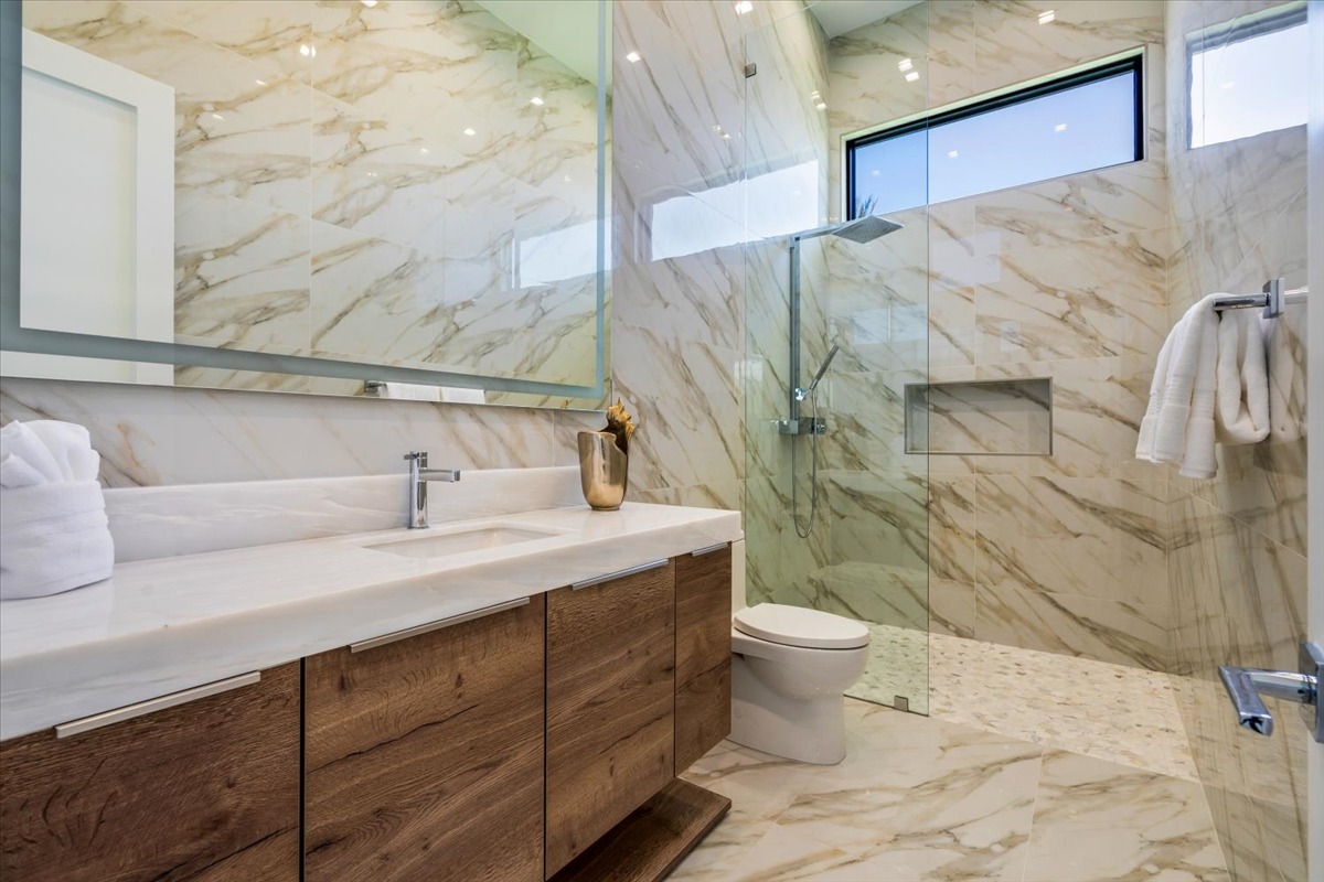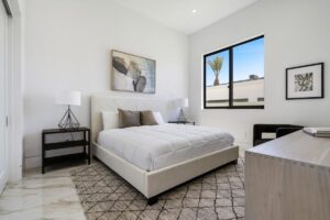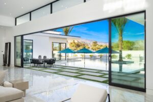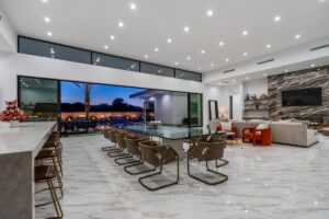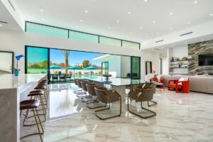 Every residence hosts a massive custom swimming pool and spa, sunken fire pit and BBQ areas, chic contemporary style with walls of glass and slideaway Fleetwood doors, oversized great room with 16′ ceilings, 12′ ceilings in other living areas and bedrooms, gorgeous floor tiles imported from Spain, and stunning open kitchens with European cabinetry and top-of-the-line Miele appliances. Every bedroom is a suite, complete with a private bath and large closet. Primary suites elevate personal luxury to new heights, with outdoor access, walk-in multi-head showers, freestanding tubs, and oversized walk-in closets with Italian-made custom built-ins.