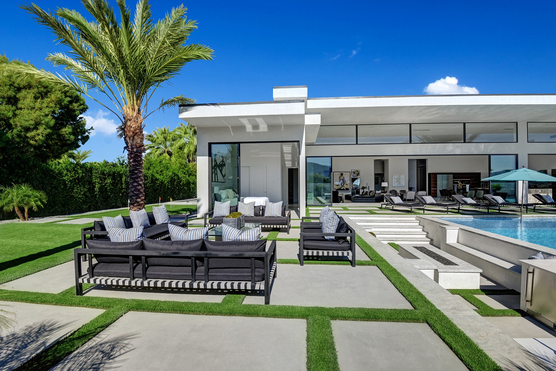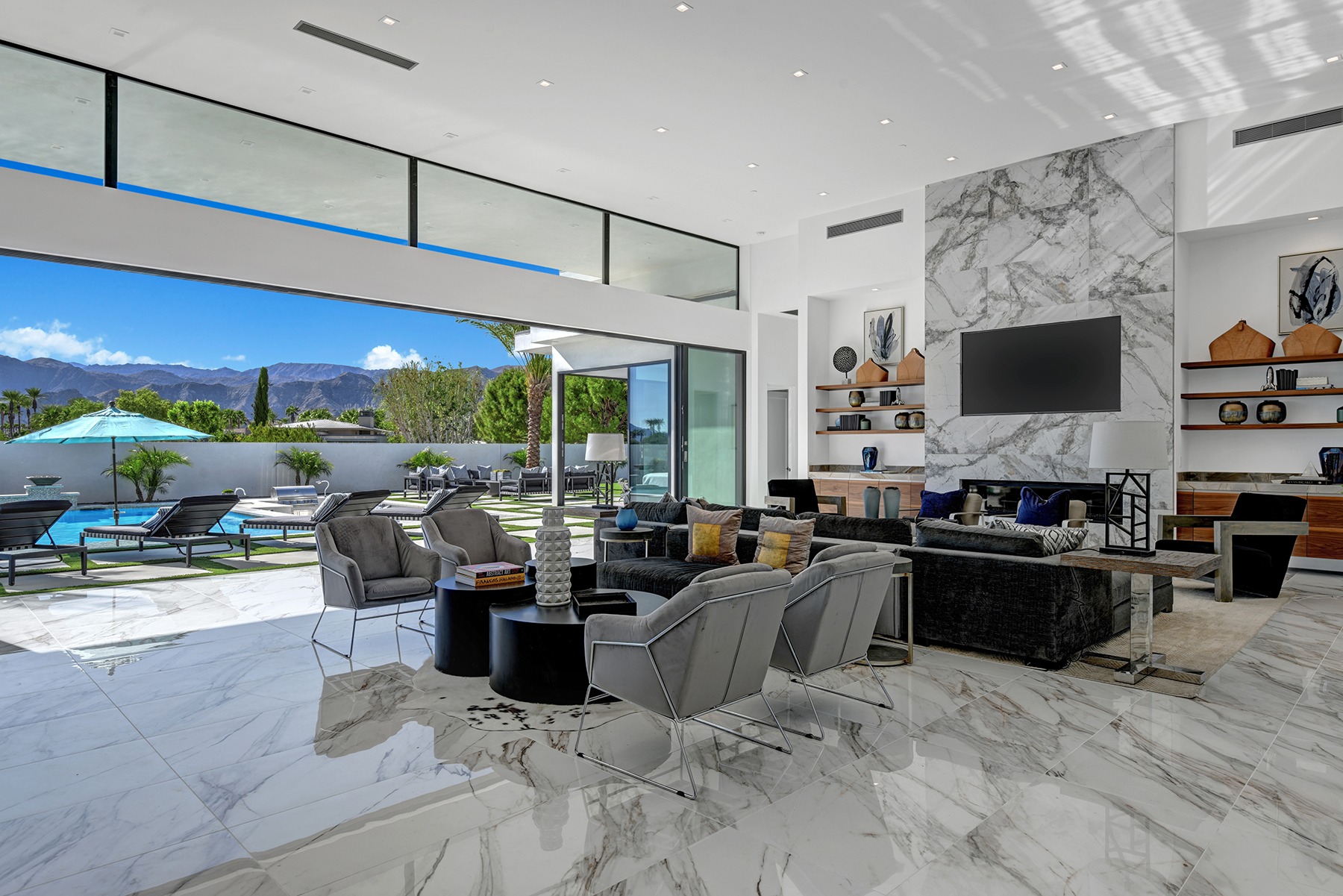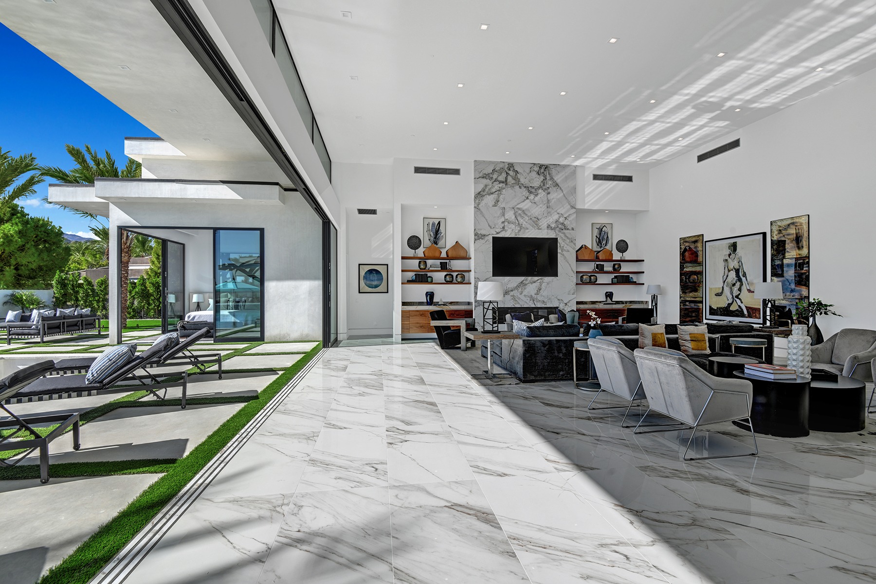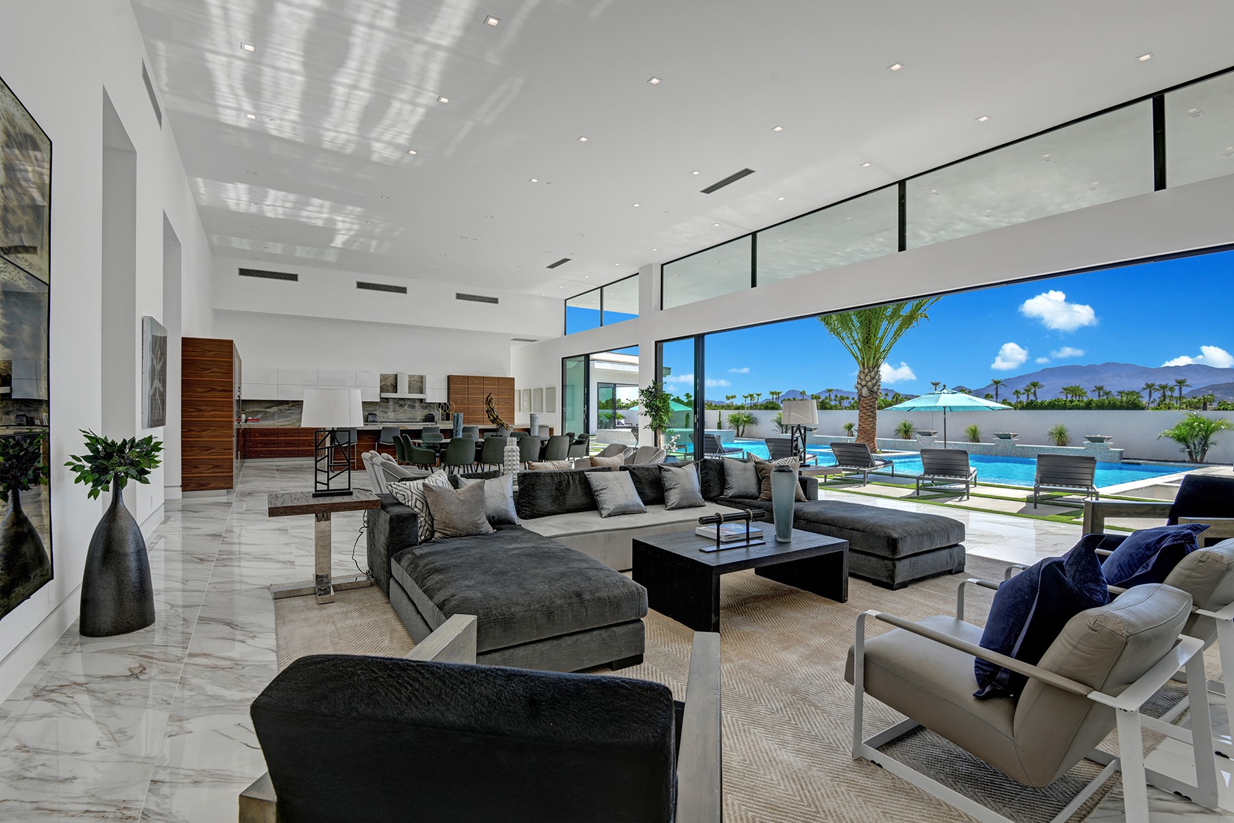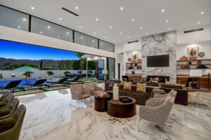 Introduced by an elegant gated courtyard, this single-level estate features an oversized pool with two tiled Baja shelves and a step-down bar area with fire pit. A putting green and bocce ball court. A pivoting glass entry door opens to an equally impressive interior with soaring ceilings, walls of fold-away glass doors, gorgeous polished marble imported from Spain, and sleek custom cabinetry imported from Germany and Hansgroge fixtures in all bathrooms and kitchen. A gallery-sized great room with dramatic linear fireplace provides space for grand-scale entertaining that opens to the kitchen, backyard, and resort pool and spa. Enjoy 6 ensuite bedrooms and 6.5 baths in approximately 4,900 square feet, including Fleetwood doors and windows, Miele appliances including built-in coffee stations, smart-home lighting and communications systems, primary suite walk-in closets with built-in Italian cabinetry, illuminated bath mirrors, solar power and 3-car garages with epoxy flooring.This prestigious residential collection is moments from The Ritz-Carlton Resort & Spa, Sunnylands, Palm Springs International Airport, and luxury shopping and fine dining.17