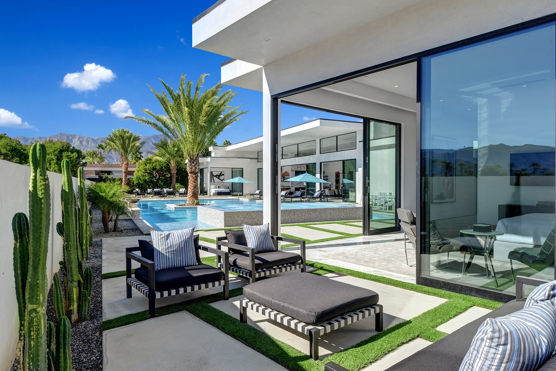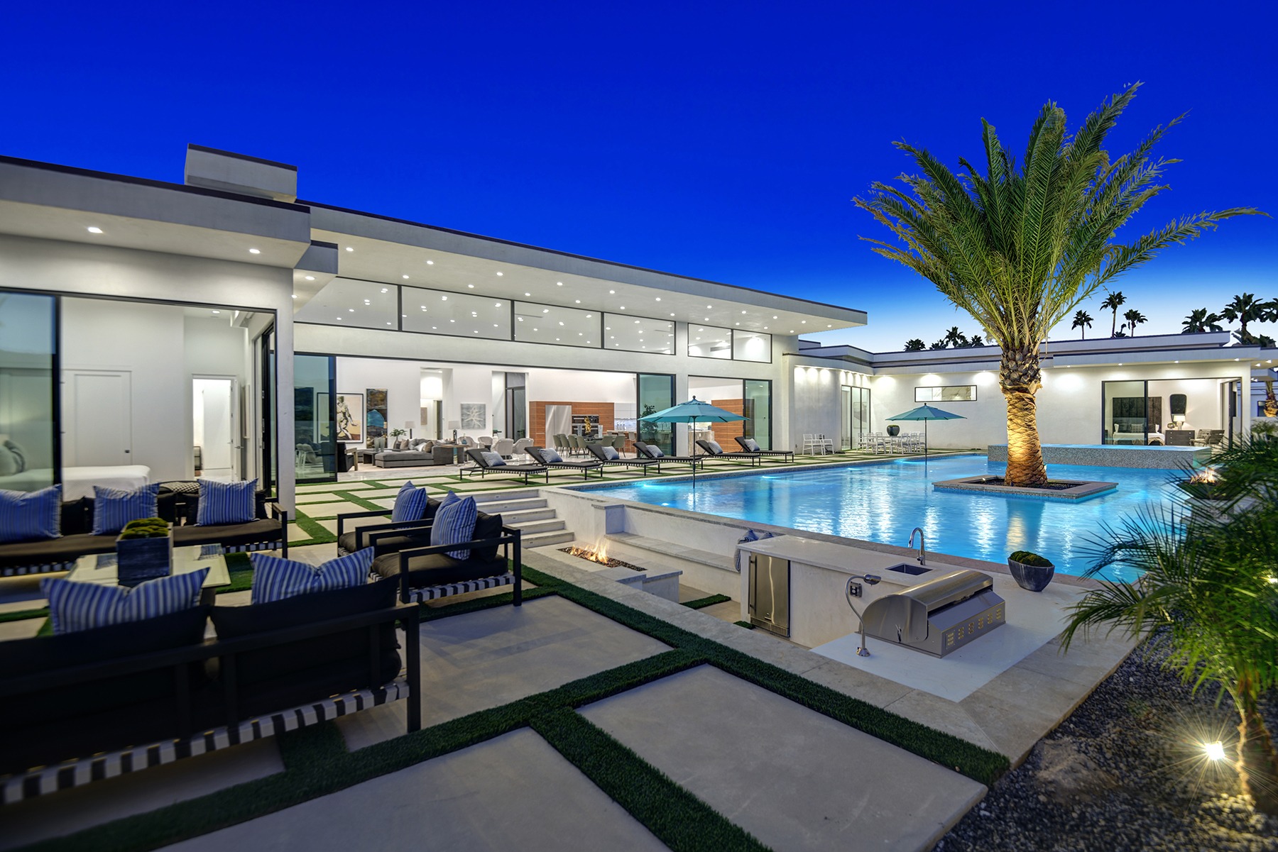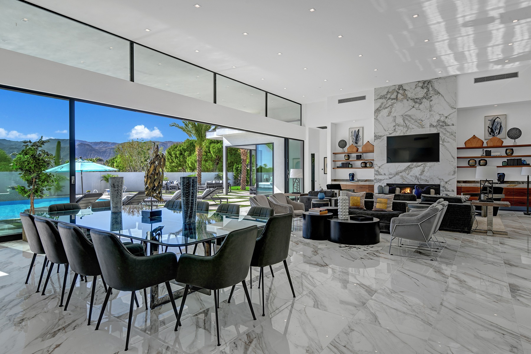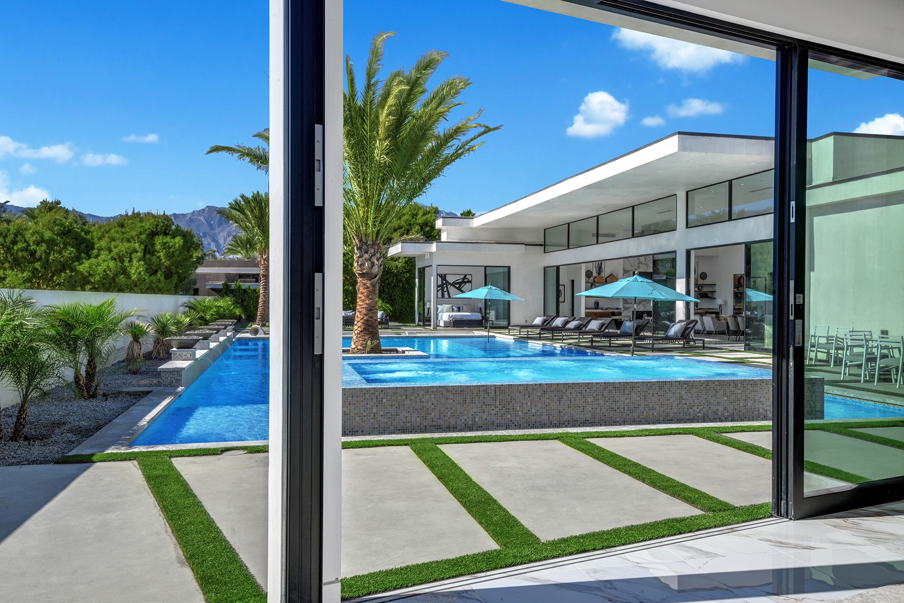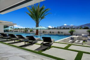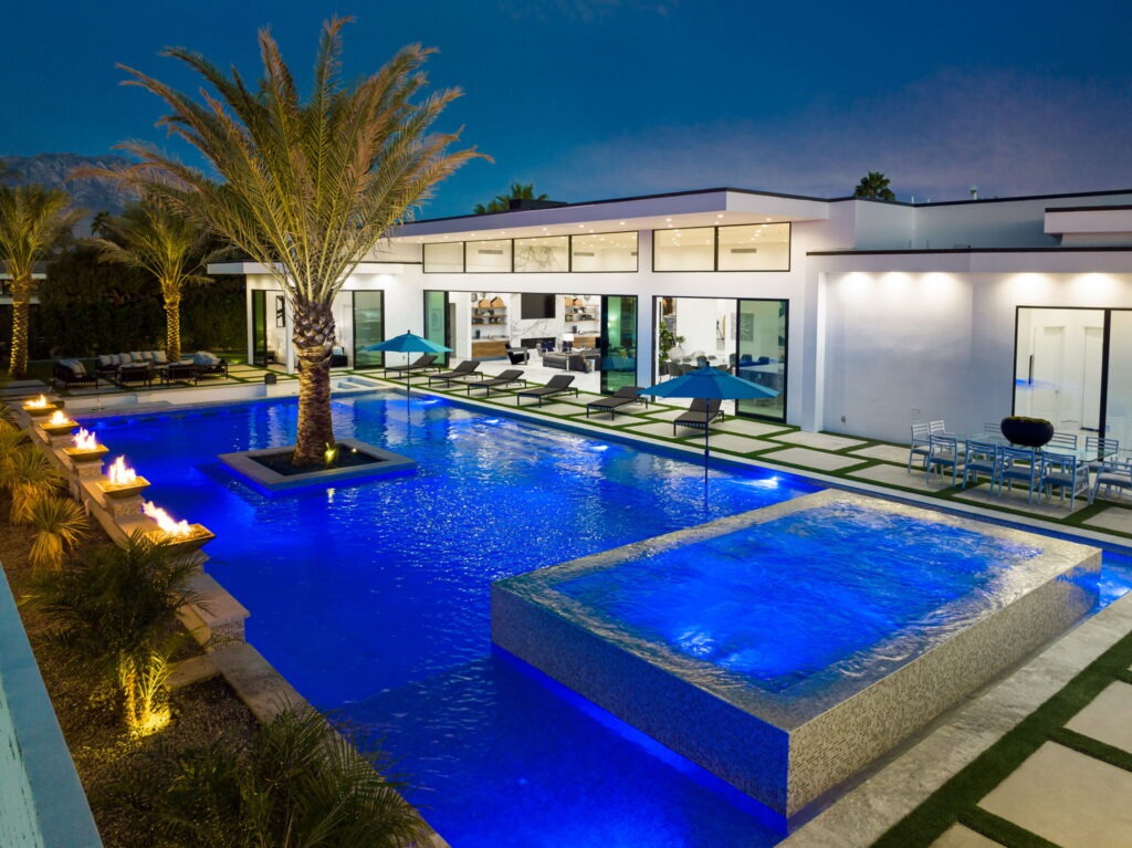 Introduced by an elegant gated courtyard, this single-level estate features an oversized pool with two tiled Baja shelves and a step-down bar area with fire pit. A putting green and bocce ball court. A pivoting glass entry door opens to an equally impressive interior with soaring ceilings, walls of fold-away glass doors, gorgeous polished marble imported from Spain, and sleek custom cabinetry imported from Germany and Hansgroge fixtures in all bathrooms and kitchen. A gallery-sized great room with dramatic linear fireplace provides space for grand-scale entertaining that opens to the kitchen, backyard, and resort pool and spa. Enjoy 6 ensuite bedrooms and 6.5 baths in approximately 4,900 square feet, including Fleetwood doors and windows, Miele appliances including built-in coffee stations, smart-home lighting and communications systems, primary suite walk-in closets with built-in Italian cabinetry, illuminated bath mirrors, solar power and 3-car garages with epoxy flooring.This prestigious residential collection is moments from The Ritz-Carlton Resort & Spa, Sunnylands, Palm Springs International Airport, and luxury shopping and fine dining.17