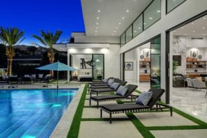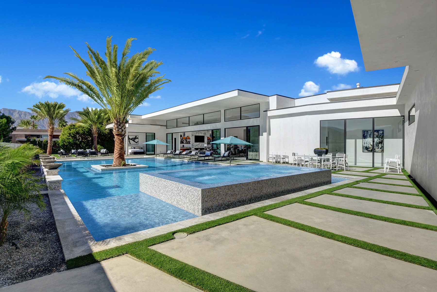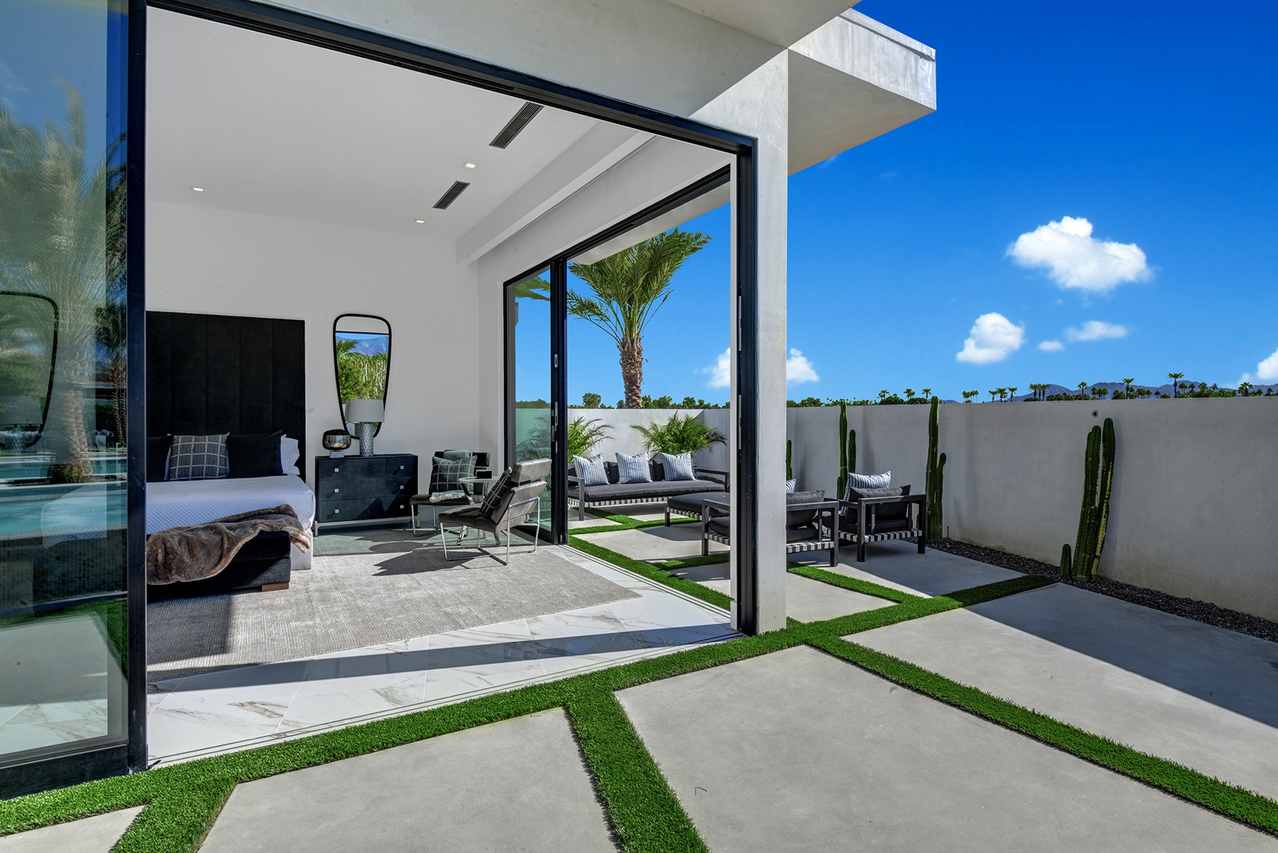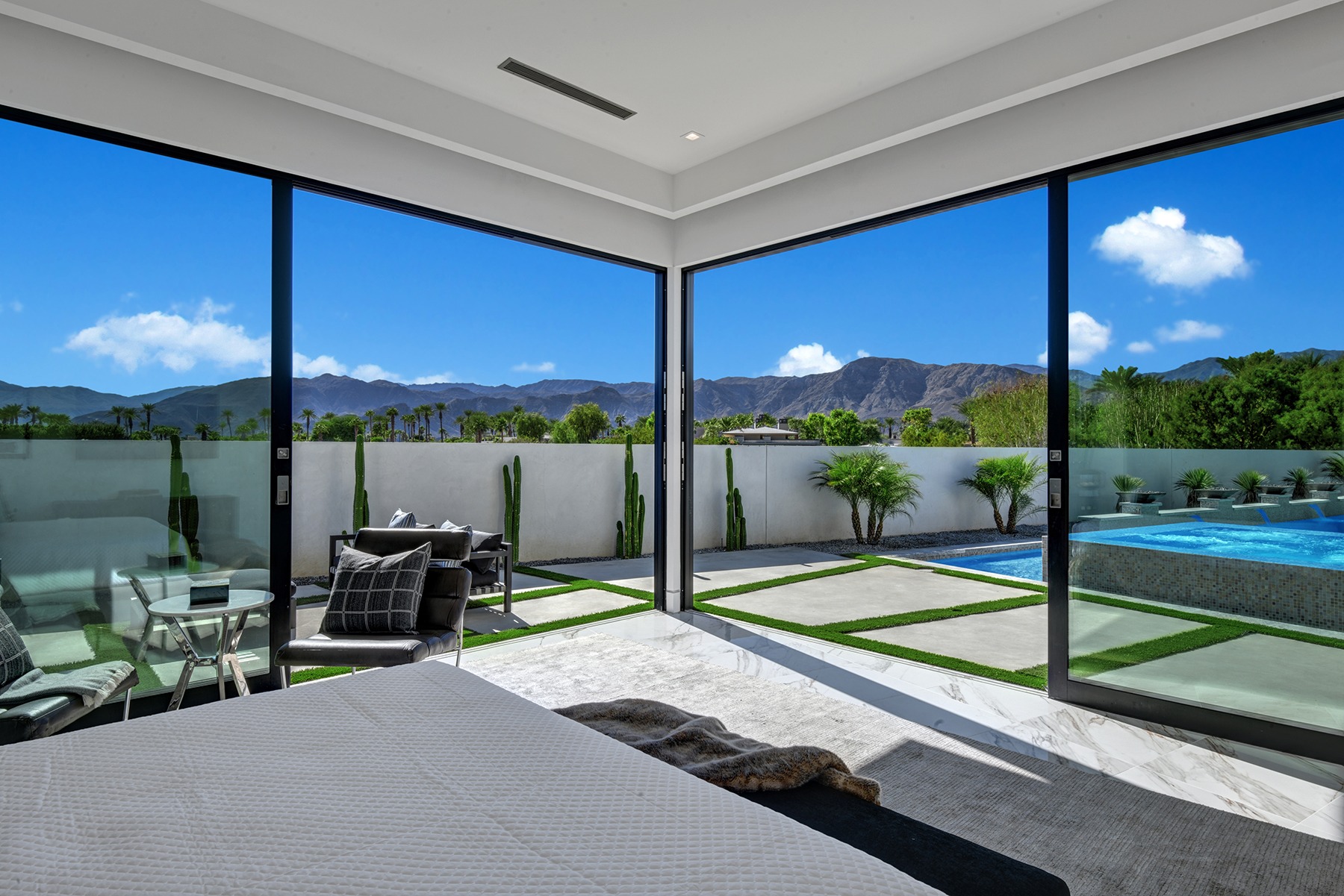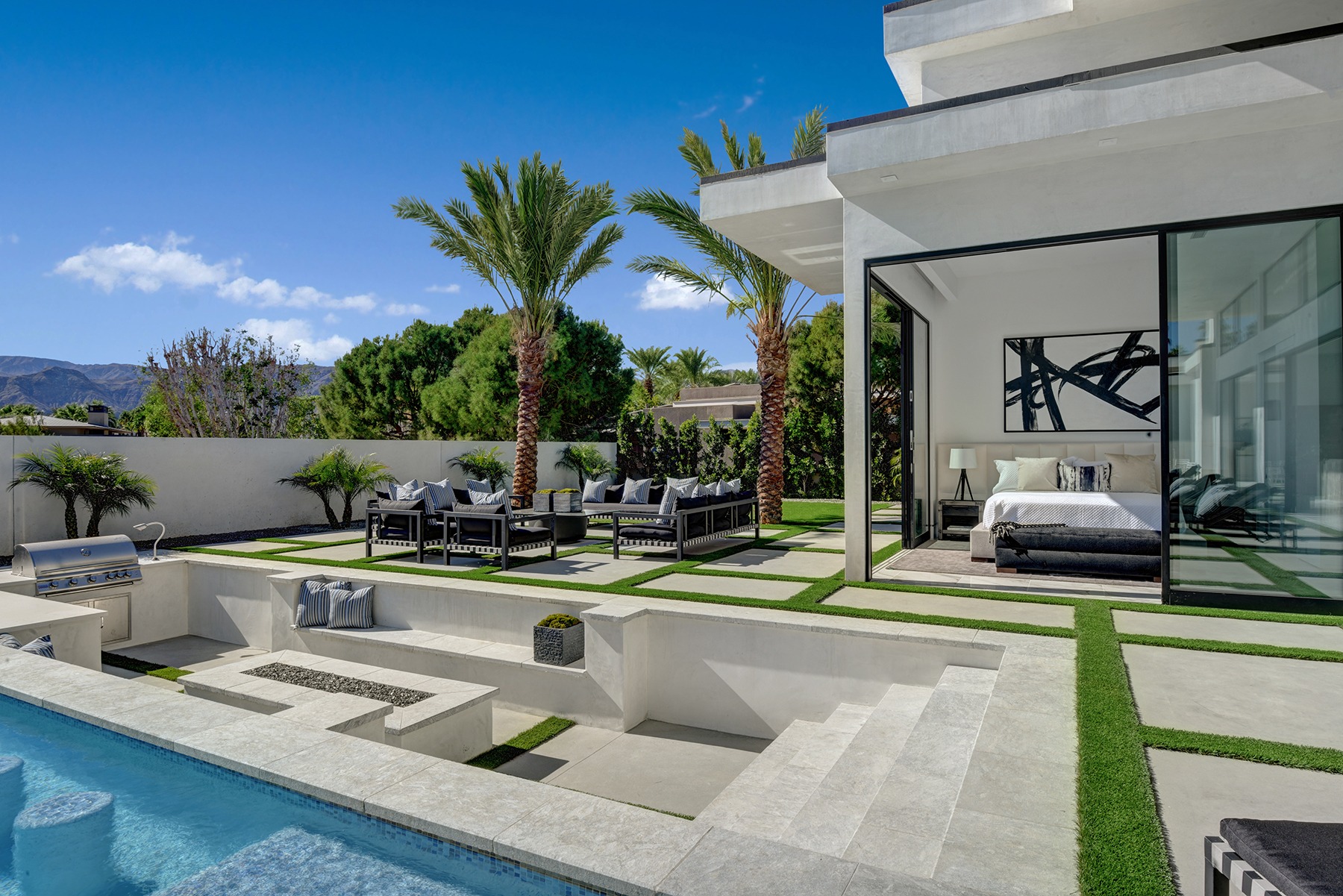 Introduced by an elegant gated courtyard, this single-level estate features an oversized pool with two tiled Baja shelves and a step-down bar area with fire pit. A putting green and bocce ball court. A pivoting glass entry door opens to an equally impressive interior with soaring ceilings, walls of fold-away glass doors, gorgeous polished marble imported from Spain, and sleek custom cabinetry imported from Germany and Hansgroge fixtures in all bathrooms and kitchen. A gallery-sized great room with dramatic linear fireplace provides space for grand-scale entertaining that opens to the kitchen, backyard, and resort pool and spa. Enjoy 6 ensuite bedrooms and 6.5 baths in approximately 4,900 square feet, including Fleetwood doors and windows, Miele appliances including built-in coffee stations, smart-home lighting and communications systems, primary suite walk-in closets with built-in Italian cabinetry, illuminated bath mirrors, solar power and 3-car garages with epoxy flooring.This prestigious residential collection is moments from The Ritz-Carlton Resort & Spa, Sunnylands, Palm Springs International Airport, and luxury shopping and fine dining.17
