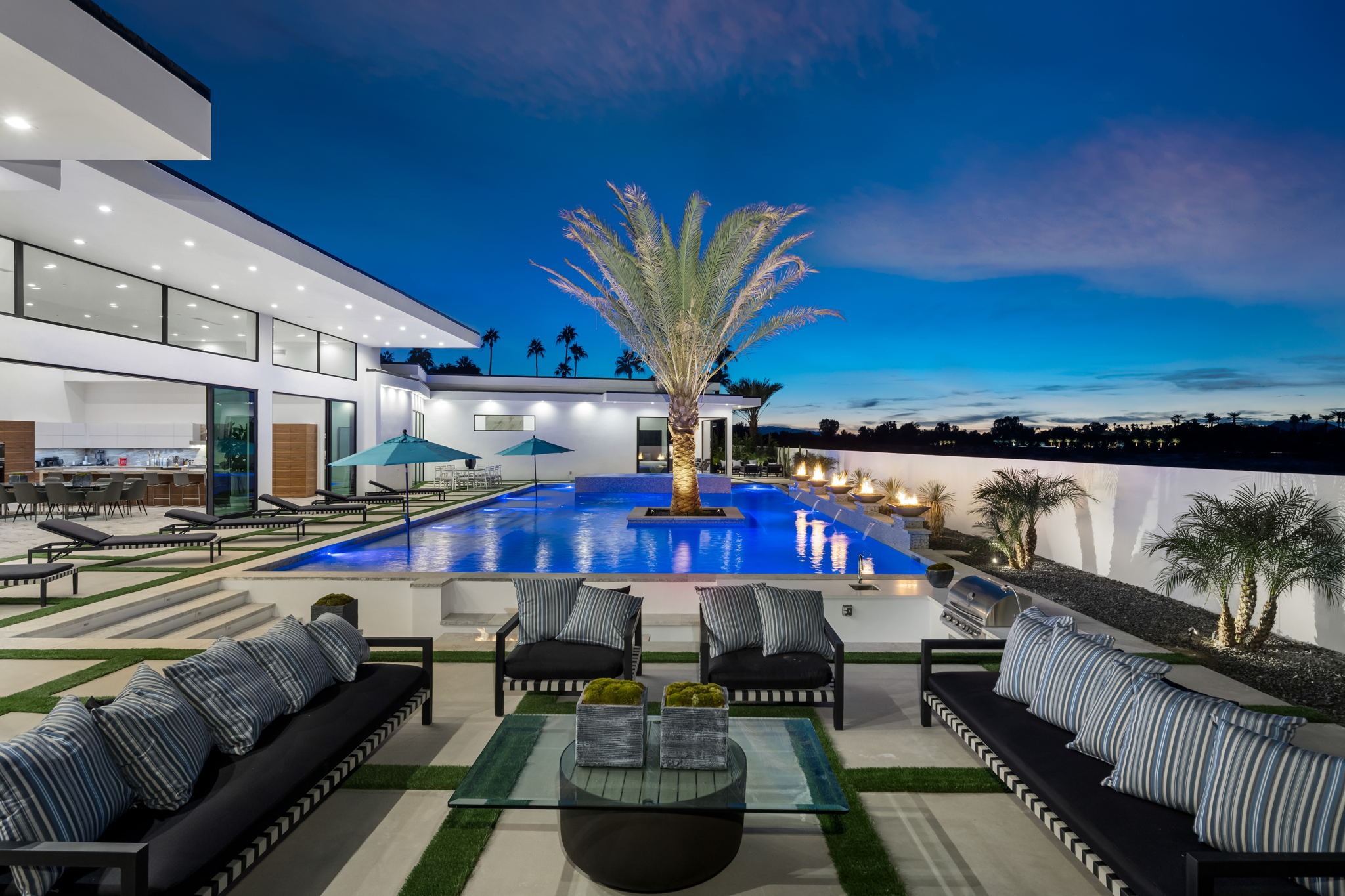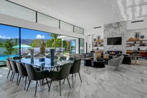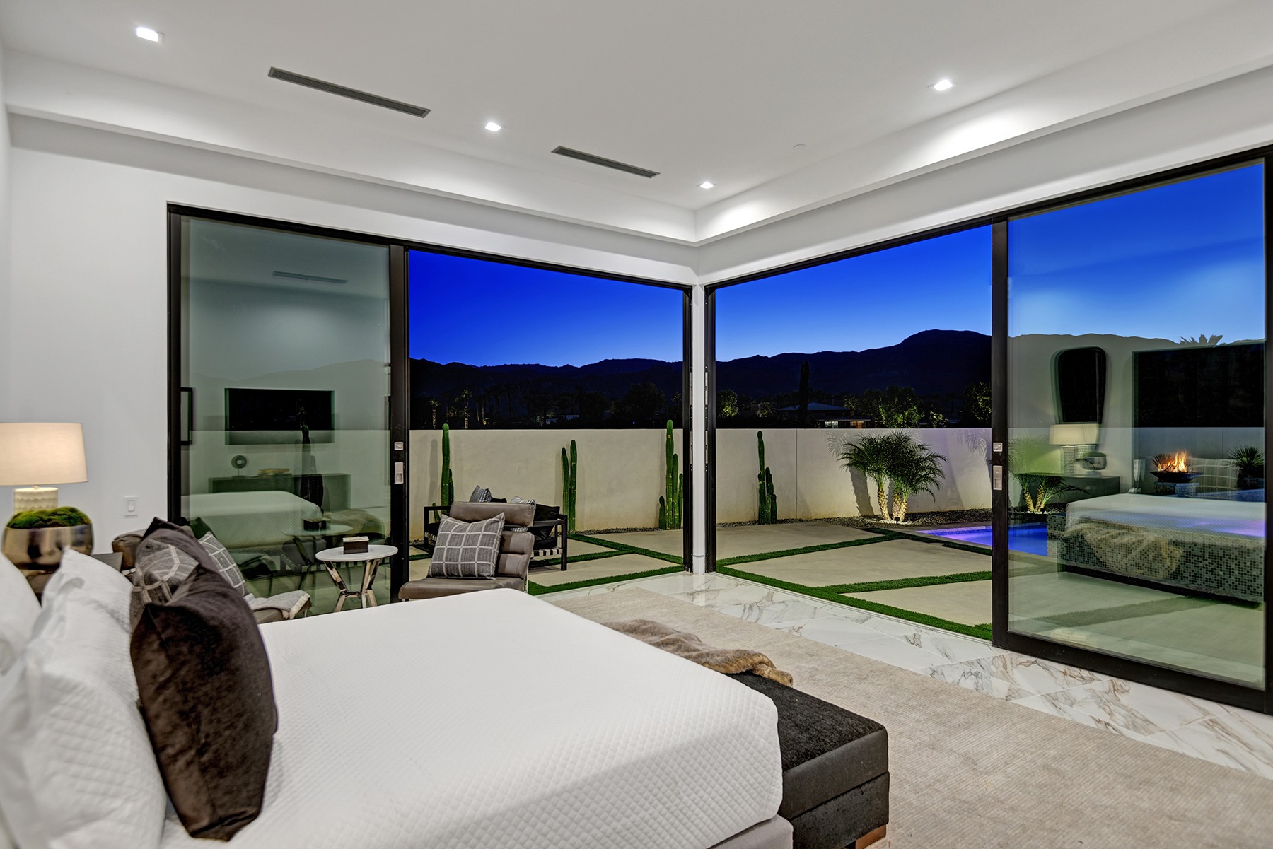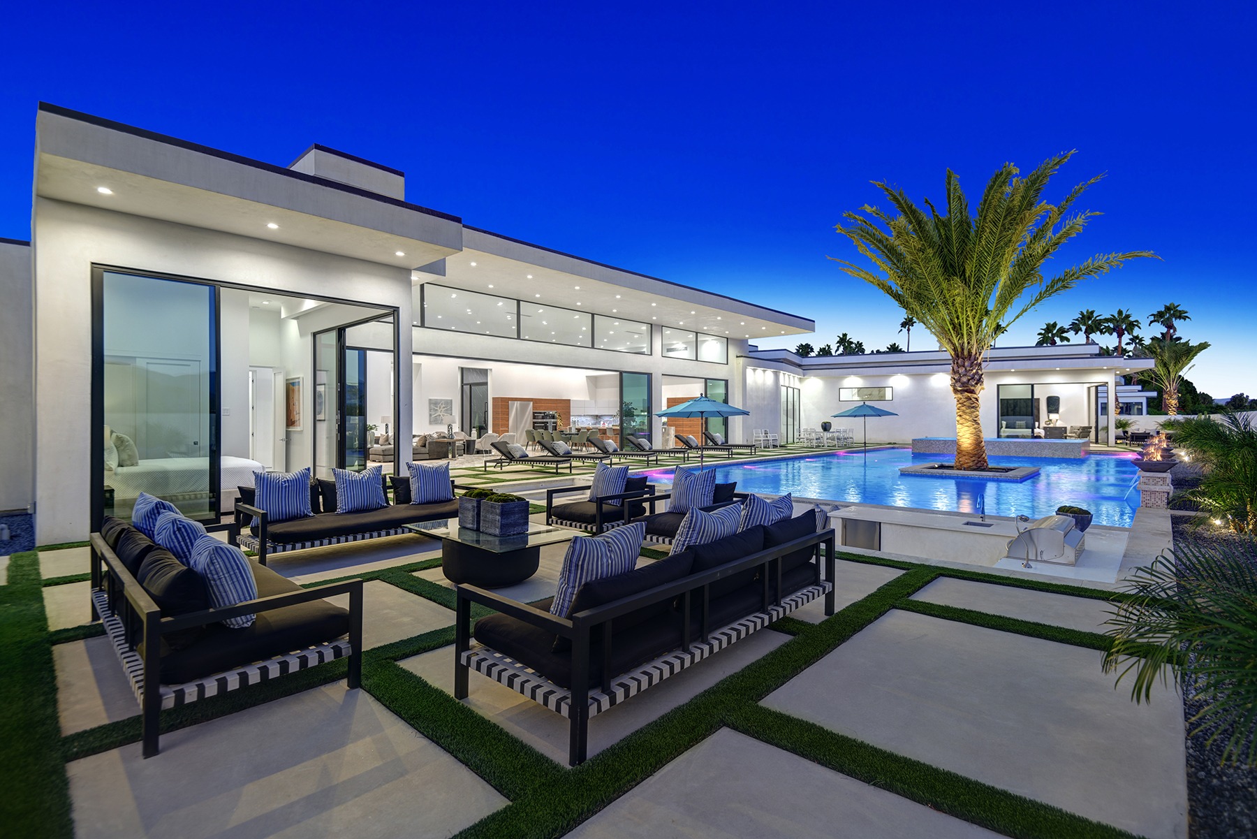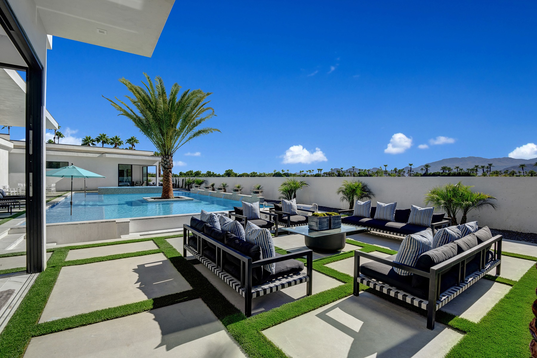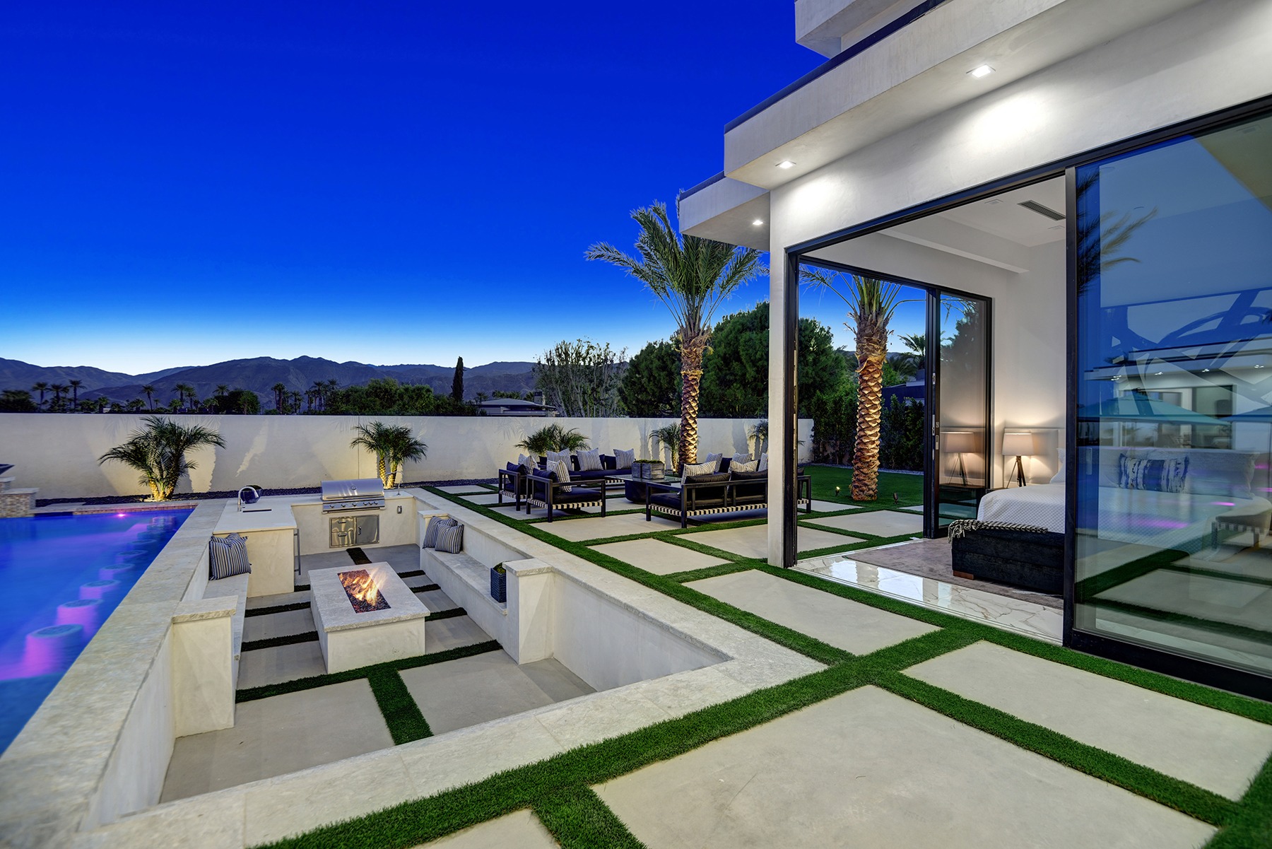 Introduced by an elegant gated courtyard, this single-level estate features an oversized pool with two tiled Baja shelves and a step-down bar area with fire pit. A putting green and bocce ball court. A pivoting glass entry door opens to an equally impressive interior with soaring ceilings, walls of fold-away glass doors, gorgeous polished marble imported from Spain, and sleek custom cabinetry imported from Germany and Hansgroge fixtures in all bathrooms and kitchen. A gallery-sized great room with dramatic linear fireplace provides space for grand-scale entertaining that opens to the kitchen, backyard, and resort pool and spa. Enjoy 6 ensuite bedrooms and 6.5 baths in approximately 4,900 square feet, including Fleetwood doors and windows, Miele appliances including built-in coffee stations, smart-home lighting and communications systems, primary suite walk-in closets with built-in Italian cabinetry, illuminated bath mirrors, solar power and 3-car garages with epoxy flooring.This prestigious residential collection is moments from The Ritz-Carlton Resort & Spa, Sunnylands, Palm Springs International Airport, and luxury shopping and fine dining.17