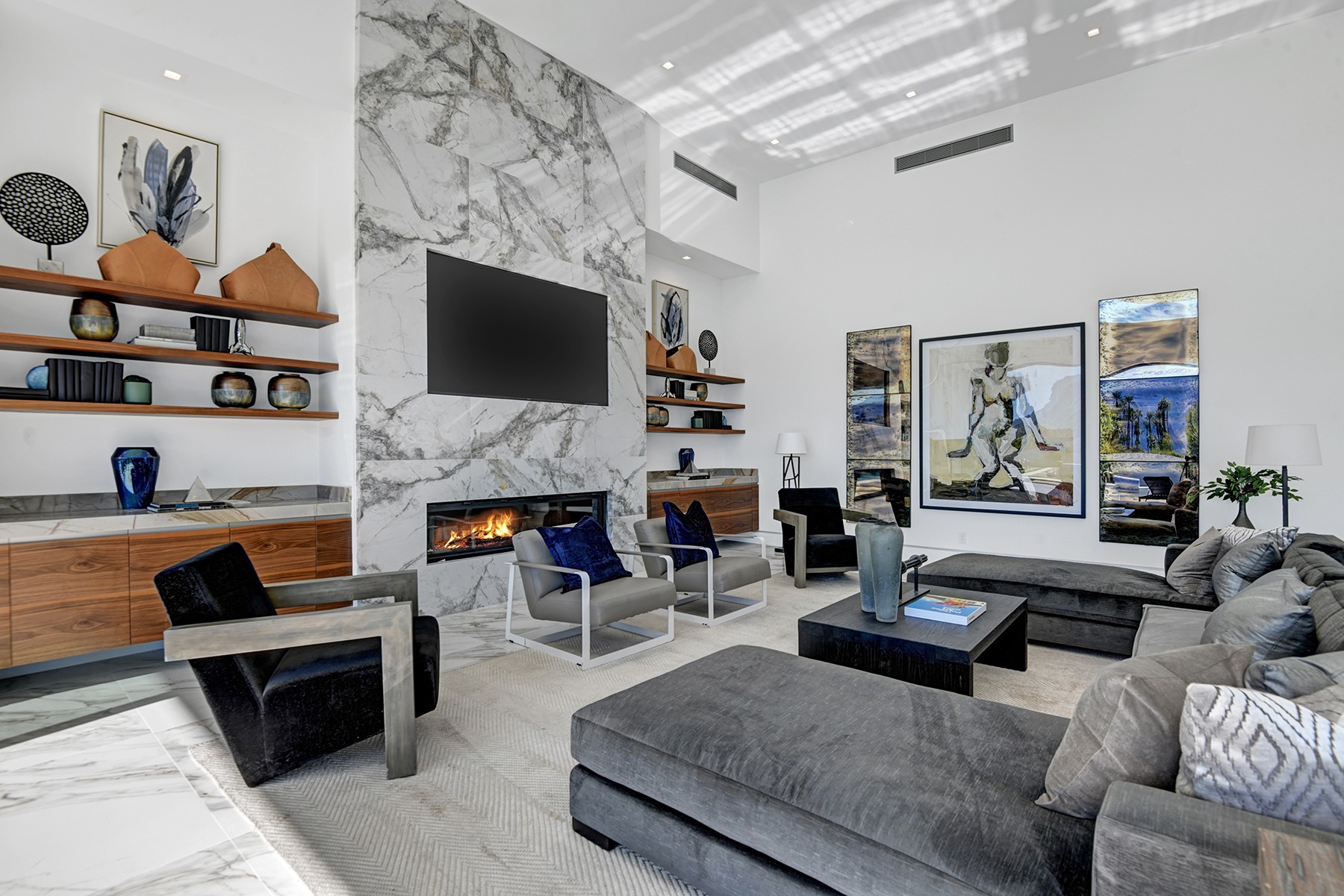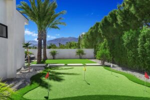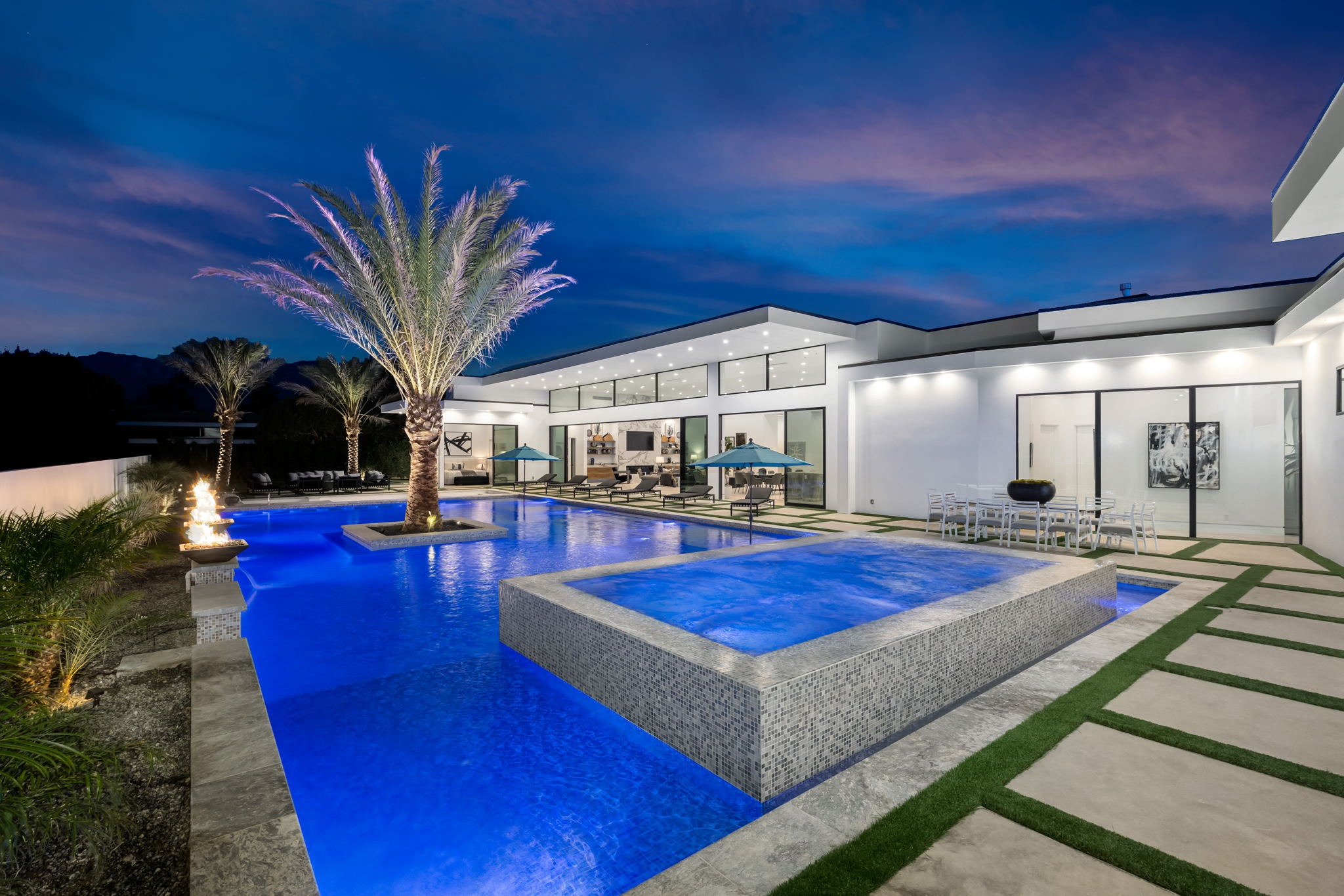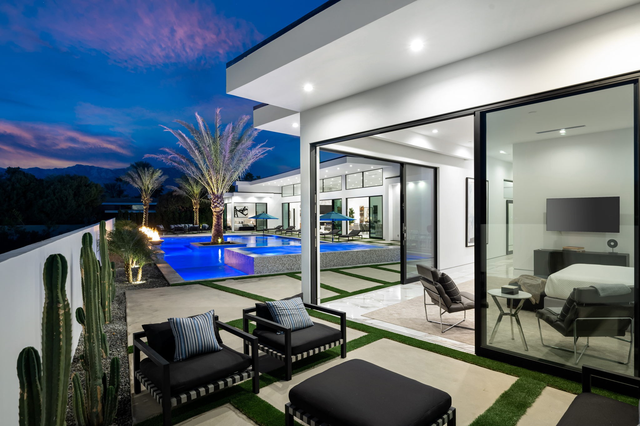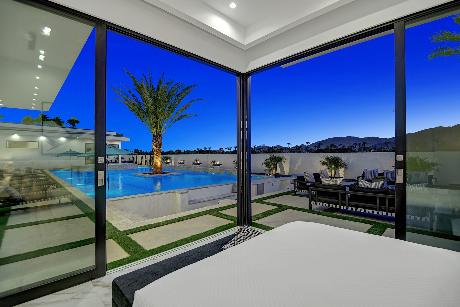 Introduced by an elegant gated courtyard, this single-level estate features an oversized pool with two tiled Baja shelves and a step-down bar area with fire pit. A putting green and bocce ball court. A pivoting glass entry door opens to an equally impressive interior with soaring ceilings, walls of fold-away glass doors, gorgeous polished marble imported from Spain, and sleek custom cabinetry imported from Germany and Hansgroge fixtures in all bathrooms and kitchen. A gallery-sized great room with dramatic linear fireplace provides space for grand-scale entertaining that opens to the kitchen, backyard, and resort pool and spa. Enjoy 6 ensuite bedrooms and 6.5 baths in approximately 4,900 square feet, including Fleetwood doors and windows, Miele appliances including built-in coffee stations, smart-home lighting and communications systems, primary suite walk-in closets with built-in Italian cabinetry, illuminated bath mirrors, solar power and 3-car garages with epoxy flooring.This prestigious residential collection is moments from The Ritz-Carlton Resort & Spa, Sunnylands, Palm Springs International Airport, and luxury shopping and fine dining.17