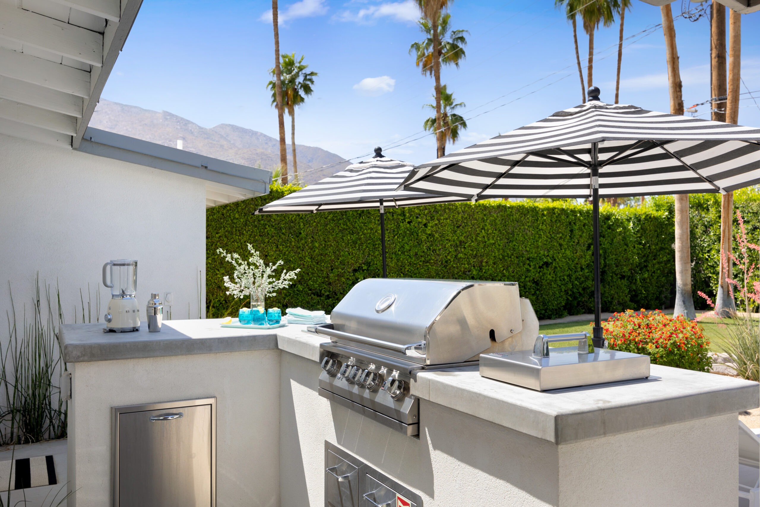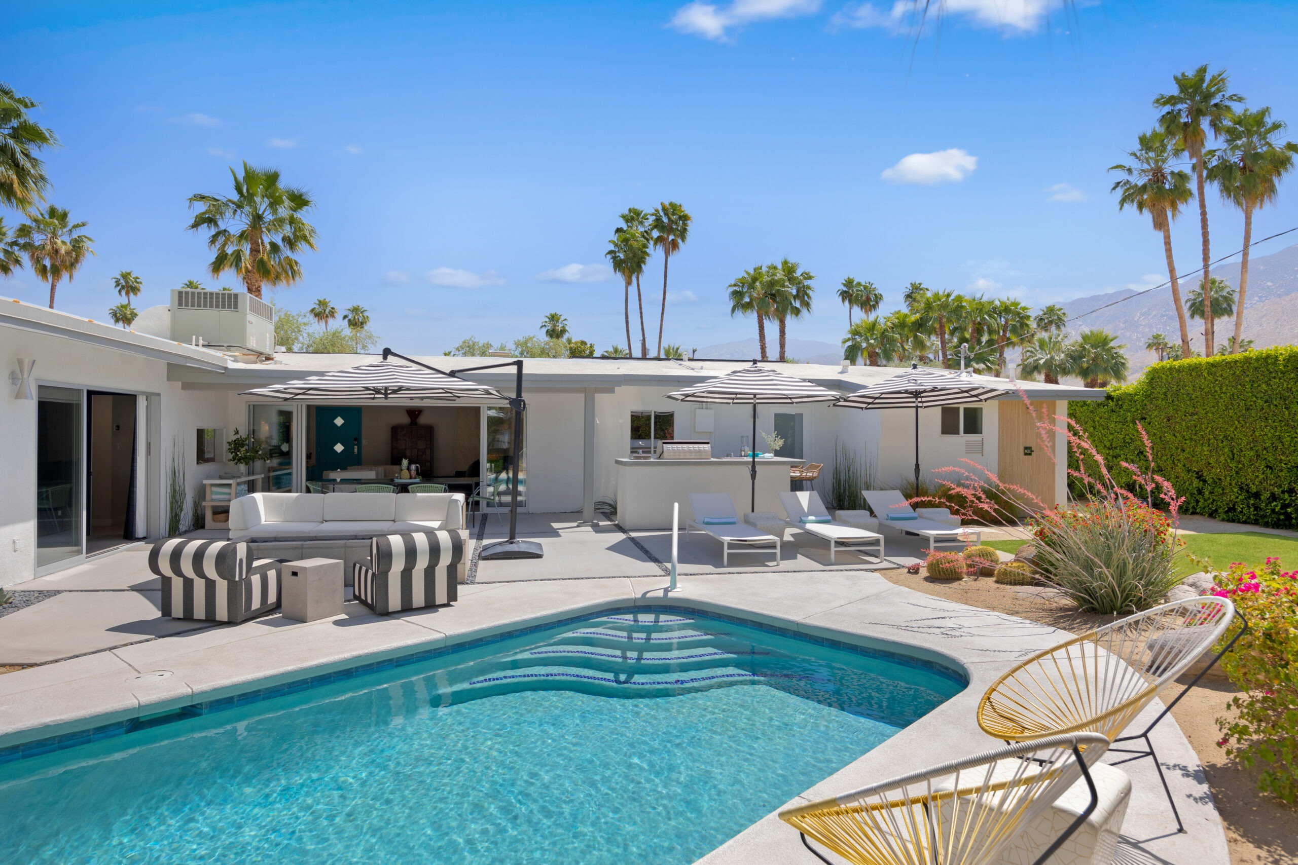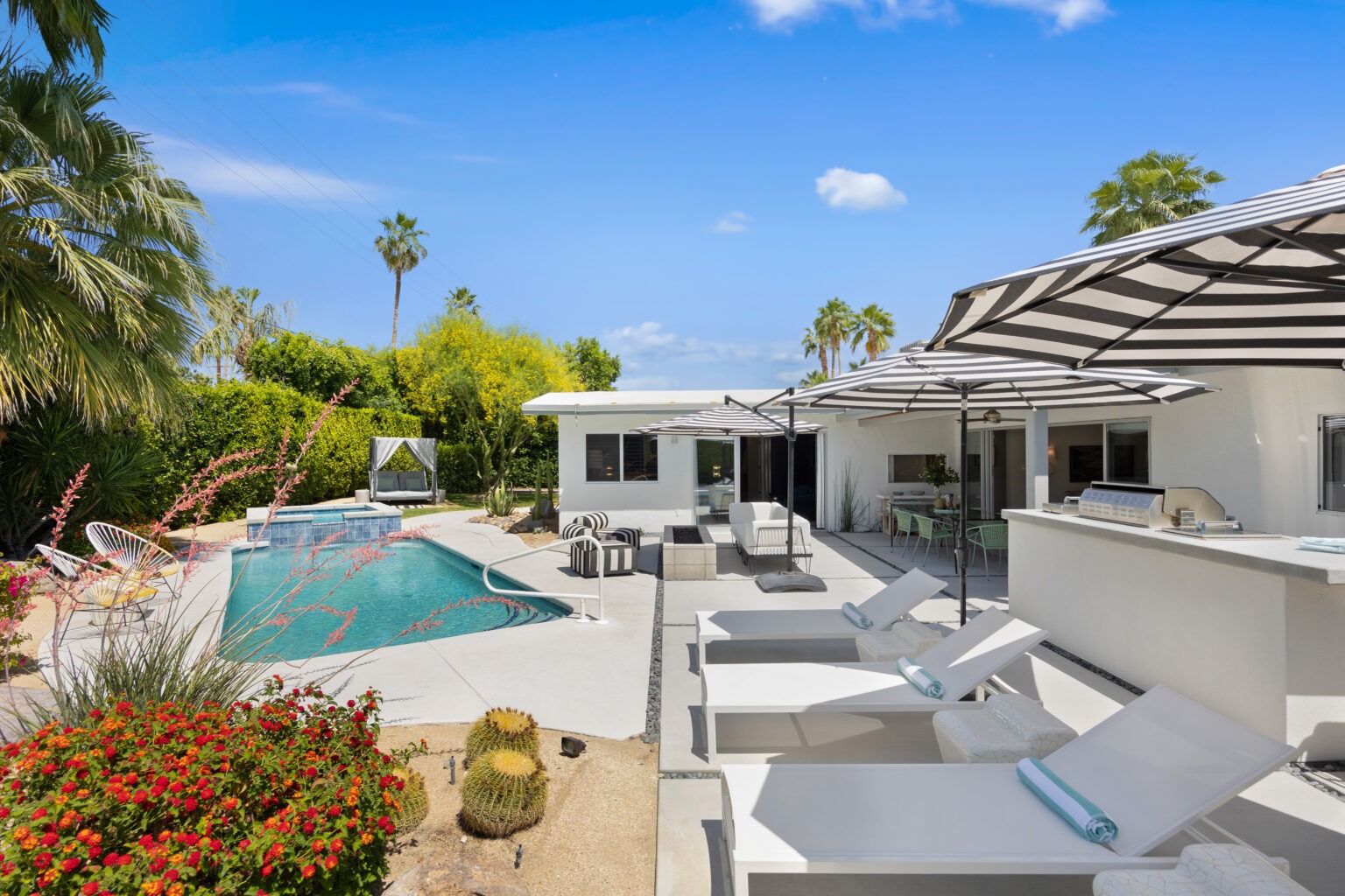 In the living room, you will find a wall of disappearing glass doors that open to seamlessly blend the ultimate indoor/outdoor lifestyle. This truly creates an experience that one comes to Palm Springs for — blue skies, sparkling pools, and fabulous weather! The primary bedroom also has a wall of disappearing glass doors that open to breathtaking views of the San Jacinto Mountains. Once on the patio, you will find a truly stunning outdoor living space with multiple seating vignettes throughout the yard. The partially-covered patio opens to a large outdoor dining table, the outdoor kitchen area, bar, towel storage, comfortable sofa seating, and dual club chairs surrounding the fire-pit. Just steps away is the sparkling saltwater pool, spa, and outdoor shower. The pool loungers, umbrellas, and Acapulco chairs provide relaxing options for sun or shade lounging.