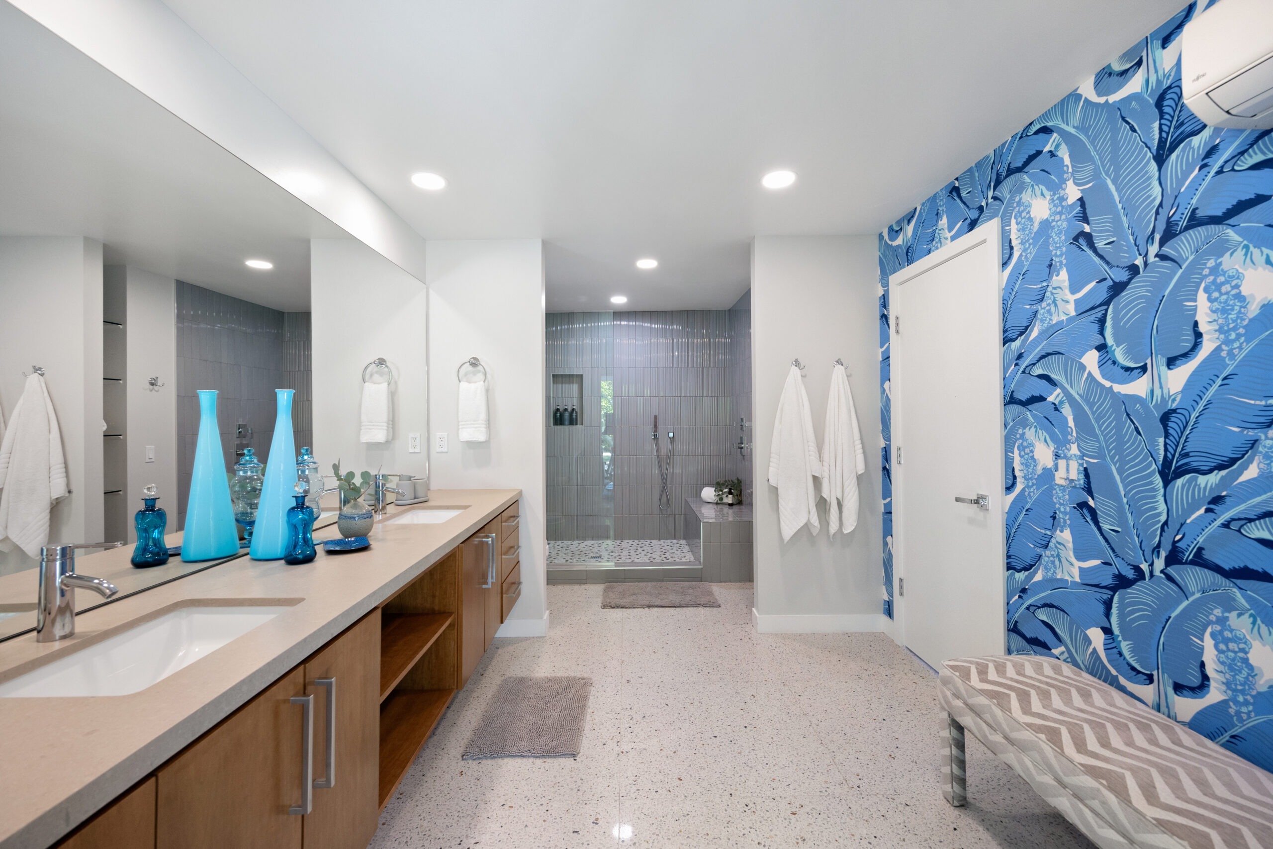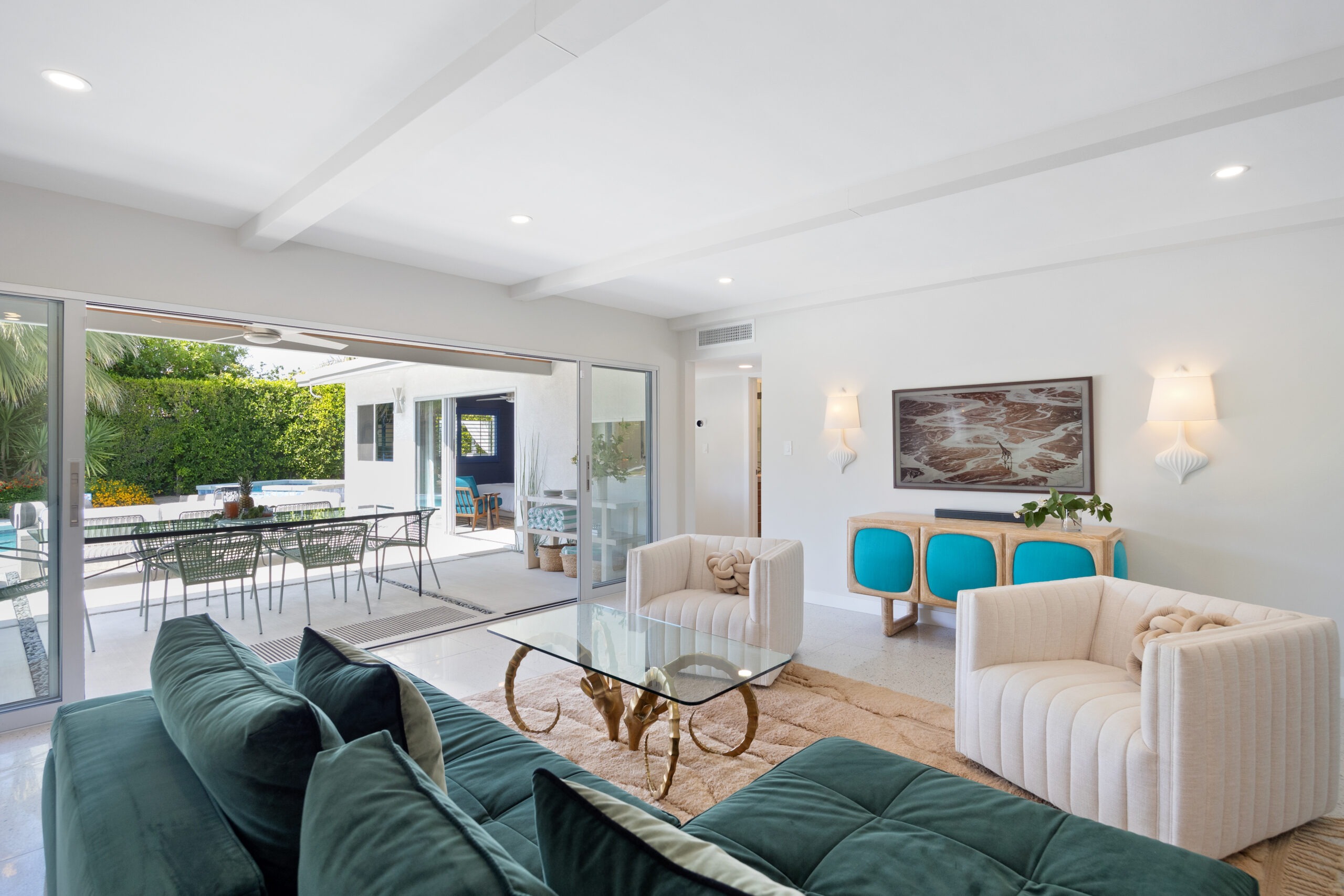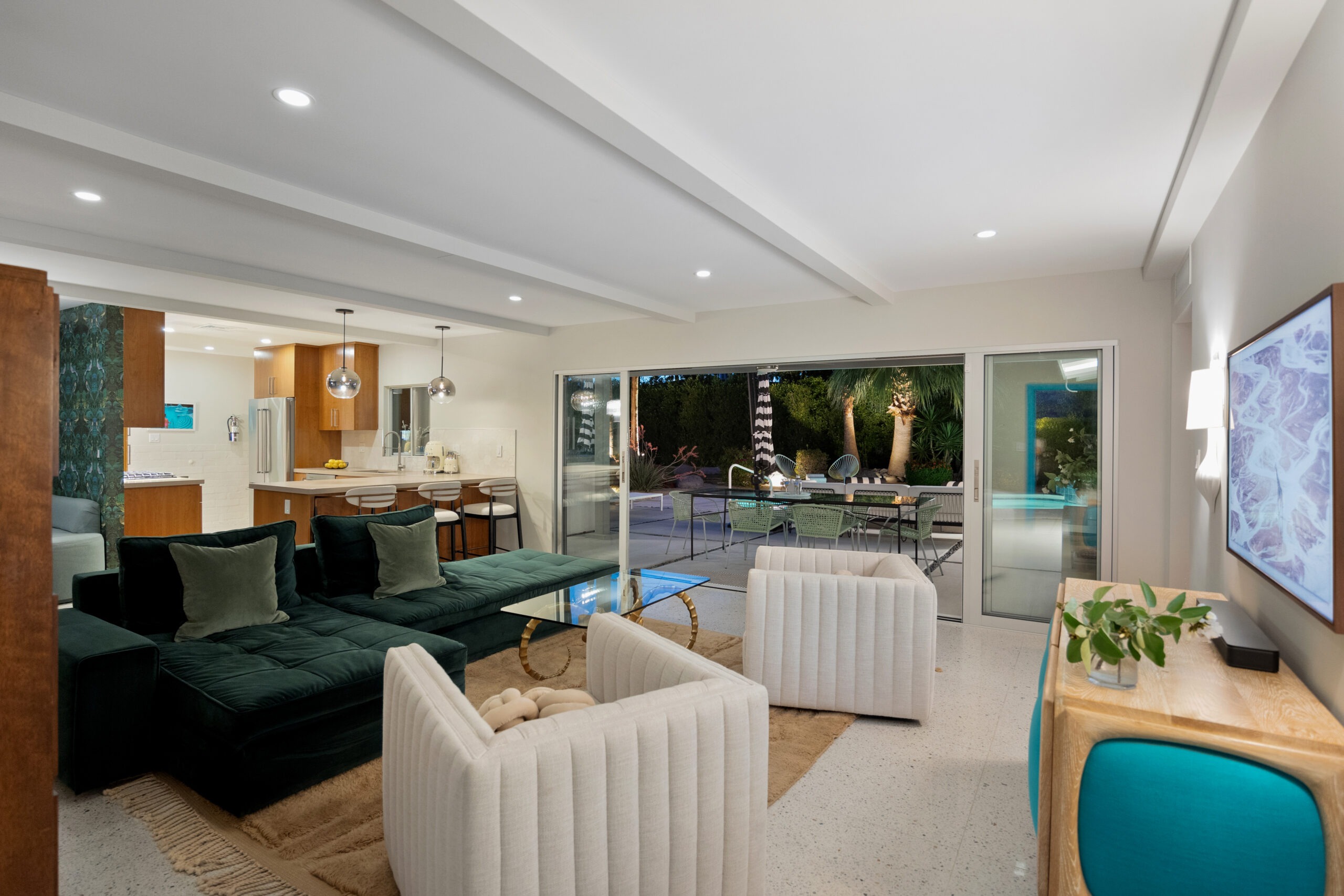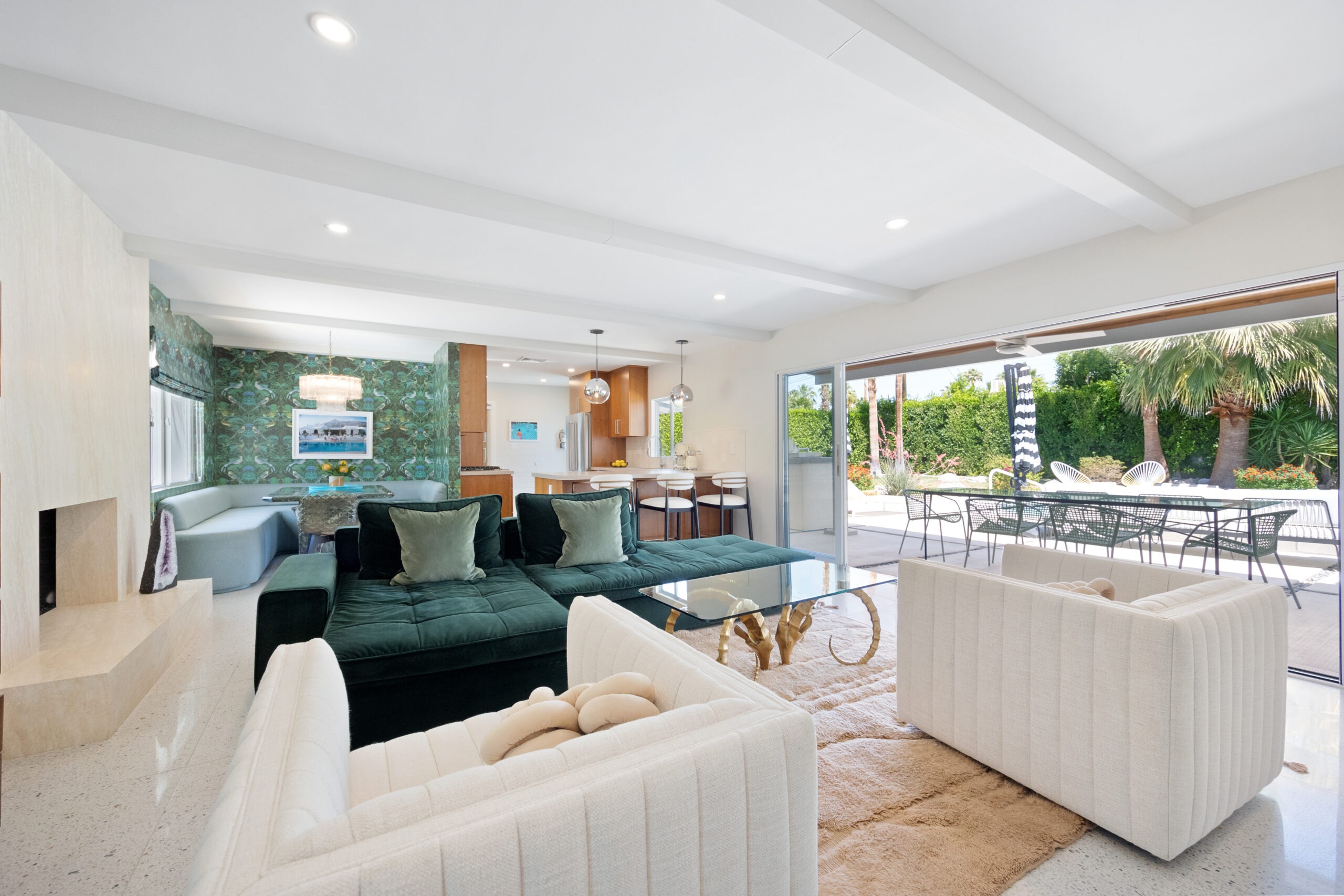 In the living room, you will find a wall of disappearing glass doors that open to seamlessly blend the ultimate indoor/outdoor lifestyle. This truly creates an experience that one comes to Palm Springs for — blue skies, sparkling pools, and fabulous weather! The primary bedroom also has a wall of disappearing glass doors that open to breathtaking views of the San Jacinto Mountains. Once on the patio, you will find a truly stunning outdoor living space with multiple seating vignettes throughout the yard. The partially-covered patio opens to a large outdoor dining table, the outdoor kitchen area, bar, towel storage, comfortable sofa seating, and dual club chairs surrounding the fire-pit. Just steps away is the sparkling saltwater pool, spa, and outdoor shower. The pool loungers, umbrellas, and Acapulco chairs provide relaxing options for sun or shade lounging.