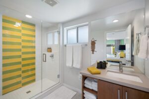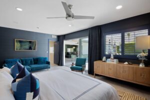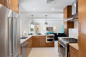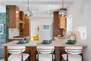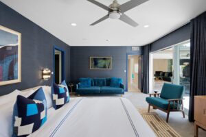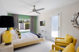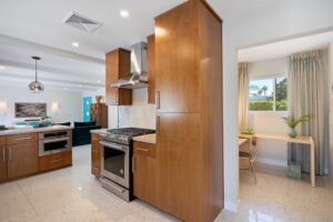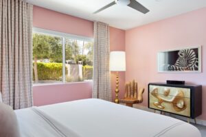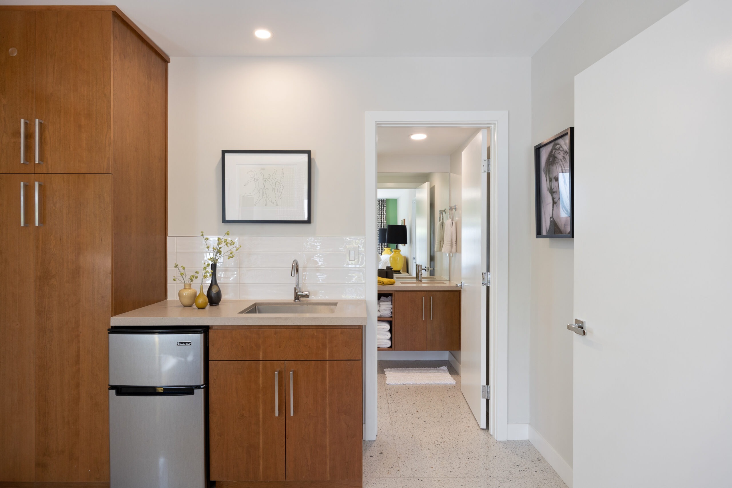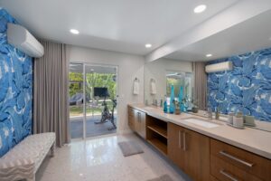 The modern kitchen includes updated appliances and everything you will need to prepare gourmet meals, whether it be for a quick stay or a month. You will find a fully-stocked kitchen with small SMEG appliances, multiple choices for coffee, teas, and of course, cocktail preparation! The kitchen offers a spacious bar area with 3 luxe barstools for counter service. You’ll be amazed at the thoughtful outdoor kitchen steps away from the indoor kitchen. The outdoor kitchen boasts a Lion Premium Grill (gas), built-in ice chest, extra gas burner, prep area, and storage drawers. The large concrete bar space has electric outlets for blender use and outdoor seating at the bar.