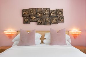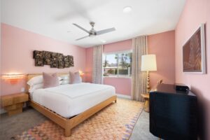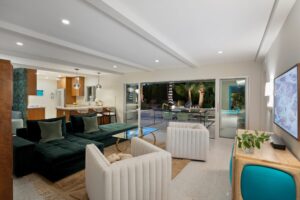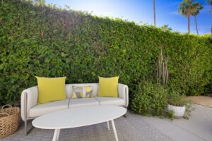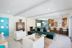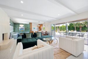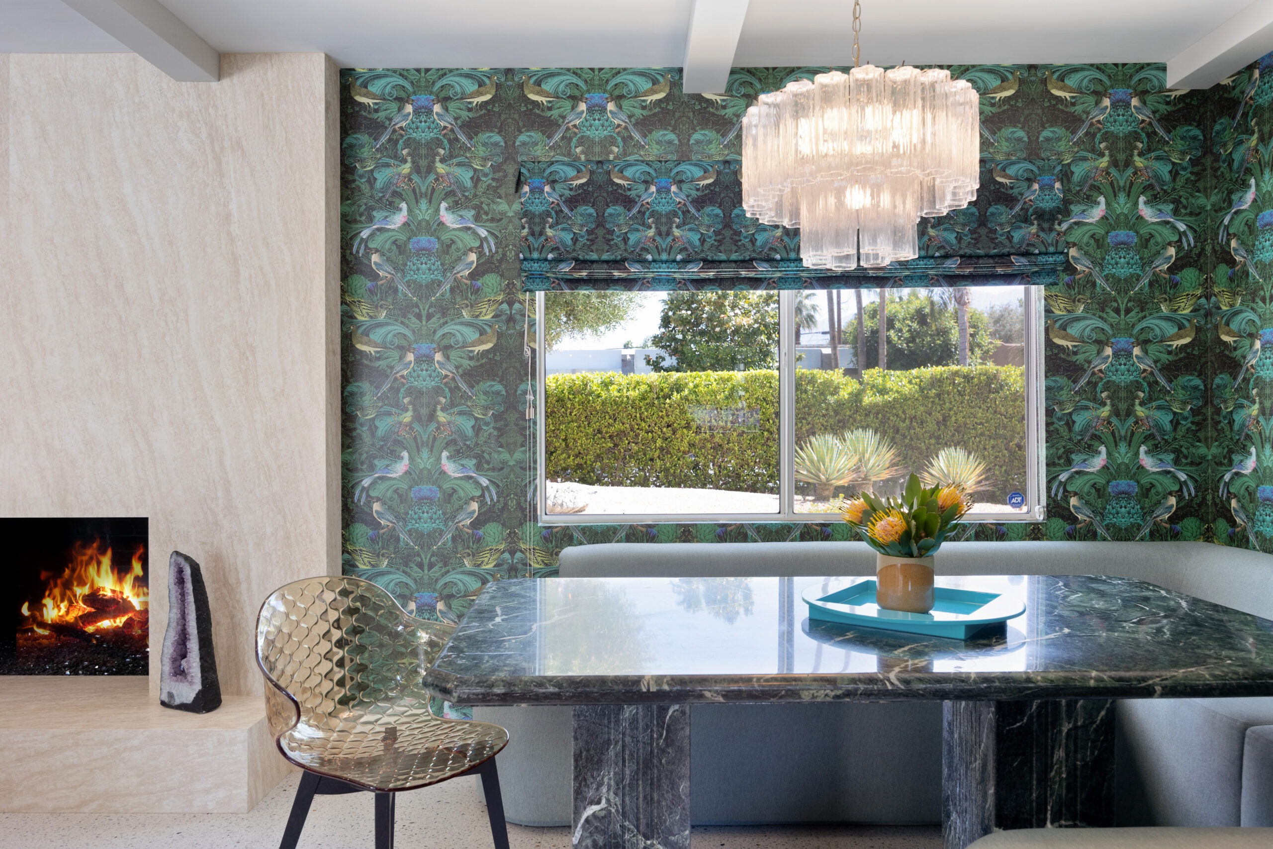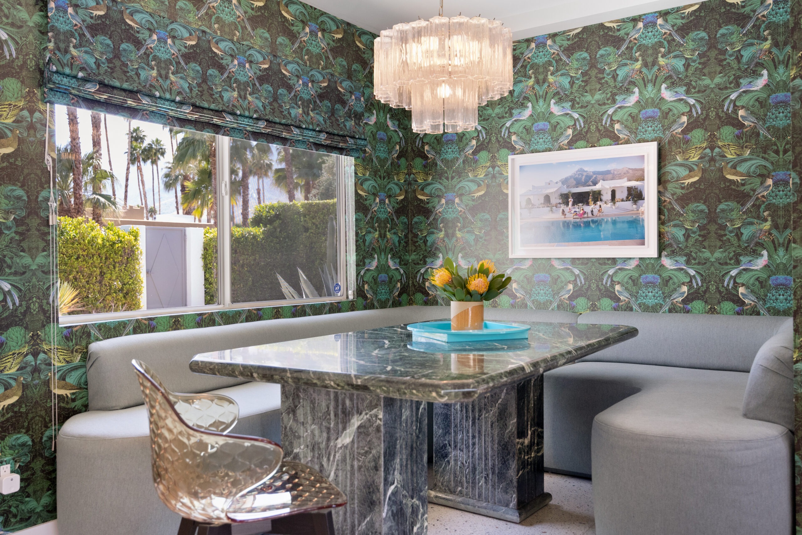 You’ll find 3 well-appointed bedrooms, all with king size beds, and 3 full luxurious, spa-like bathrooms (2 ensuite). The large open concept living area is complete with a travertine fireplace (gas), a living room adorned with high-end furnishings, and cozy custom banquette seating. The chic banquet surrounds a marble dining table fit for 6-8 people to enjoy complete meals. Festive and artful designer touches complete the space, and are reminiscent of the fine hotels and designer homes Palm Springs is famous for (but you won’t often find in other rentals about town).