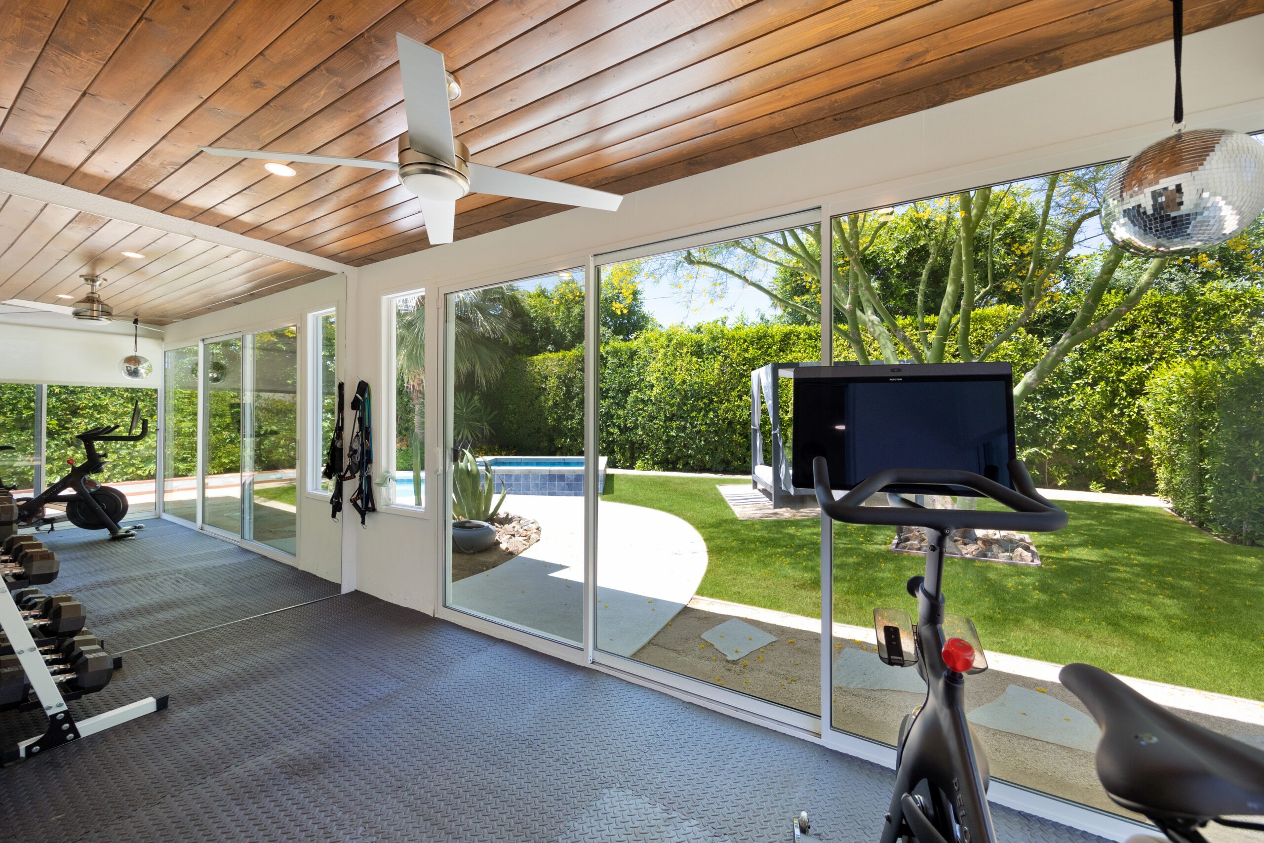 A dedicated office space is set with a large convertible desk making it ready for homework and Zoom calls! The laundry area offers a large-capacity washer and dryer, which leads to a full two- car garage available for your use. And we’re not finished yet! Attached to the primary bath is a gym replete with a Peloton Bike+, free-weights, and fabulous views of a shaded desert landscape. The gym can also be accessed from the pool area through sliding doors.