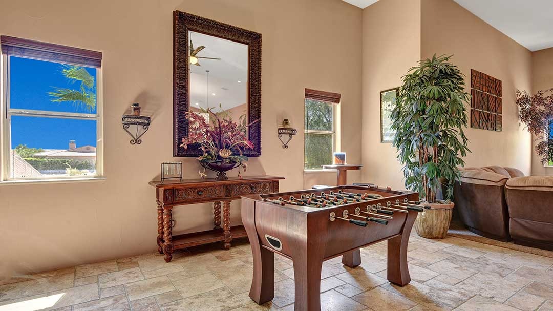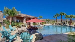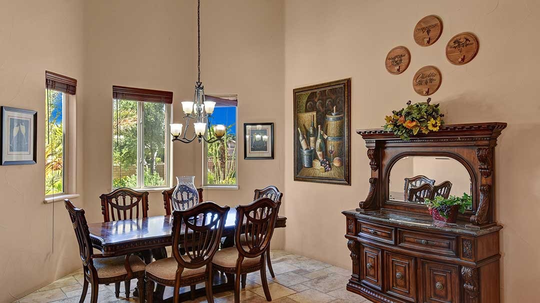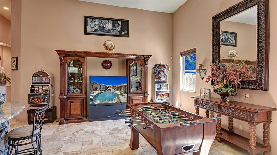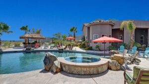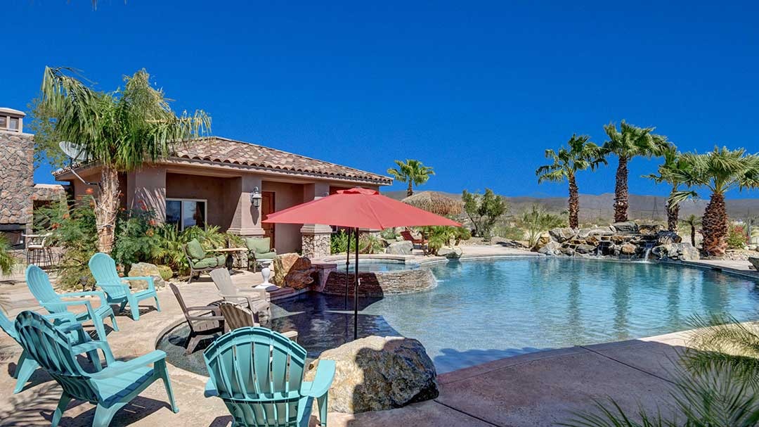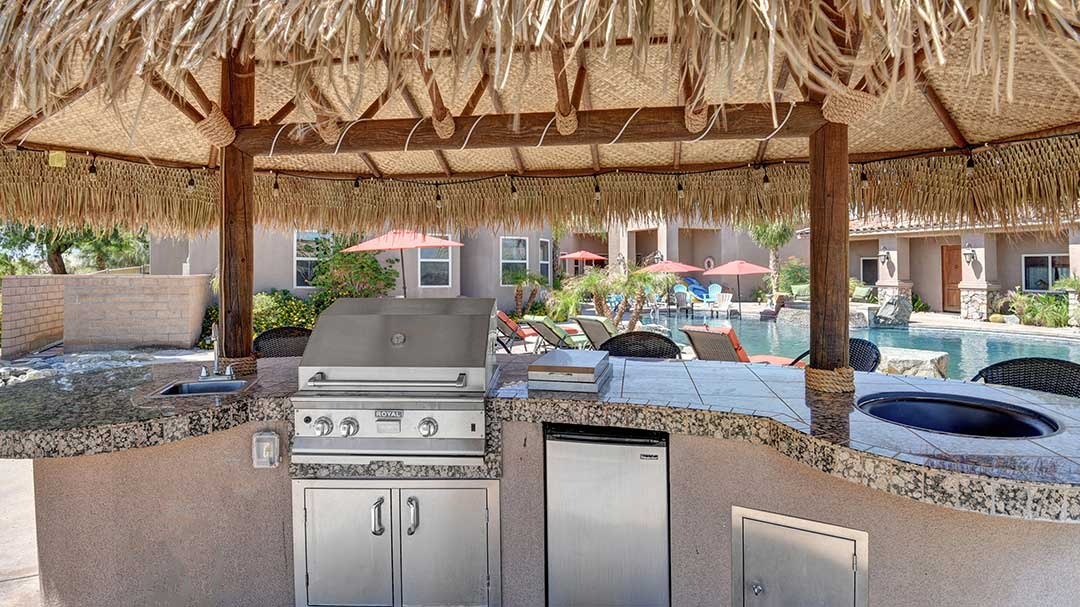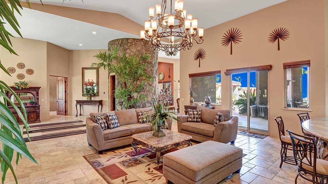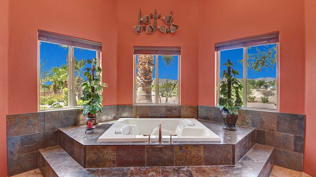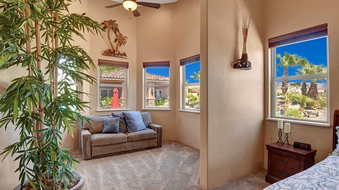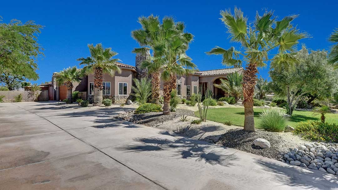 The home is a custom-built nearly 3 acres. This beautiful home just minutes from Palm Desert and Rancho Mirage with FWY access very close. High-end kitchen appliances include a 6 Burner Wolf Cook Top, Subzero refrigerator, double ovens, dishwasher, Washer and Dryer, Granite Counters, large circular bar with ice maker for the perfect gathering space in the home. Each bedroom is self-contained with private bathrooms, king-size beds, linens, dressers, and end tables, professionally decorated, flat-screen wall-mounted HDTVs in each bedroom, Direct TV, Internet access and living room with a comfortable couch and lazy boy chair and an additional HDTV. The Master Suite has a large bathroom with dual vanity, walk-in closet, slate shower with multiple shower heads and a double occupancy jetted bathtub. Very large beach style lagoon pool and spa with large rock waterfall, gas fire pit, large gas island BBQ with Palapa and outdoor seating.