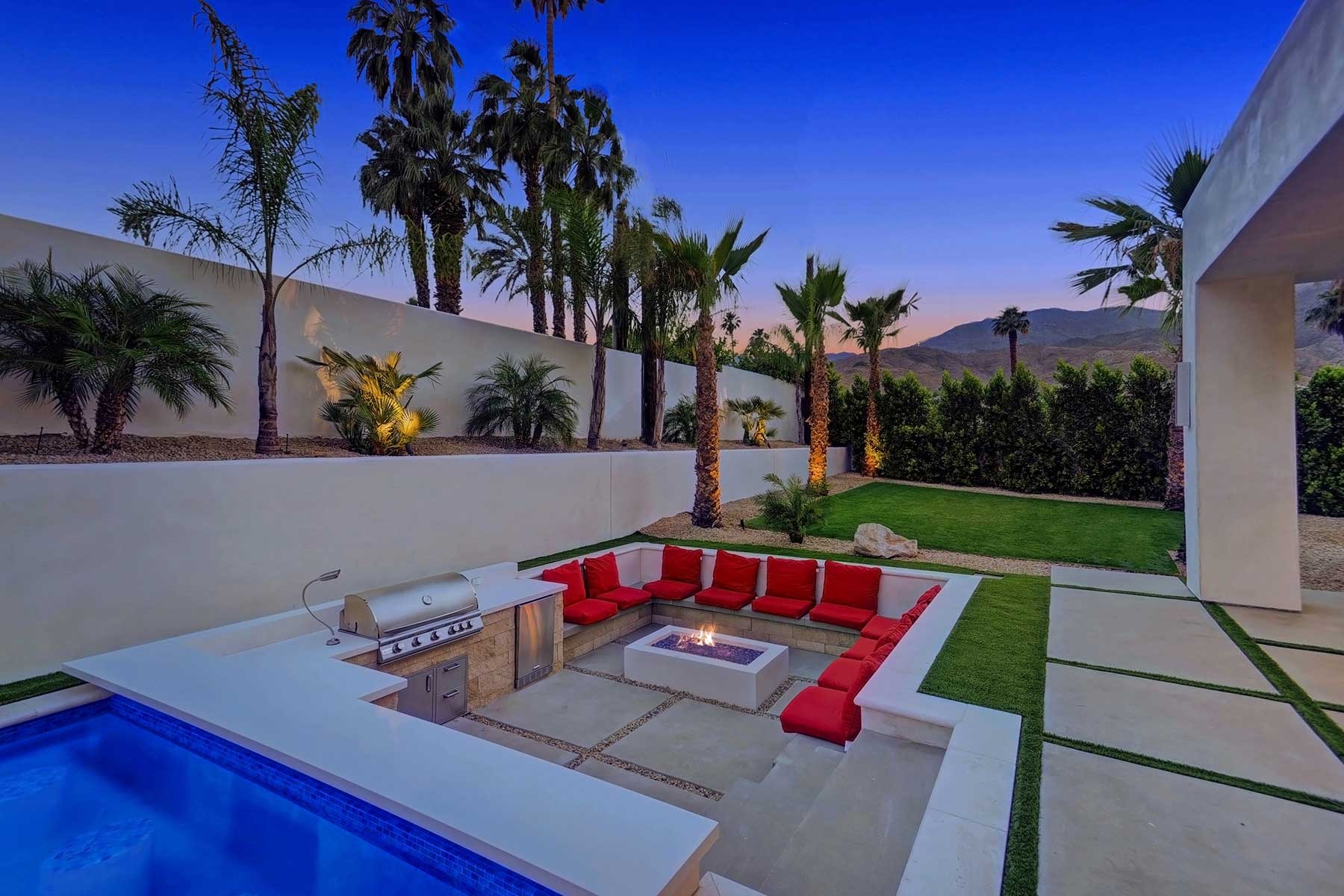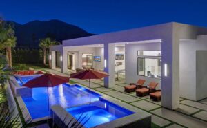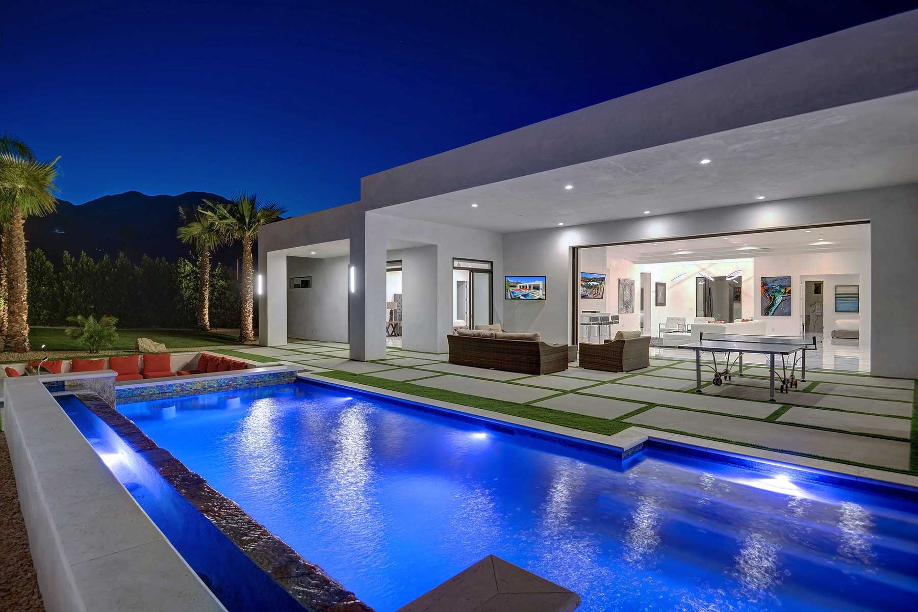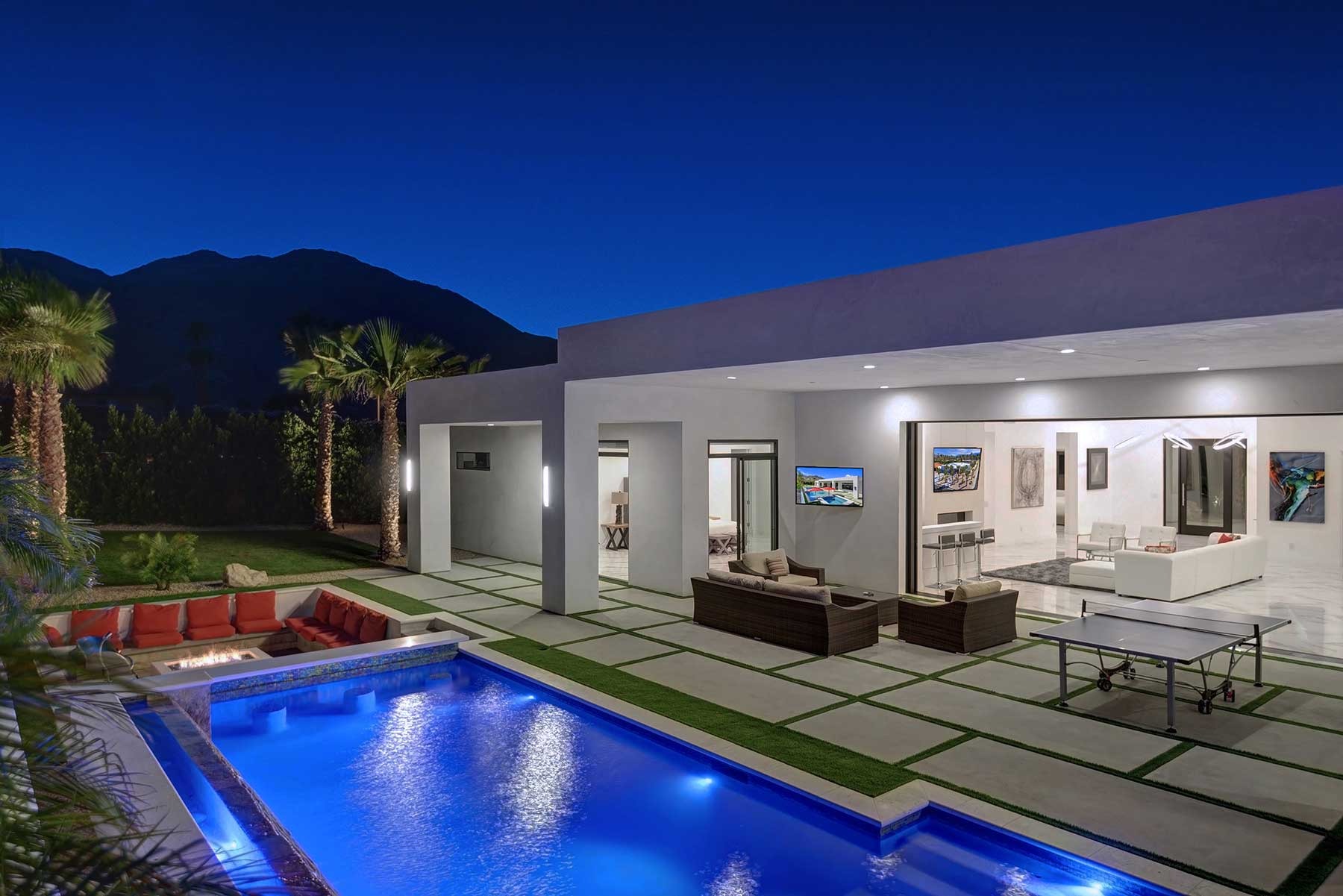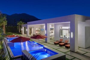 This dream Home is a brand new construction.4 bedroom 4.5 bath home which is the envy of the neighborhood! Location is next to El Paseo, the Rodeo Drive of Palm Springs and only ten minutes away from the Tennis Tournament in Indian Wells and 15 mts to the famous Coachella music festivals. This House has a resort style backyard. 43 feet pool long with a custom made quartz bar which has 4 sitting stools. Enjoy your favorite drinks or food while in the pool. Gorgeous 20 feet waterfall, and a very large tanning area to lie down and enjoy the sun inside the pool. For families with kids tanning area serves as their children’s pool. Spa has a waterfall that overflows into the pool, and fits ten people very comfortable. Adjacent to the pool a sunken fireplace area. It has a BBQ, fridge to keep your drinks cold, sitting for ten, and a gorgeous fireplace. Sunk in area is at pool level so you can keep the fun with your friends and family at the pool. There is also a plasma in the patio so you can watch your favorite sports or movies while enjoying the pool. Total 7 plasmas with all the channels including HBO, Showtime, Starz, Cinemax and more. Grass areas, and wonderful palm trees everywhere.