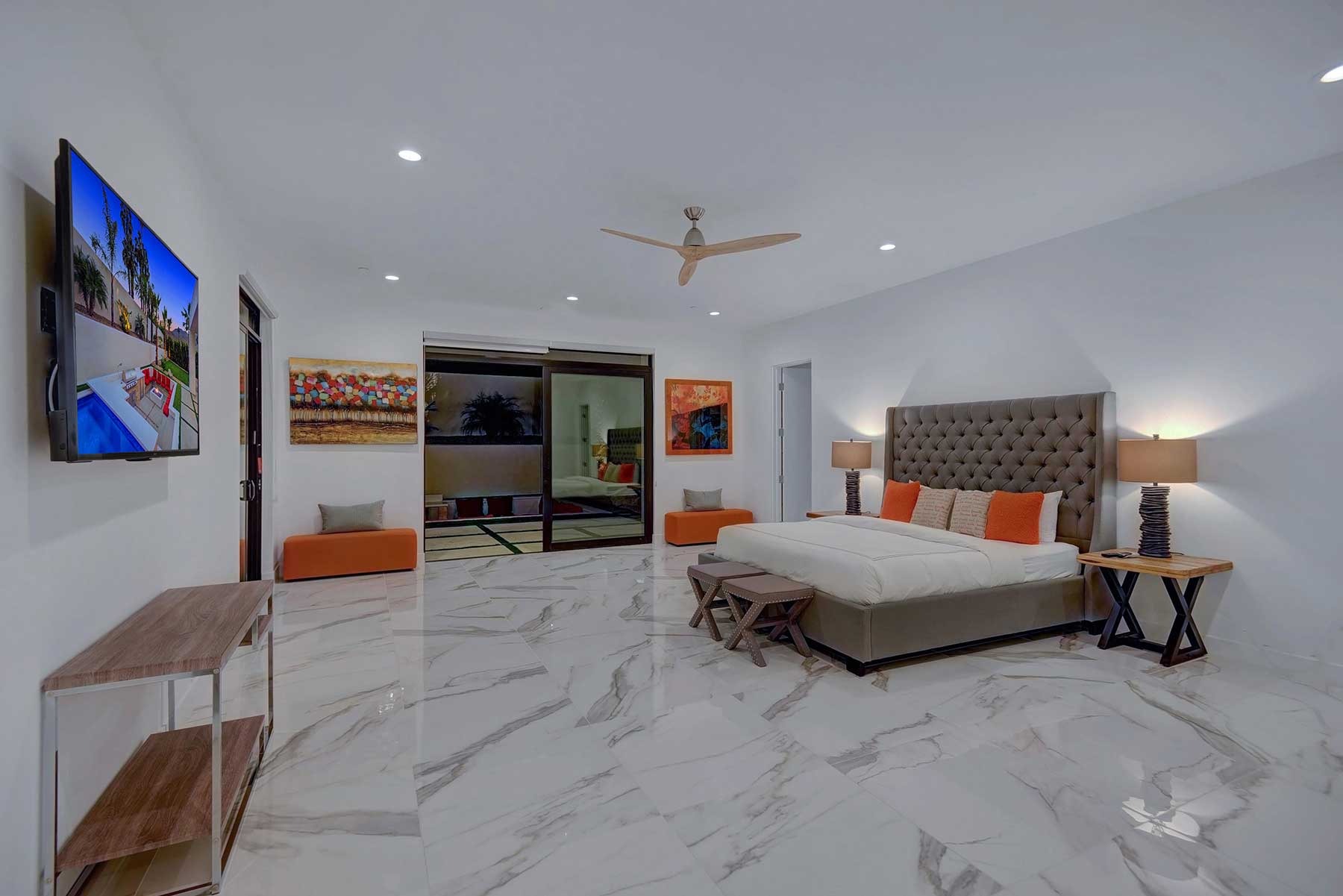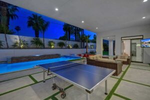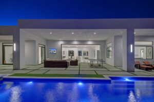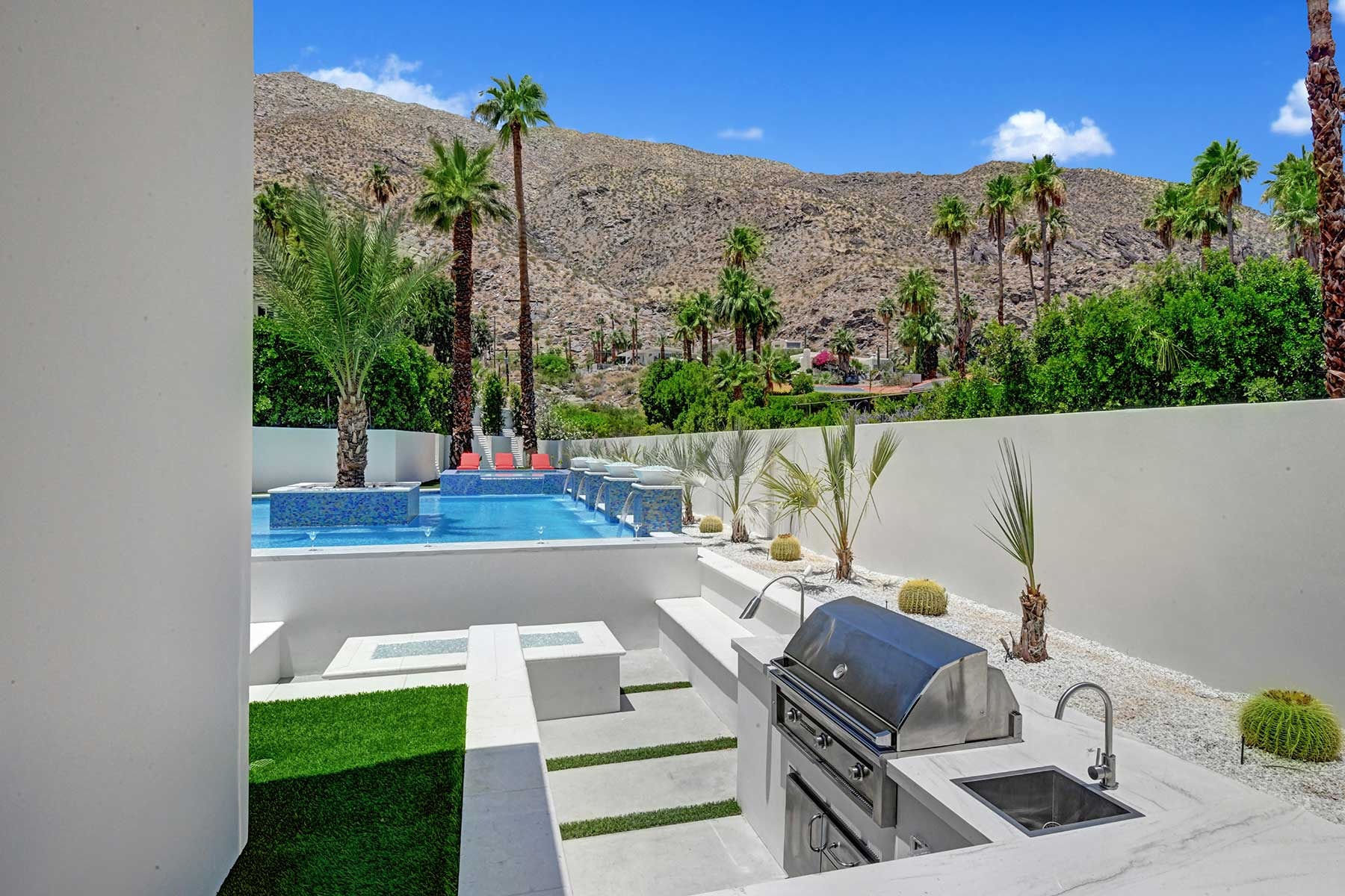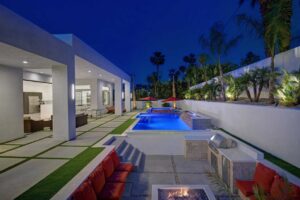 This dream Home is a brand new construction.4 bedroom 4.5 bath home which is the envy of the neighborhood! Location is next to El Paseo, the Rodeo Drive of Palm Springs and only ten minutes away from the Tennis Tournament in Indian Wells and 15 mts to the famous Coachella music festivals. This House has a resort style backyard. 43 feet pool long with a custom made quartz bar which has 4 sitting stools. Enjoy your favorite drinks or food while in the pool. Gorgeous 20 feet waterfall, and a very large tanning area to lie down and enjoy the sun inside the pool. For families with kids tanning area serves as their children’s pool. Spa has a waterfall that overflows into the pool, and fits ten people very comfortable. Adjacent to the pool a sunken fireplace area. It has a BBQ, fridge to keep your drinks cold, sitting for ten, and a gorgeous fireplace. Sunk in area is at pool level so you can keep the fun with your friends and family at the pool. There is also a plasma in the patio so you can watch your favorite sports or movies while enjoying the pool. Total 7 plasmas with all the channels including HBO, Showtime, Starz, Cinemax and more. Grass areas, and wonderful palm trees everywhere.