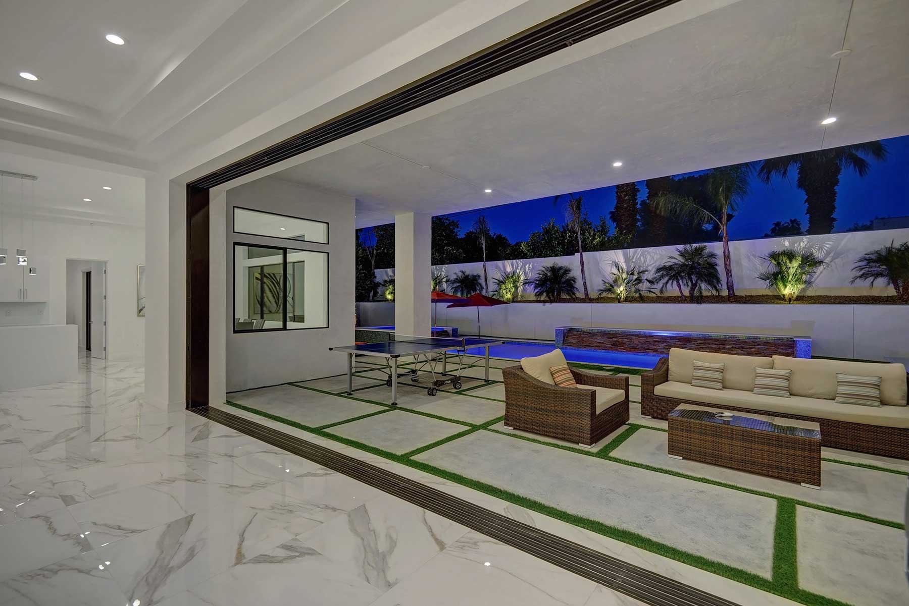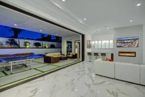 Patio is connected to the living room with a massive pocket door which completely folds inside the wall and makes the living room feel that is connected with the pool and outside areas. Feels great to open the pocket door and hear the sound of the waterfalls. Pocket door is twenty feet long. Inside the house owner didn’t care for cost, and everything has been custom made. The kitchen contains all German appliances, a commercial fridge, and the entire kitchen is made of Quartz, including the dining table that serves eight people. Living area has a wonderful fireplace, a gorgeous bar with a fridge, also made of Quartz, and a 75 inch Sony 4k Plasma.