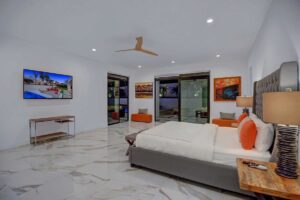 All of the five bedrooms in the house have their own bathrooms, a large closet and a 55 inch plasma. The master has two very large closets and a dream bathroom with a custom made quartz jet bathtub that comes with great mountain views. Master has a 70 inch Sony 4k plasma.
