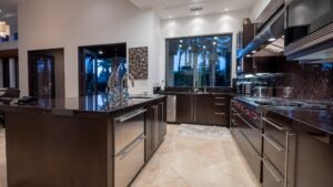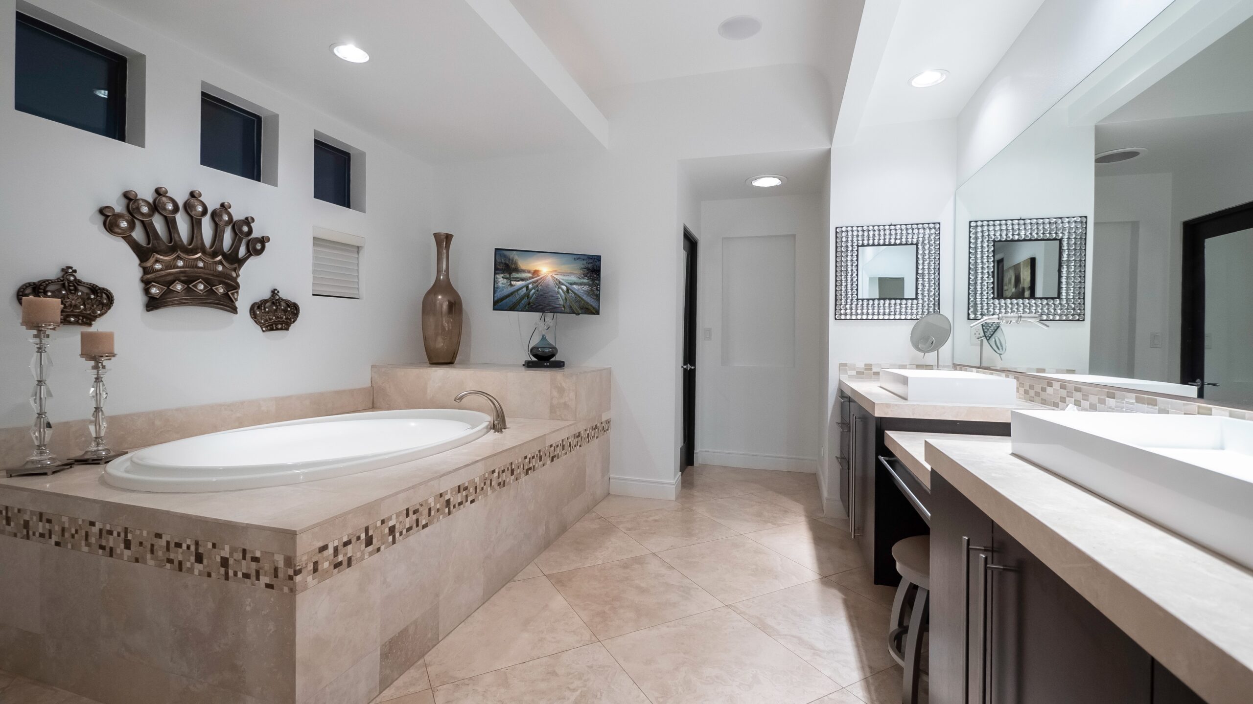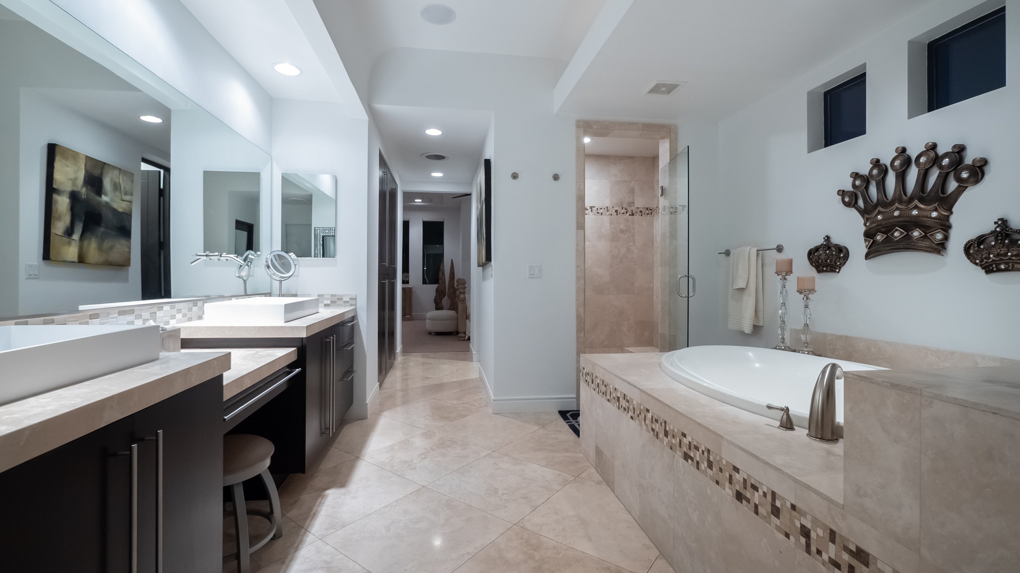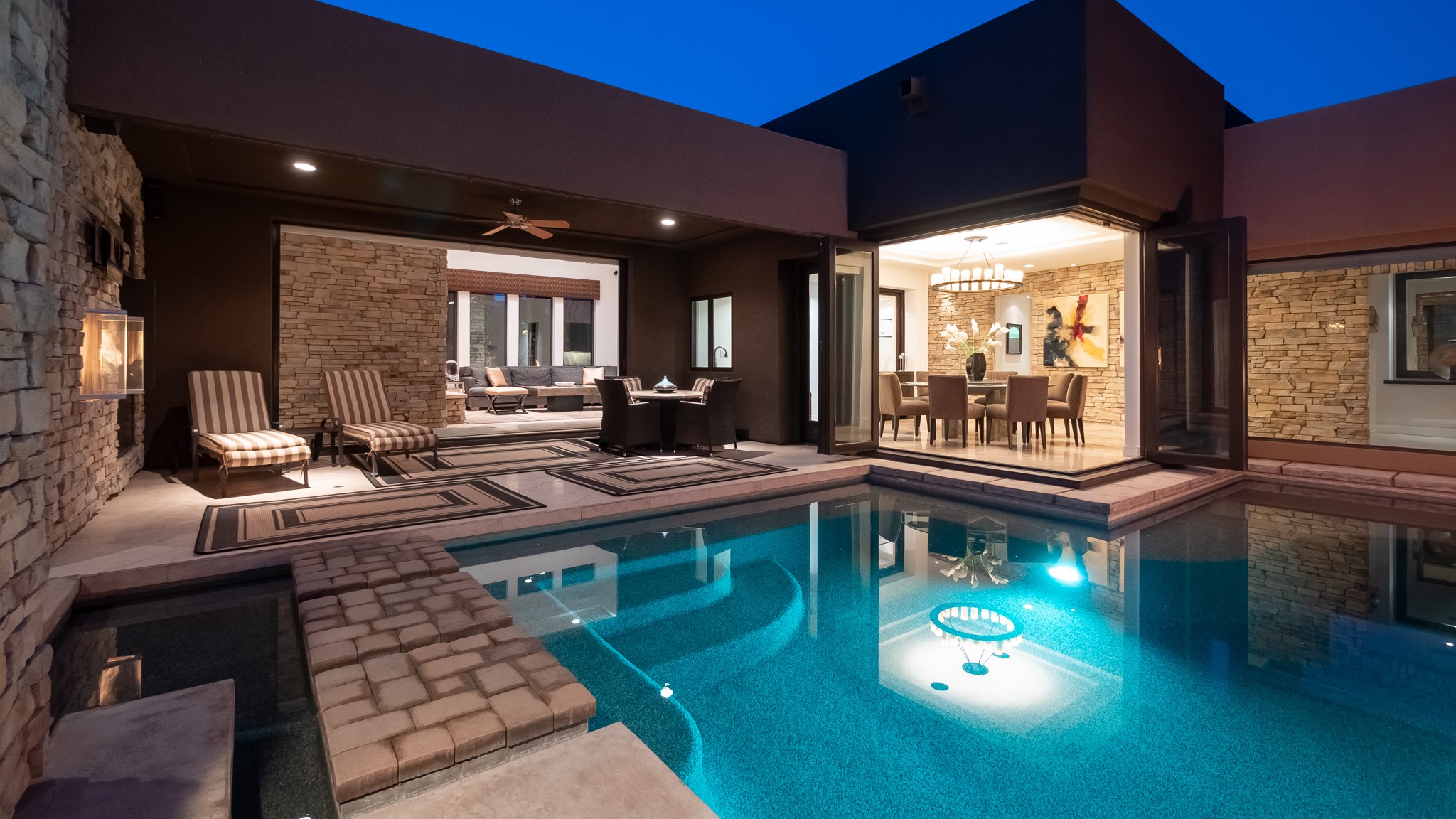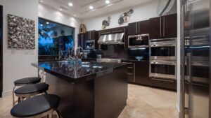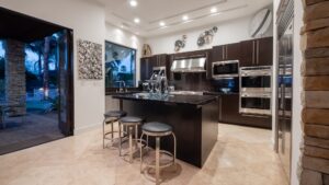 Our pool area has many different fun areas for relaxing, sunning and features for kid’s entertainment.The saltwater pool is one of the focal points of this fabulously upgraded home. Enter the courtyard to an inviting pool spa with fireplace loggia. Complete with fire pits, fireplace, tiki torches, outdoor living at its best. Strategically designed with an open concept. The dining room opens to the entire pool with glass folding windows inviting you to bask in the sun or enjoy romantic sunset evenings. The family room opens to the pool an extension to your outdoor living space. The living room eating area and kitchen have a fluid plan revealing over 3800 square feet of warm elegant finishes and surroundings. The gourmet kitchen is exquisitely appointed with state-of-the-art Wolf Range, Sub Zero & Miele appliances including an additional counter pull-out dual drawer located on the island. Wolf steamer built into the center island. Walk-in pantry, Butler’s pantry with warming drawer. The contemporary design showcases high-end finishes throughout, Modern fresh luxurious and warmth are felt in every space. Sprawling on over half an acre, enjoy playing basketball, putting green with sand trap, sunken sitting area with waterfall, entertain under the palapa BBQ area with Wolf Grill. Light tubes and windows allow for an influx of natural light throughout. Artificial turf, pavers, succulents and countless palm trees will guide you into a vacation paradise!