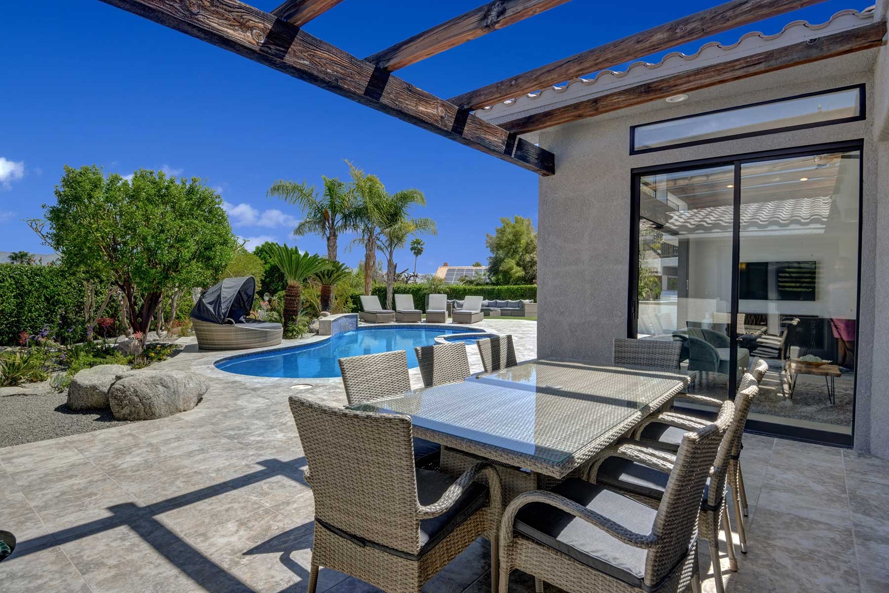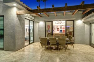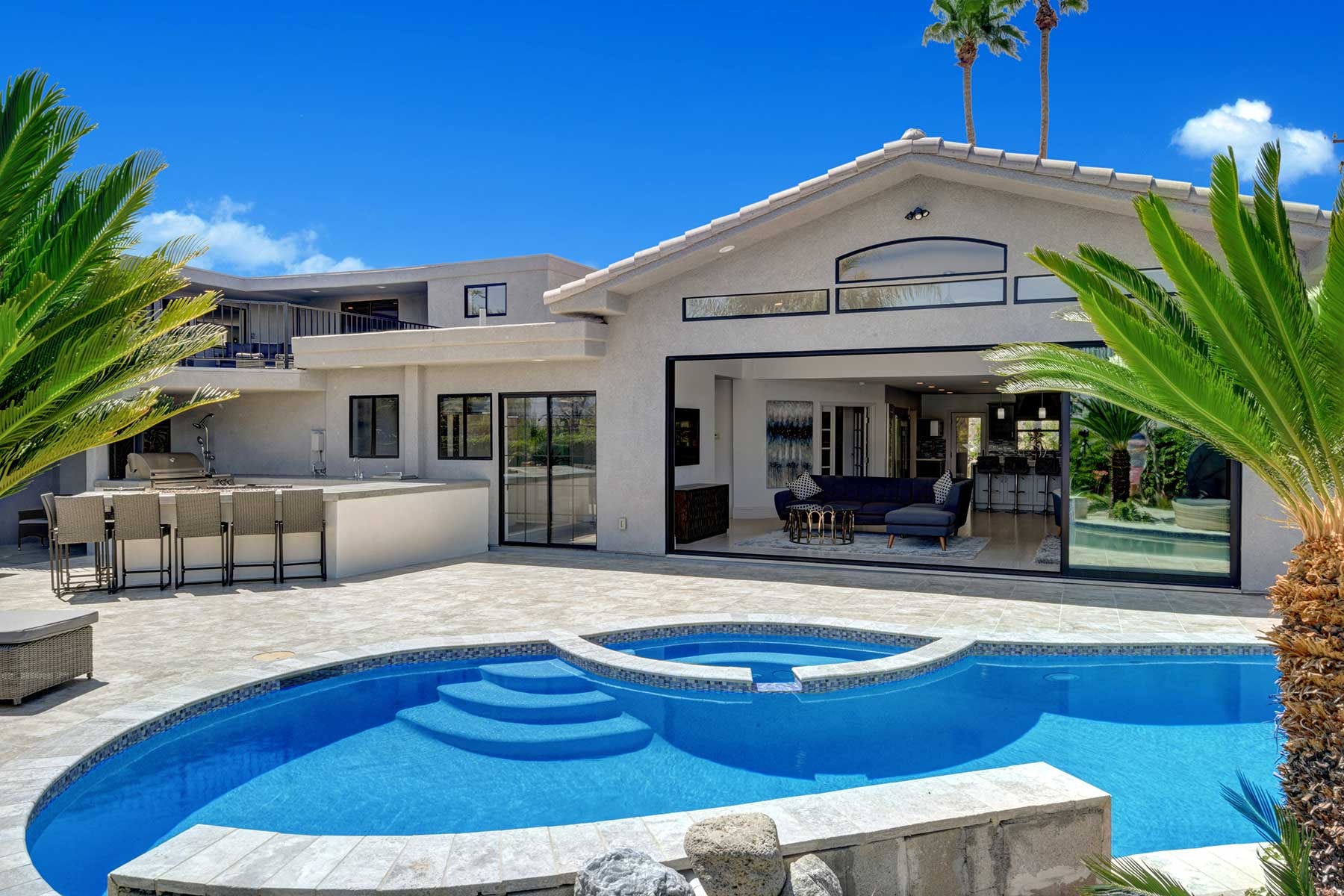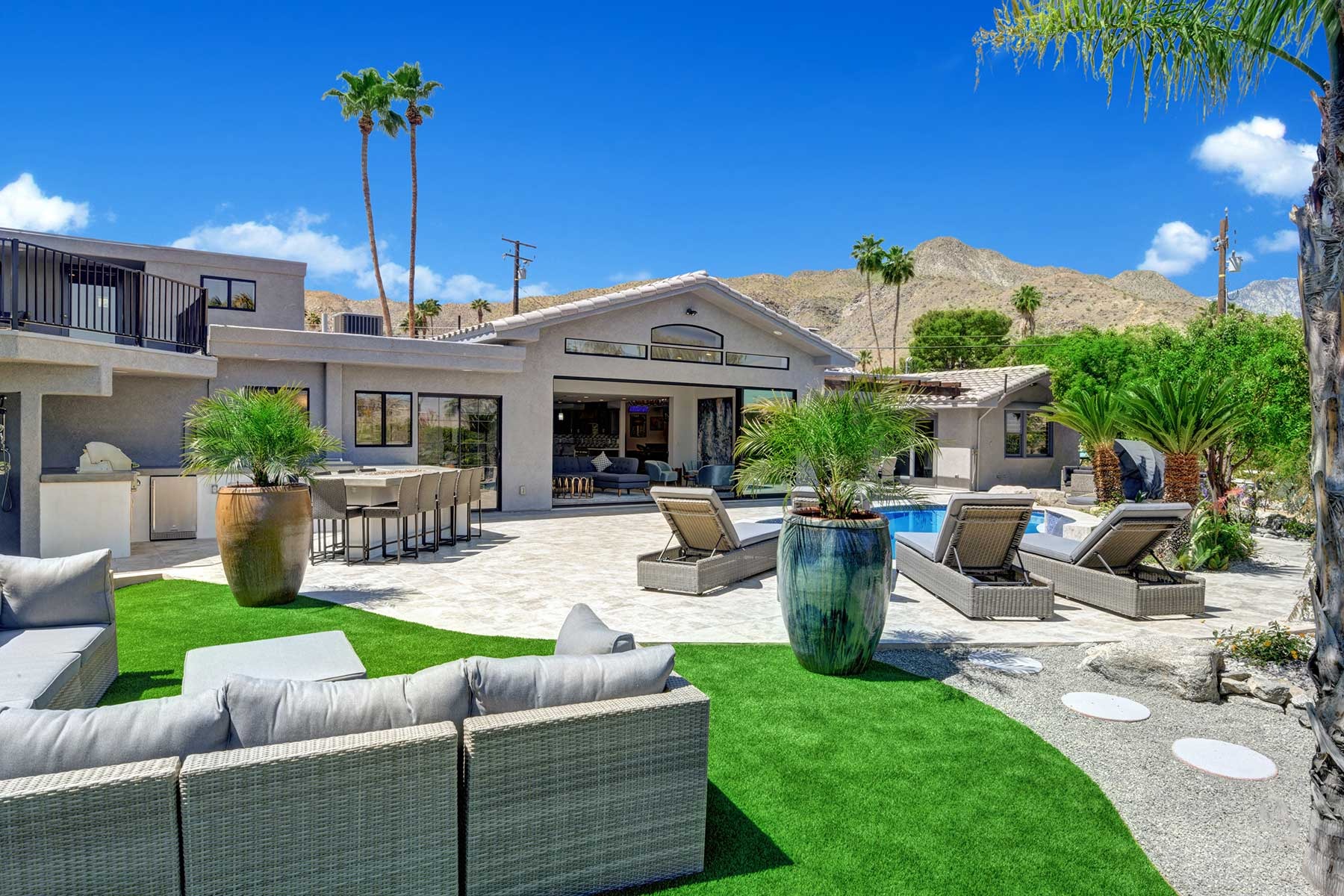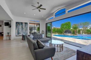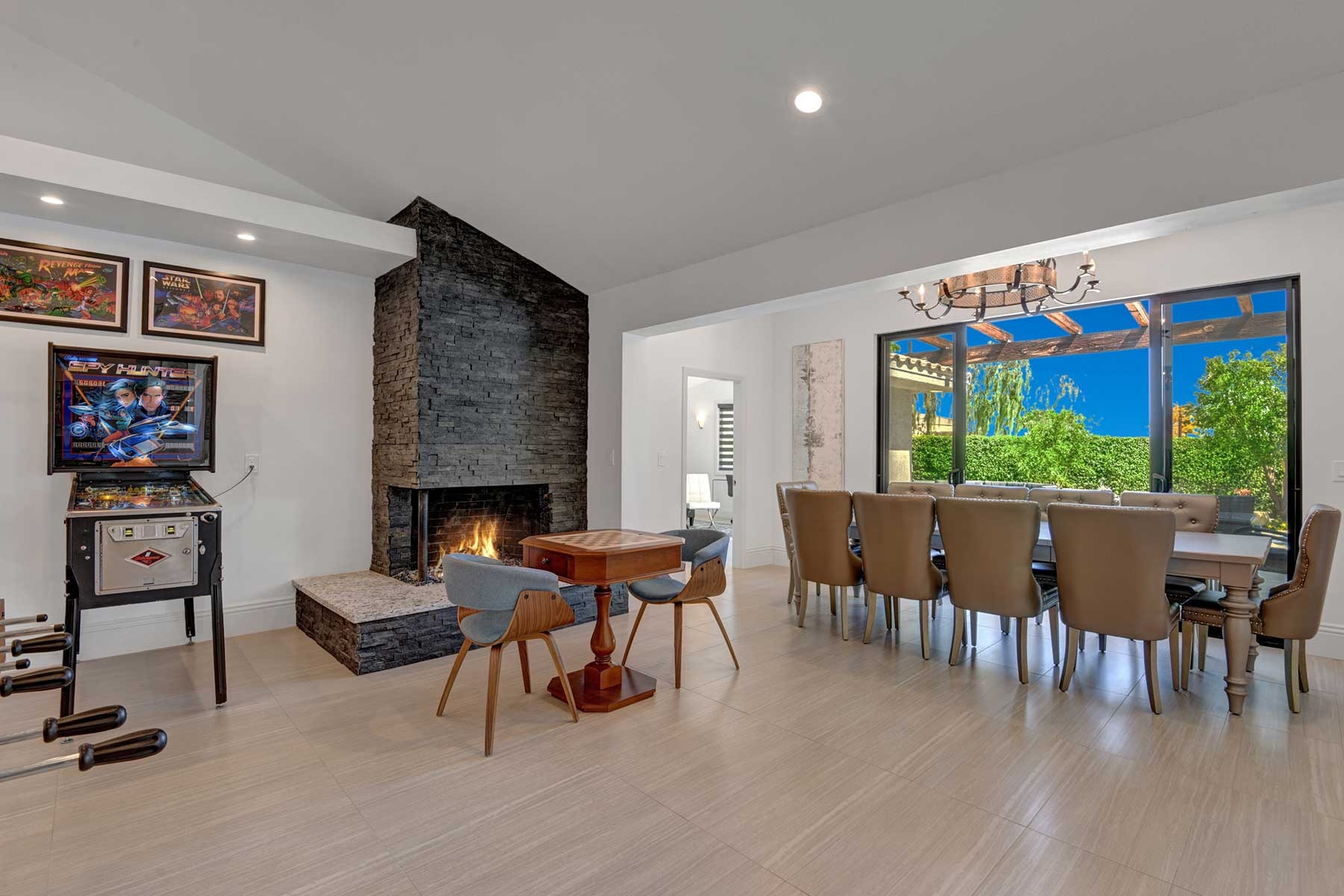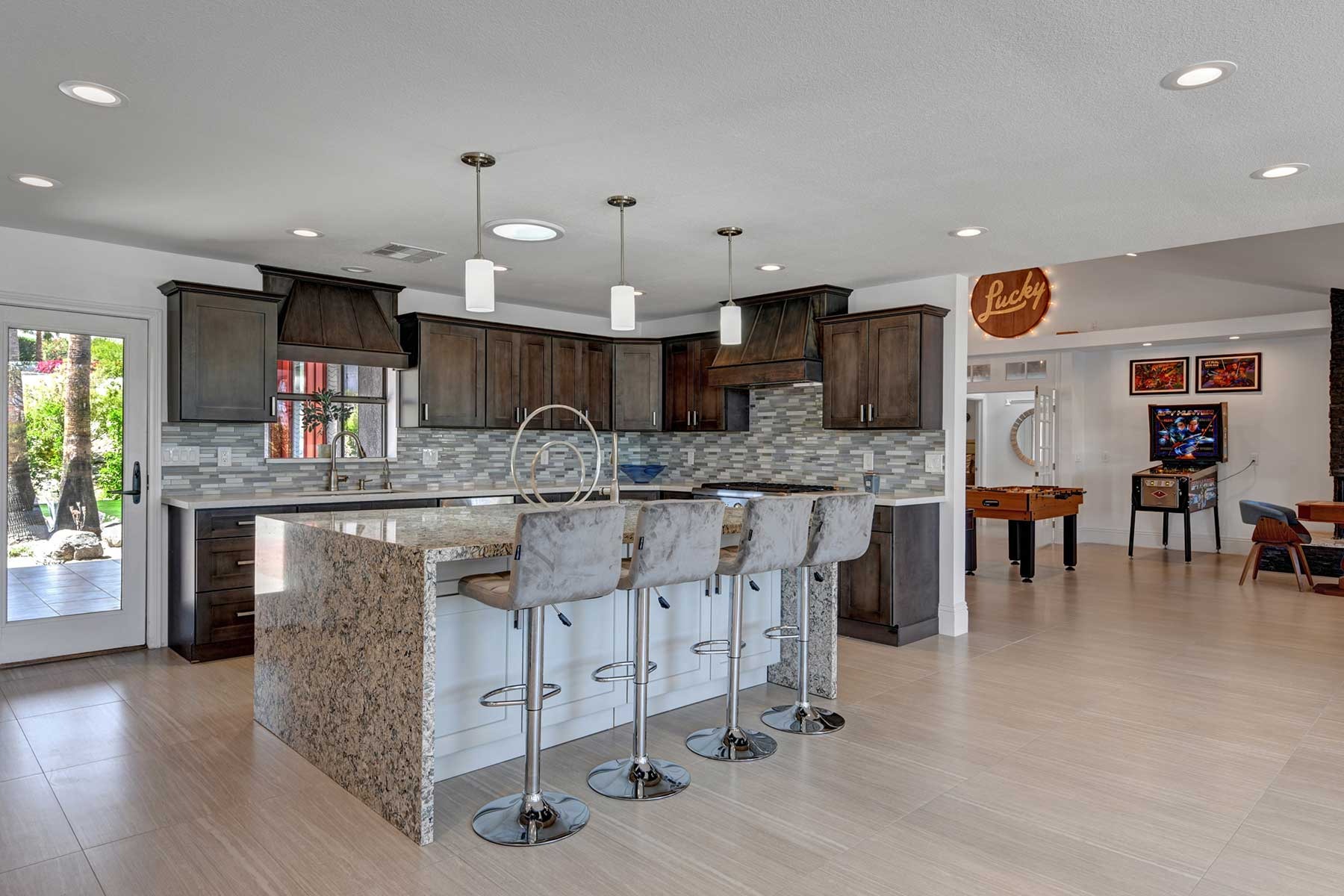 Completely remodeled 5,300 Sq.Ft. Home that has been carefully prepared to make sure you have the best vacations in the desert. Inside of the house you will find six bedrooms, and five baths, media cinema room, game room with arcades which includes pinball, pool table, shuffle board, foosball, chess and bar. Large living room that opens smoothly with a large sliding door to the outdoor pool. An open kitchen with everything you need for small meals or large family meals. House has a second floor with its own casita which includes a full kitchen, living room, bathroom and two queen beds.