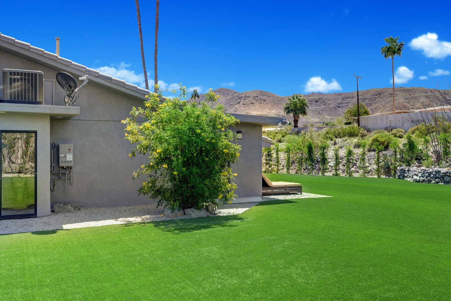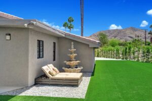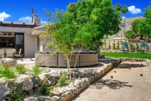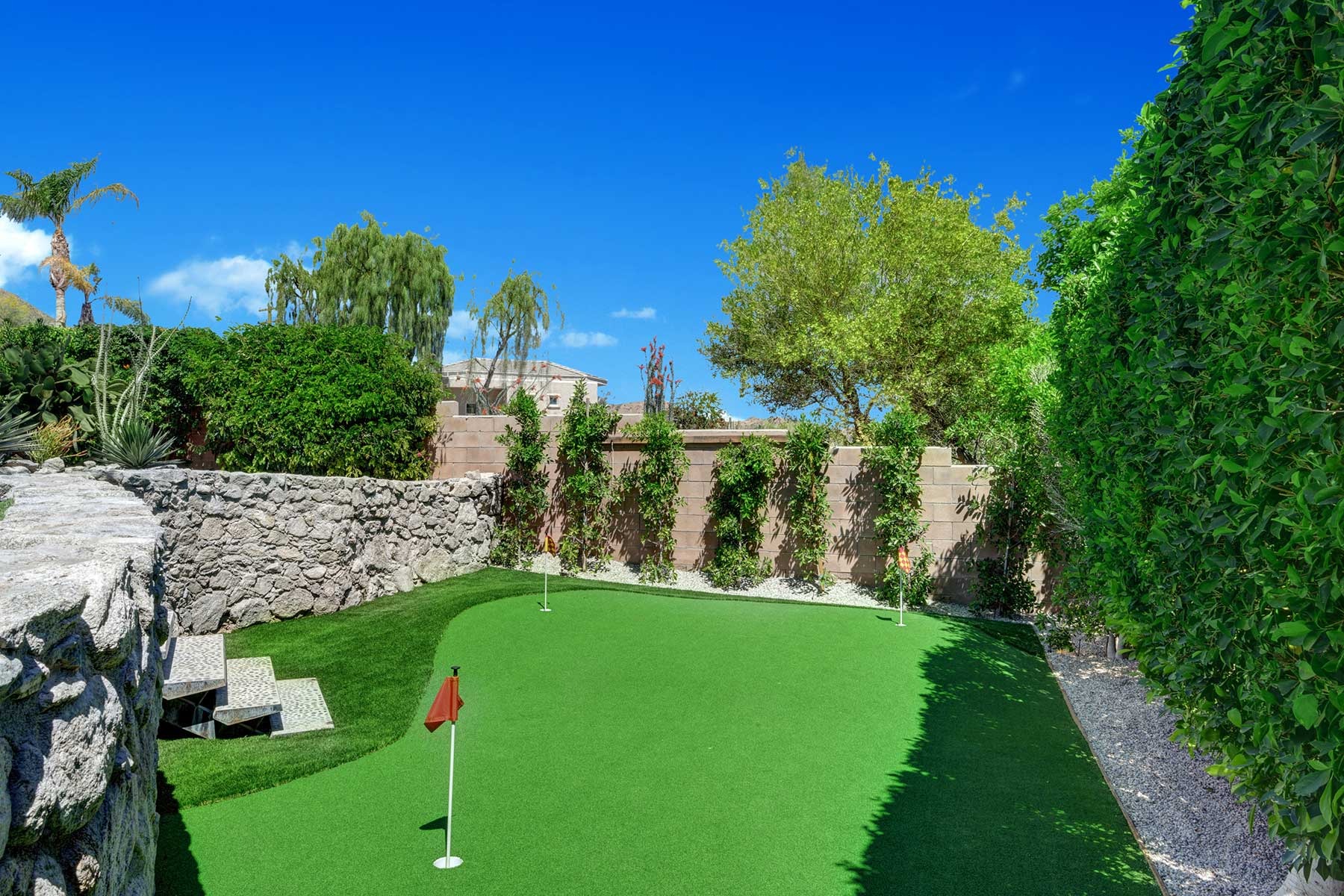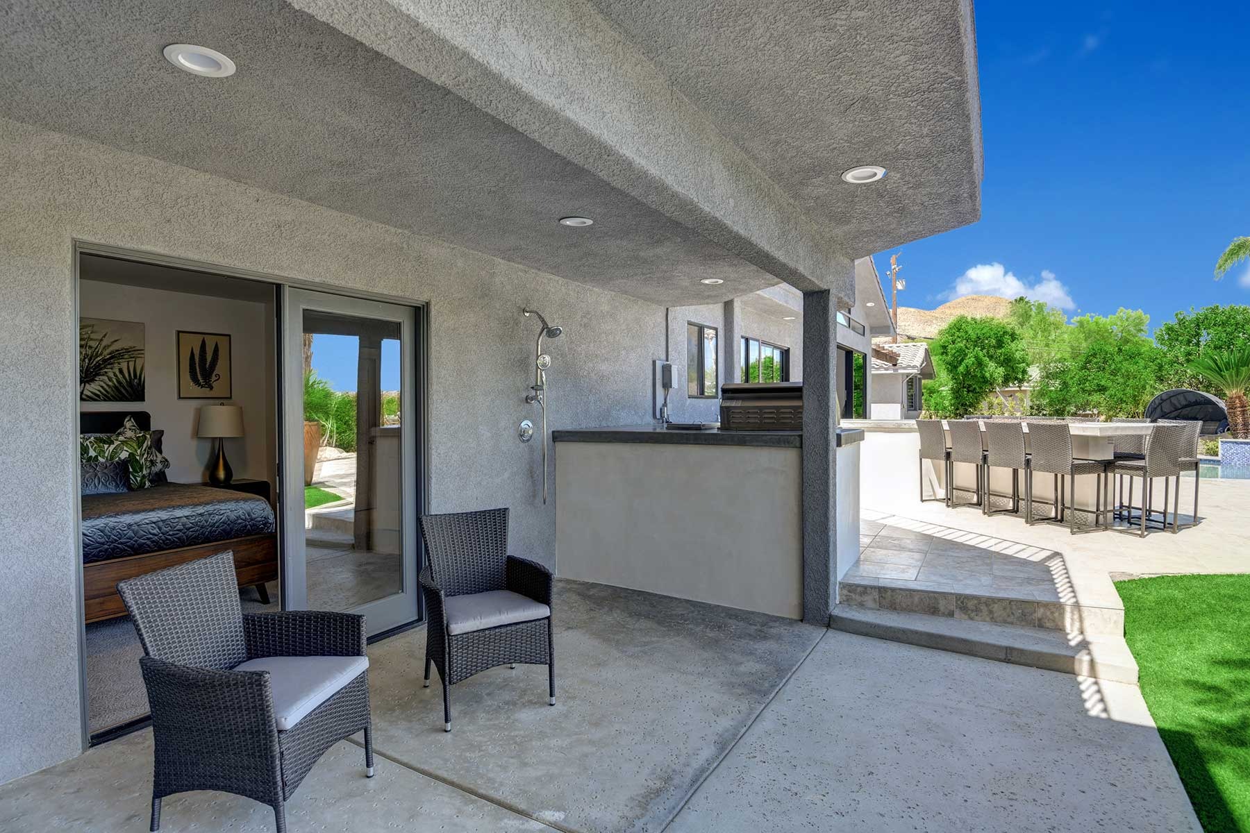 The outdoors have been carefully prepared to entertain our guests. Great pool with waterfall, outdoor spa and shower, built in BBQ with fridge and sink. Bar with fire pit. Large outdoor sofas , putting green, bocce ball court, plenty of lounge chaises and outdoor dinning table. Extensive artificial grass areas for families with kids.