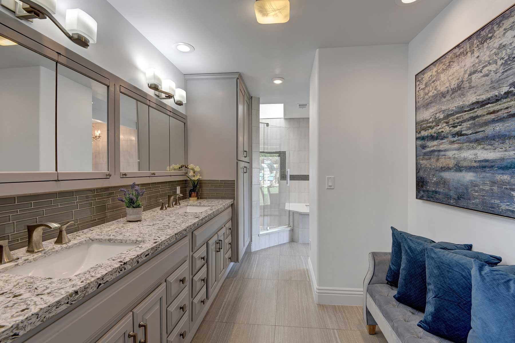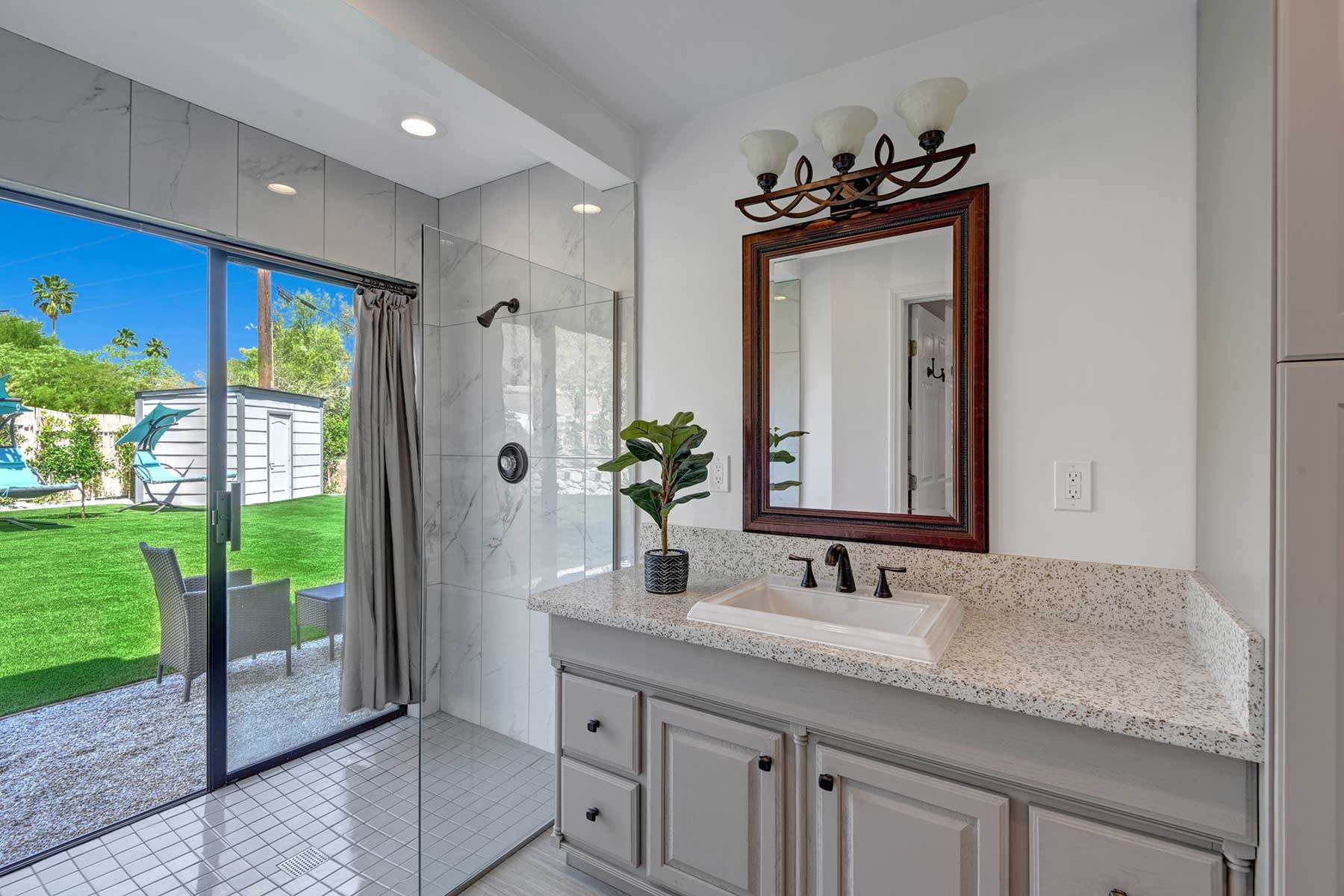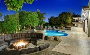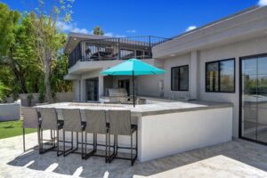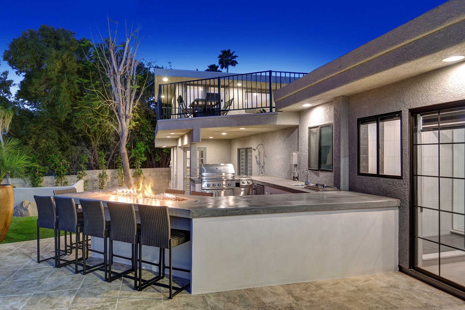 The outdoors have been carefully prepared to entertain our guests. Great pool with waterfall, outdoor spa and shower, built in BBQ with fridge and sink. Bar with fire pit. Large outdoor sofas , putting green, bocce ball court, plenty of lounge chaises and outdoor dinning table. Extensive artificial grass areas for families with kids.