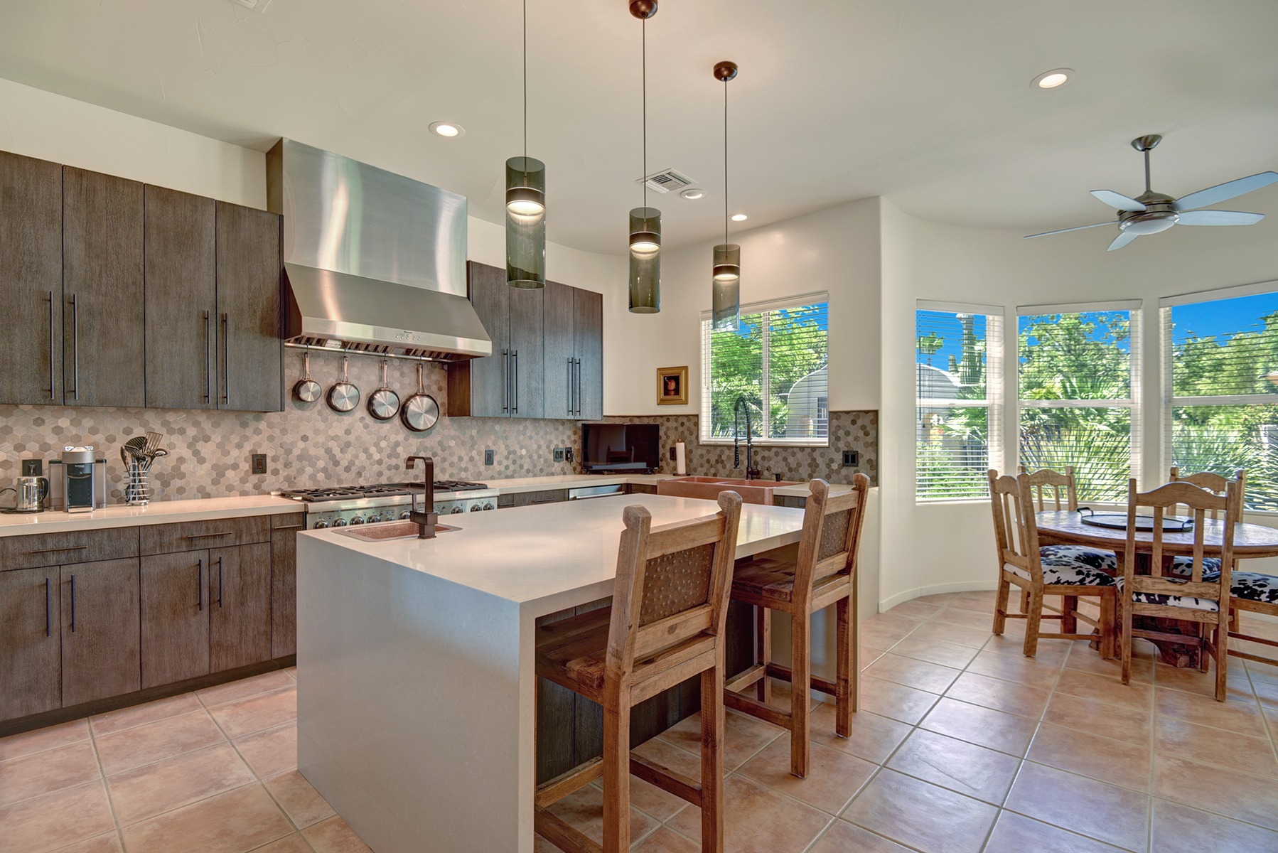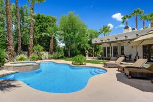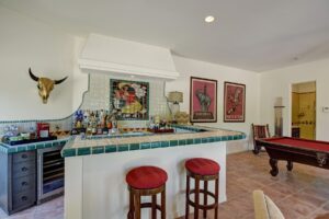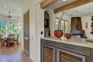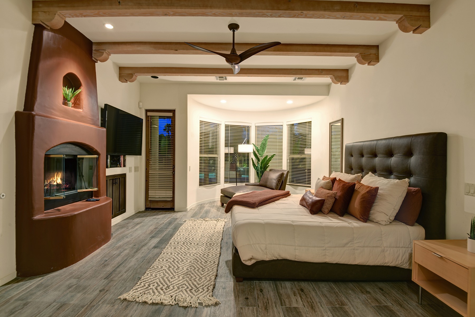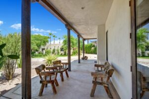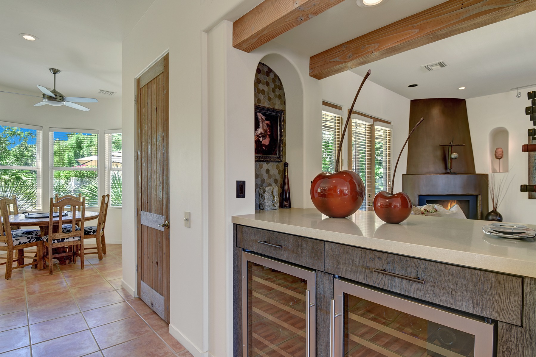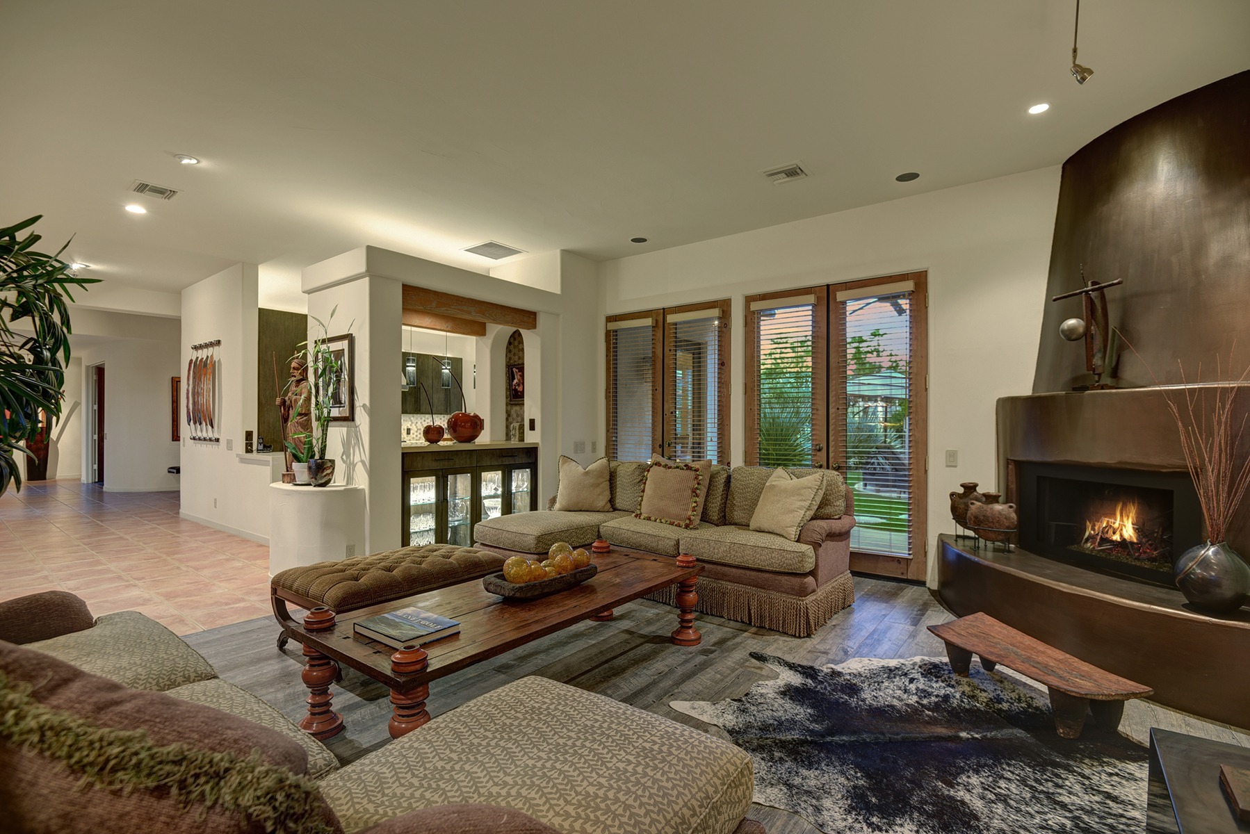 kitchen is beautifully designed with custom cabinetry, quartz countertops, stainless appliances, gas cooktop, copper farm sink & island! The living area offers a Kiva fireplace, wood flooring, french doors and overlooks the den & formal dining room offering additional entertaining space! The primary suite has a sitting area, wood-beamed ceilings, fireplace & direct access to the pool & spa! The primary bath has a jetted tub, walk-in shower, double vanities & walk-in closets! There are 2 guest rooms in the main house both with their own en-suites and an extra bedroom perfect for kids. Your family & friends will love the detached guest house with bar, game area with billiard, bedroom, private bath & large gym!