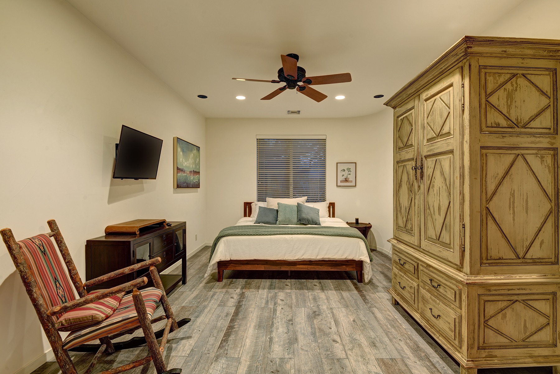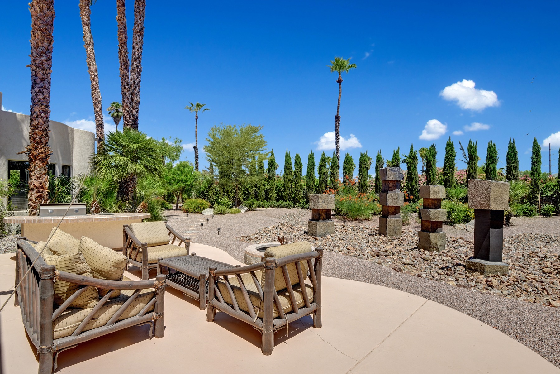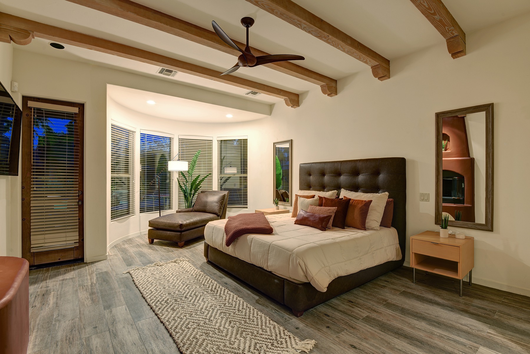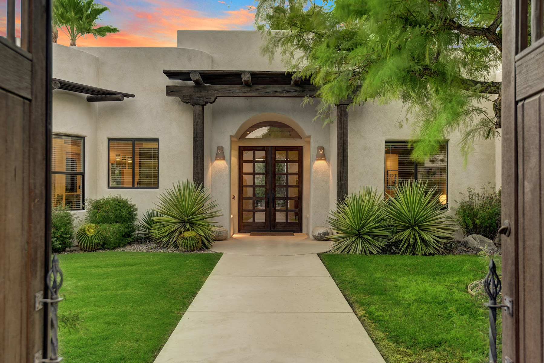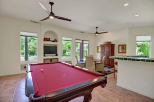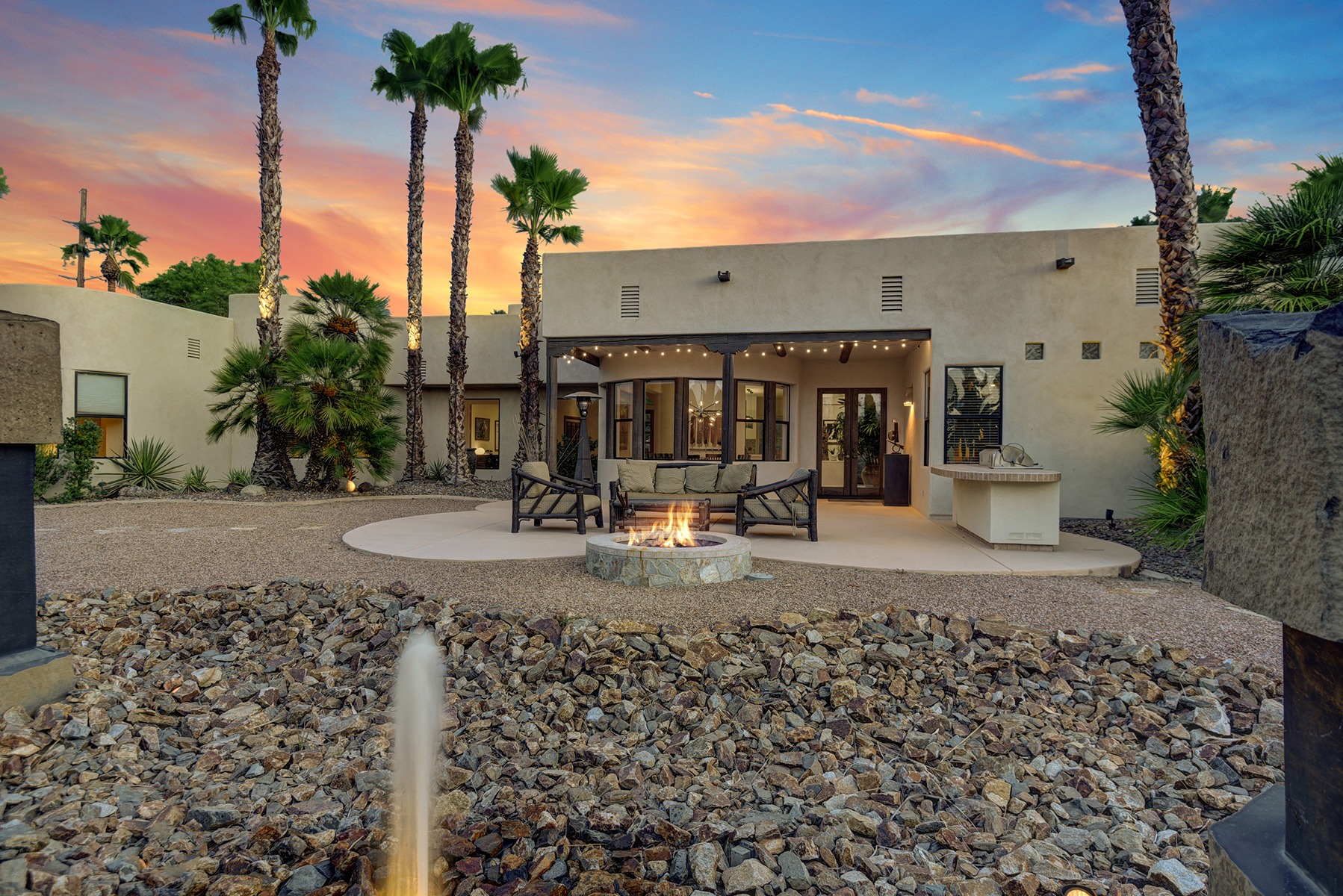 kitchen is beautifully designed with custom cabinetry, quartz countertops, stainless appliances, gas cooktop, copper farm sink & island! The living area offers a Kiva fireplace, wood flooring, french doors and overlooks the den & formal dining room offering additional entertaining space! The primary suite has a sitting area, wood-beamed ceilings, fireplace & direct access to the pool & spa! The primary bath has a jetted tub, walk-in shower, double vanities & walk-in closets! There are 2 guest rooms in the main house both with their own en-suites and an extra bedroom perfect for kids. Your family & friends will love the detached guest house with bar, game area with billiard, bedroom, private bath & large gym!