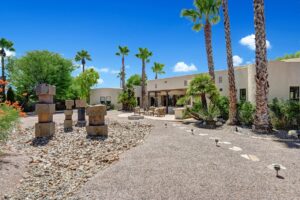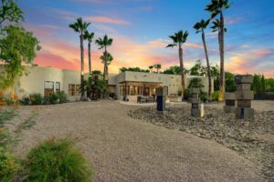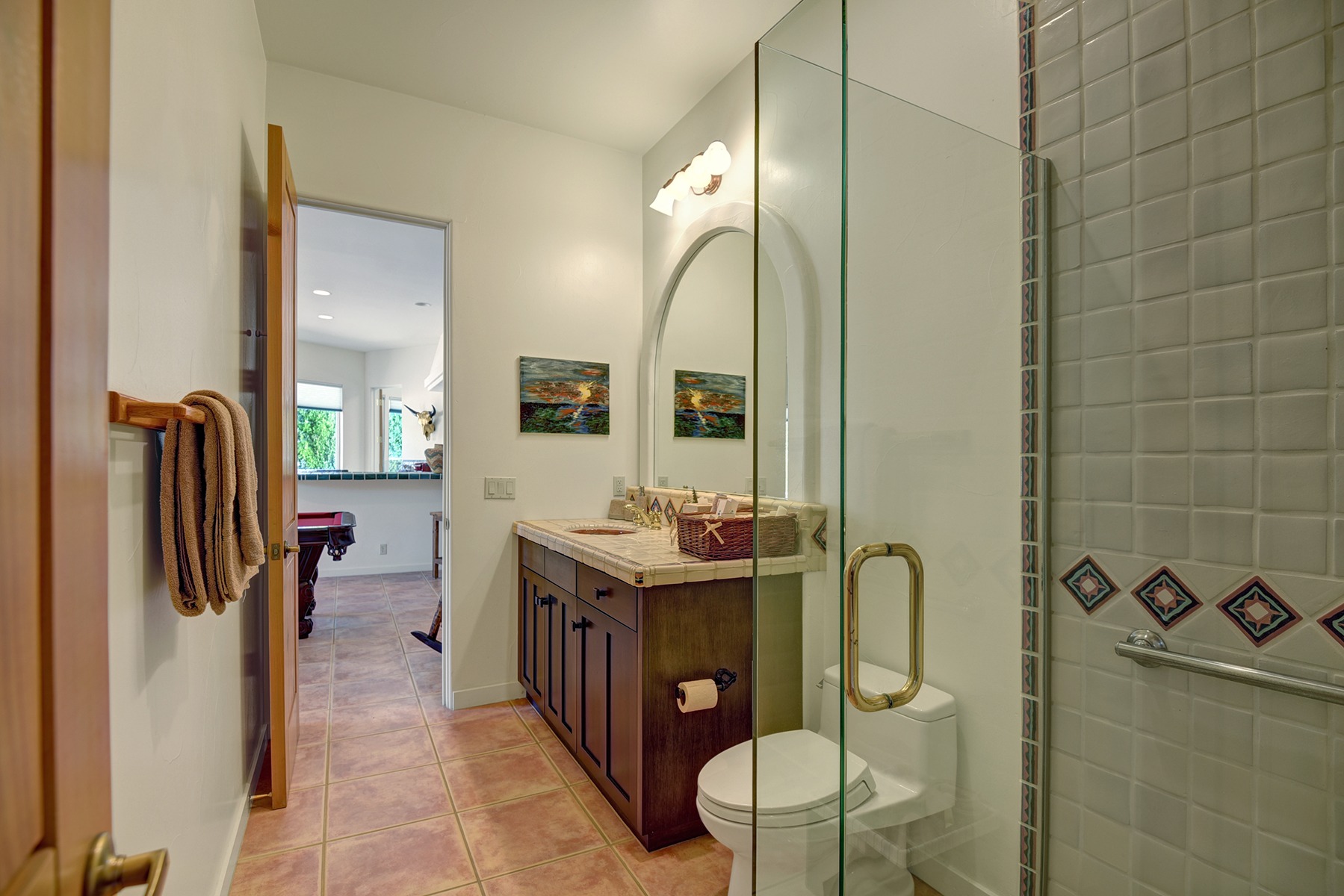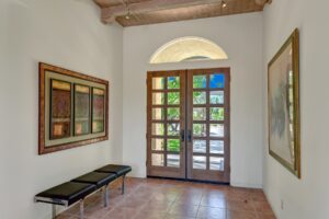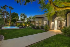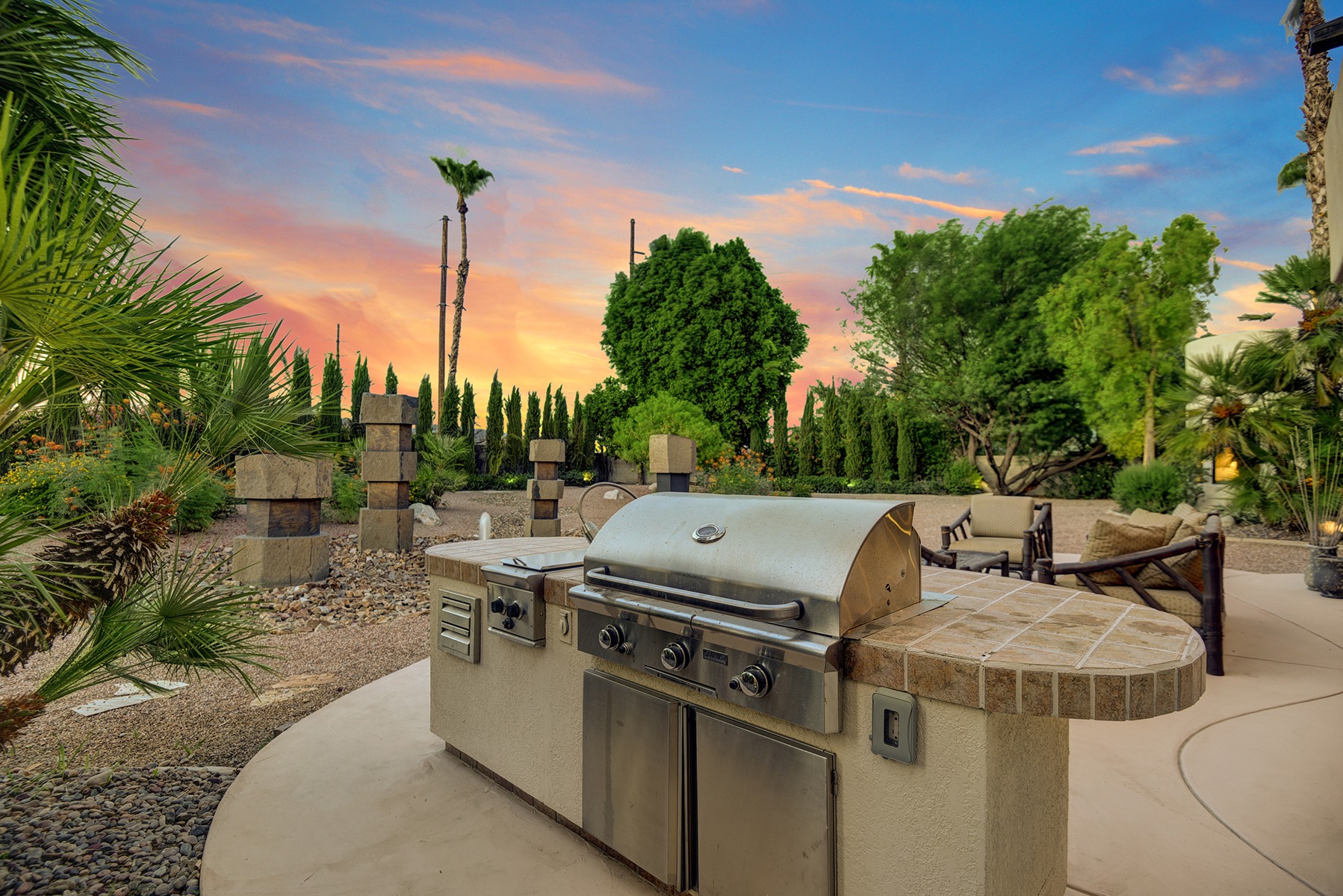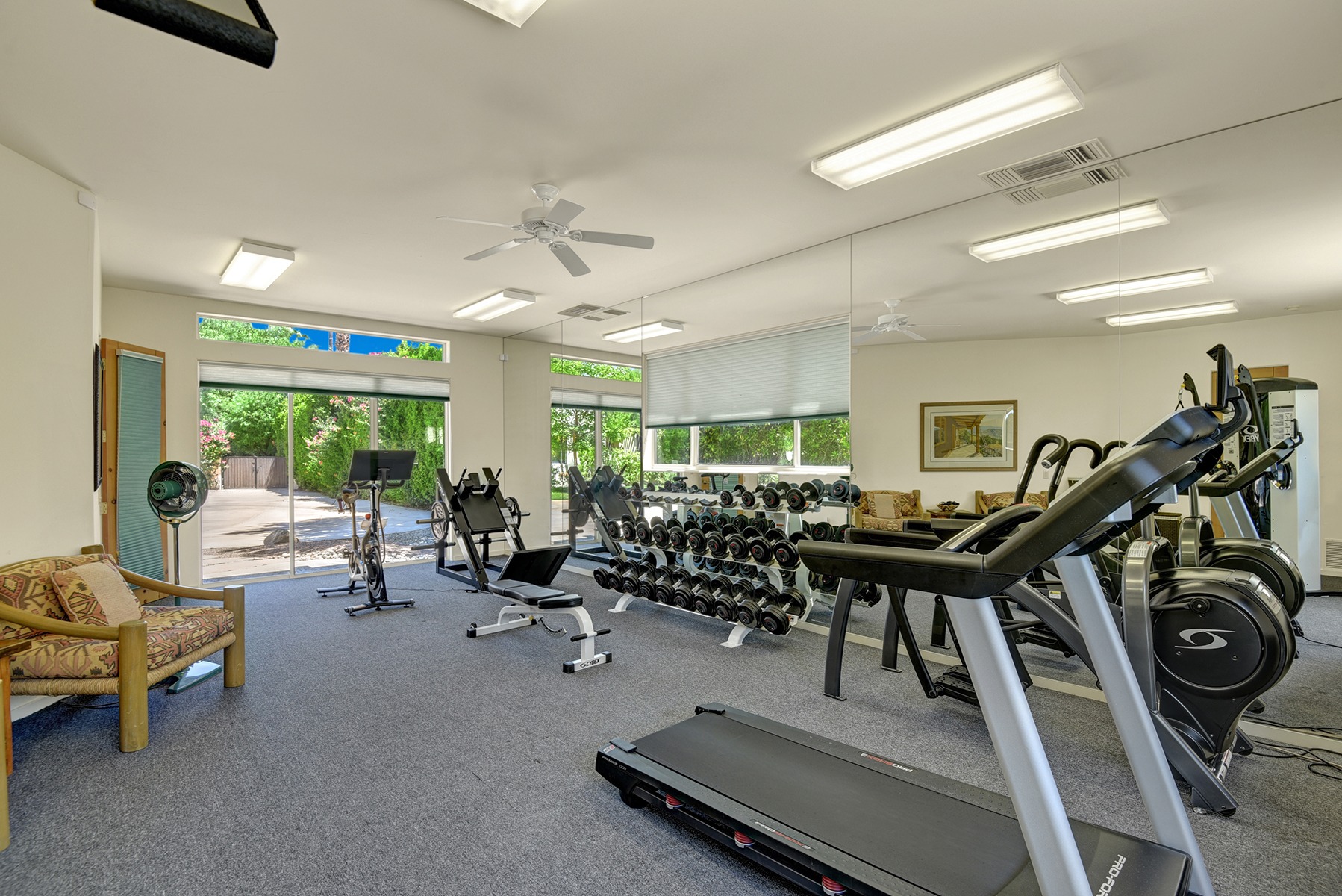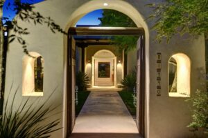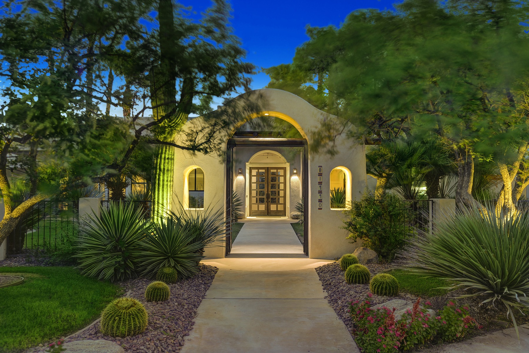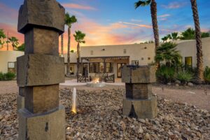 kitchen is beautifully designed with custom cabinetry, quartz countertops, stainless appliances, gas cooktop, copper farm sink & island! The living area offers a Kiva fireplace, wood flooring, french doors and overlooks the den & formal dining room offering additional entertaining space! The primary suite has a sitting area, wood-beamed ceilings, fireplace & direct access to the pool & spa! The primary bath has a jetted tub, walk-in shower, double vanities & walk-in closets! There are 2 guest rooms in the main house both with their own en-suites and an extra bedroom perfect for kids. Your family & friends will love the detached guest house with bar, game area with billiard, bedroom, private bath & large gym!