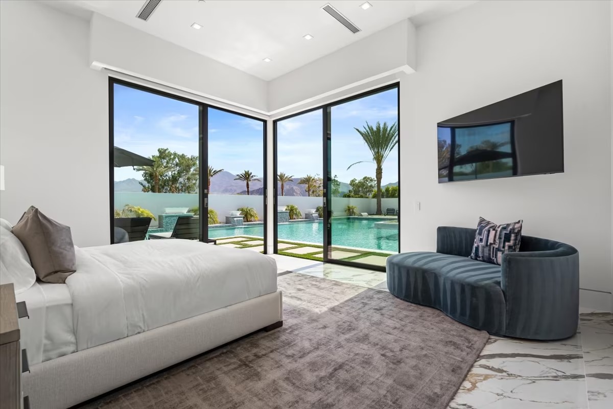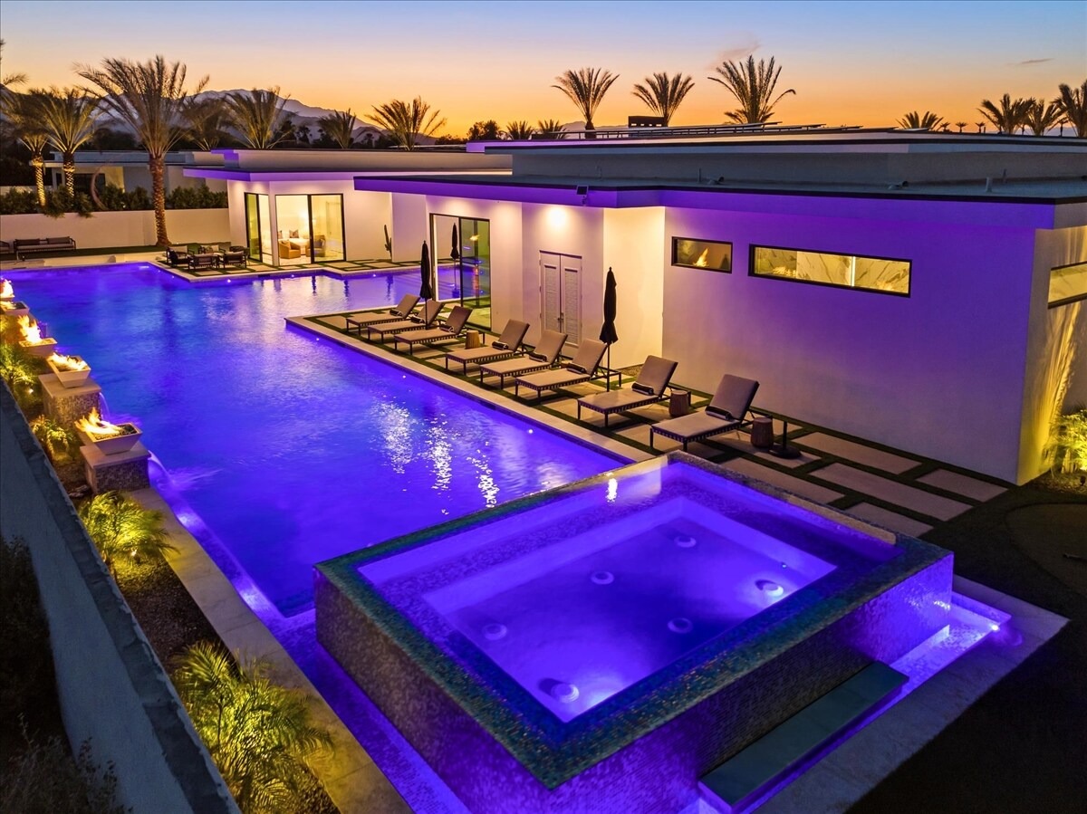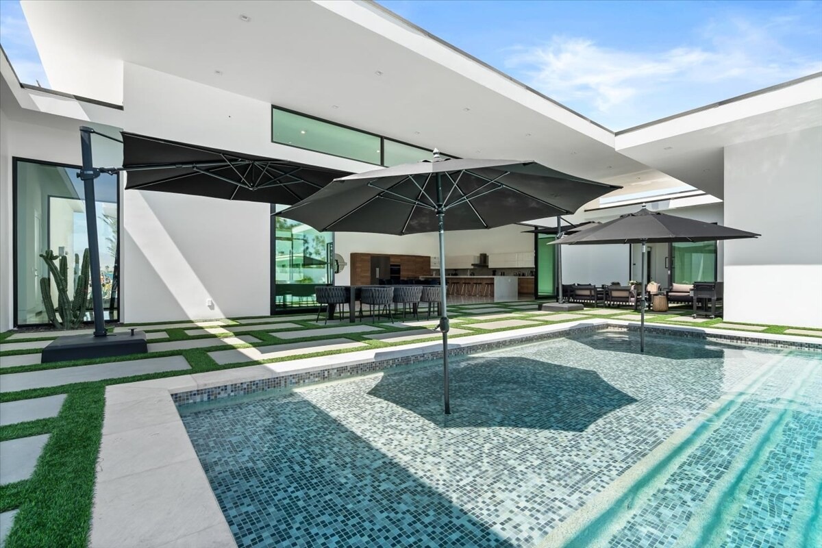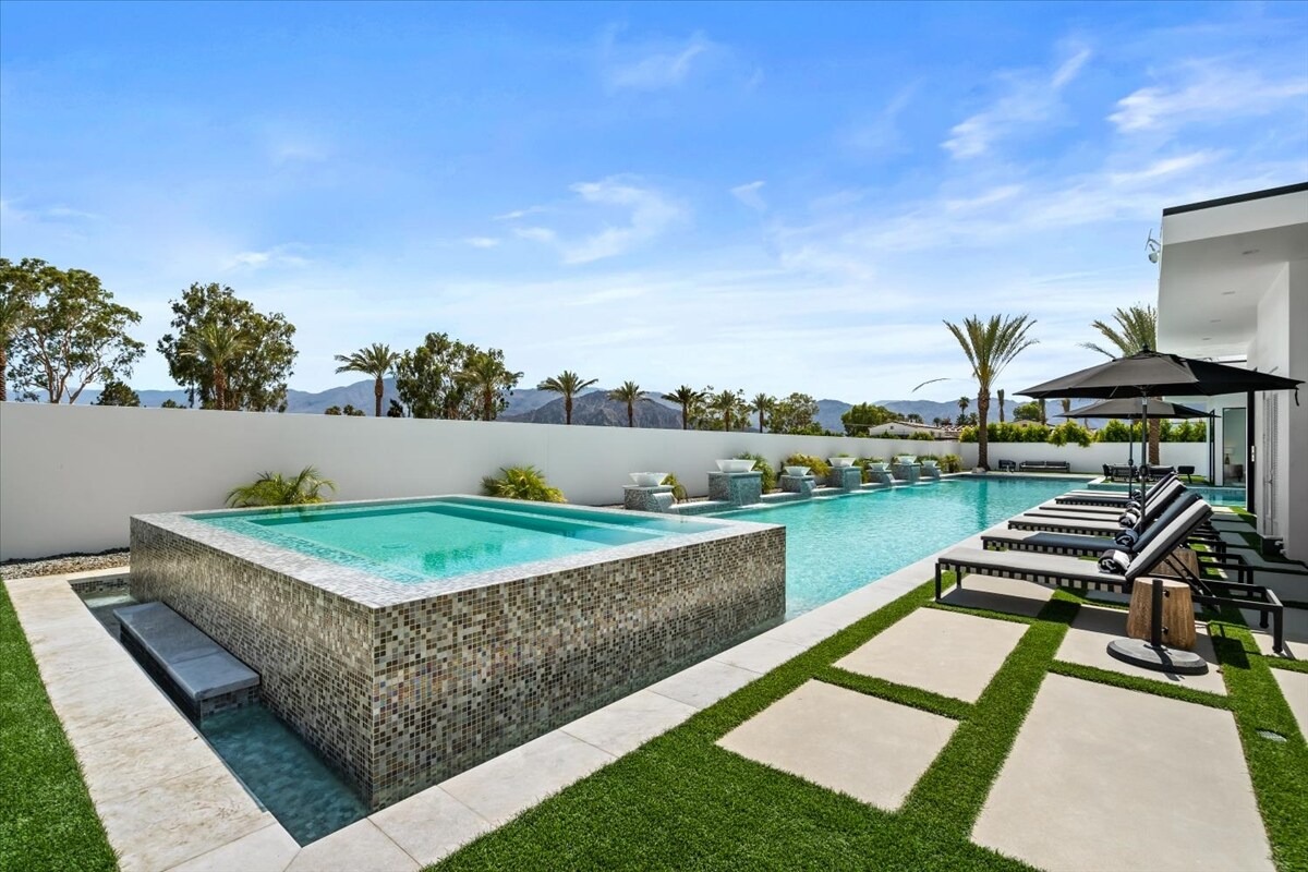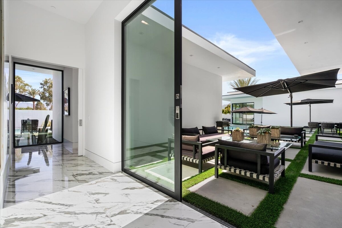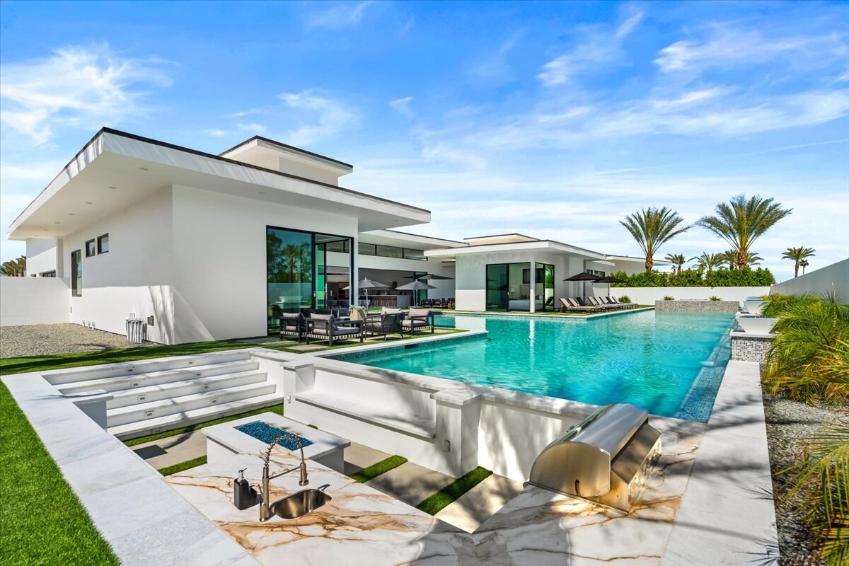 “Outdoor Music Allowed”. Welcome to this ultra-exclusive vacation rental , where this one-of-a-kind residence will exceed all of your expectations while embracing you, your family and your friends with the finest modern architecture and appointments available. Completely unprecedented in the world of short-term-rental properties, the gated community showcases a limited edition of 16 extraordinary residences of uncompromising luxury in a unique village-style enclave all located right across the street from the elegant Madison Club, and just minutes from restaurants and shopping. A massive pool with plenty of features such as very large tanning selves perfect for kids or to lie down in the sun, fire bowls, and LED waterfalls. Chic contemporary style with walls of glass and slideaway Fleetwood doors, oversized great room with 16′ ceilings, 12′ ceilings in other living areas and bedrooms, gorgeous floor tiles imported from Spain, and stunning open kitchens with European cabinetry and top-of-the-line Miele appliances. Every bedroom is a suite, complete with a private bath and large closet. Primary suites elevate personal luxury to new heights, with outdoor access, walk-in multi-head showers, freestanding tubs, and oversized walk-in closets with Italian-made custom built-ins. Enjoy the beauty of modern lighting, contemporary artwork, chic furnishings, Grohe plumbing fixtures and pivoting glass entry doors. Landscaping is impeccable and upscale, and select residences feature putting greens, fire bowls and fountains. Enviable location right next to the private communities of The Madison Club, The Citrus Club and Hideaway Golf Club makes it easy for guests to walk or bike to concerts, shops and restaurants. The Indian Wells Tennis Garden, high-end shopping on El Paseo, abundant recreation, and Palm Springs International Airport are all within easy reach. The ultimate luxury vacation awaits! Book your unforgettable stay today!