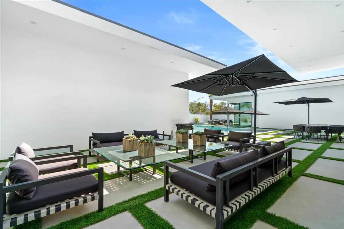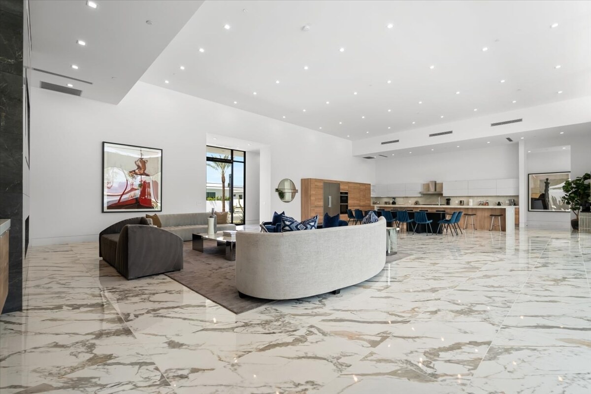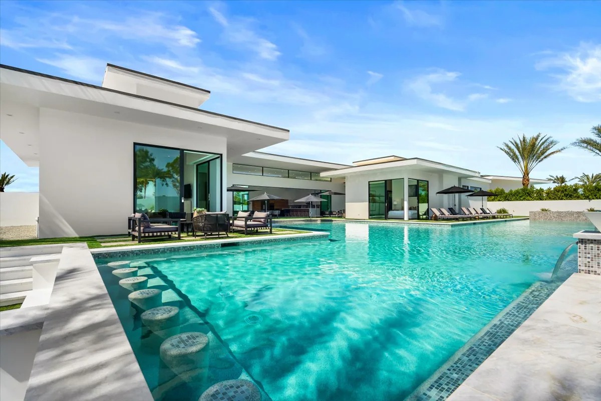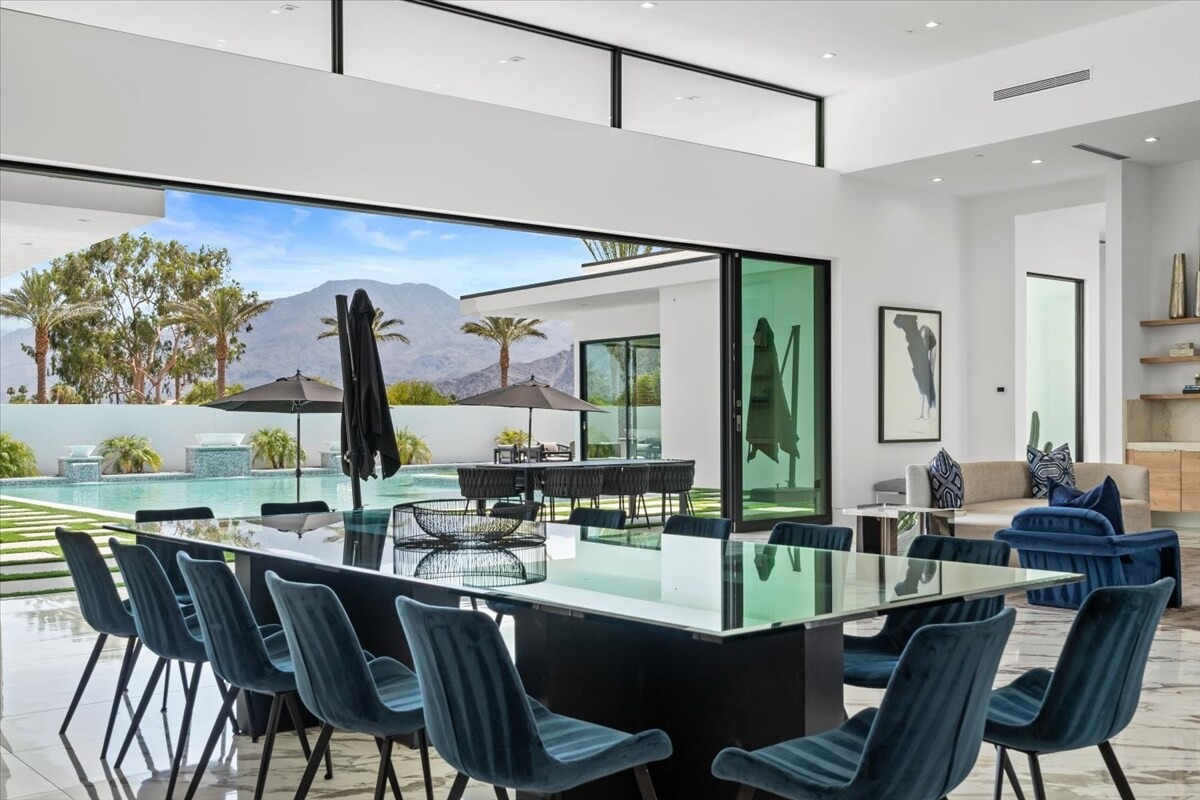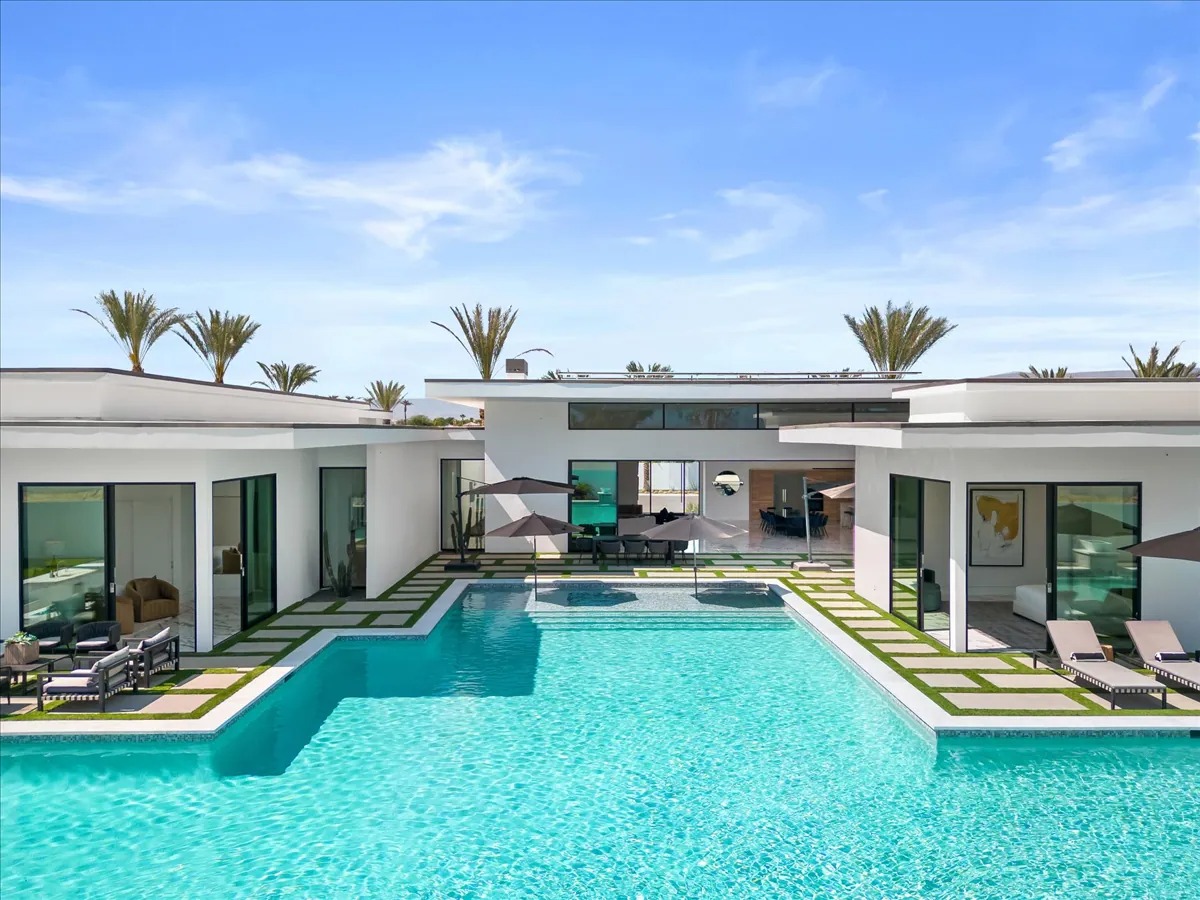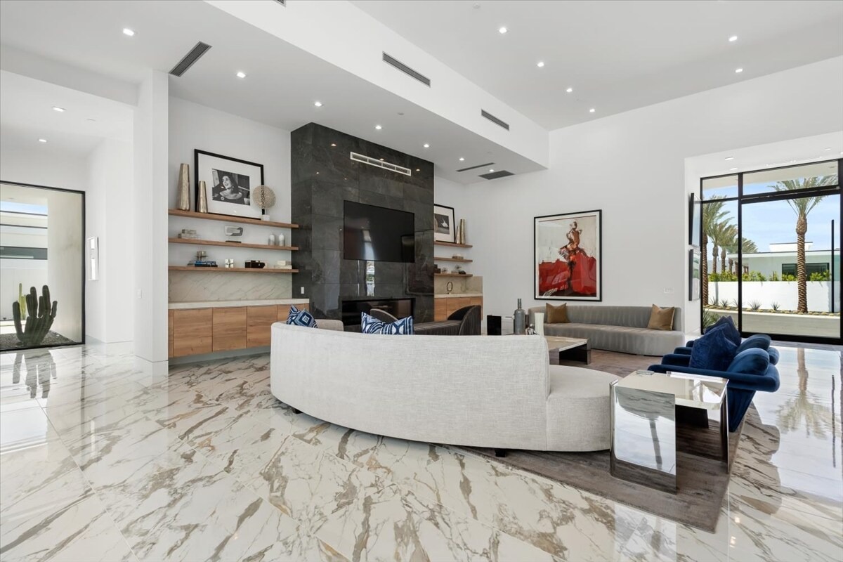 “Outdoor Music Allowed”. Welcome to this ultra-exclusive vacation rental , where this one-of-a-kind residence will exceed all of your expectations while embracing you, your family and your friends with the finest modern architecture and appointments available. Completely unprecedented in the world of short-term-rental properties, the gated community showcases a limited edition of 16 extraordinary residences of uncompromising luxury in a unique village-style enclave all located right across the street from the elegant Madison Club, and just minutes from restaurants and shopping. A massive pool with plenty of features such as very large tanning selves perfect for kids or to lie down in the sun, fire bowls, and LED waterfalls. Chic contemporary style with walls of glass and slideaway Fleetwood doors, oversized great room with 16′ ceilings, 12′ ceilings in other living areas and bedrooms, gorgeous floor tiles imported from Spain, and stunning open kitchens with European cabinetry and top-of-the-line Miele appliances. Every bedroom is a suite, complete with a private bath and large closet. Primary suites elevate personal luxury to new heights, with outdoor access, walk-in multi-head showers, freestanding tubs, and oversized walk-in closets with Italian-made custom built-ins. Enjoy the beauty of modern lighting, contemporary artwork, chic furnishings, Grohe plumbing fixtures and pivoting glass entry doors. Landscaping is impeccable and upscale, and select residences feature putting greens, fire bowls and fountains. Enviable location right next to the private communities of The Madison Club, The Citrus Club and Hideaway Golf Club makes it easy for guests to walk or bike to concerts, shops and restaurants. The Indian Wells Tennis Garden, high-end shopping on El Paseo, abundant recreation, and Palm Springs International Airport are all within easy reach. The ultimate luxury vacation awaits! Book your unforgettable stay today!