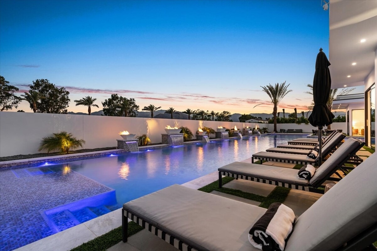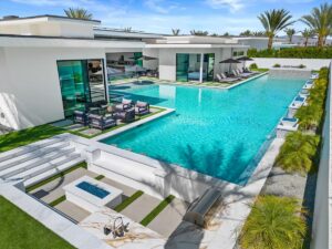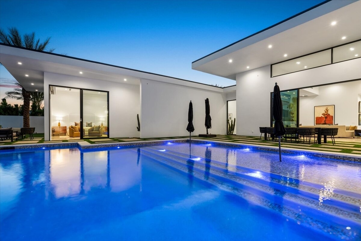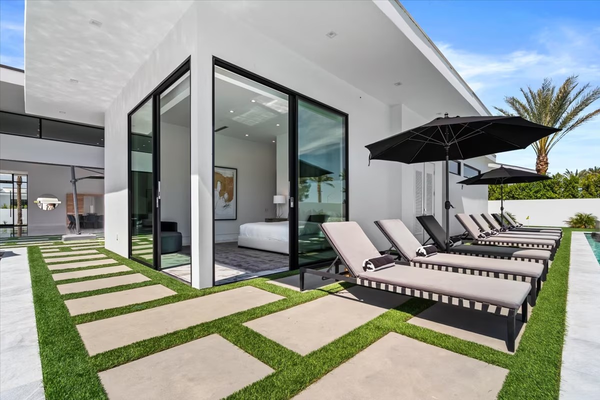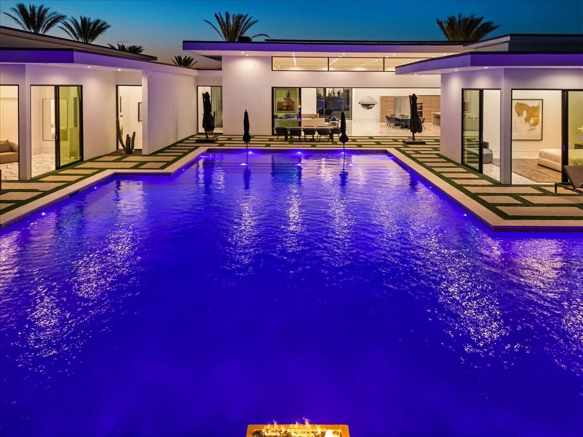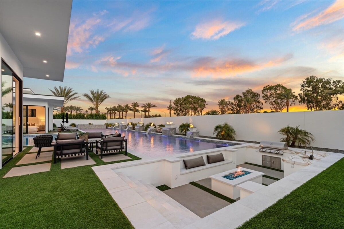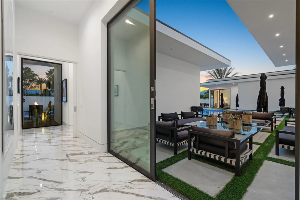 “Outdoor Music Allowed”. Welcome to this ultra-exclusive vacation rental , where this one-of-a-kind residence will exceed all of your expectations while embracing you, your family and your friends with the finest modern architecture and appointments available. Completely unprecedented in the world of short-term-rental properties, the gated community showcases a limited edition of 16 extraordinary residences of uncompromising luxury in a unique village-style enclave all located right across the street from the elegant Madison Club, and just minutes from restaurants and shopping. A massive pool with plenty of features such as very large tanning selves perfect for kids or to lie down in the sun, fire bowls, and LED waterfalls. Chic contemporary style with walls of glass and slideaway Fleetwood doors, oversized great room with 16′ ceilings, 12′ ceilings in other living areas and bedrooms, gorgeous floor tiles imported from Spain, and stunning open kitchens with European cabinetry and top-of-the-line Miele appliances. Every bedroom is a suite, complete with a private bath and large closet. Primary suites elevate personal luxury to new heights, with outdoor access, walk-in multi-head showers, freestanding tubs, and oversized walk-in closets with Italian-made custom built-ins. Enjoy the beauty of modern lighting, contemporary artwork, chic furnishings, Grohe plumbing fixtures and pivoting glass entry doors. Landscaping is impeccable and upscale, and select residences feature putting greens, fire bowls and fountains. Enviable location right next to the private communities of The Madison Club, The Citrus Club and Hideaway Golf Club makes it easy for guests to walk or bike to concerts, shops and restaurants. The Indian Wells Tennis Garden, high-end shopping on El Paseo, abundant recreation, and Palm Springs International Airport are all within easy reach. The ultimate luxury vacation awaits! Book your unforgettable stay today!