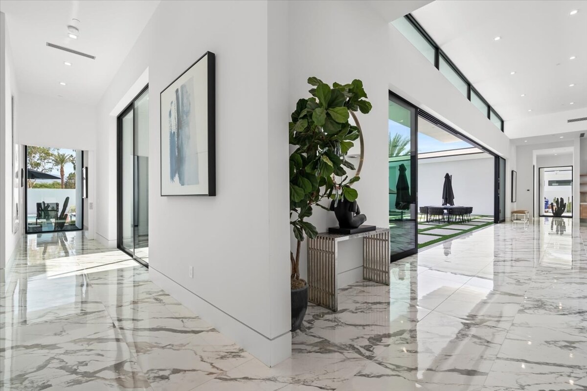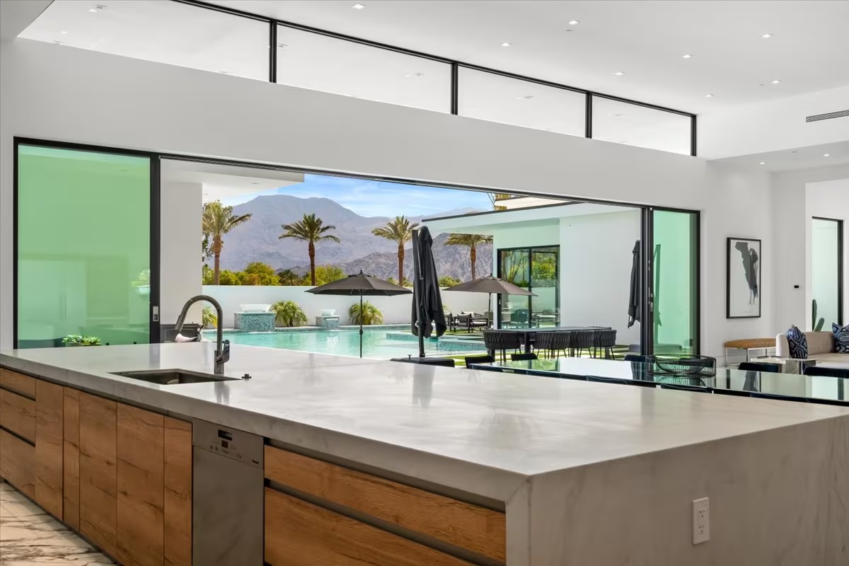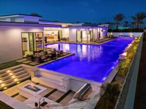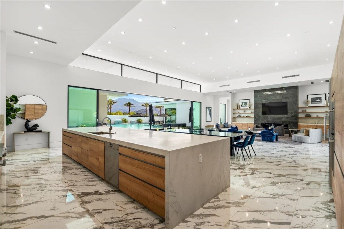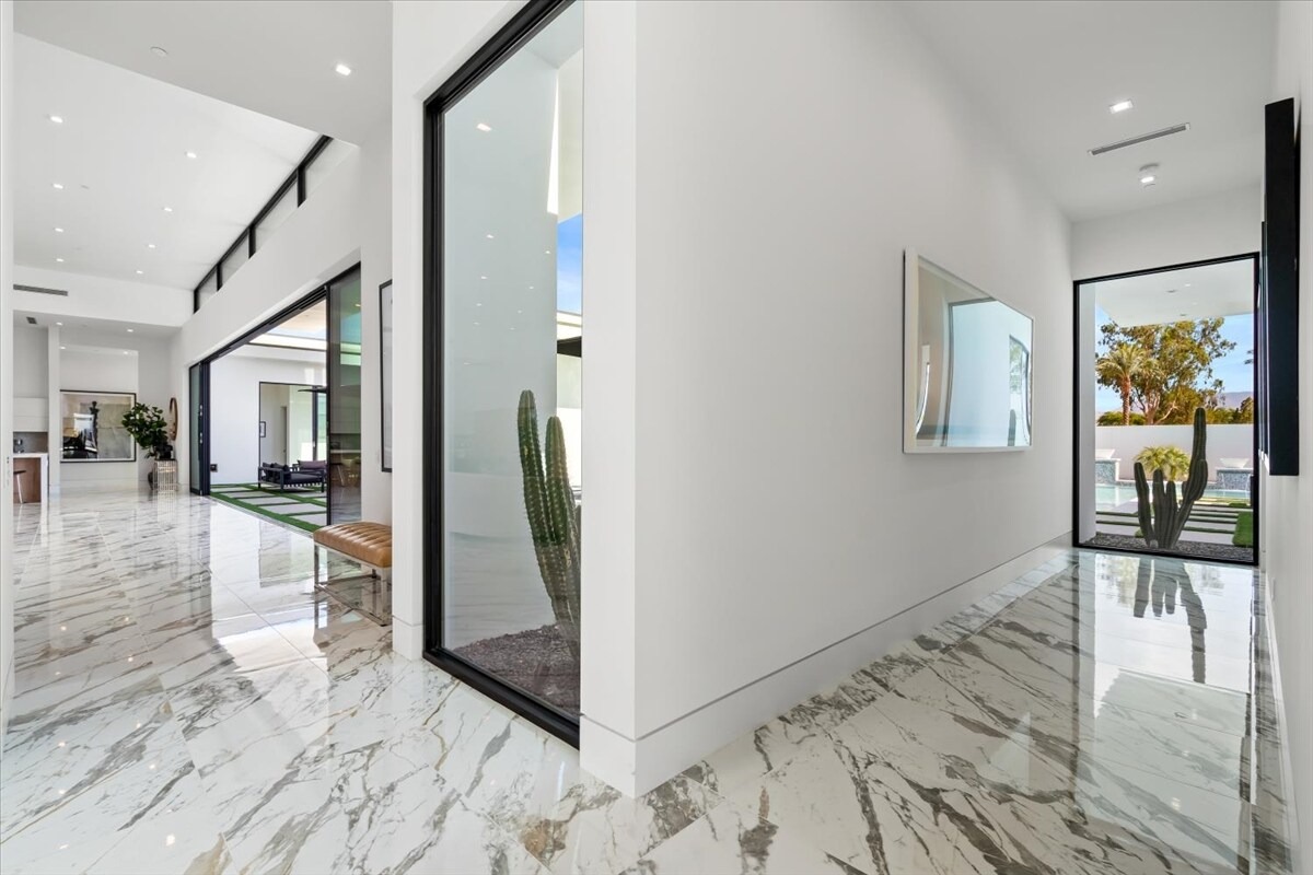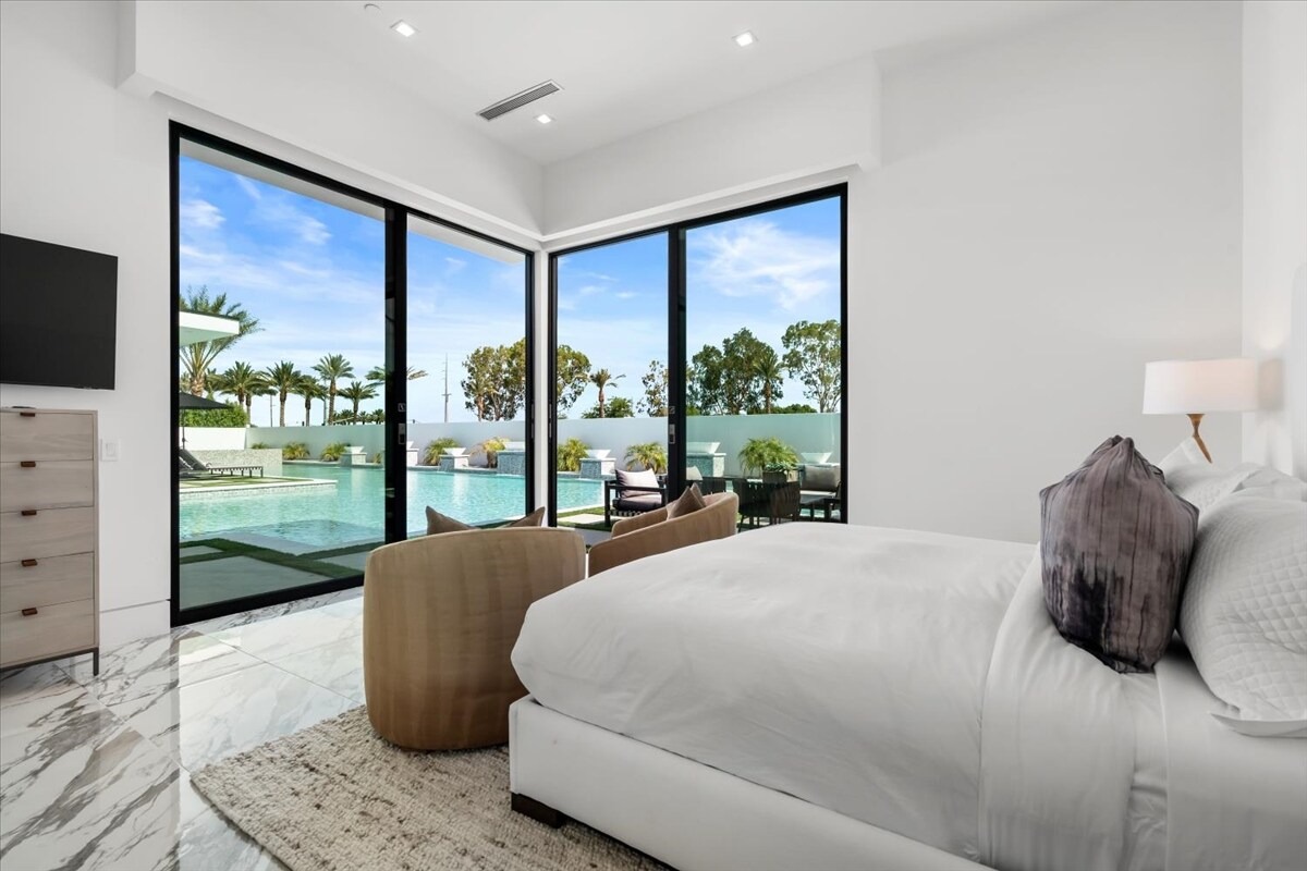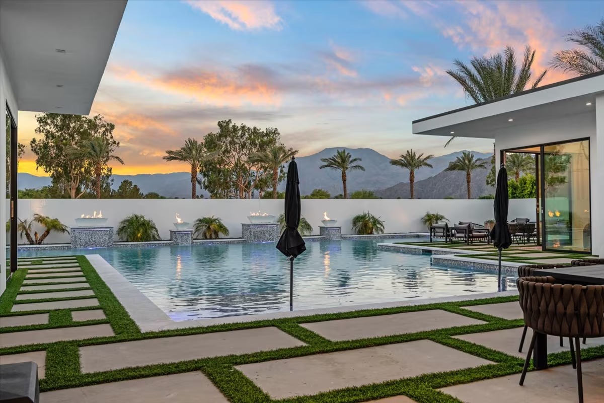“Outdoor Music Allowed”. Welcome to this ultra-exclusive vacation rental , where this one-of-a-kind residence will exceed all of your expectations while embracing you, your family and your friends with the finest modern architecture and appointments available. Completely unprecedented in the world of short-term-rental properties, the gated community showcases a limited edition of 16 extraordinary residences of uncompromising luxury in a unique village-style enclave all located right across the street from the elegant Madison Club, and just minutes from restaurants and shopping. A massive pool with plenty of features such as very large tanning selves perfect for kids or to lie down in the sun, fire bowls, and LED waterfalls. Chic contemporary style with walls of glass and slideaway Fleetwood doors, oversized great room with 16′ ceilings, 12′ ceilings in other living areas and bedrooms, gorgeous floor tiles imported from Spain, and stunning open kitchens with European cabinetry and top-of-the-line Miele appliances. Every bedroom is a suite, complete with a private bath and large closet. Primary suites elevate personal luxury to new heights, with outdoor access, walk-in multi-head showers, freestanding tubs, and oversized walk-in closets with Italian-made custom built-ins. Enjoy the beauty of modern lighting, contemporary artwork, chic furnishings, Grohe plumbing fixtures and pivoting glass entry doors. Landscaping is impeccable and upscale, and select residences feature putting greens, fire bowls and fountains. Enviable location right next to the private communities of The Madison Club, The Citrus Club and Hideaway Golf Club makes it easy for guests to walk or bike to concerts, shops and restaurants. The Indian Wells Tennis Garden, high-end shopping on El Paseo, abundant recreation, and Palm Springs International Airport are all within easy reach. The ultimate luxury vacation awaits! Book your unforgettable stay today!
