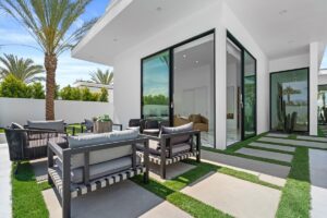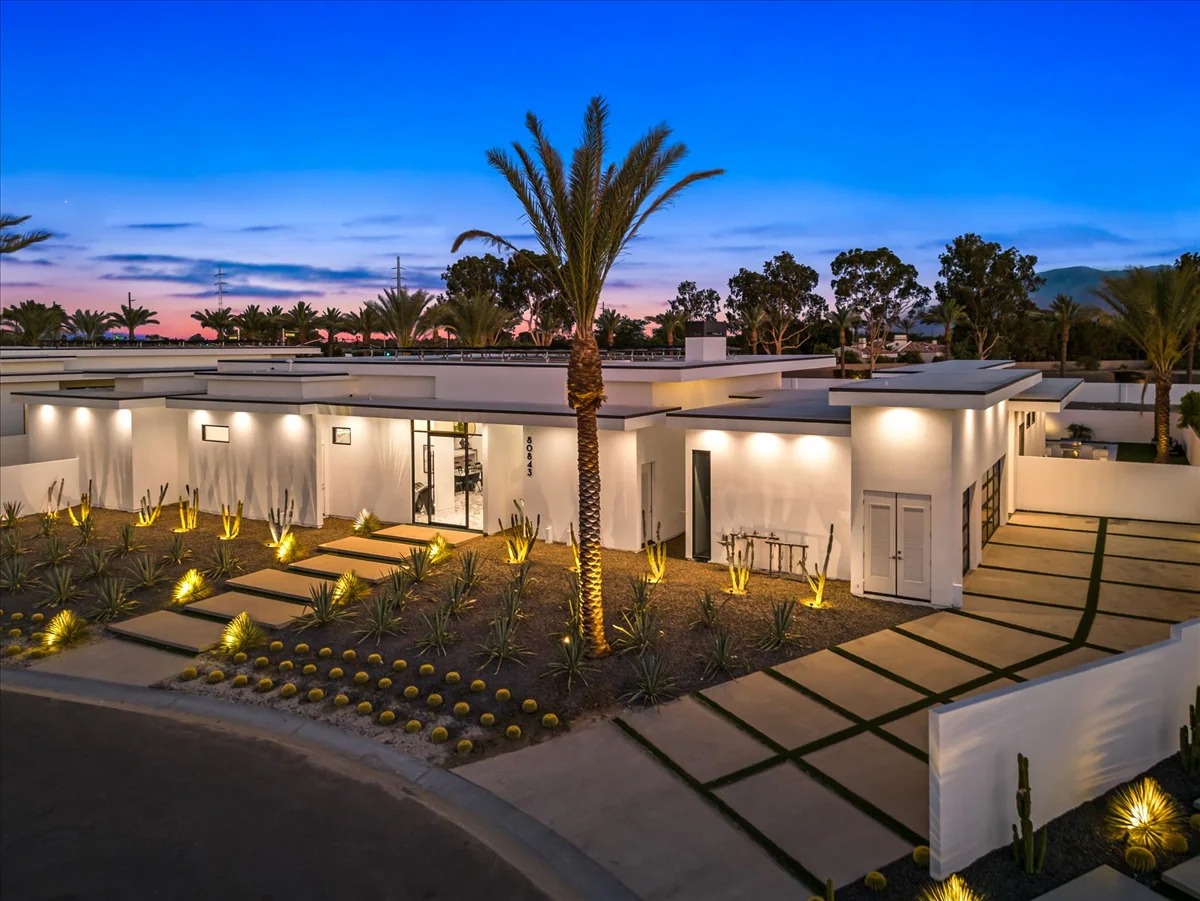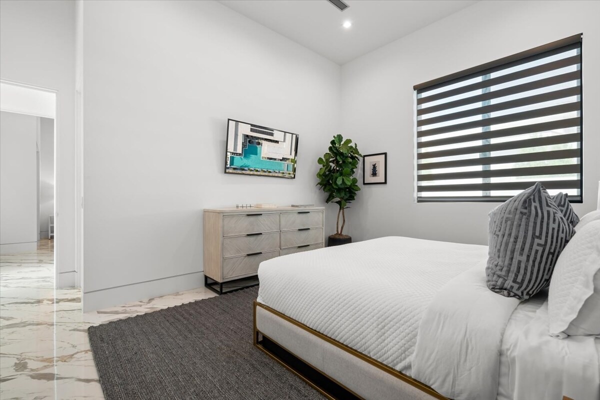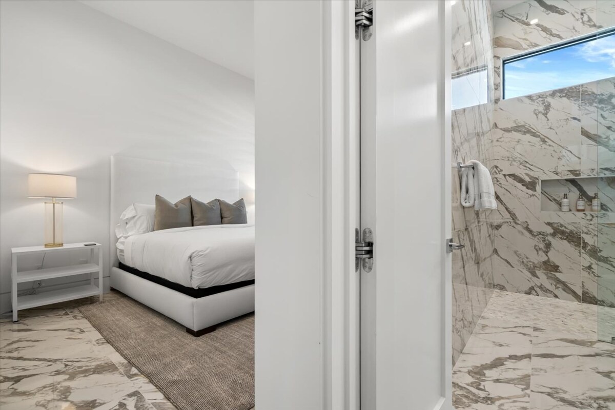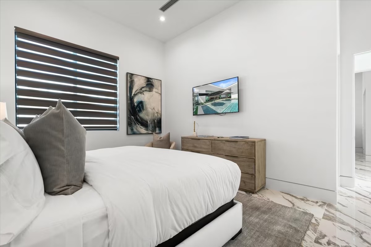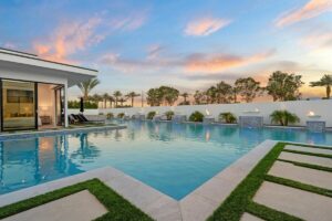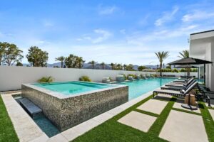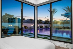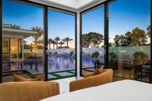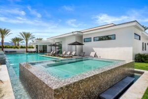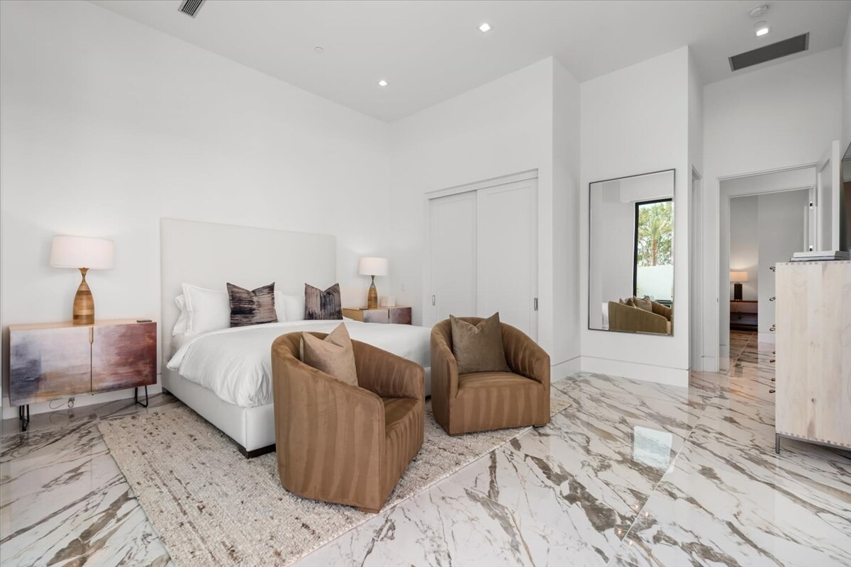“Outdoor Music Allowed”. Welcome to this ultra-exclusive vacation rental , where this one-of-a-kind residence will exceed all of your expectations while embracing you, your family and your friends with the finest modern architecture and appointments available. Completely unprecedented in the world of short-term-rental properties, the gated community showcases a limited edition of 16 extraordinary residences of uncompromising luxury in a unique village-style enclave all located right across the street from the elegant Madison Club, and just minutes from restaurants and shopping. A massive pool with plenty of features such as very large tanning selves perfect for kids or to lie down in the sun, fire bowls, and LED waterfalls. Chic contemporary style with walls of glass and slideaway Fleetwood doors, oversized great room with 16′ ceilings, 12′ ceilings in other living areas and bedrooms, gorgeous floor tiles imported from Spain, and stunning open kitchens with European cabinetry and top-of-the-line Miele appliances. Every bedroom is a suite, complete with a private bath and large closet. Primary suites elevate personal luxury to new heights, with outdoor access, walk-in multi-head showers, freestanding tubs, and oversized walk-in closets with Italian-made custom built-ins. Enjoy the beauty of modern lighting, contemporary artwork, chic furnishings, Grohe plumbing fixtures and pivoting glass entry doors. Landscaping is impeccable and upscale, and select residences feature putting greens, fire bowls and fountains. Enviable location right next to the private communities of The Madison Club, The Citrus Club and Hideaway Golf Club makes it easy for guests to walk or bike to concerts, shops and restaurants. The Indian Wells Tennis Garden, high-end shopping on El Paseo, abundant recreation, and Palm Springs International Airport are all within easy reach. The ultimate luxury vacation awaits! Book your unforgettable stay today!