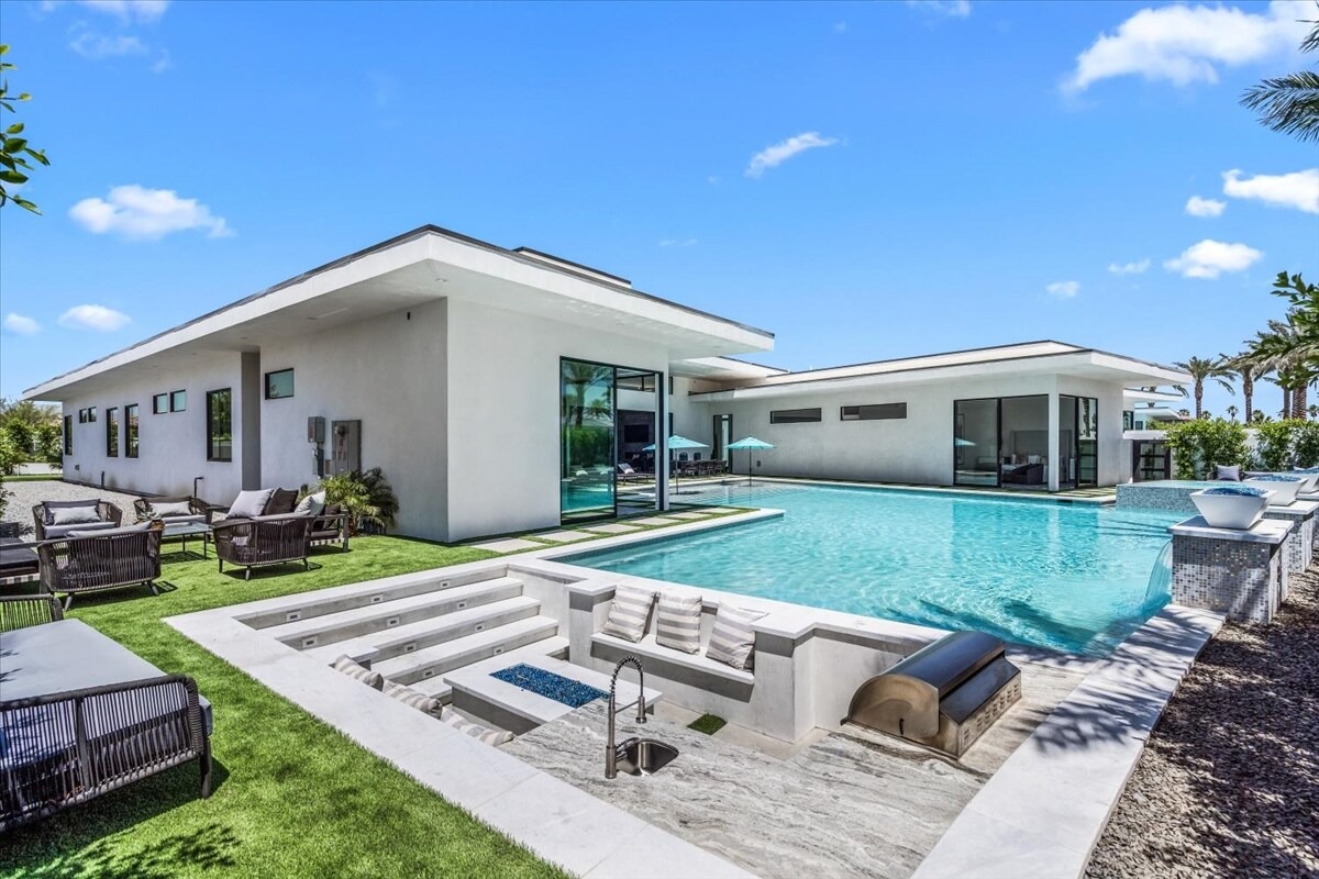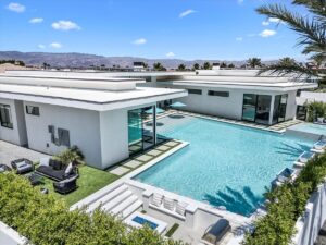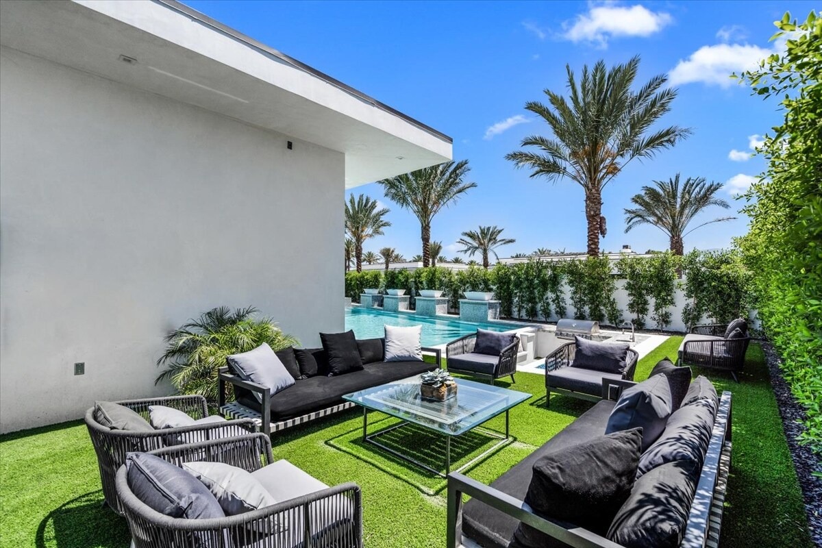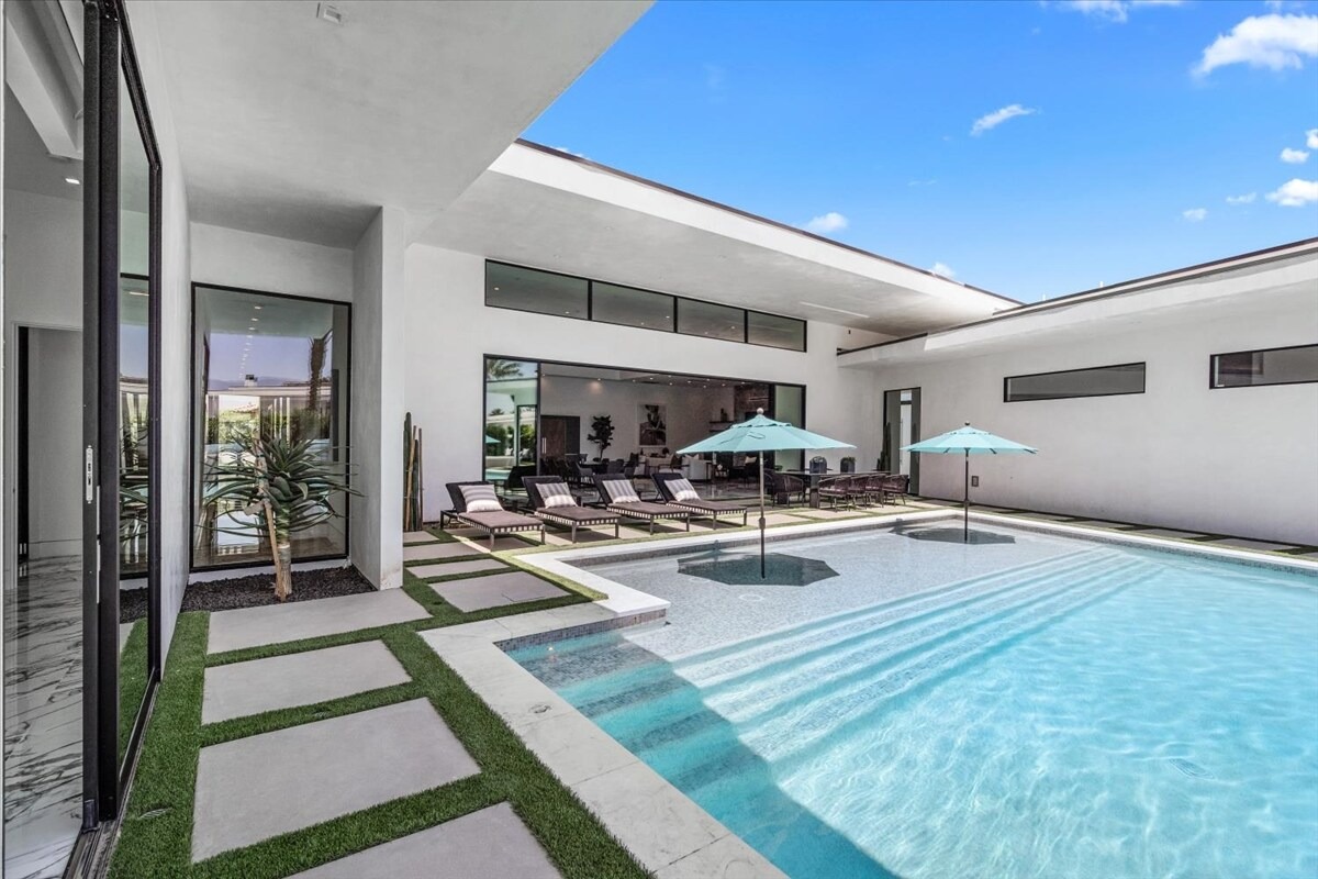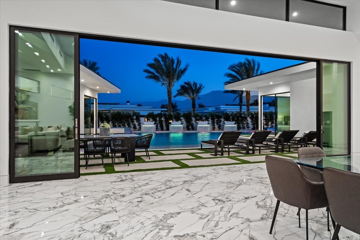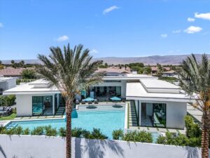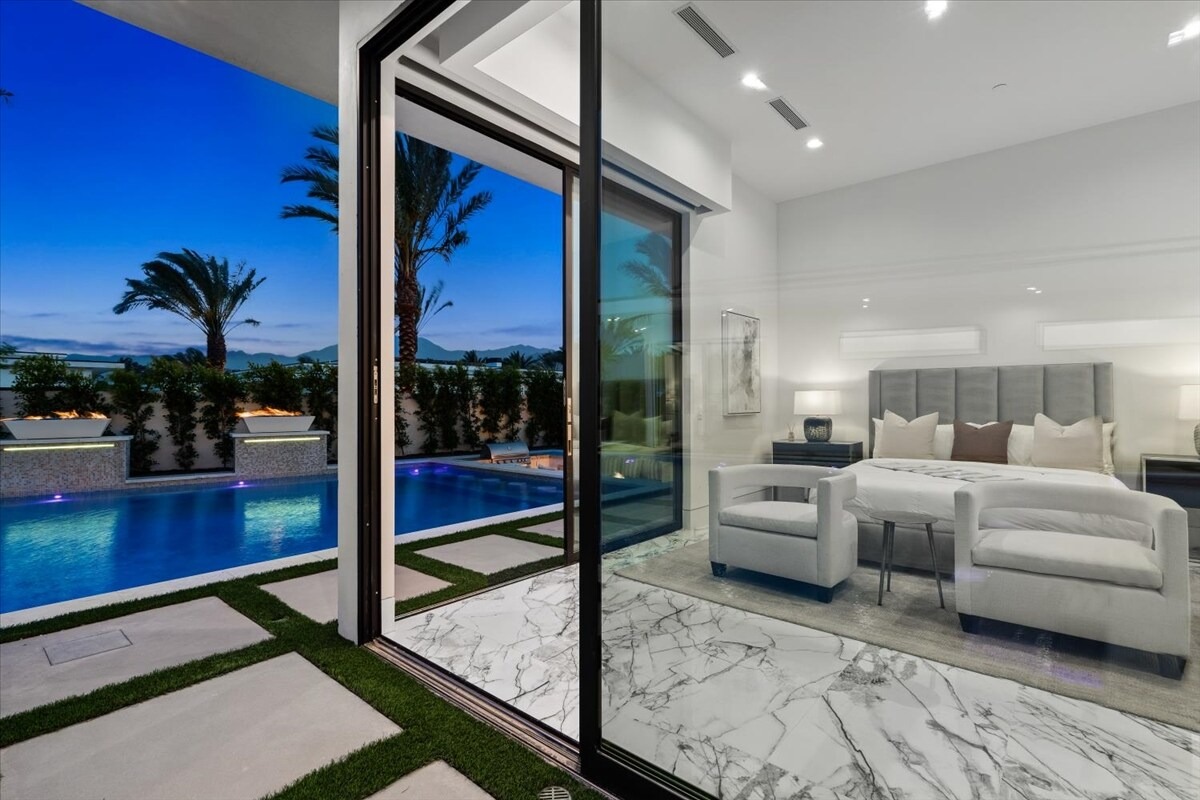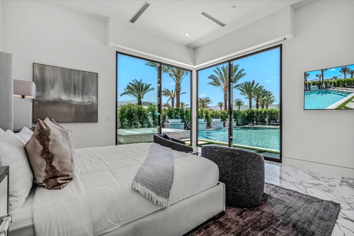 “Outdoor Music Allowed”. Welcome to this ultra-exclusive vacation rental , where this one-of-a-kind residence will exceed all of your expectations while embracing you, your family and your friends with the finest modern architecture and appointments available. Completely unprecedented in the world of short-term-rental properties, the gated community showcases a limited edition of 16 extraordinary residences of uncompromising luxury in a unique village-style enclave all located right across the street from the elegant Madison Club, and just minutes from restaurants and shopping. A massive pool with plenty of features such as very large tanning selves perfect for kids or to lie down in the sun, fire bowls, and LED waterfalls. Chic contemporary style with walls of glass and slideaway Fleetwood doors, oversized great room with 16′ ceilings, 12′ ceilings in other living areas and bedrooms, gorgeous floor tiles imported from Spain, and stunning open kitchens with European cabinetry and top-of-the-line Miele appliances. Every bedroom is a suite, complete with a private bath and large closet. Primary suites elevate personal luxury to new heights, with outdoor access, walk-in multi-head showers, freestanding tubs, and oversized walk-in closets with Italian-made custom built-ins. Enjoy the beauty of modern lighting, contemporary artwork, chic furnishings, Grohe plumbing fixtures and pivoting glass entry doors. Landscaping is impeccable and upscale, and select residences feature putting greens, fire bowls and fountains. Enviable location right next to the private communities of The Madison Club, The Citrus Club and Hideaway Golf Club makes it easy for guests to walk or bike to concerts, shops and restaurants. The Indian Wells Tennis Garden, high-end shopping on El Paseo, abundant recreation, and Palm Springs International Airport are all within easy reach. The ultimate luxury vacation awaits! Book your unforgettable stay today!