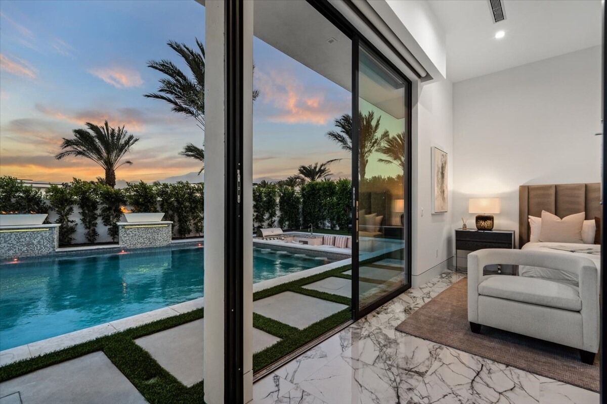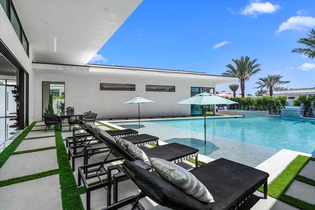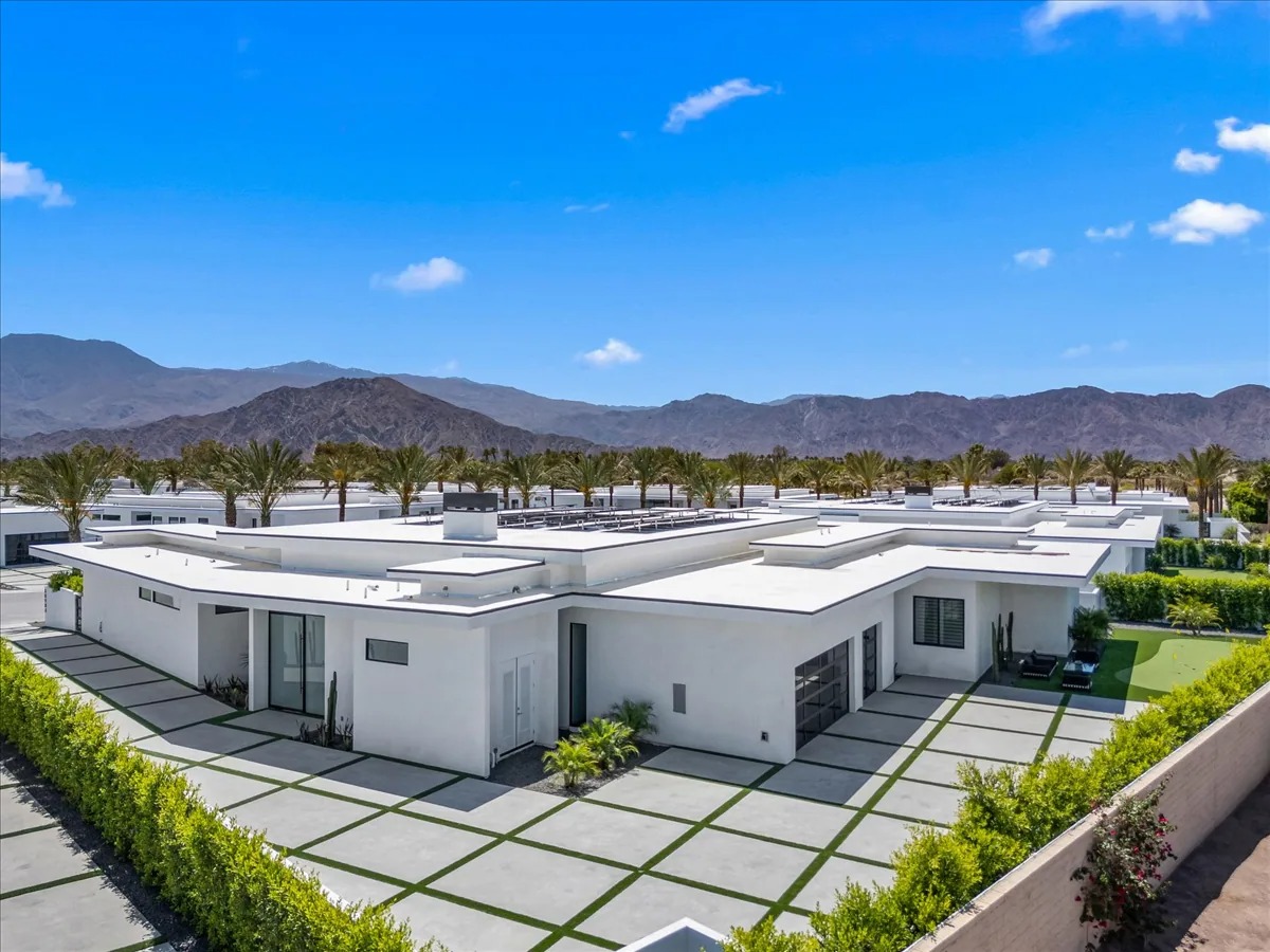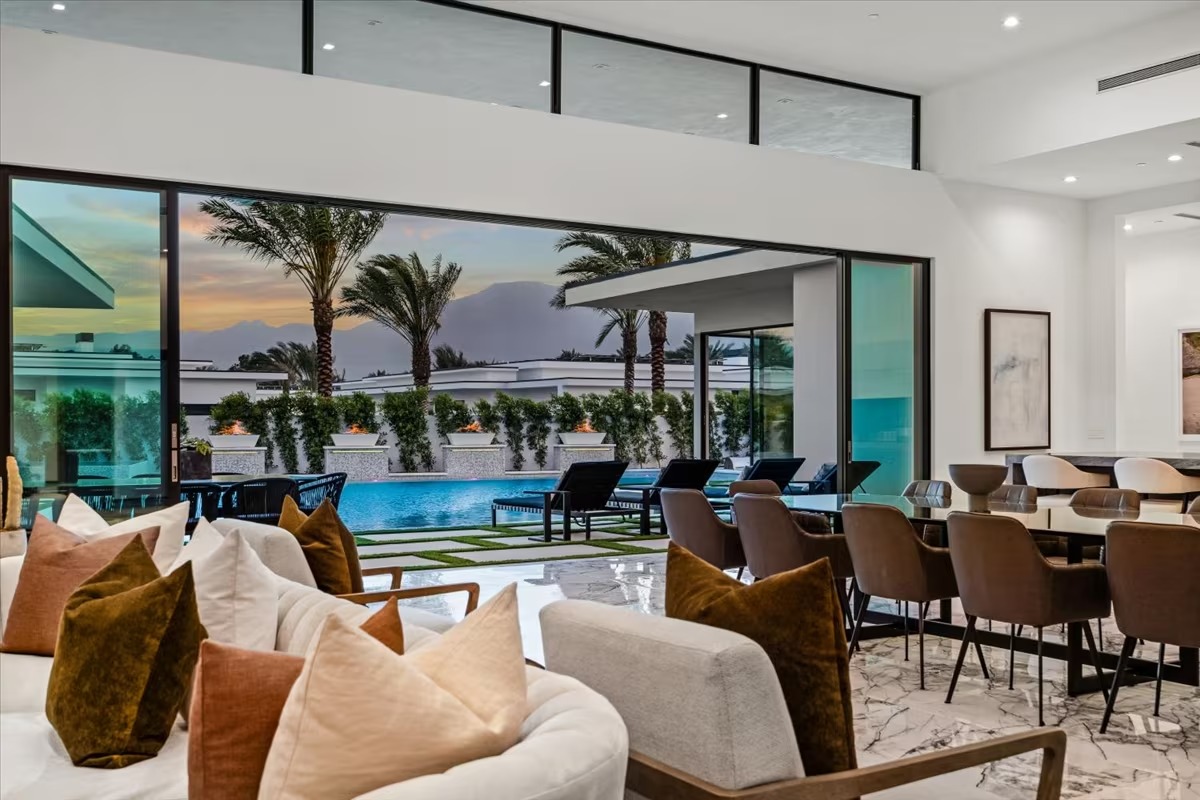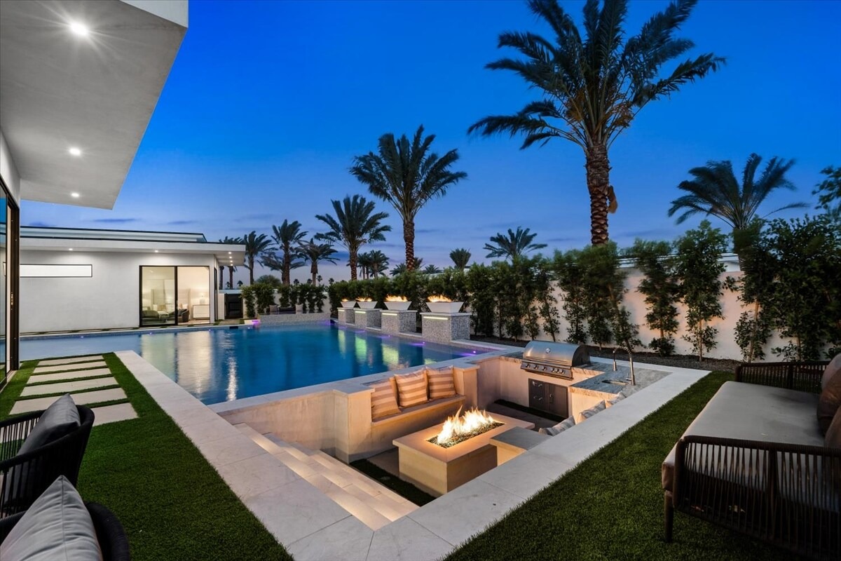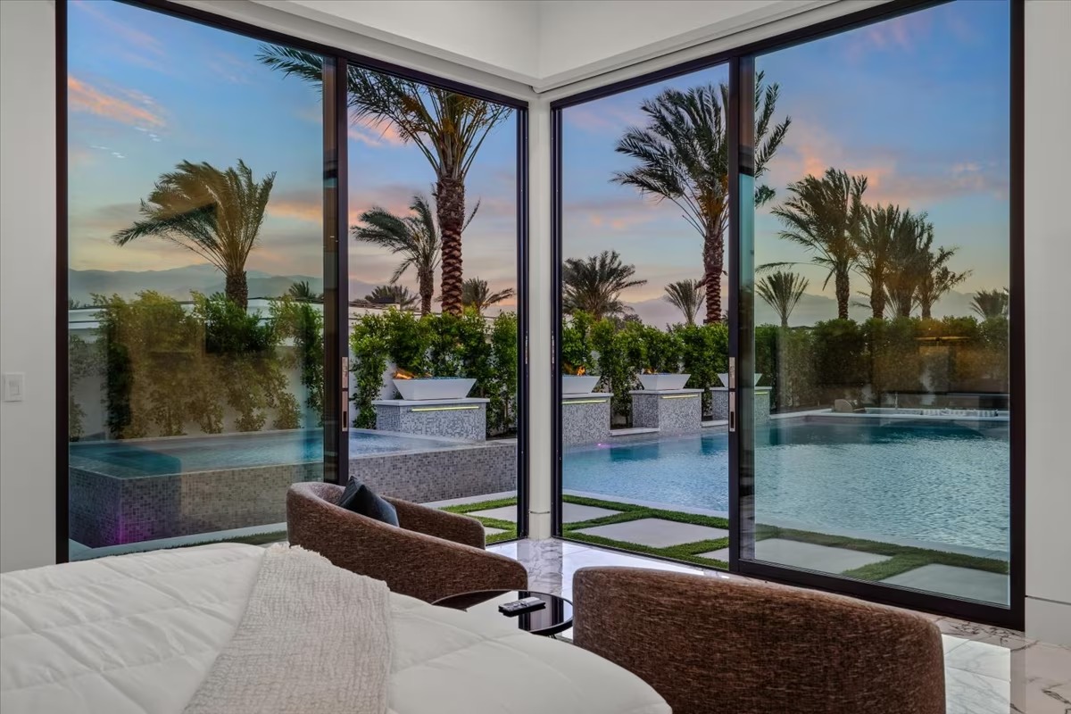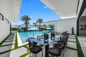 “Outdoor Music Allowed”. Welcome to this ultra-exclusive vacation rental , where this one-of-a-kind residence will exceed all of your expectations while embracing you, your family and your friends with the finest modern architecture and appointments available. Completely unprecedented in the world of short-term-rental properties, the gated community showcases a limited edition of 16 extraordinary residences of uncompromising luxury in a unique village-style enclave all located right across the street from the elegant Madison Club, and just minutes from restaurants and shopping. A massive pool with plenty of features such as very large tanning selves perfect for kids or to lie down in the sun, fire bowls, and LED waterfalls. Chic contemporary style with walls of glass and slideaway Fleetwood doors, oversized great room with 16′ ceilings, 12′ ceilings in other living areas and bedrooms, gorgeous floor tiles imported from Spain, and stunning open kitchens with European cabinetry and top-of-the-line Miele appliances. Every bedroom is a suite, complete with a private bath and large closet. Primary suites elevate personal luxury to new heights, with outdoor access, walk-in multi-head showers, freestanding tubs, and oversized walk-in closets with Italian-made custom built-ins. Enjoy the beauty of modern lighting, contemporary artwork, chic furnishings, Grohe plumbing fixtures and pivoting glass entry doors. Landscaping is impeccable and upscale, and select residences feature putting greens, fire bowls and fountains. Enviable location right next to the private communities of The Madison Club, The Citrus Club and Hideaway Golf Club makes it easy for guests to walk or bike to concerts, shops and restaurants. The Indian Wells Tennis Garden, high-end shopping on El Paseo, abundant recreation, and Palm Springs International Airport are all within easy reach. The ultimate luxury vacation awaits! Book your unforgettable stay today!