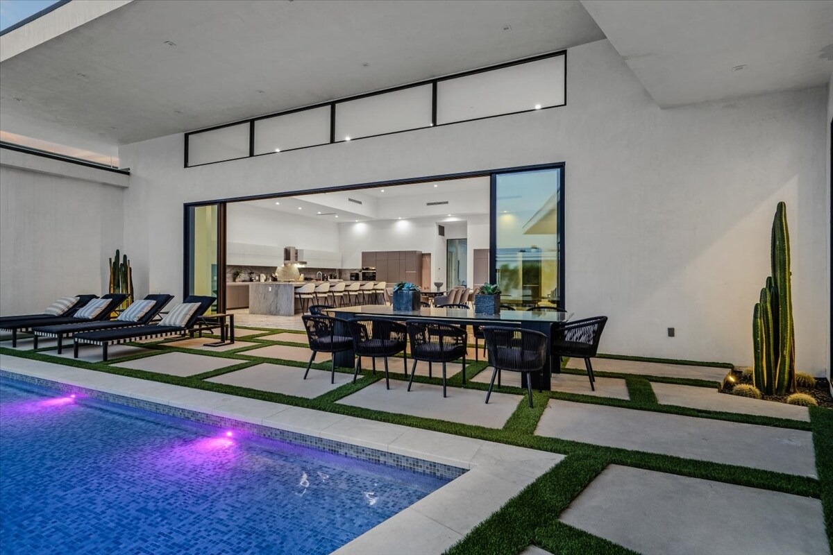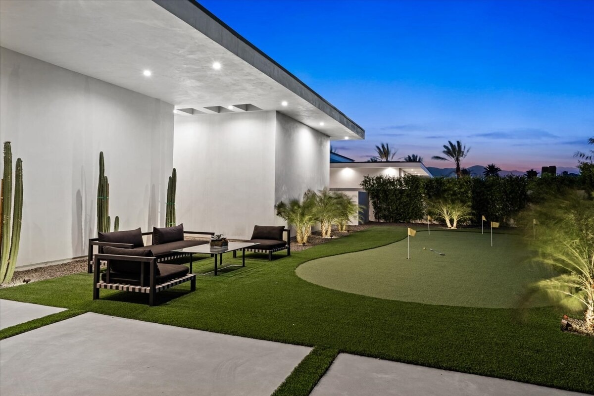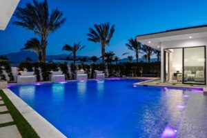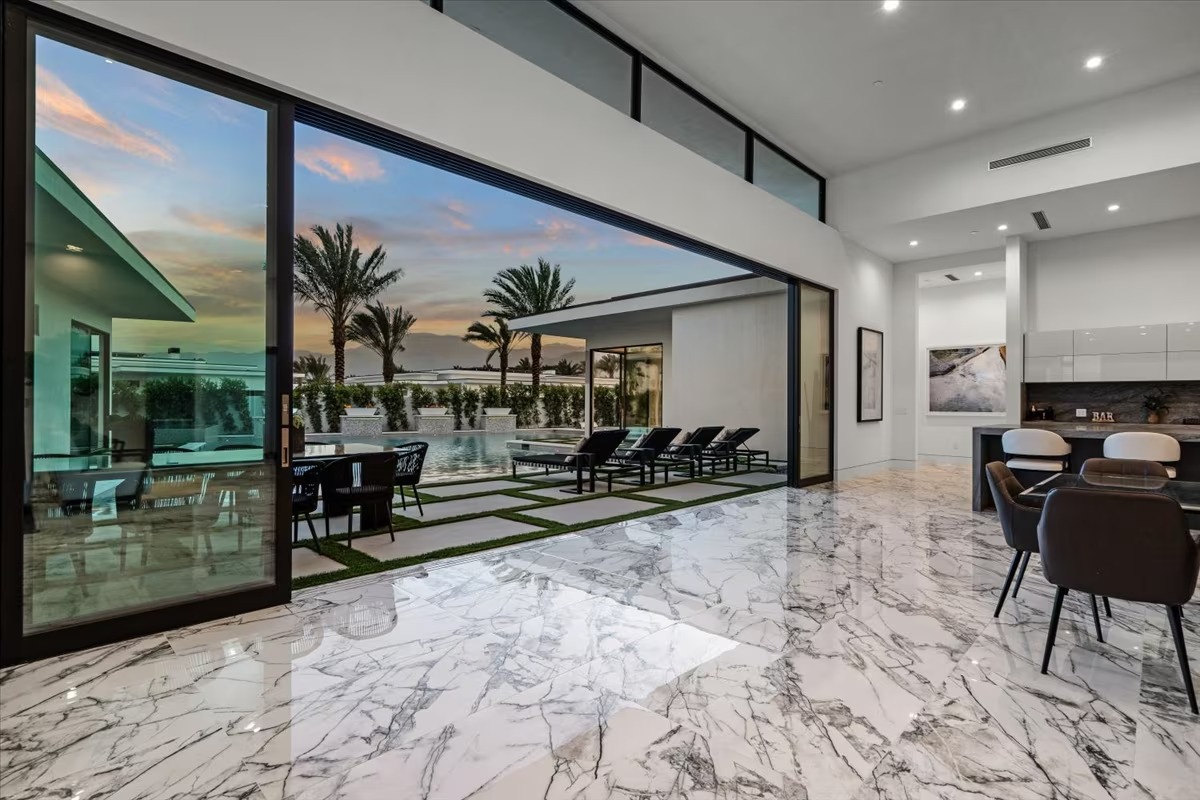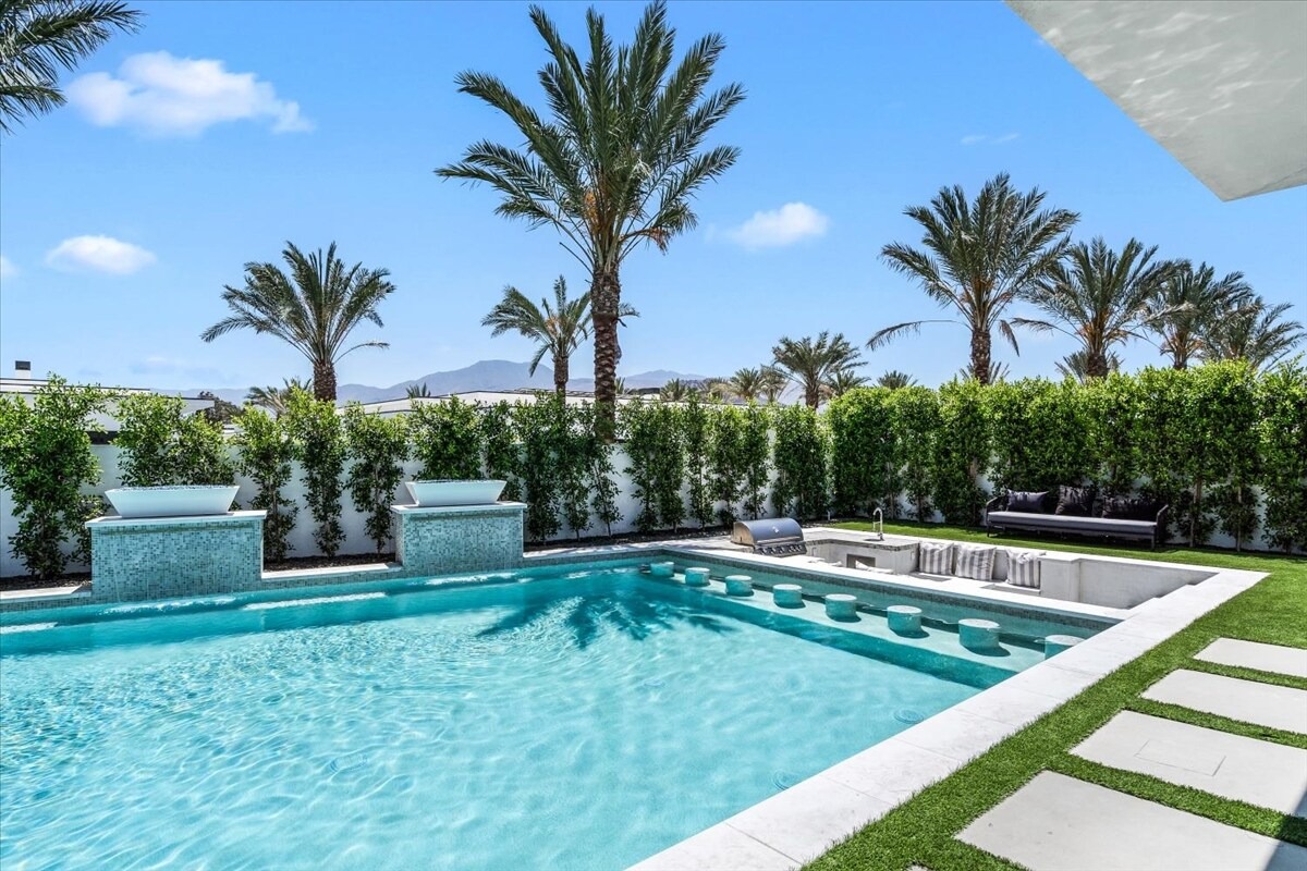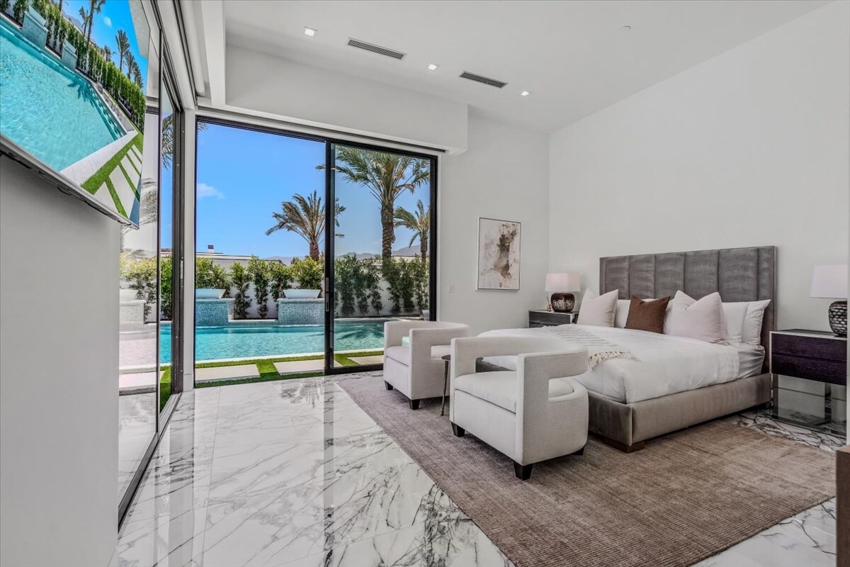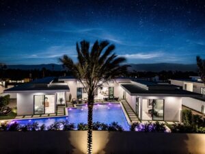 “Outdoor Music Allowed”. Welcome to this ultra-exclusive vacation rental , where this one-of-a-kind residence will exceed all of your expectations while embracing you, your family and your friends with the finest modern architecture and appointments available. Completely unprecedented in the world of short-term-rental properties, the gated community showcases a limited edition of 16 extraordinary residences of uncompromising luxury in a unique village-style enclave all located right across the street from the elegant Madison Club, and just minutes from restaurants and shopping. A massive pool with plenty of features such as very large tanning selves perfect for kids or to lie down in the sun, fire bowls, and LED waterfalls. Chic contemporary style with walls of glass and slideaway Fleetwood doors, oversized great room with 16′ ceilings, 12′ ceilings in other living areas and bedrooms, gorgeous floor tiles imported from Spain, and stunning open kitchens with European cabinetry and top-of-the-line Miele appliances. Every bedroom is a suite, complete with a private bath and large closet. Primary suites elevate personal luxury to new heights, with outdoor access, walk-in multi-head showers, freestanding tubs, and oversized walk-in closets with Italian-made custom built-ins. Enjoy the beauty of modern lighting, contemporary artwork, chic furnishings, Grohe plumbing fixtures and pivoting glass entry doors. Landscaping is impeccable and upscale, and select residences feature putting greens, fire bowls and fountains. Enviable location right next to the private communities of The Madison Club, The Citrus Club and Hideaway Golf Club makes it easy for guests to walk or bike to concerts, shops and restaurants. The Indian Wells Tennis Garden, high-end shopping on El Paseo, abundant recreation, and Palm Springs International Airport are all within easy reach. The ultimate luxury vacation awaits! Book your unforgettable stay today!