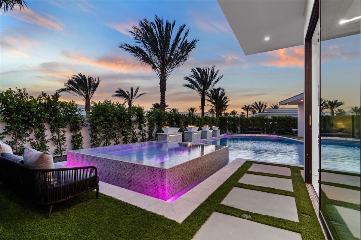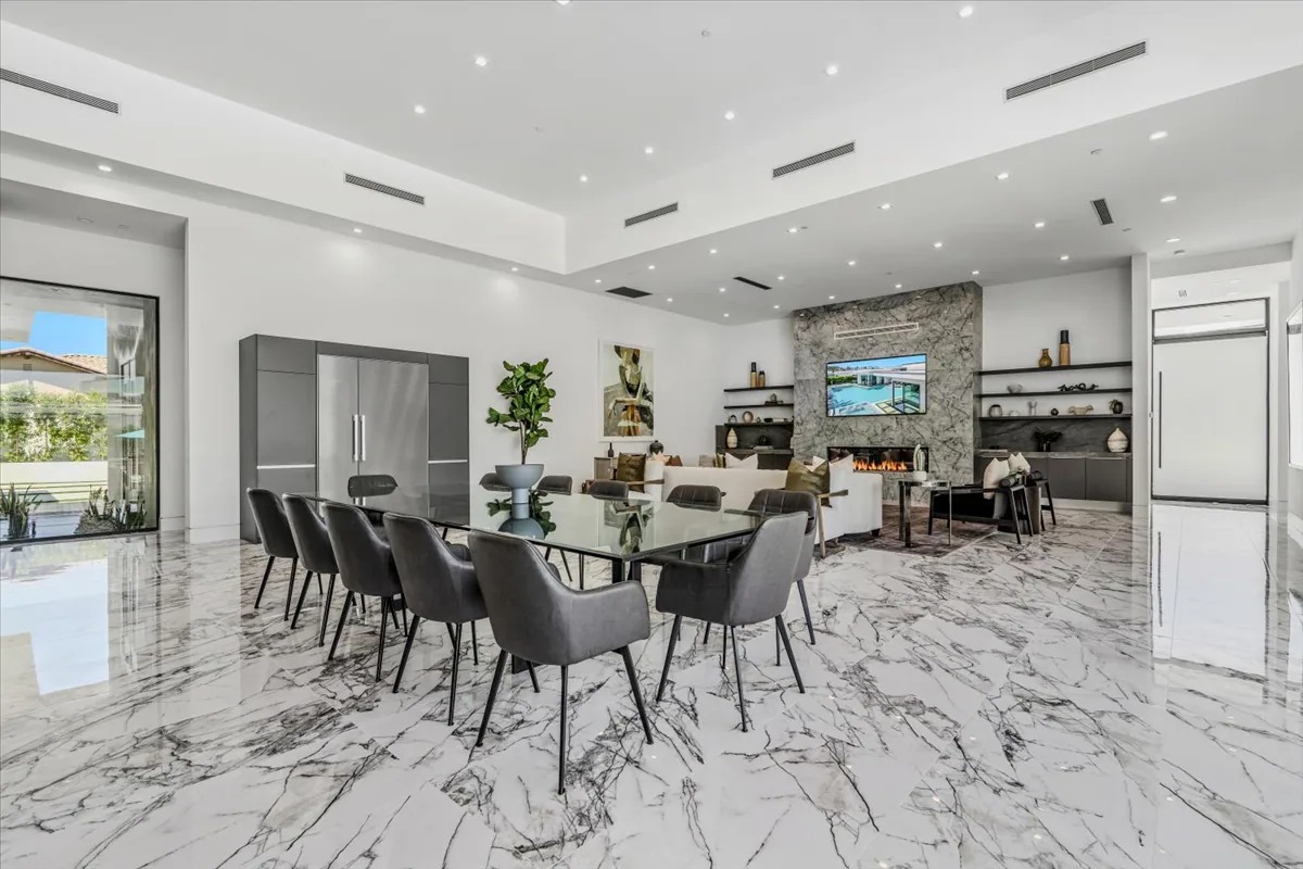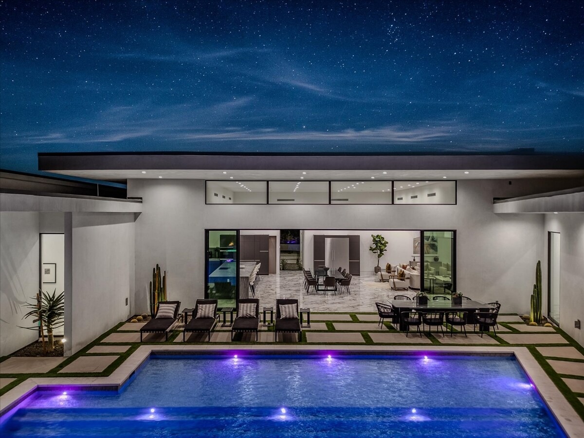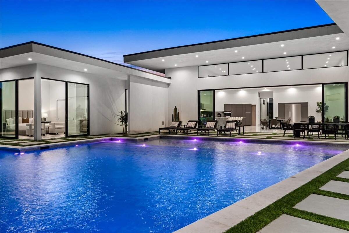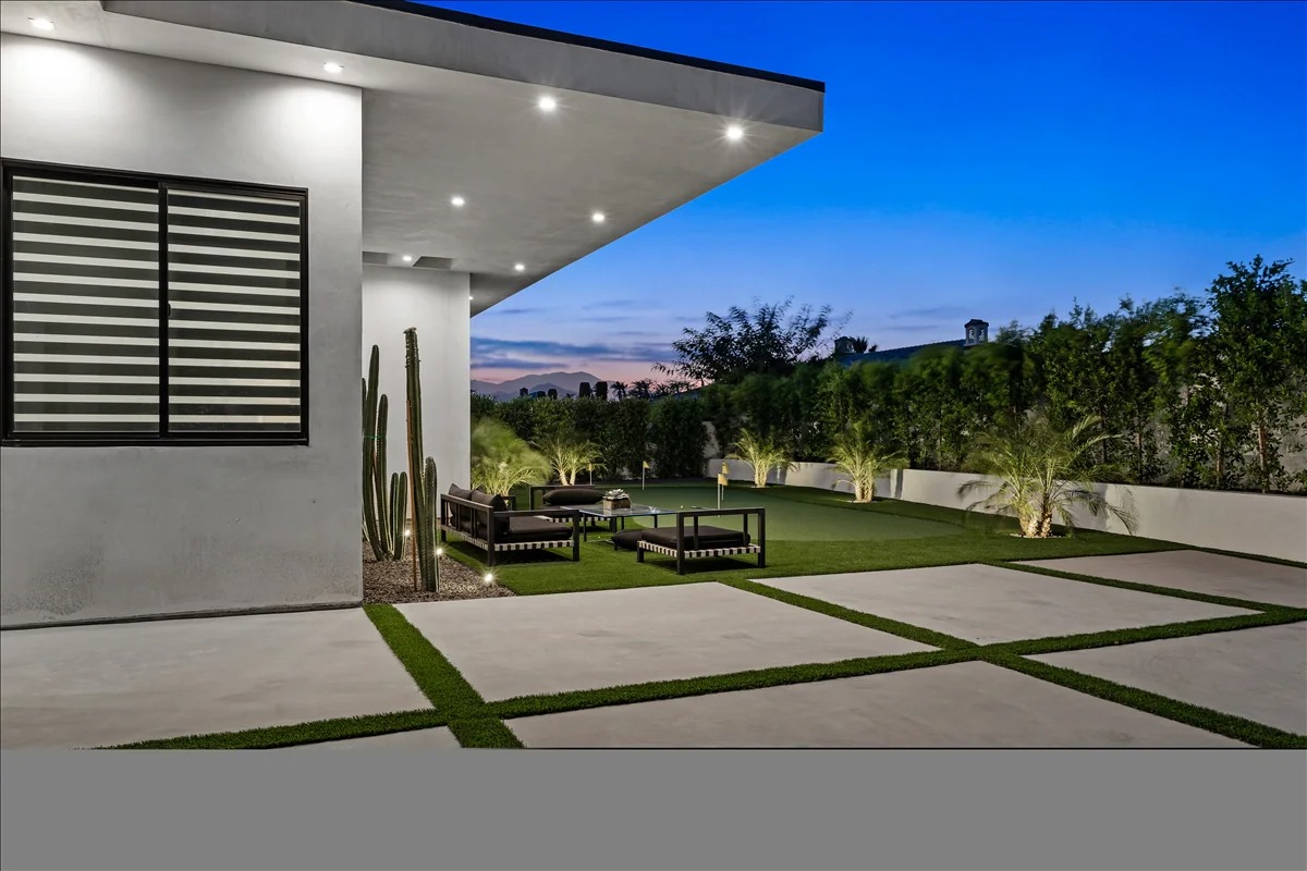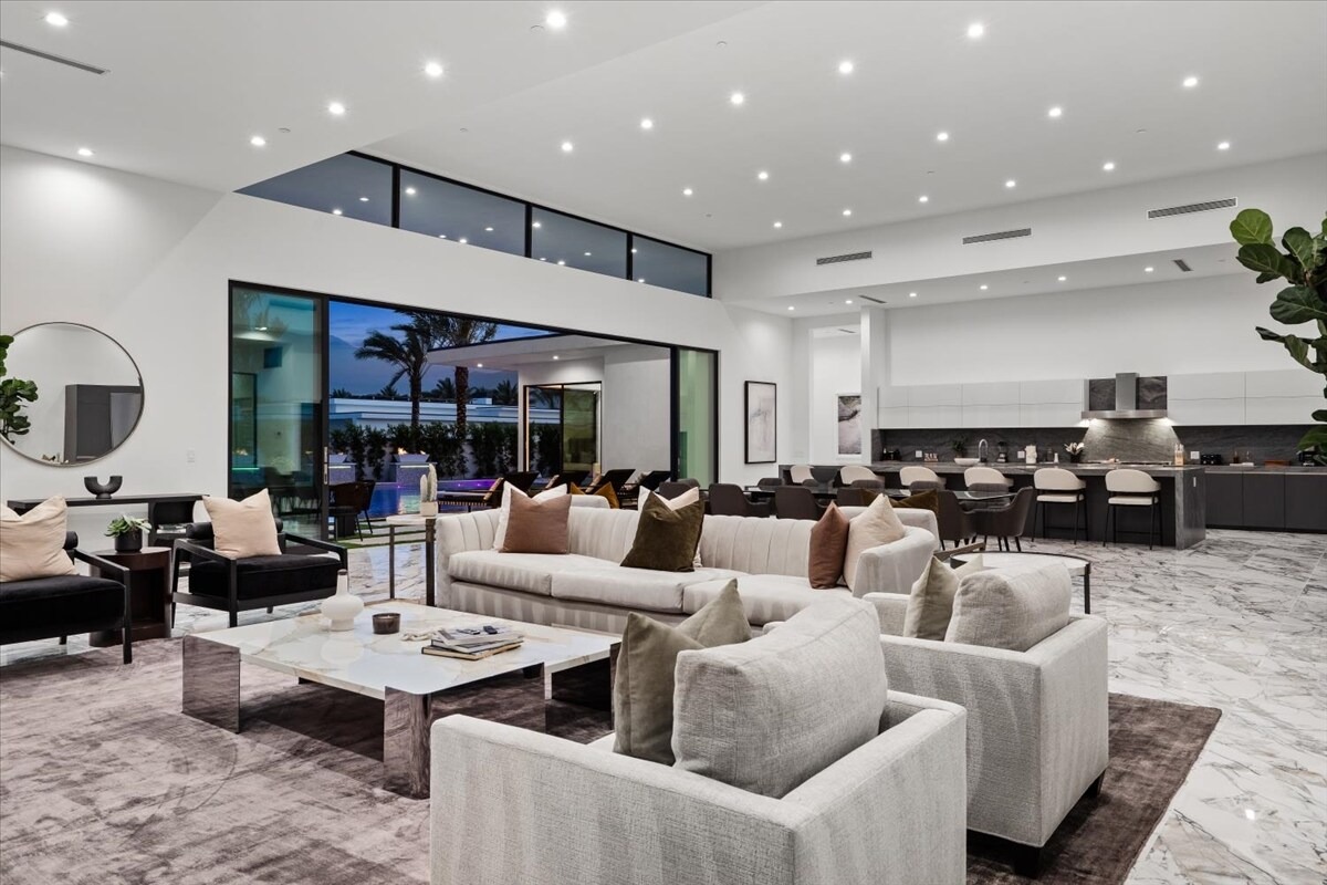 “Outdoor Music Allowed”. Welcome to this ultra-exclusive vacation rental , where this one-of-a-kind residence will exceed all of your expectations while embracing you, your family and your friends with the finest modern architecture and appointments available. Completely unprecedented in the world of short-term-rental properties, the gated community showcases a limited edition of 16 extraordinary residences of uncompromising luxury in a unique village-style enclave all located right across the street from the elegant Madison Club, and just minutes from restaurants and shopping. A massive pool with plenty of features such as very large tanning selves perfect for kids or to lie down in the sun, fire bowls, and LED waterfalls. Chic contemporary style with walls of glass and slideaway Fleetwood doors, oversized great room with 16′ ceilings, 12′ ceilings in other living areas and bedrooms, gorgeous floor tiles imported from Spain, and stunning open kitchens with European cabinetry and top-of-the-line Miele appliances. Every bedroom is a suite, complete with a private bath and large closet. Primary suites elevate personal luxury to new heights, with outdoor access, walk-in multi-head showers, freestanding tubs, and oversized walk-in closets with Italian-made custom built-ins. Enjoy the beauty of modern lighting, contemporary artwork, chic furnishings, Grohe plumbing fixtures and pivoting glass entry doors. Landscaping is impeccable and upscale, and select residences feature putting greens, fire bowls and fountains. Enviable location right next to the private communities of The Madison Club, The Citrus Club and Hideaway Golf Club makes it easy for guests to walk or bike to concerts, shops and restaurants. The Indian Wells Tennis Garden, high-end shopping on El Paseo, abundant recreation, and Palm Springs International Airport are all within easy reach. The ultimate luxury vacation awaits! Book your unforgettable stay today!