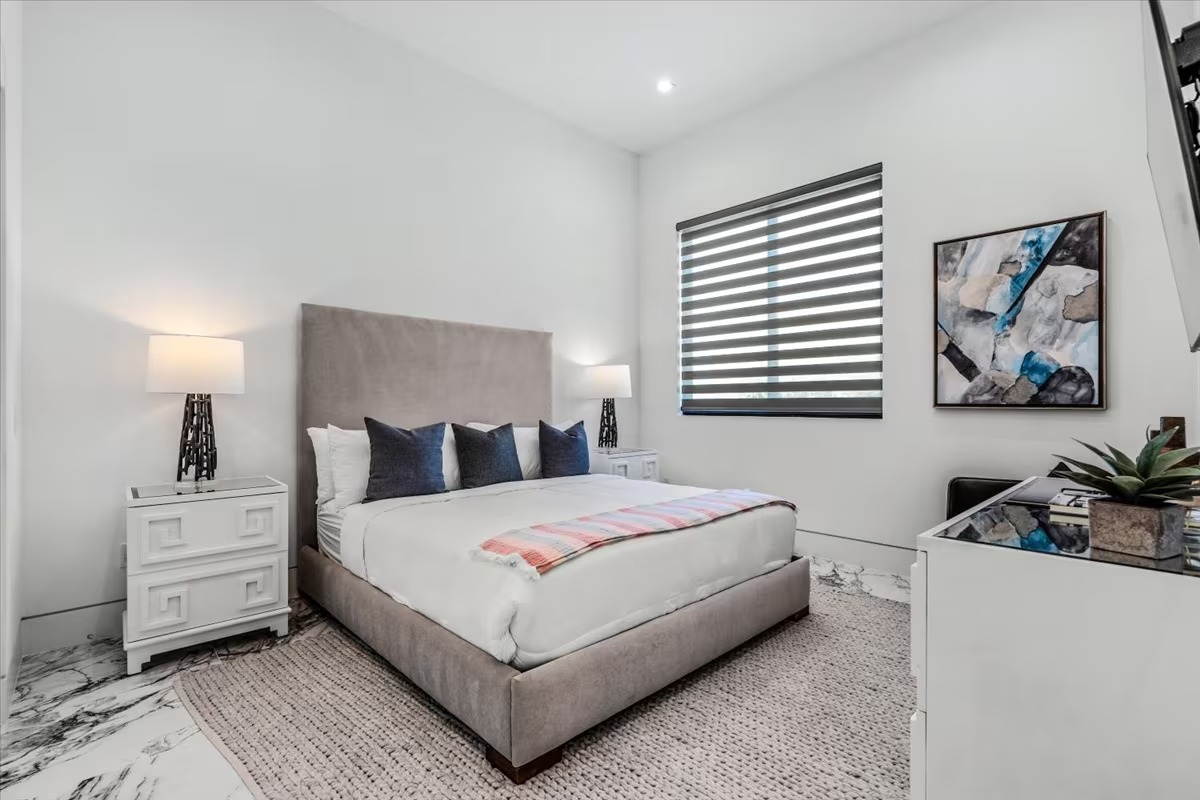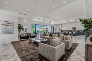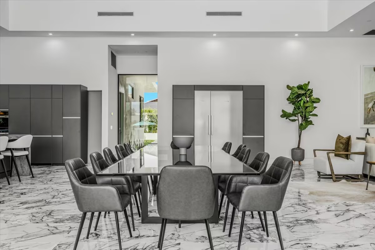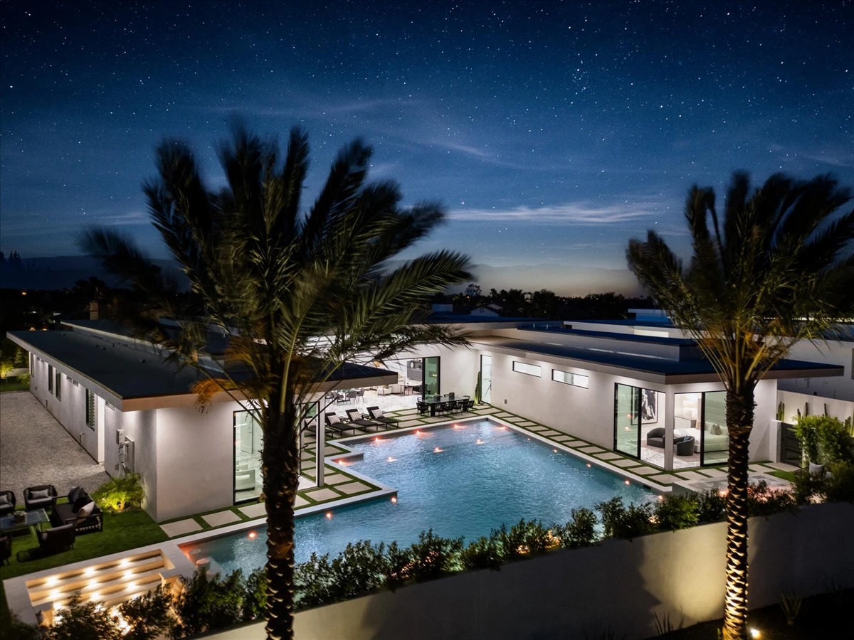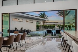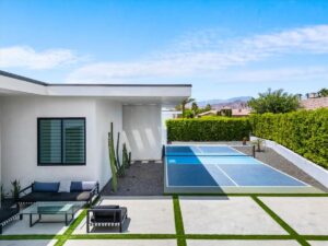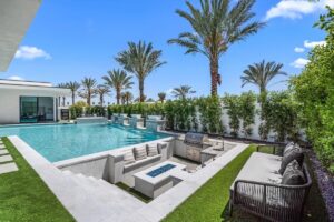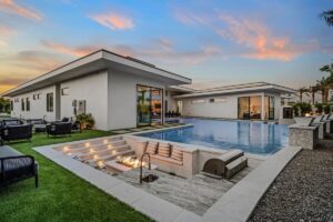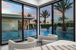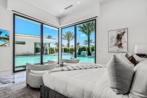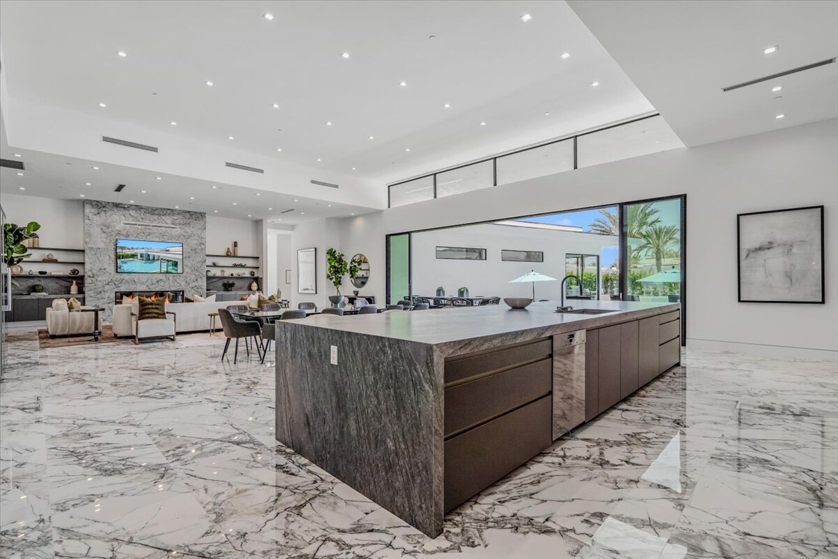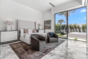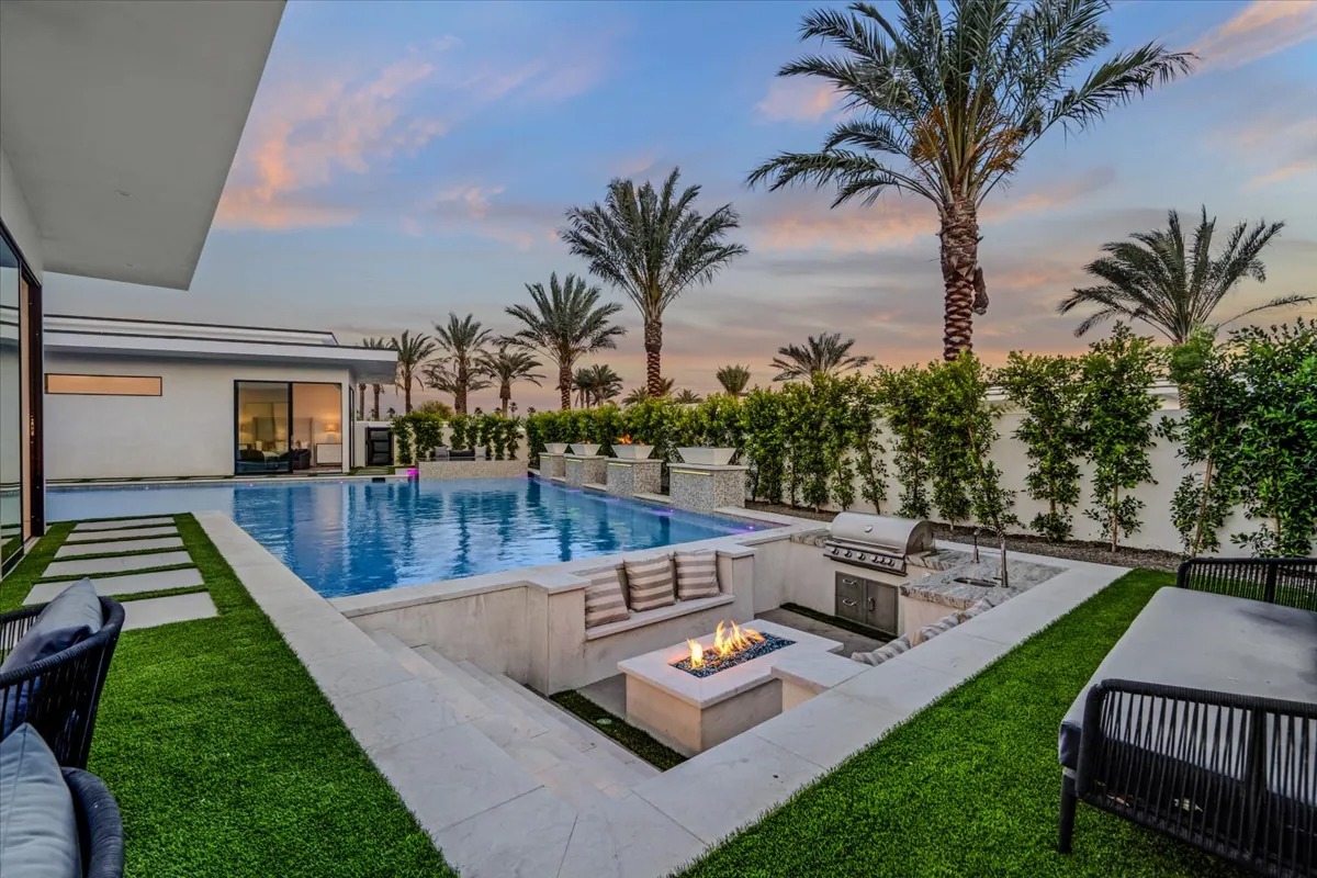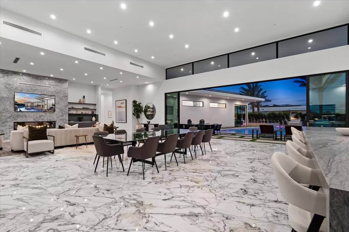 “Outdoor Music Allowed”. Welcome to this ultra-exclusive vacation rental , where this one-of-a-kind residence will exceed all of your expectations while embracing you, your family and your friends with the finest modern architecture and appointments available. Completely unprecedented in the world of short-term-rental properties, the gated community showcases a limited edition of 16 extraordinary residences of uncompromising luxury in a unique village-style enclave all located right across the street from the elegant Madison Club, and just minutes from restaurants and shopping. A massive pool with plenty of features such as very large tanning selves perfect for kids or to lie down in the sun, fire bowls, and LED waterfalls. Chic contemporary style with walls of glass and slideaway Fleetwood doors, oversized great room with 16′ ceilings, 12′ ceilings in other living areas and bedrooms, gorgeous floor tiles imported from Spain, and stunning open kitchens with European cabinetry and top-of-the-line Miele appliances. Every bedroom is a suite, complete with a private bath and large closet. Primary suites elevate personal luxury to new heights, with outdoor access, walk-in multi-head showers, freestanding tubs, and oversized walk-in closets with Italian-made custom built-ins. Enjoy the beauty of modern lighting, contemporary artwork, chic furnishings, Grohe plumbing fixtures and pivoting glass entry doors. Landscaping is impeccable and upscale, and select residences feature putting greens, fire bowls and fountains. Enviable location right next to the private communities of The Madison Club, The Citrus Club and Hideaway Golf Club makes it easy for guests to walk or bike to concerts, shops and restaurants. The Indian Wells Tennis Garden, high-end shopping on El Paseo, abundant recreation, and Palm Springs International Airport are all within easy reach. The ultimate luxury vacation awaits! Book your unforgettable stay today!