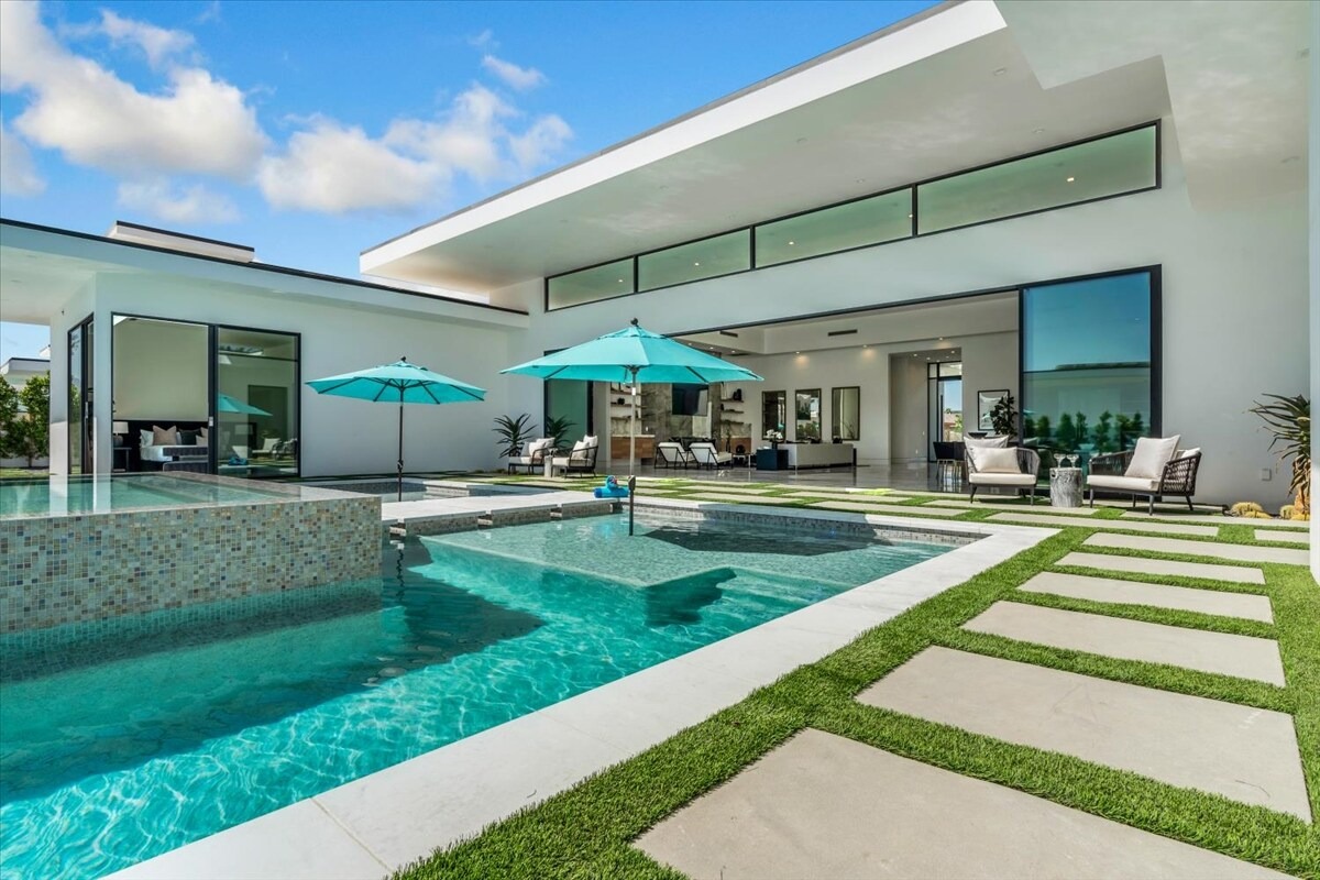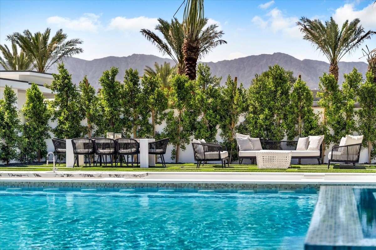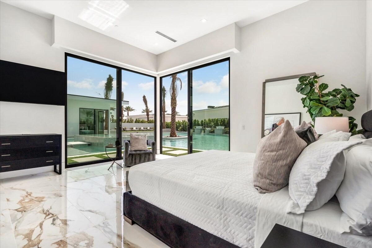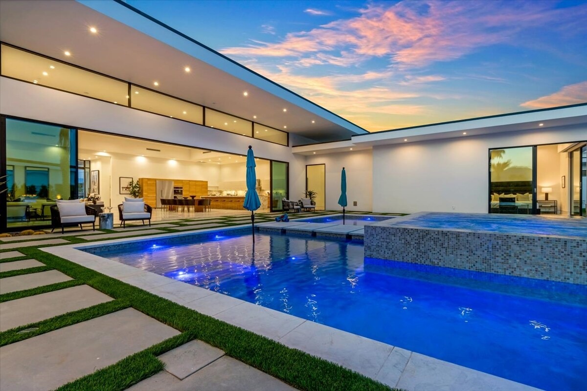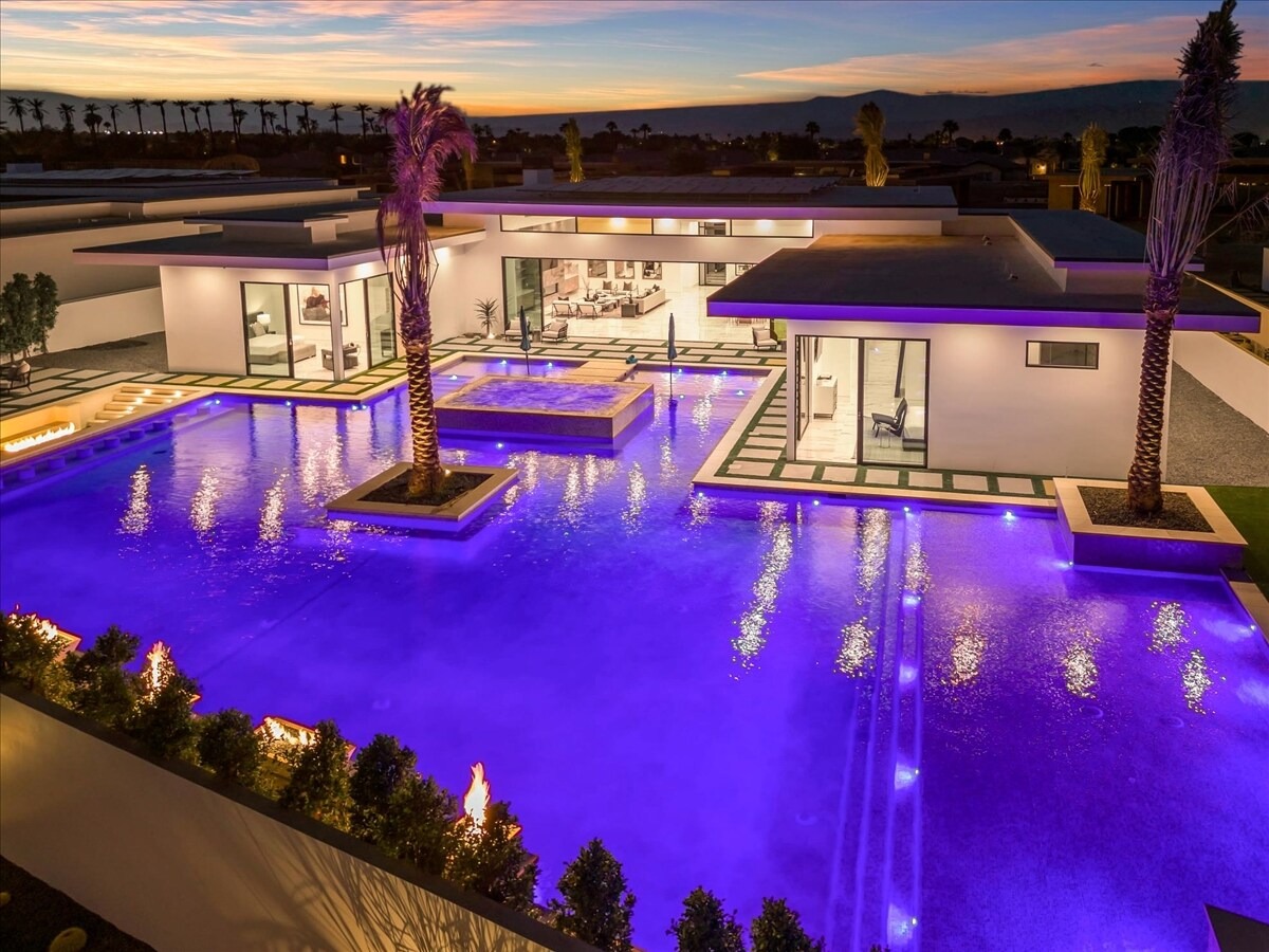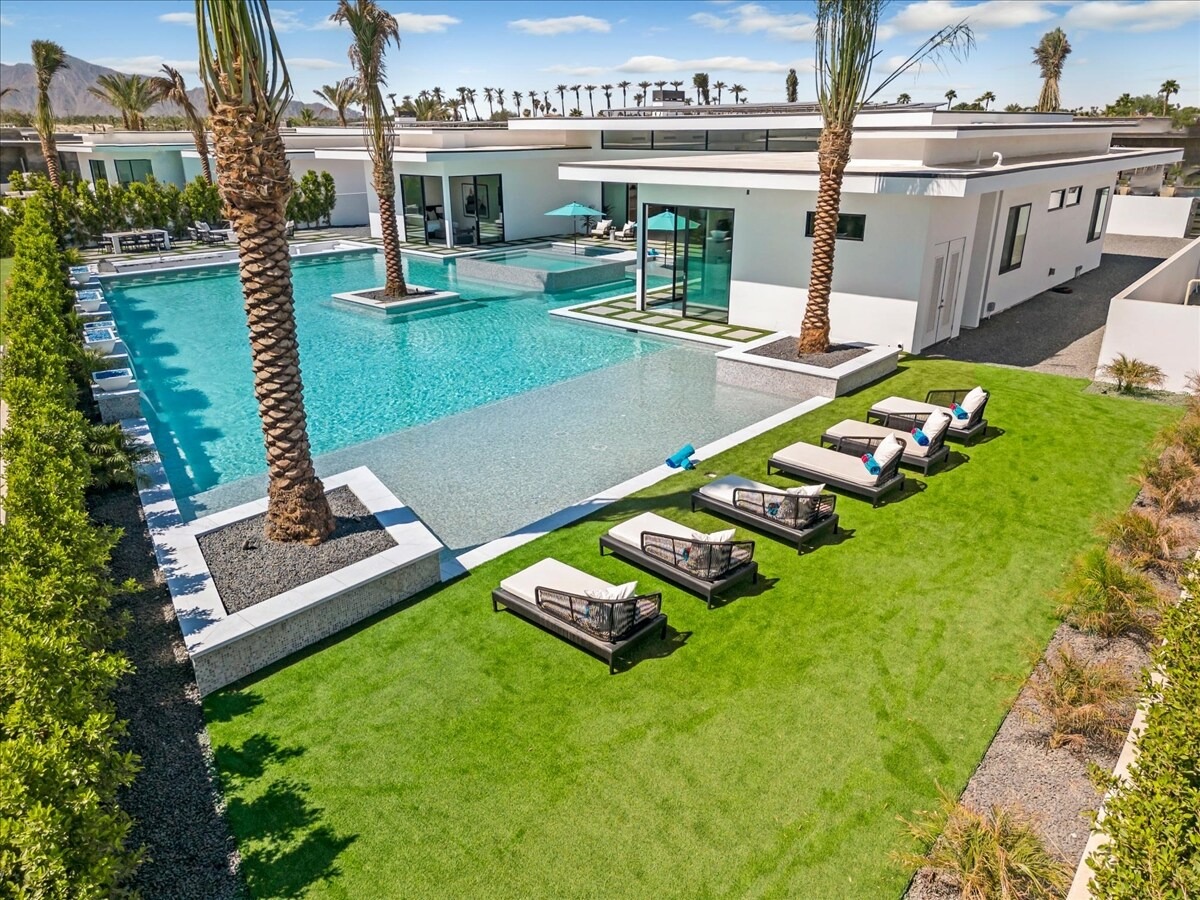 “Outdoor Music Allowed”. Welcome to this ultra-exclusive vacation rental , where this one-of-a-kind residence will exceed all of your expectations while embracing you, your family and your friends with the finest modern architecture and appointments available. Completely unprecedented in the world of short-term-rental properties, the gated community showcases a limited edition of 16 extraordinary residences of uncompromising luxury in a unique village-style enclave all located right across the street from the elegant Madison Club, and just minutes from restaurants and shopping. A massive pool with plenty of features such as very large tanning selves perfect for kids or to lie down in the sun, fire bowls, and LED waterfalls. Chic contemporary style with walls of glass and slideaway Fleetwood doors, oversized great room with 16′ ceilings, 12′ ceilings in other living areas and bedrooms, gorgeous floor tiles imported from Spain, and stunning open kitchens with European cabinetry and top-of-the-line Miele appliances. Every bedroom is a suite, complete with a private bath and large closet. Primary suites elevate personal luxury to new heights, with outdoor access, walk-in multi-head showers, freestanding tubs, and oversized walk-in closets with Italian-made custom built-ins. Enjoy the beauty of modern lighting, contemporary artwork, chic furnishings, Grohe plumbing fixtures and pivoting glass entry doors. Landscaping is impeccable and upscale, and select residences feature putting greens, fire bowls and fountains. Enviable location right next to the private communities of The Madison Club, The Citrus Club and Hideaway Golf Club makes it easy for guests to walk or bike to concerts, shops and restaurants. The Indian Wells Tennis Garden, high-end shopping on El Paseo, abundant recreation, and Palm Springs International Airport are all within easy reach. The ultimate luxury vacation awaits! Book your unforgettable stay today!