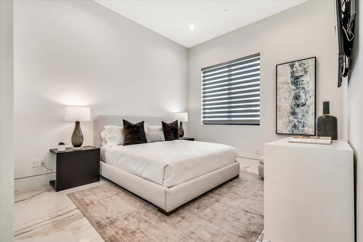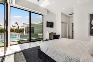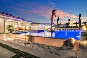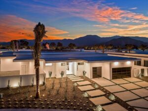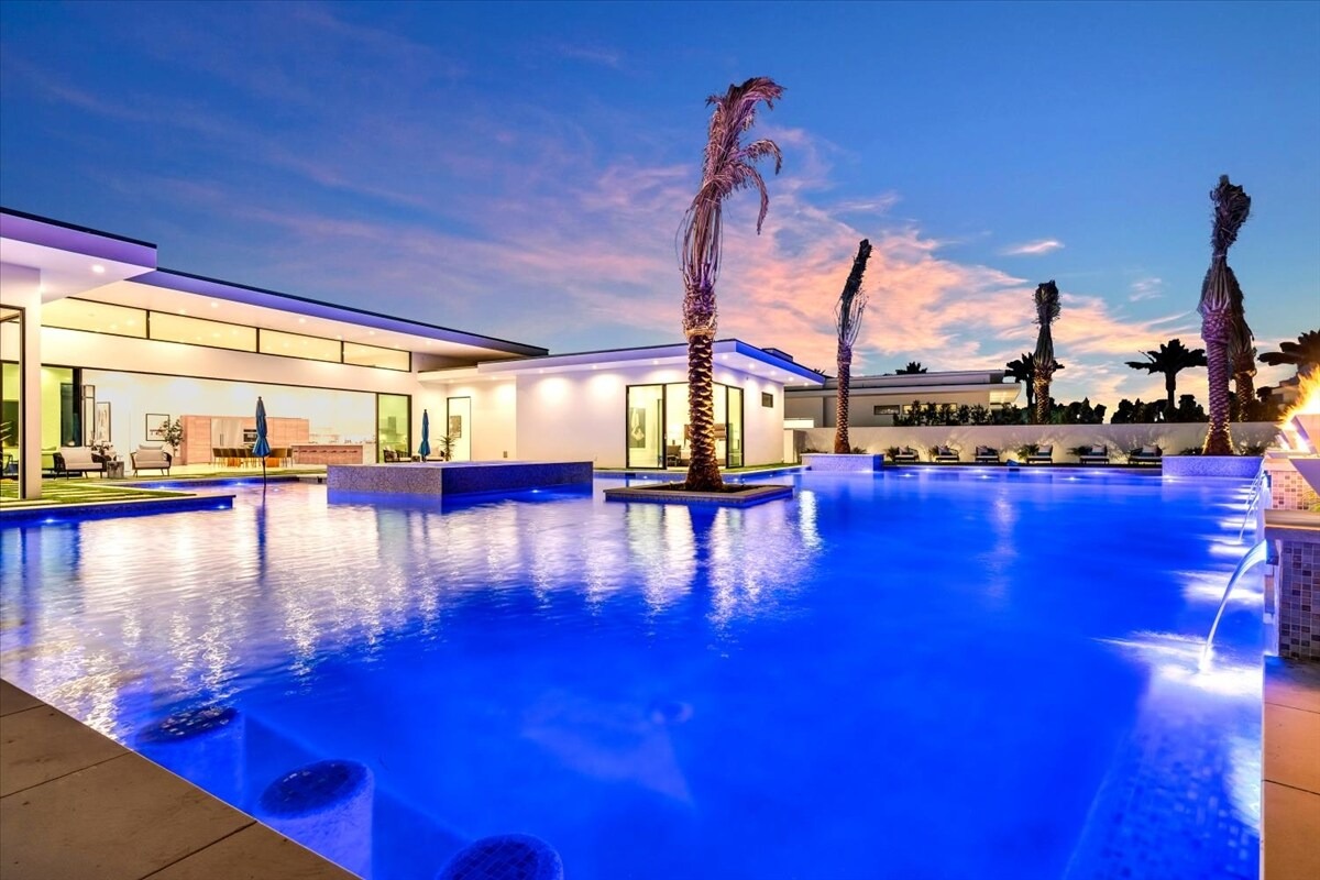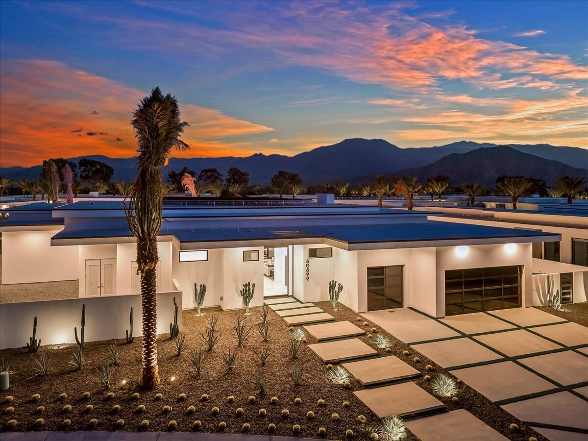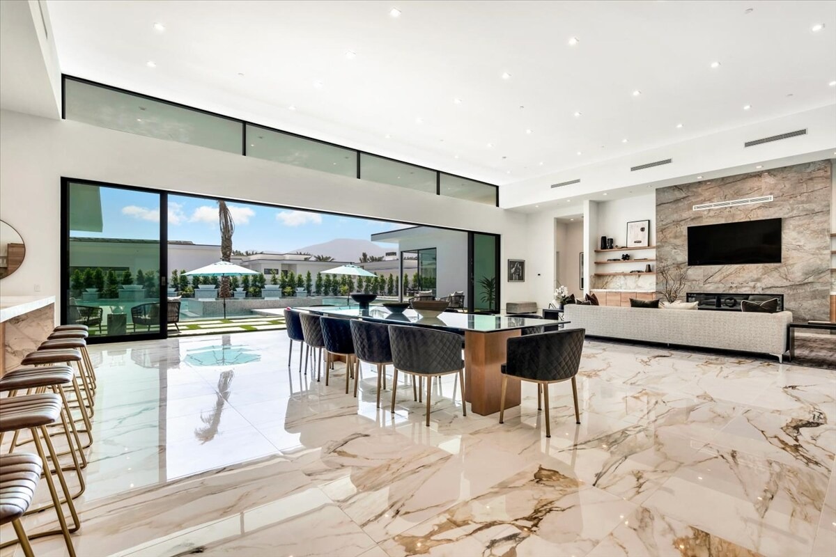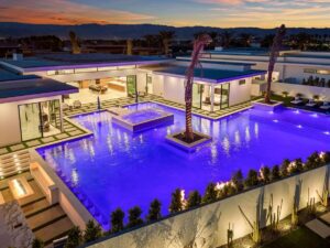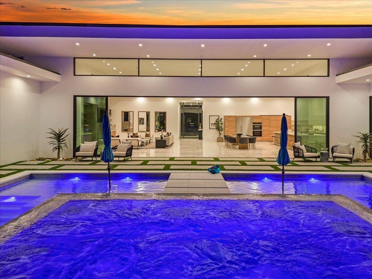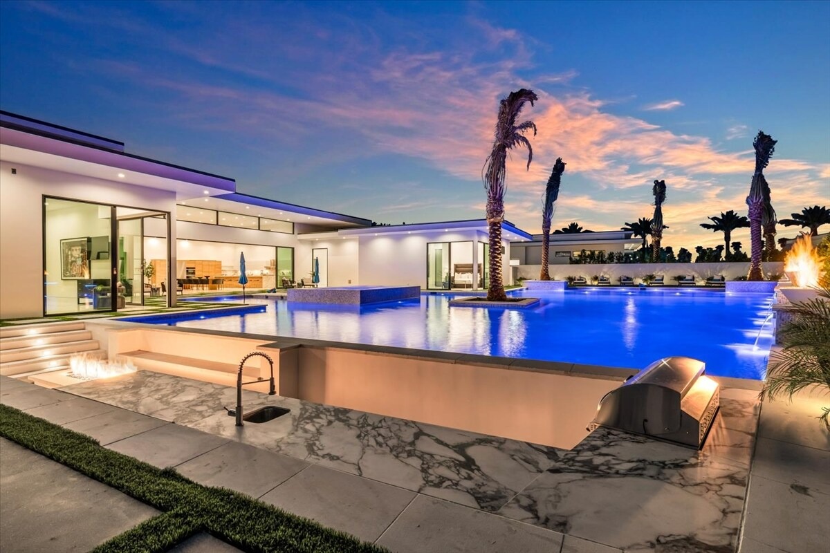 “Outdoor Music Allowed”. Welcome to this ultra-exclusive vacation rental , where this one-of-a-kind residence will exceed all of your expectations while embracing you, your family and your friends with the finest modern architecture and appointments available. Completely unprecedented in the world of short-term-rental properties, the gated community showcases a limited edition of 16 extraordinary residences of uncompromising luxury in a unique village-style enclave all located right across the street from the elegant Madison Club, and just minutes from restaurants and shopping. A massive pool with plenty of features such as very large tanning selves perfect for kids or to lie down in the sun, fire bowls, and LED waterfalls. Chic contemporary style with walls of glass and slideaway Fleetwood doors, oversized great room with 16′ ceilings, 12′ ceilings in other living areas and bedrooms, gorgeous floor tiles imported from Spain, and stunning open kitchens with European cabinetry and top-of-the-line Miele appliances. Every bedroom is a suite, complete with a private bath and large closet. Primary suites elevate personal luxury to new heights, with outdoor access, walk-in multi-head showers, freestanding tubs, and oversized walk-in closets with Italian-made custom built-ins. Enjoy the beauty of modern lighting, contemporary artwork, chic furnishings, Grohe plumbing fixtures and pivoting glass entry doors. Landscaping is impeccable and upscale, and select residences feature putting greens, fire bowls and fountains. Enviable location right next to the private communities of The Madison Club, The Citrus Club and Hideaway Golf Club makes it easy for guests to walk or bike to concerts, shops and restaurants. The Indian Wells Tennis Garden, high-end shopping on El Paseo, abundant recreation, and Palm Springs International Airport are all within easy reach. The ultimate luxury vacation awaits! Book your unforgettable stay today!