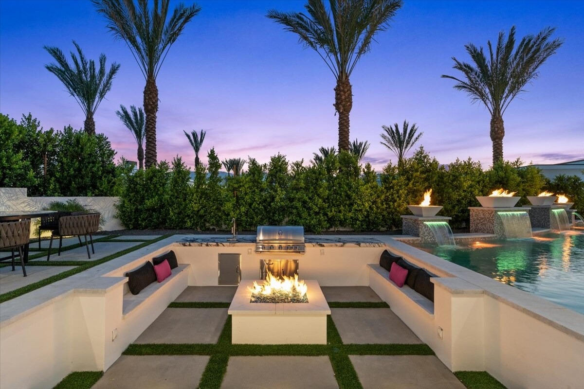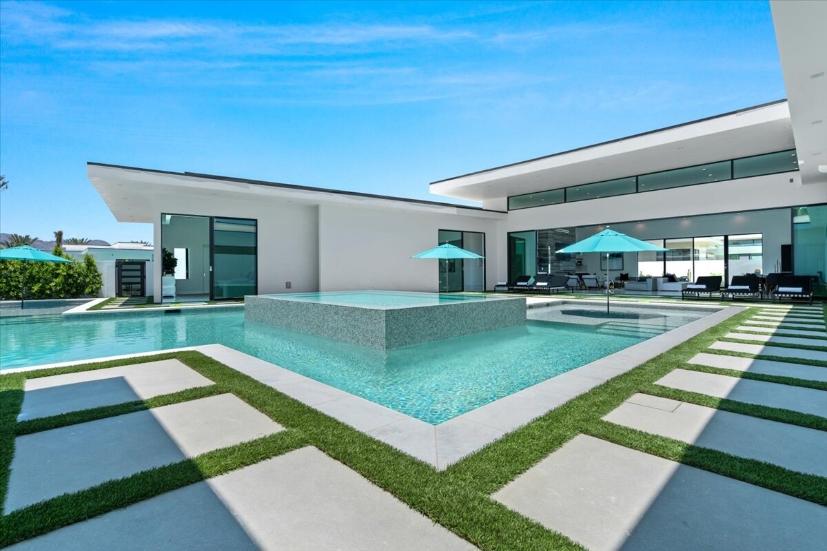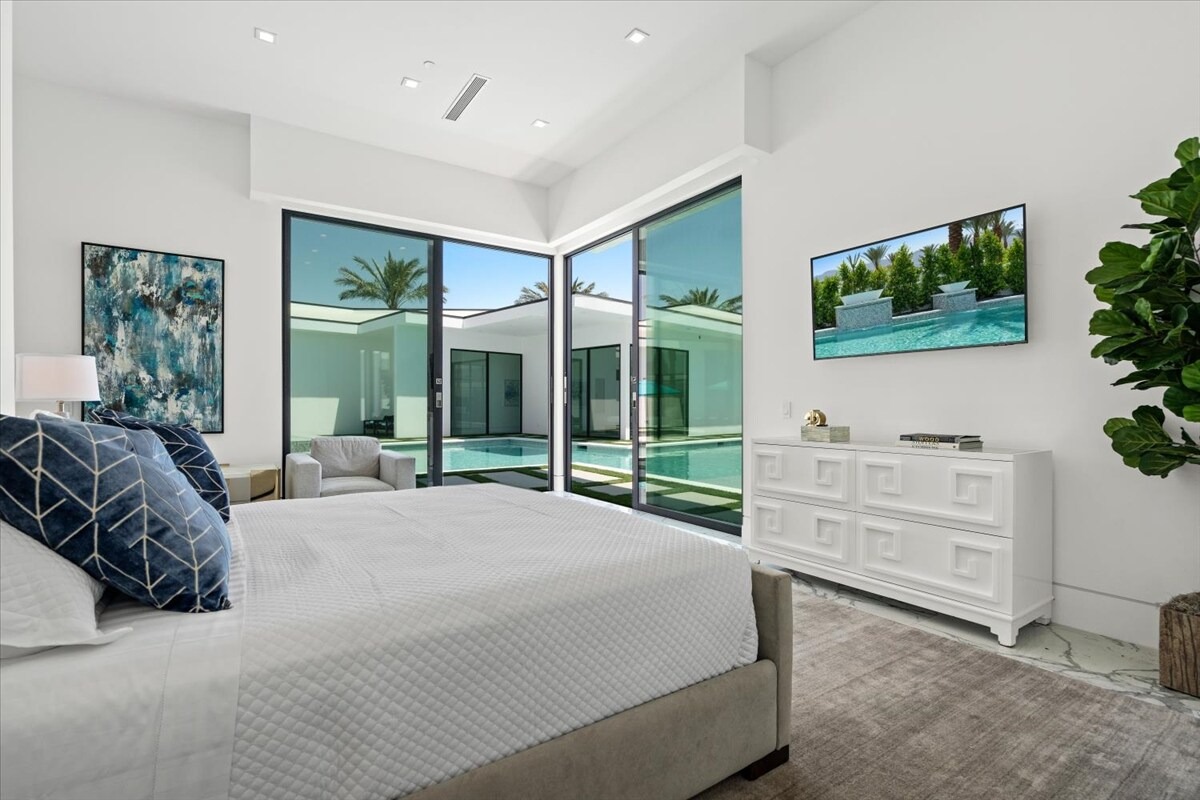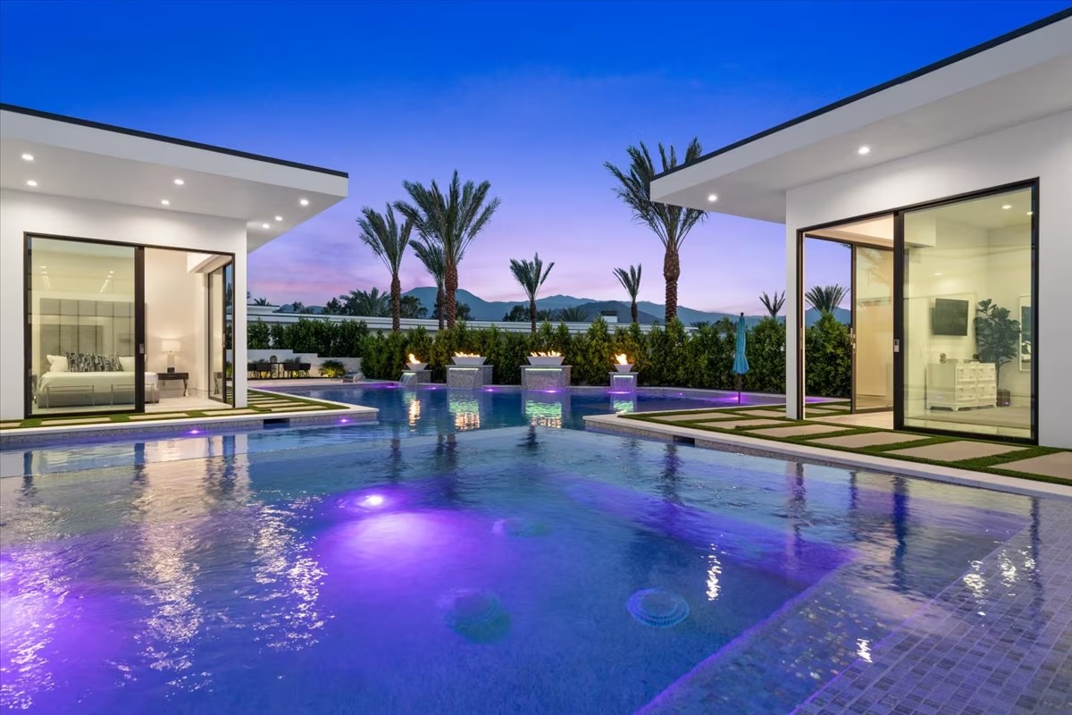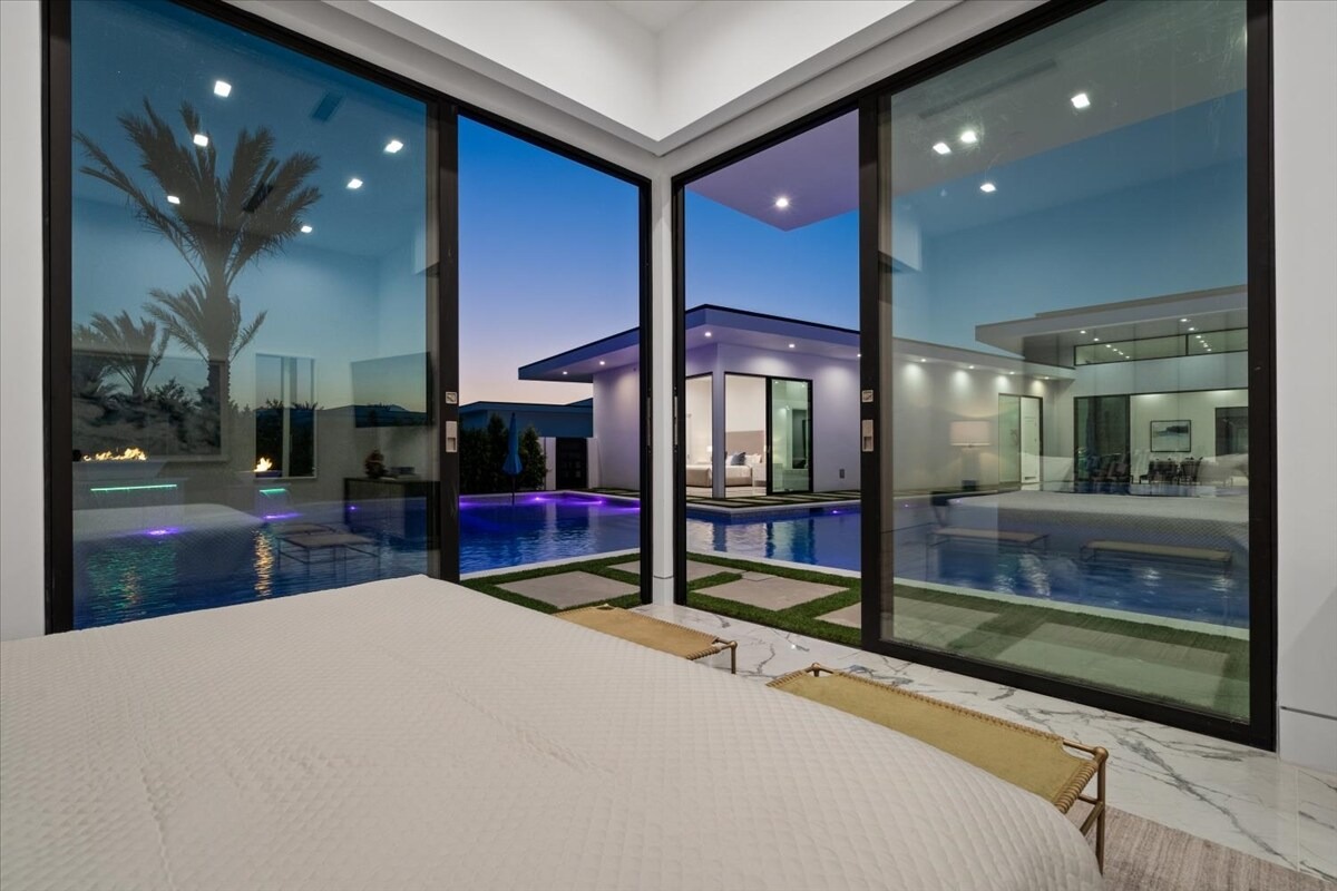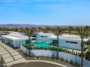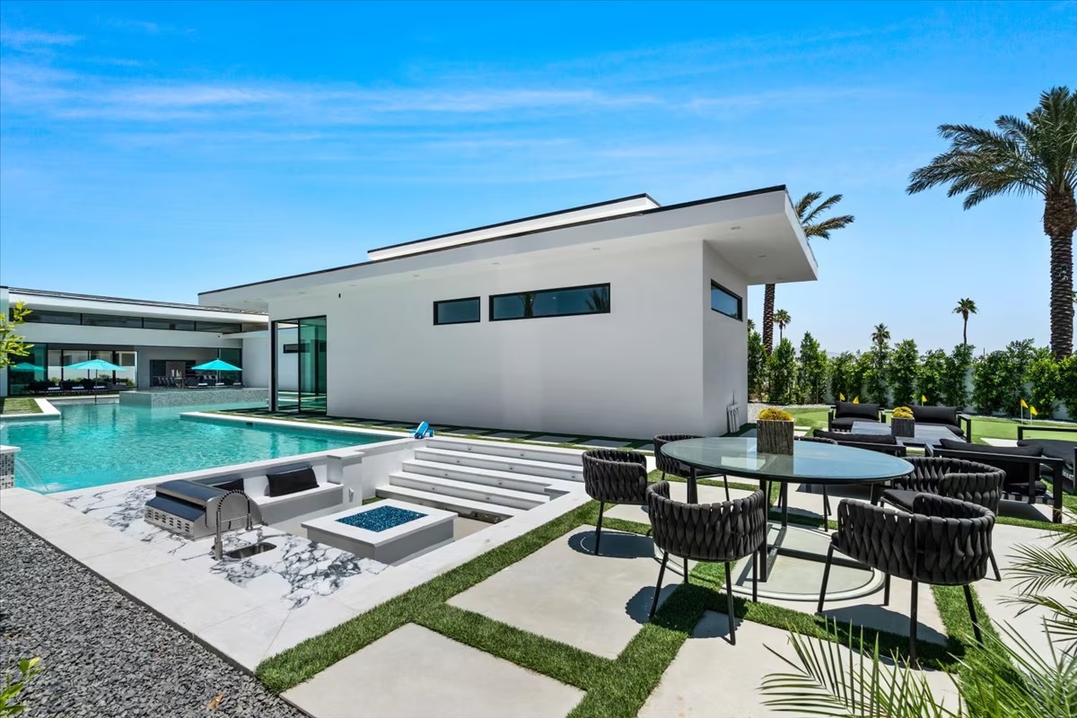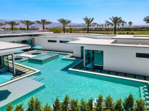 “Outdoor Music Allowed”. Welcome to this ultra-exclusive vacation rental , where this one-of-a-kind residence will exceed all of your expectations while embracing you, your family and your friends with the finest modern architecture and appointments available. Completely unprecedented in the world of short-term-rental properties, the gated community showcases a limited edition of 16 extraordinary residences of uncompromising luxury in a unique village-style enclave all located right across the street from the elegant Madison Club, and just minutes from restaurants and shopping. A massive pool with plenty of features such as very large tanning selves perfect for kids or to lie down in the sun, fire bowls, and LED waterfalls. Chic contemporary style with walls of glass and slideaway Fleetwood doors, oversized great room with 16′ ceilings, 12′ ceilings in other living areas and bedrooms, gorgeous floor tiles imported from Spain, and stunning open kitchens with European cabinetry and top-of-the-line Miele appliances. Every bedroom is a suite, complete with a private bath and large closet. Primary suites elevate personal luxury to new heights, with outdoor access, walk-in multi-head showers, freestanding tubs, and oversized walk-in closets with Italian-made custom built-ins. Enjoy the beauty of modern lighting, contemporary artwork, chic furnishings, Grohe plumbing fixtures and pivoting glass entry doors. Landscaping is impeccable and upscale, and select residences feature putting greens, fire bowls and fountains. Enviable location right next to the private communities of The Madison Club, The Citrus Club and Hideaway Golf Club makes it easy for guests to walk or bike to concerts, shops and restaurants. The Indian Wells Tennis Garden, high-end shopping on El Paseo, abundant recreation, and Palm Springs International Airport are all within easy reach. The ultimate luxury vacation awaits! Book your unforgettable stay today!