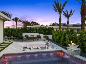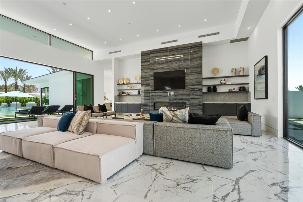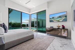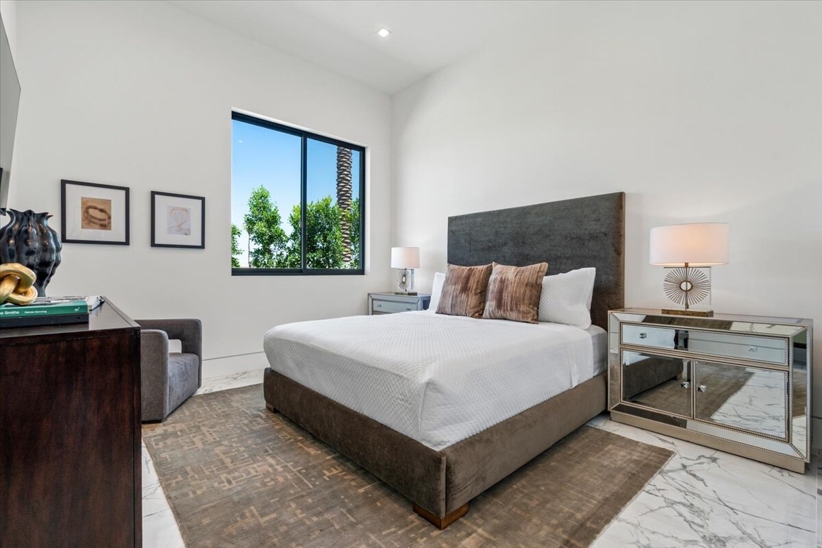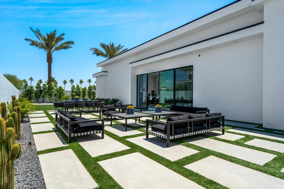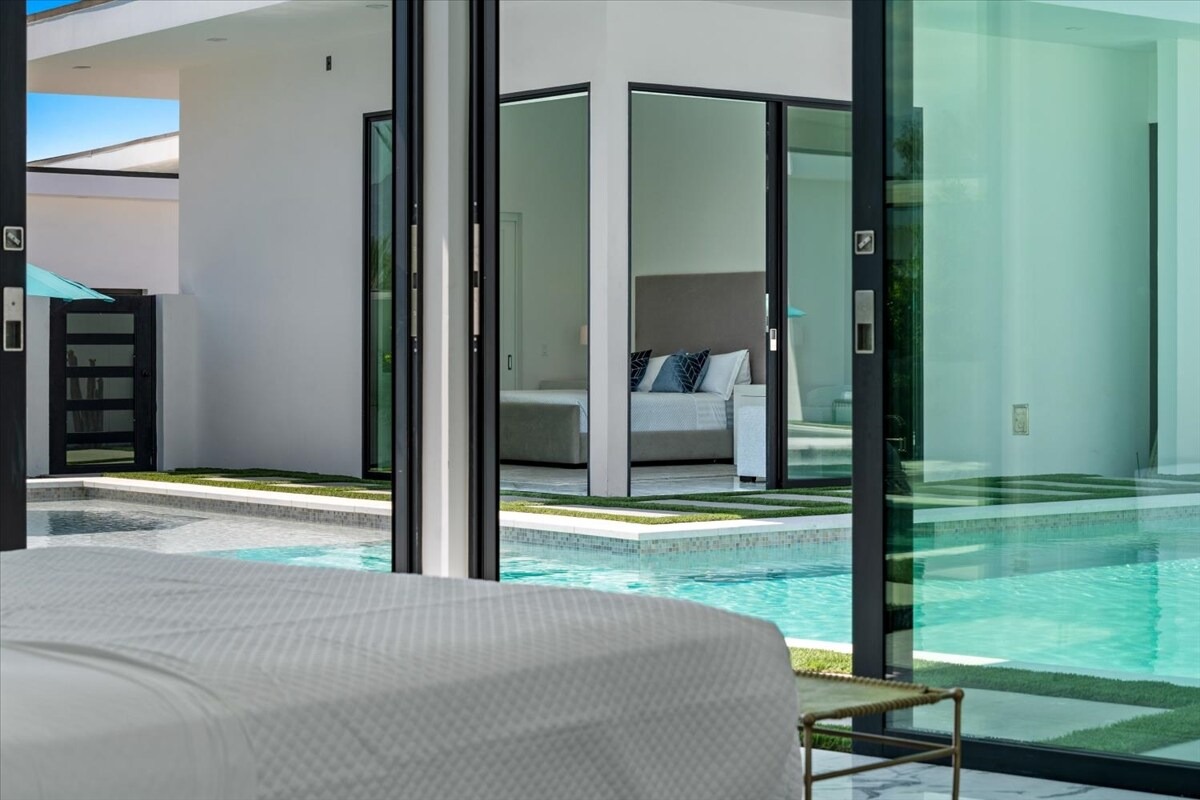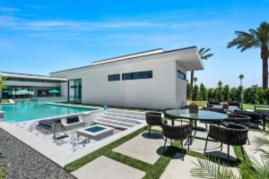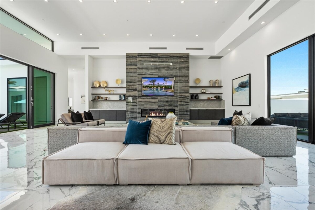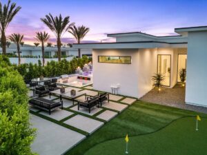 “Outdoor Music Allowed”. Welcome to this ultra-exclusive vacation rental , where this one-of-a-kind residence will exceed all of your expectations while embracing you, your family and your friends with the finest modern architecture and appointments available. Completely unprecedented in the world of short-term-rental properties, the gated community showcases a limited edition of 16 extraordinary residences of uncompromising luxury in a unique village-style enclave all located right across the street from the elegant Madison Club, and just minutes from restaurants and shopping. A massive pool with plenty of features such as very large tanning selves perfect for kids or to lie down in the sun, fire bowls, and LED waterfalls. Chic contemporary style with walls of glass and slideaway Fleetwood doors, oversized great room with 16′ ceilings, 12′ ceilings in other living areas and bedrooms, gorgeous floor tiles imported from Spain, and stunning open kitchens with European cabinetry and top-of-the-line Miele appliances. Every bedroom is a suite, complete with a private bath and large closet. Primary suites elevate personal luxury to new heights, with outdoor access, walk-in multi-head showers, freestanding tubs, and oversized walk-in closets with Italian-made custom built-ins. Enjoy the beauty of modern lighting, contemporary artwork, chic furnishings, Grohe plumbing fixtures and pivoting glass entry doors. Landscaping is impeccable and upscale, and select residences feature putting greens, fire bowls and fountains. Enviable location right next to the private communities of The Madison Club, The Citrus Club and Hideaway Golf Club makes it easy for guests to walk or bike to concerts, shops and restaurants. The Indian Wells Tennis Garden, high-end shopping on El Paseo, abundant recreation, and Palm Springs International Airport are all within easy reach. The ultimate luxury vacation awaits! Book your unforgettable stay today!