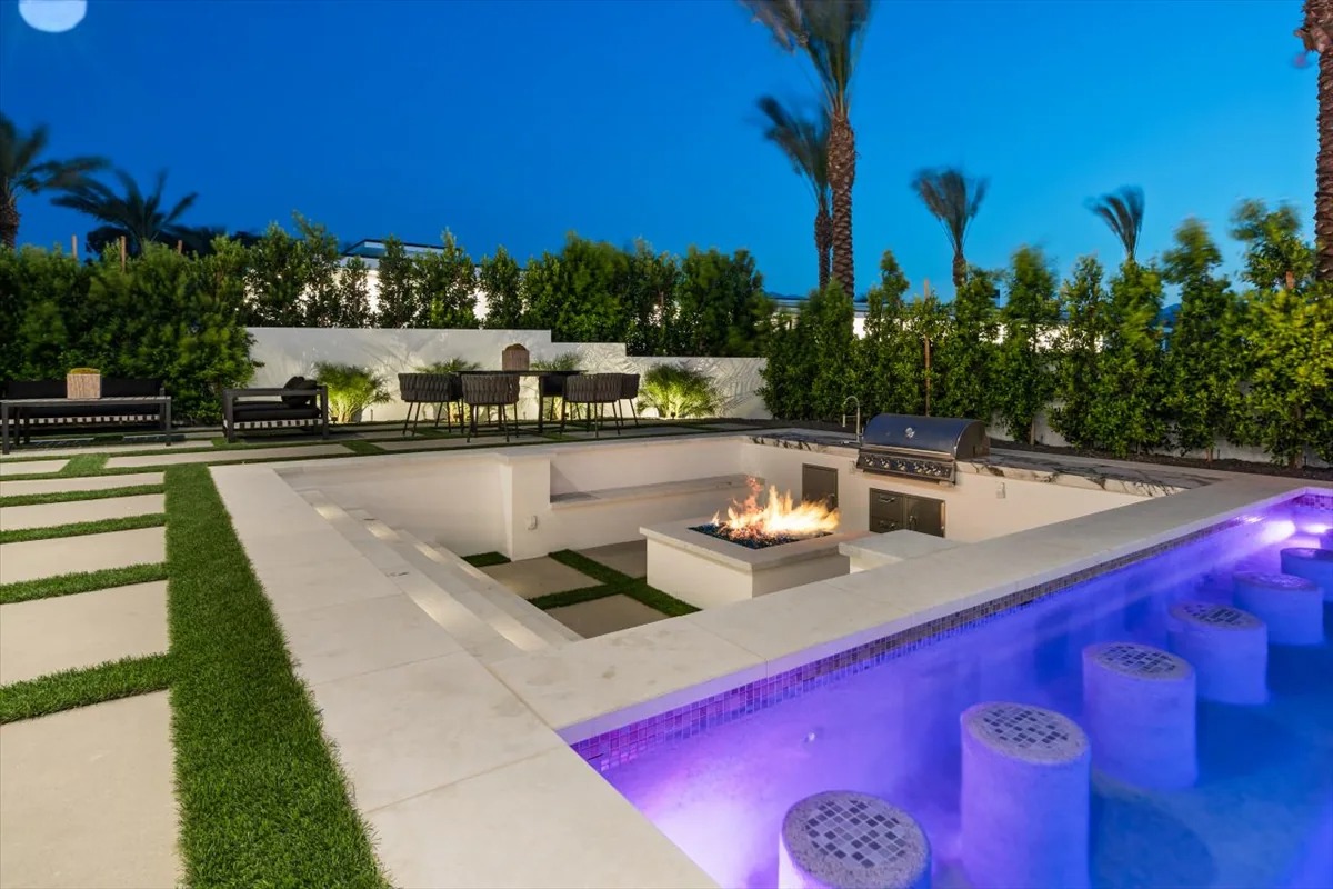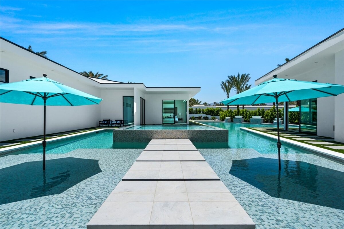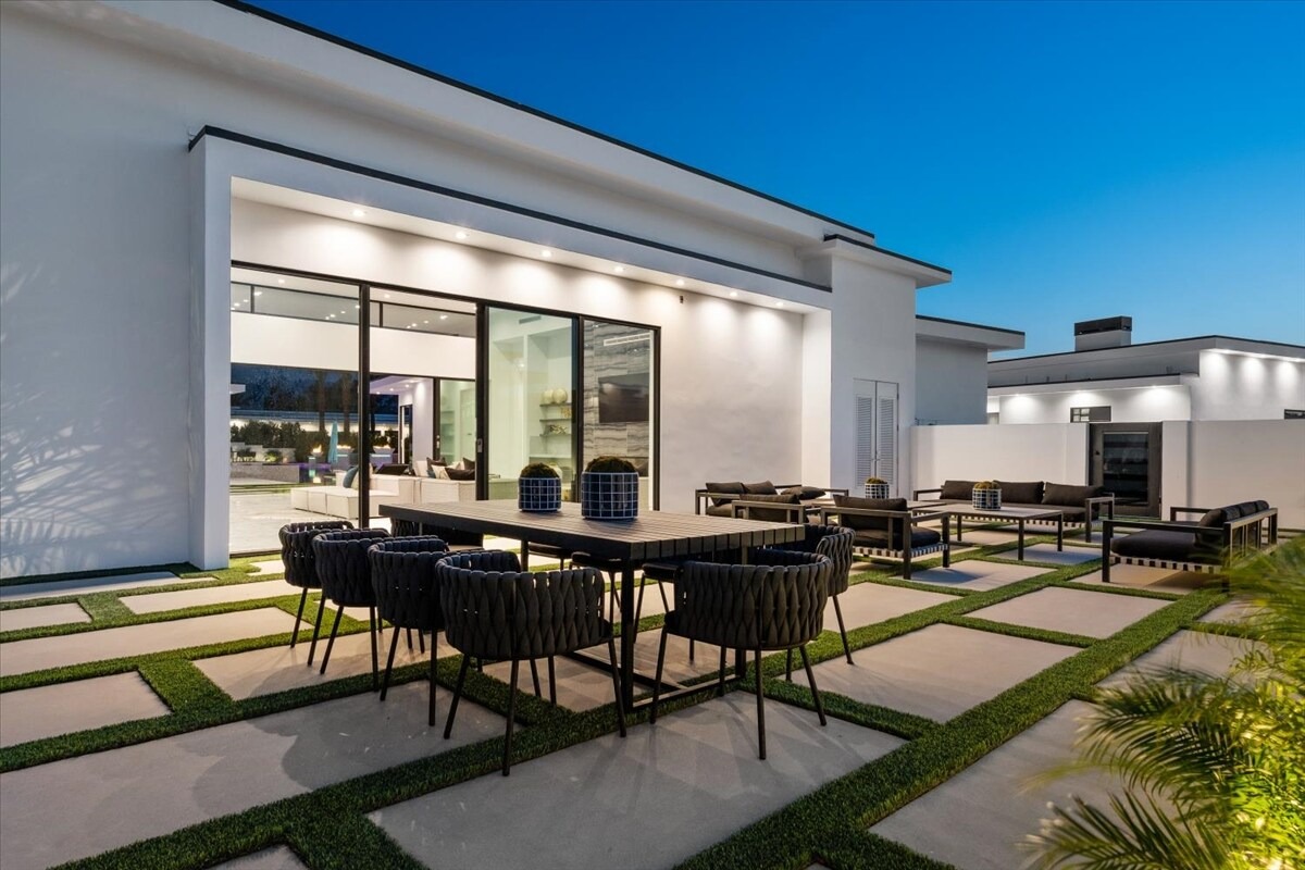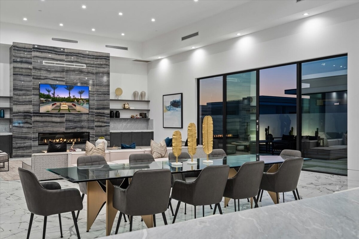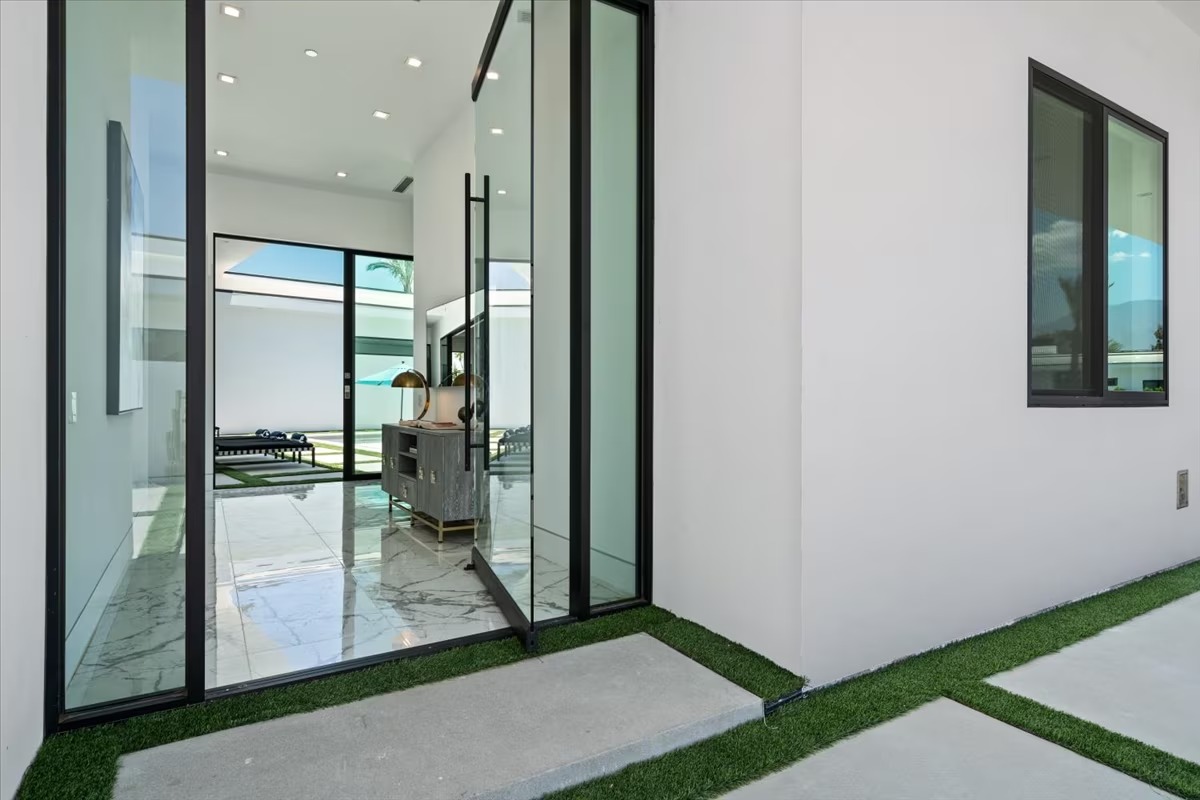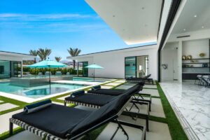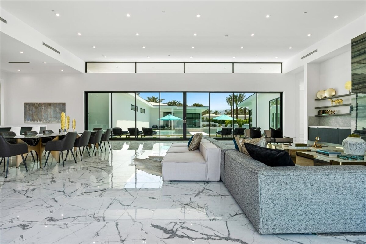 “Outdoor Music Allowed”. Welcome to this ultra-exclusive vacation rental , where this one-of-a-kind residence will exceed all of your expectations while embracing you, your family and your friends with the finest modern architecture and appointments available. Completely unprecedented in the world of short-term-rental properties, the gated community showcases a limited edition of 16 extraordinary residences of uncompromising luxury in a unique village-style enclave all located right across the street from the elegant Madison Club, and just minutes from restaurants and shopping. A massive pool with plenty of features such as very large tanning selves perfect for kids or to lie down in the sun, fire bowls, and LED waterfalls. Chic contemporary style with walls of glass and slideaway Fleetwood doors, oversized great room with 16′ ceilings, 12′ ceilings in other living areas and bedrooms, gorgeous floor tiles imported from Spain, and stunning open kitchens with European cabinetry and top-of-the-line Miele appliances. Every bedroom is a suite, complete with a private bath and large closet. Primary suites elevate personal luxury to new heights, with outdoor access, walk-in multi-head showers, freestanding tubs, and oversized walk-in closets with Italian-made custom built-ins. Enjoy the beauty of modern lighting, contemporary artwork, chic furnishings, Grohe plumbing fixtures and pivoting glass entry doors. Landscaping is impeccable and upscale, and select residences feature putting greens, fire bowls and fountains. Enviable location right next to the private communities of The Madison Club, The Citrus Club and Hideaway Golf Club makes it easy for guests to walk or bike to concerts, shops and restaurants. The Indian Wells Tennis Garden, high-end shopping on El Paseo, abundant recreation, and Palm Springs International Airport are all within easy reach. The ultimate luxury vacation awaits! Book your unforgettable stay today!