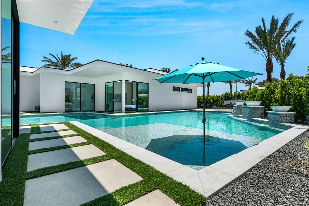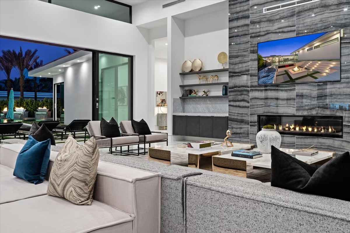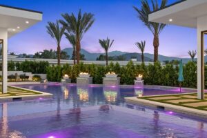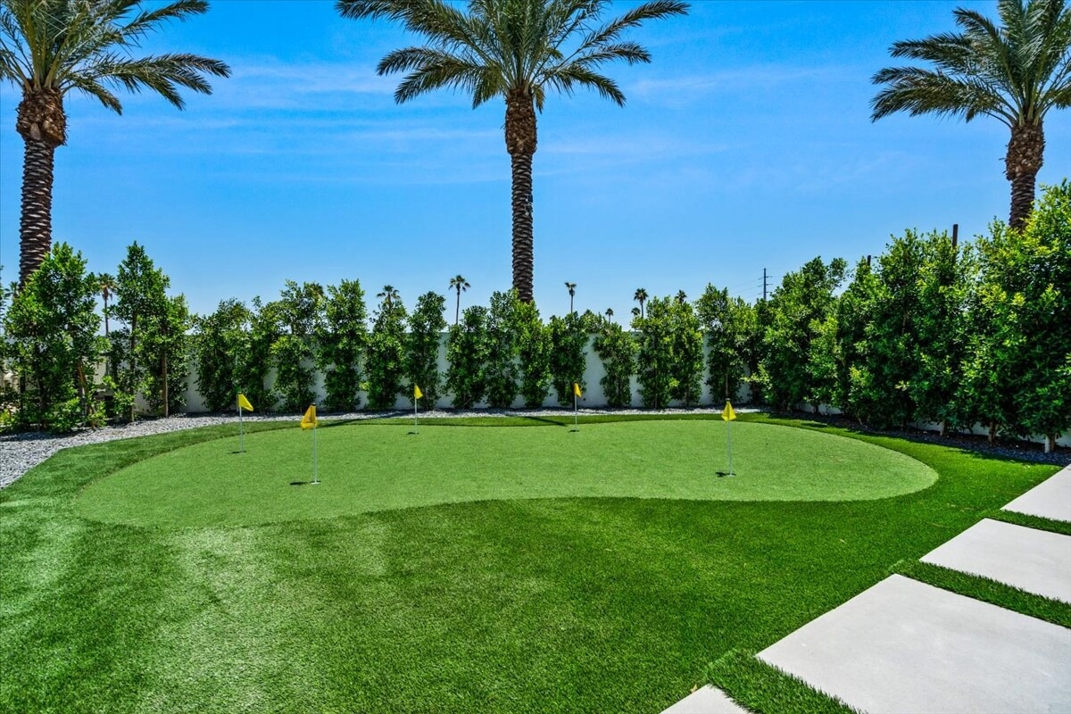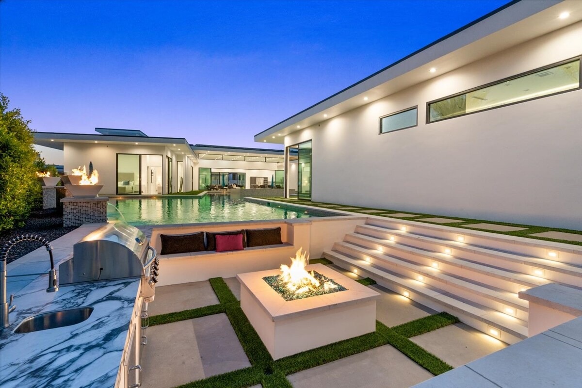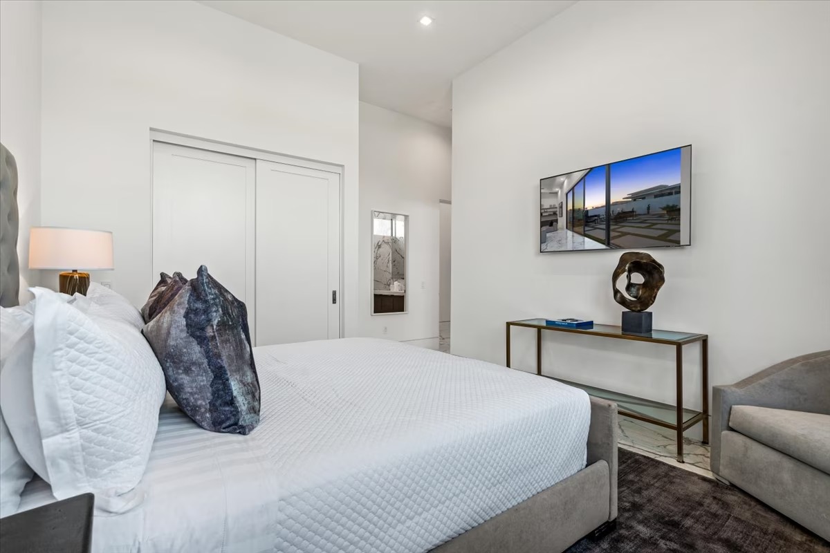 “Outdoor Music Allowed”. Welcome to this ultra-exclusive vacation rental , where this one-of-a-kind residence will exceed all of your expectations while embracing you, your family and your friends with the finest modern architecture and appointments available. Completely unprecedented in the world of short-term-rental properties, the gated community showcases a limited edition of 16 extraordinary residences of uncompromising luxury in a unique village-style enclave all located right across the street from the elegant Madison Club, and just minutes from restaurants and shopping. A massive pool with plenty of features such as very large tanning selves perfect for kids or to lie down in the sun, fire bowls, and LED waterfalls. Chic contemporary style with walls of glass and slideaway Fleetwood doors, oversized great room with 16′ ceilings, 12′ ceilings in other living areas and bedrooms, gorgeous floor tiles imported from Spain, and stunning open kitchens with European cabinetry and top-of-the-line Miele appliances. Every bedroom is a suite, complete with a private bath and large closet. Primary suites elevate personal luxury to new heights, with outdoor access, walk-in multi-head showers, freestanding tubs, and oversized walk-in closets with Italian-made custom built-ins. Enjoy the beauty of modern lighting, contemporary artwork, chic furnishings, Grohe plumbing fixtures and pivoting glass entry doors. Landscaping is impeccable and upscale, and select residences feature putting greens, fire bowls and fountains. Enviable location right next to the private communities of The Madison Club, The Citrus Club and Hideaway Golf Club makes it easy for guests to walk or bike to concerts, shops and restaurants. The Indian Wells Tennis Garden, high-end shopping on El Paseo, abundant recreation, and Palm Springs International Airport are all within easy reach. The ultimate luxury vacation awaits! Book your unforgettable stay today!
