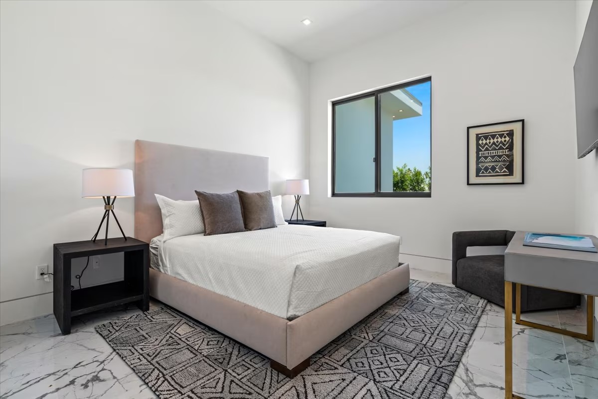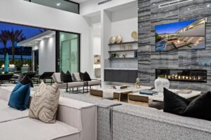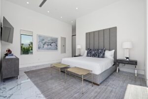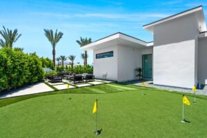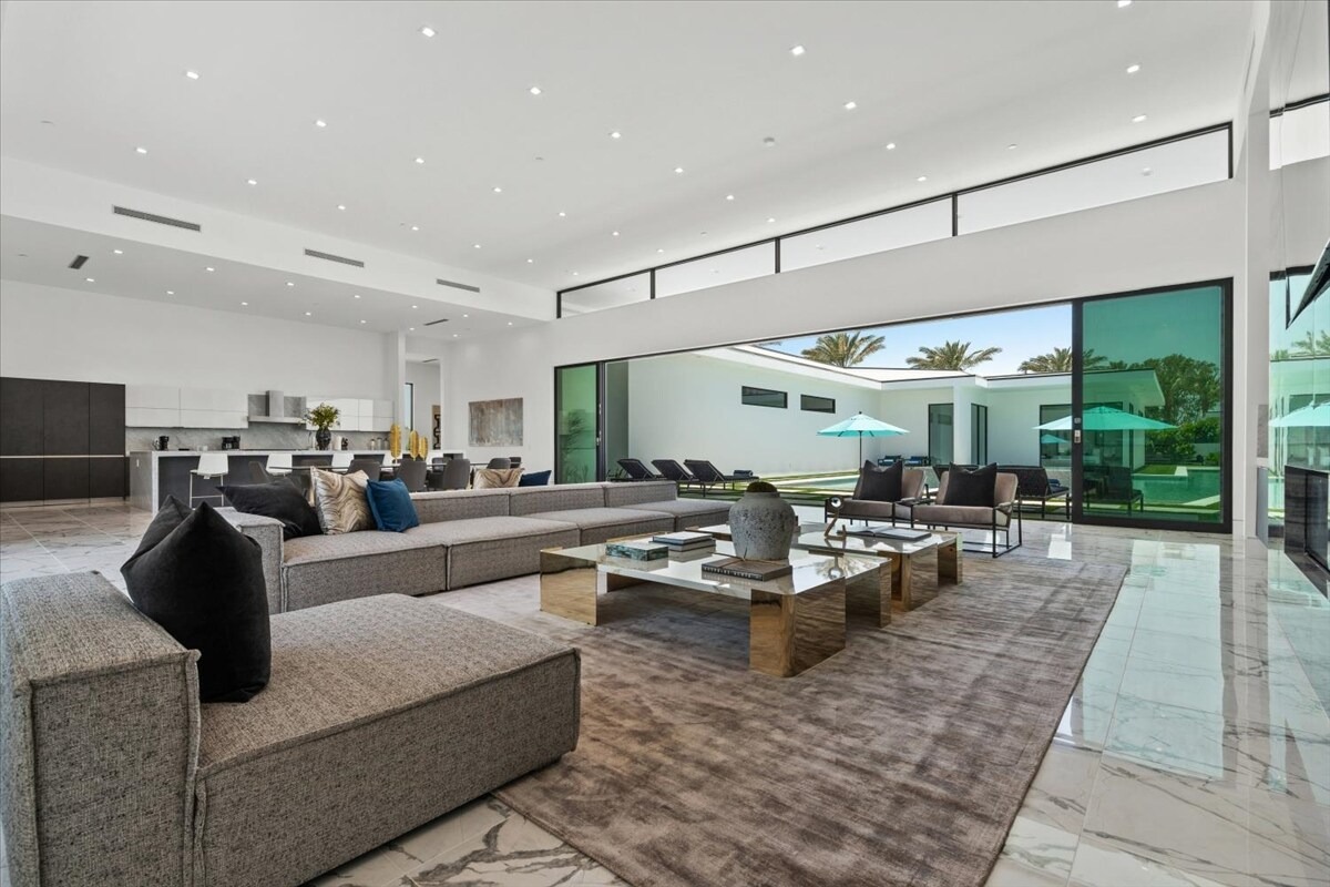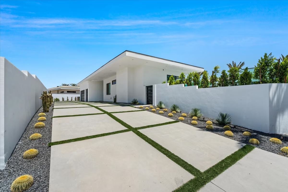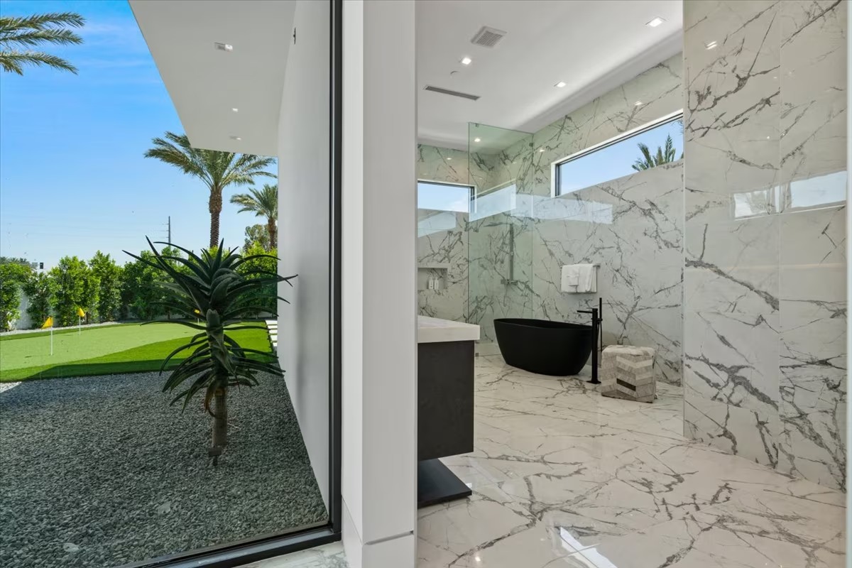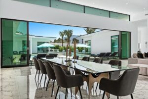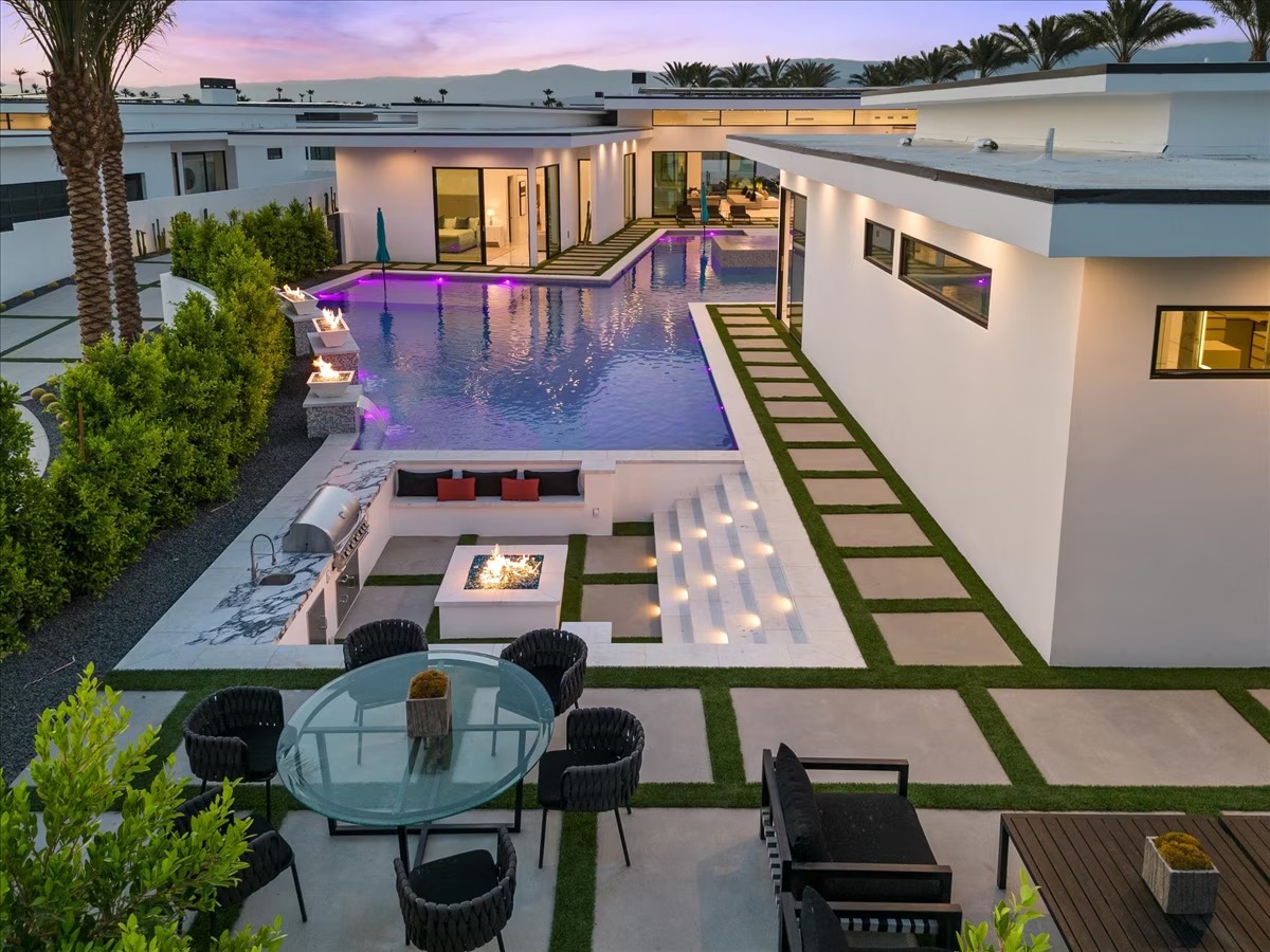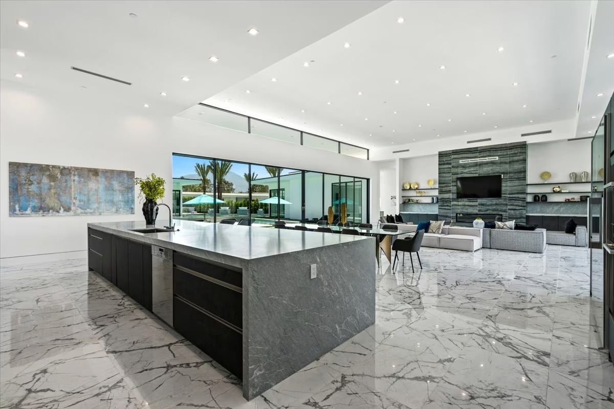 “Outdoor Music Allowed”. Welcome to this ultra-exclusive vacation rental , where this one-of-a-kind residence will exceed all of your expectations while embracing you, your family and your friends with the finest modern architecture and appointments available. Completely unprecedented in the world of short-term-rental properties, the gated community showcases a limited edition of 16 extraordinary residences of uncompromising luxury in a unique village-style enclave all located right across the street from the elegant Madison Club, and just minutes from restaurants and shopping. A massive pool with plenty of features such as very large tanning selves perfect for kids or to lie down in the sun, fire bowls, and LED waterfalls. Chic contemporary style with walls of glass and slideaway Fleetwood doors, oversized great room with 16′ ceilings, 12′ ceilings in other living areas and bedrooms, gorgeous floor tiles imported from Spain, and stunning open kitchens with European cabinetry and top-of-the-line Miele appliances. Every bedroom is a suite, complete with a private bath and large closet. Primary suites elevate personal luxury to new heights, with outdoor access, walk-in multi-head showers, freestanding tubs, and oversized walk-in closets with Italian-made custom built-ins. Enjoy the beauty of modern lighting, contemporary artwork, chic furnishings, Grohe plumbing fixtures and pivoting glass entry doors. Landscaping is impeccable and upscale, and select residences feature putting greens, fire bowls and fountains. Enviable location right next to the private communities of The Madison Club, The Citrus Club and Hideaway Golf Club makes it easy for guests to walk or bike to concerts, shops and restaurants. The Indian Wells Tennis Garden, high-end shopping on El Paseo, abundant recreation, and Palm Springs International Airport are all within easy reach. The ultimate luxury vacation awaits! Book your unforgettable stay today!