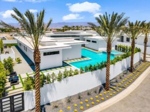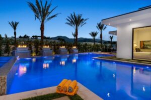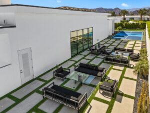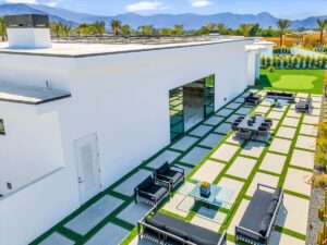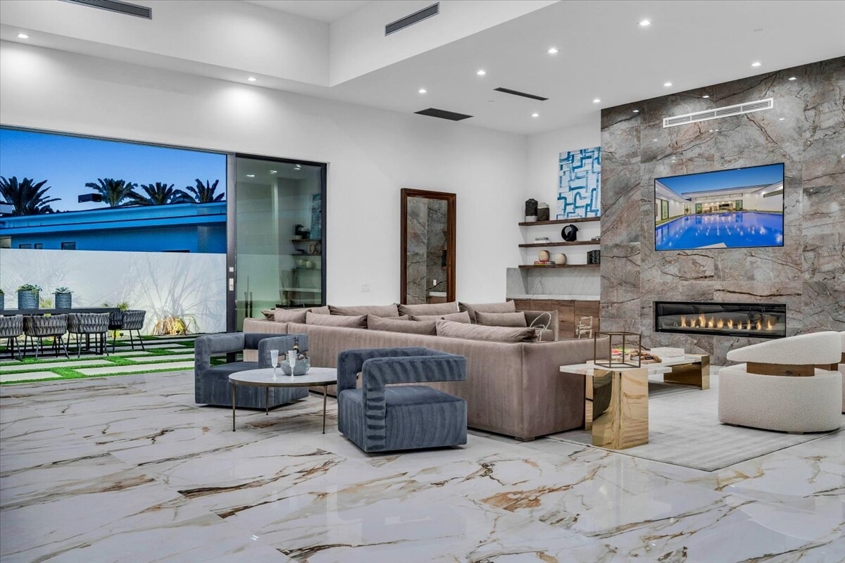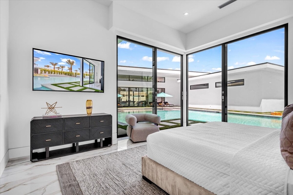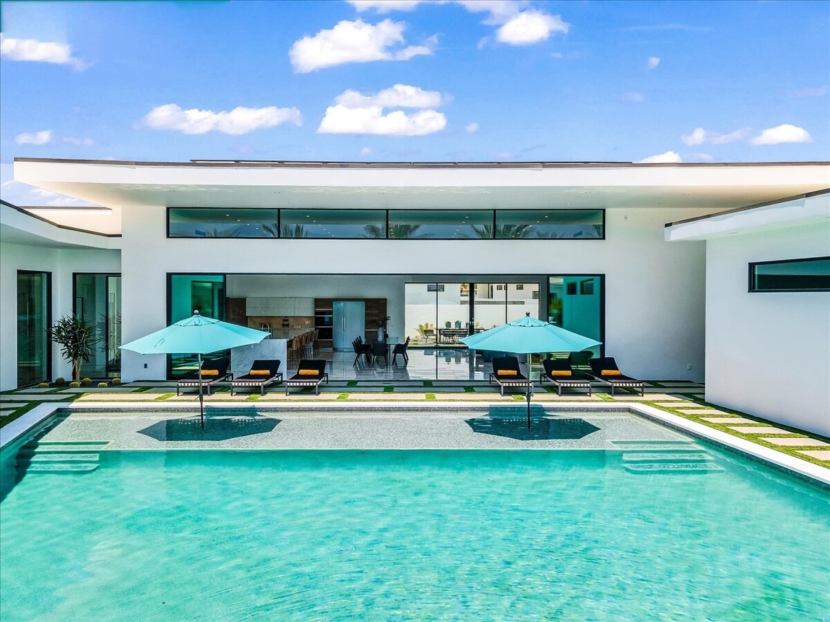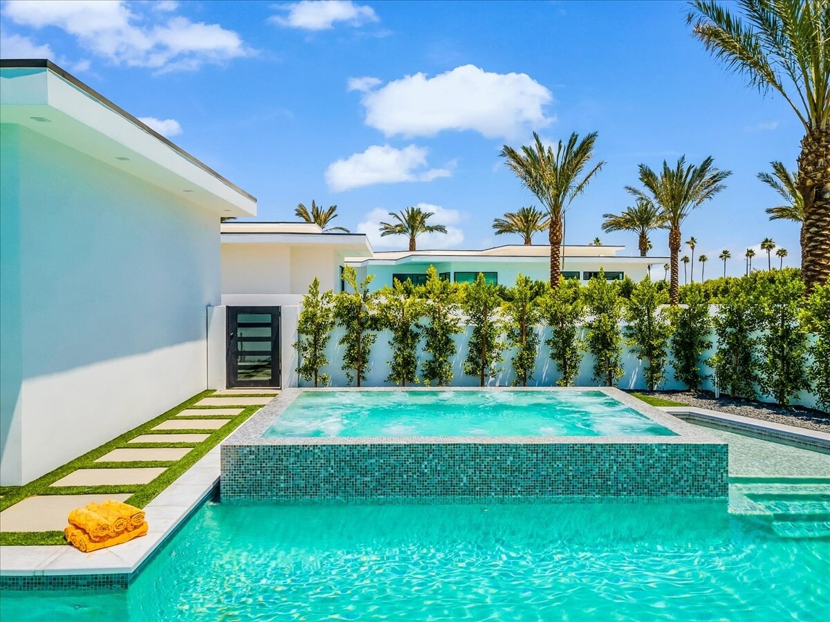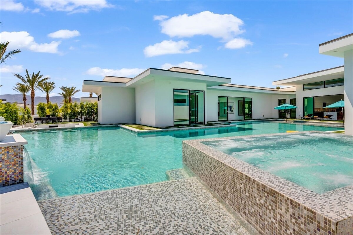 “Outdoor Music Allowed”. Welcome to this ultra-exclusive vacation rental , where this one-of-a-kind residence will exceed all of your expectations while embracing you, your family and your friends with the finest modern architecture and appointments available. Completely unprecedented in the world of short-term-rental properties, the gated community showcases a limited edition of 16 extraordinary residences of uncompromising luxury in a unique village-style enclave all located right across the street from the elegant Madison Club, and just minutes from restaurants and shopping. A massive pool with plenty of features such as very large tanning selves perfect for kids or to lie down in the sun, fire bowls, and LED waterfalls. Chic contemporary style with walls of glass and slideaway Fleetwood doors, oversized great room with 16′ ceilings, 12′ ceilings in other living areas and bedrooms, gorgeous floor tiles imported from Spain, and stunning open kitchens with European cabinetry and top-of-the-line Miele appliances. Every bedroom is a suite, complete with a private bath and large closet. Primary suites elevate personal luxury to new heights, with outdoor access, walk-in multi-head showers, freestanding tubs, and oversized walk-in closets with Italian-made custom built-ins. Enjoy the beauty of modern lighting, contemporary artwork, chic furnishings, Grohe plumbing fixtures and pivoting glass entry doors. Landscaping is impeccable and upscale, and select residences feature putting greens, fire bowls and fountains. Enviable location right next to the private communities of The Madison Club, The Citrus Club and Hideaway Golf Club makes it easy for guests to walk or bike to concerts, shops and restaurants. The Indian Wells Tennis Garden, high-end shopping on El Paseo, abundant recreation, and Palm Springs International Airport are all within easy reach. The ultimate luxury vacation awaits! Book your unforgettable stay today!