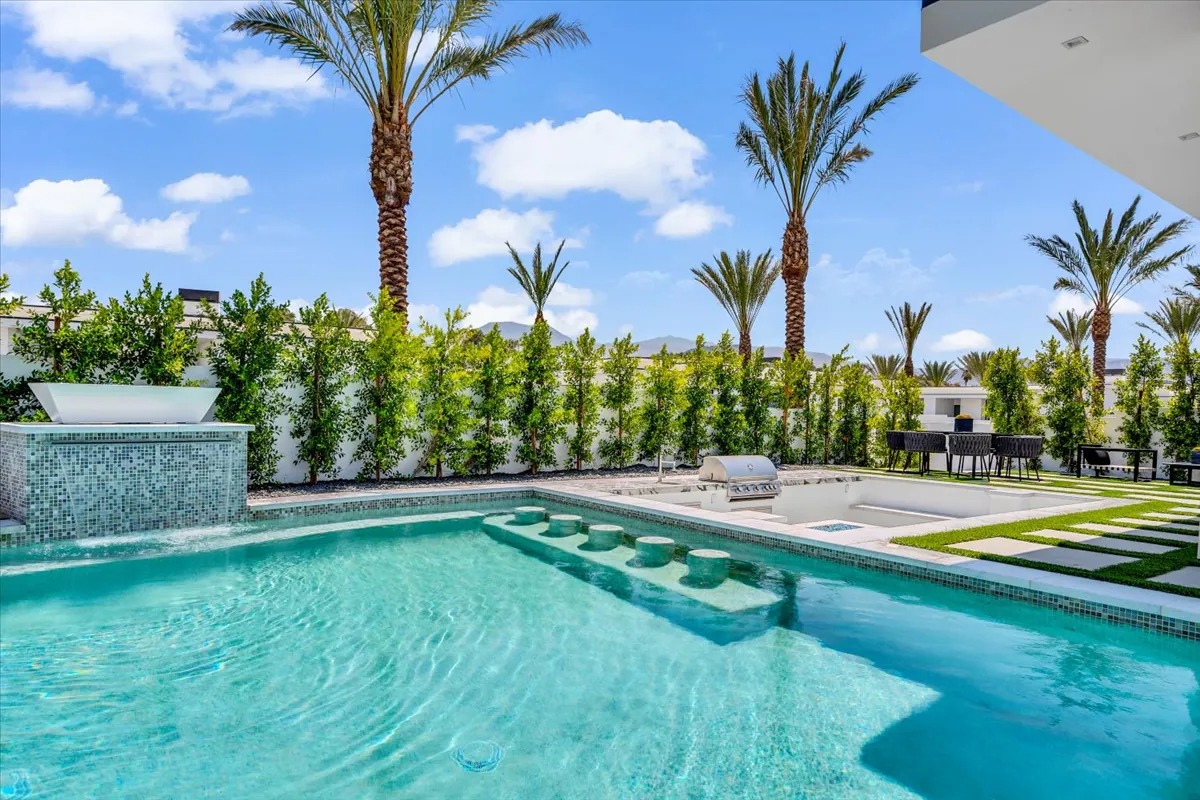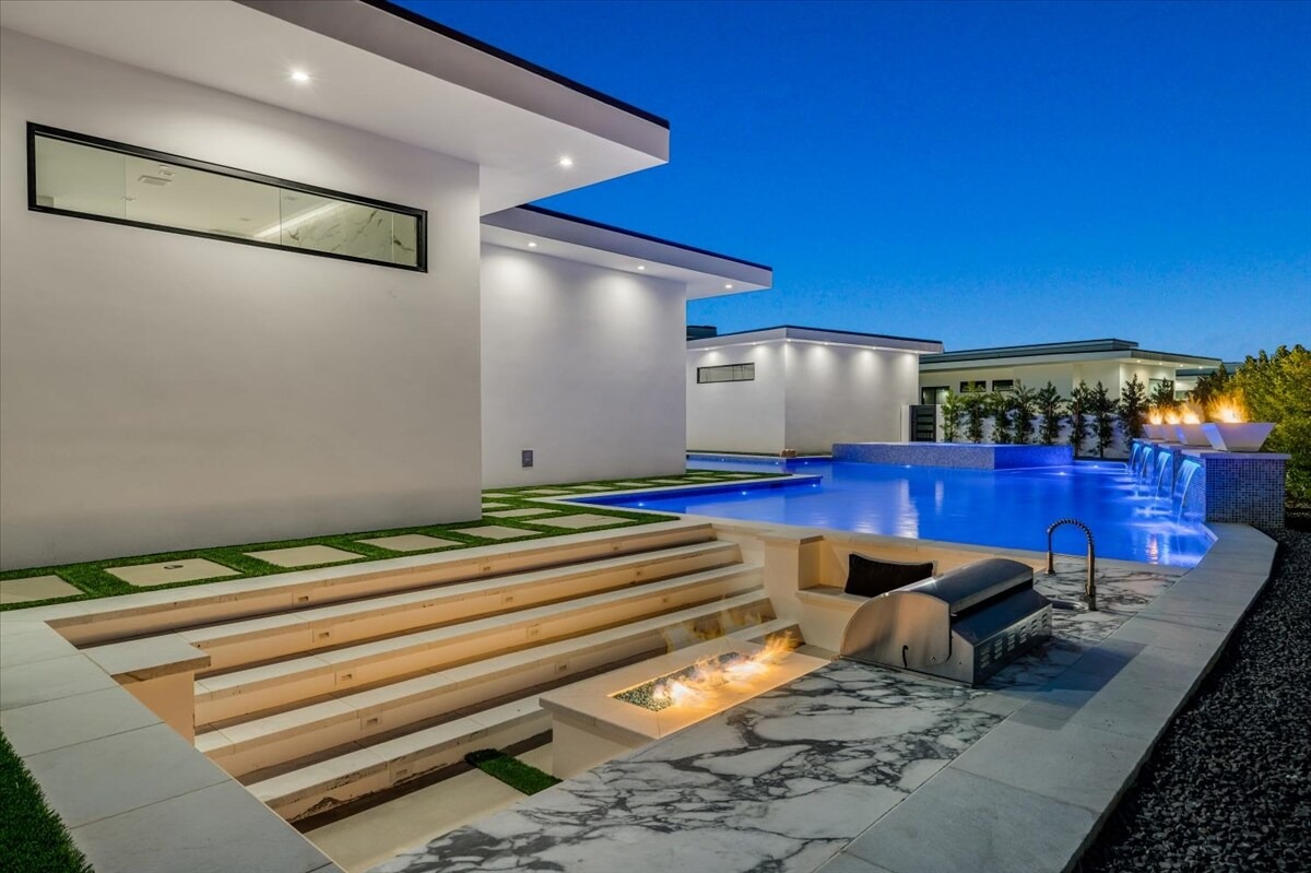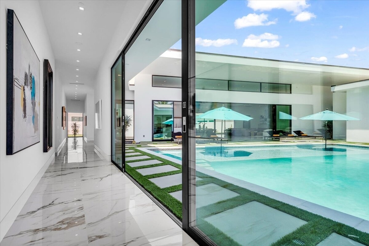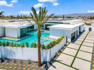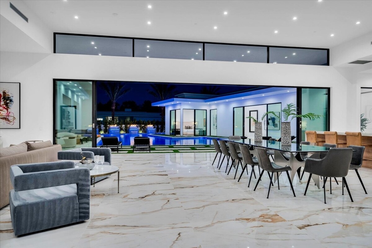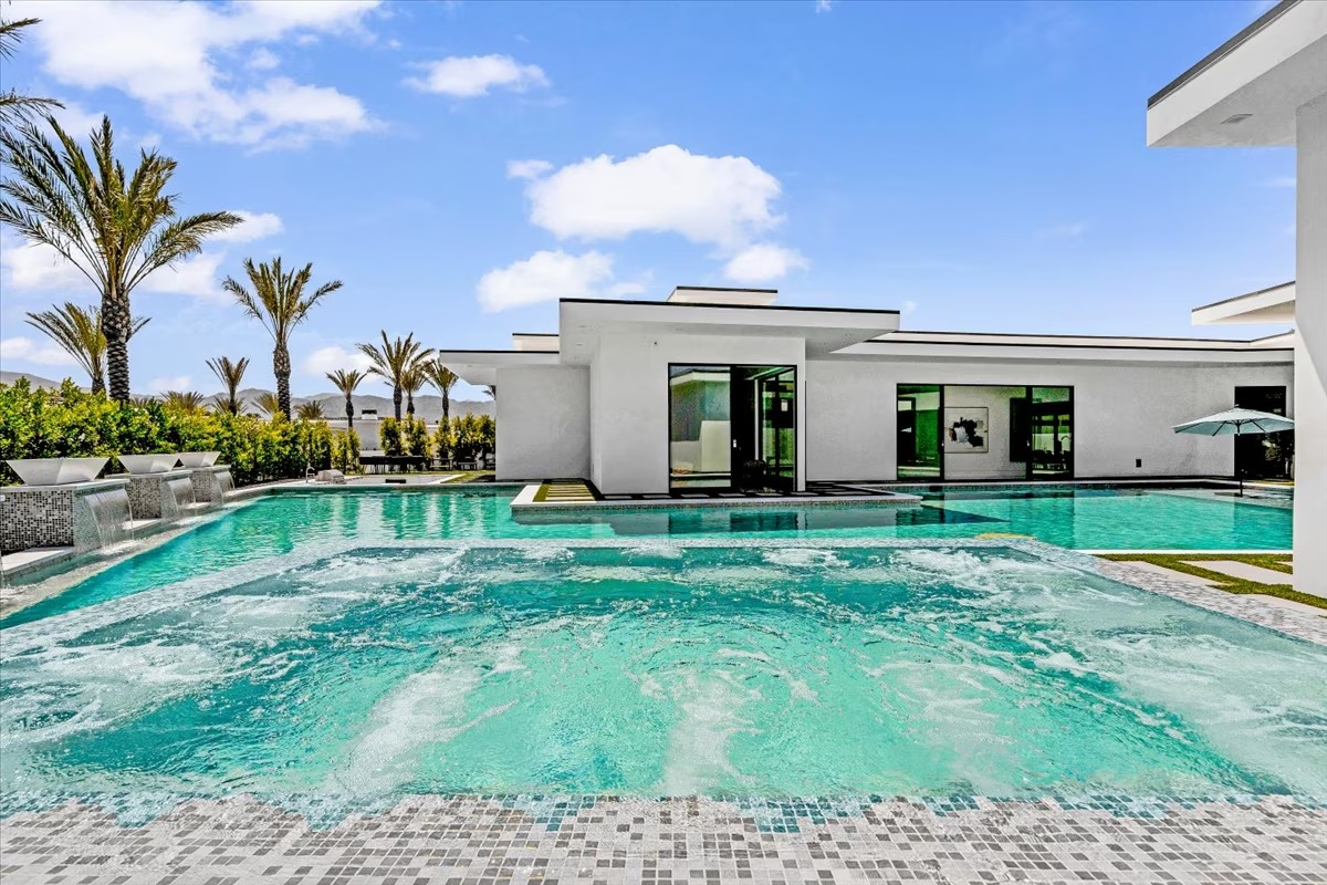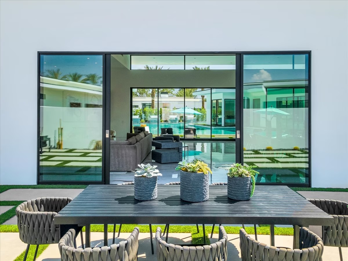 “Outdoor Music Allowed”. Welcome to this ultra-exclusive vacation rental , where this one-of-a-kind residence will exceed all of your expectations while embracing you, your family and your friends with the finest modern architecture and appointments available. Completely unprecedented in the world of short-term-rental properties, the gated community showcases a limited edition of 16 extraordinary residences of uncompromising luxury in a unique village-style enclave all located right across the street from the elegant Madison Club, and just minutes from restaurants and shopping. A massive pool with plenty of features such as very large tanning selves perfect for kids or to lie down in the sun, fire bowls, and LED waterfalls. Chic contemporary style with walls of glass and slideaway Fleetwood doors, oversized great room with 16′ ceilings, 12′ ceilings in other living areas and bedrooms, gorgeous floor tiles imported from Spain, and stunning open kitchens with European cabinetry and top-of-the-line Miele appliances. Every bedroom is a suite, complete with a private bath and large closet. Primary suites elevate personal luxury to new heights, with outdoor access, walk-in multi-head showers, freestanding tubs, and oversized walk-in closets with Italian-made custom built-ins. Enjoy the beauty of modern lighting, contemporary artwork, chic furnishings, Grohe plumbing fixtures and pivoting glass entry doors. Landscaping is impeccable and upscale, and select residences feature putting greens, fire bowls and fountains. Enviable location right next to the private communities of The Madison Club, The Citrus Club and Hideaway Golf Club makes it easy for guests to walk or bike to concerts, shops and restaurants. The Indian Wells Tennis Garden, high-end shopping on El Paseo, abundant recreation, and Palm Springs International Airport are all within easy reach. The ultimate luxury vacation awaits! Book your unforgettable stay today!