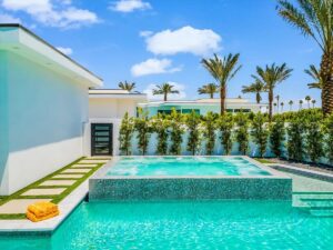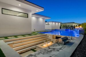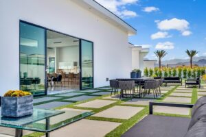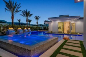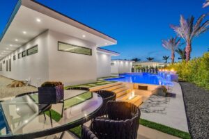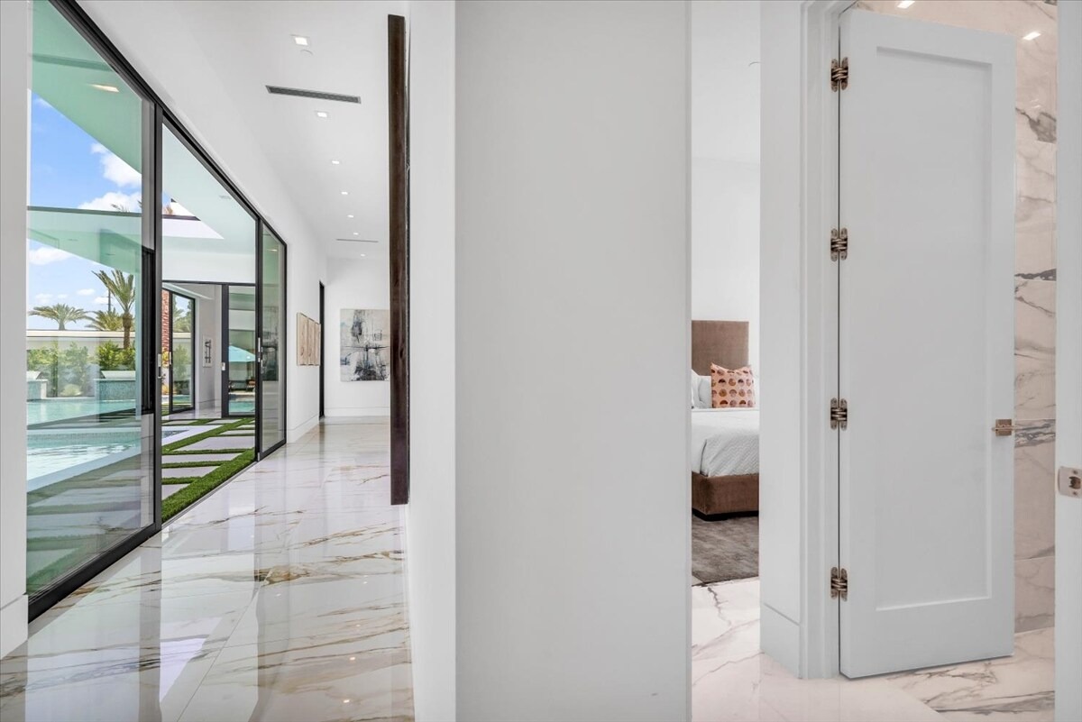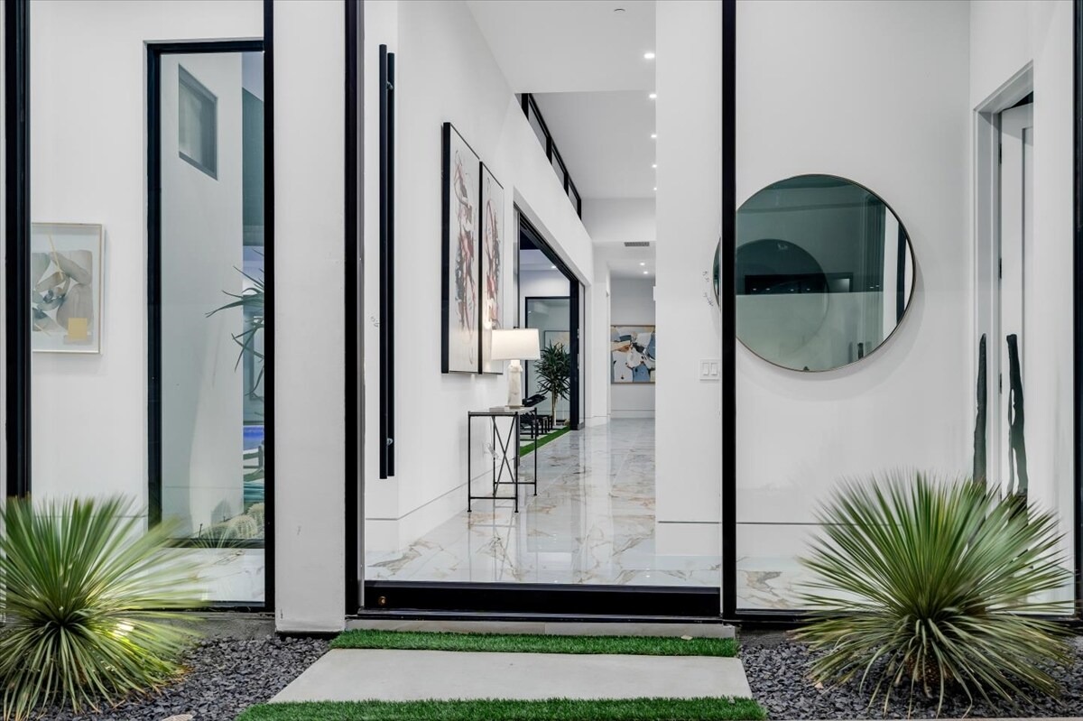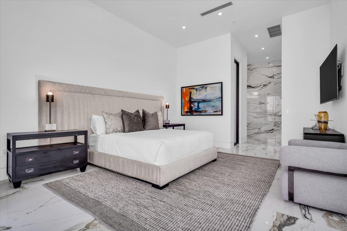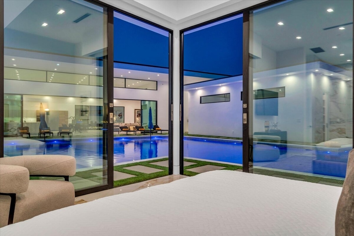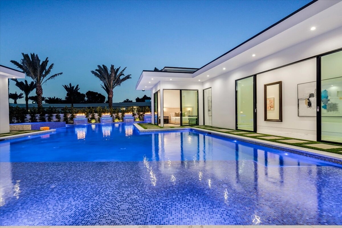 “Outdoor Music Allowed”. Welcome to this ultra-exclusive vacation rental , where this one-of-a-kind residence will exceed all of your expectations while embracing you, your family and your friends with the finest modern architecture and appointments available. Completely unprecedented in the world of short-term-rental properties, the gated community showcases a limited edition of 16 extraordinary residences of uncompromising luxury in a unique village-style enclave all located right across the street from the elegant Madison Club, and just minutes from restaurants and shopping. A massive pool with plenty of features such as very large tanning selves perfect for kids or to lie down in the sun, fire bowls, and LED waterfalls. Chic contemporary style with walls of glass and slideaway Fleetwood doors, oversized great room with 16′ ceilings, 12′ ceilings in other living areas and bedrooms, gorgeous floor tiles imported from Spain, and stunning open kitchens with European cabinetry and top-of-the-line Miele appliances. Every bedroom is a suite, complete with a private bath and large closet. Primary suites elevate personal luxury to new heights, with outdoor access, walk-in multi-head showers, freestanding tubs, and oversized walk-in closets with Italian-made custom built-ins. Enjoy the beauty of modern lighting, contemporary artwork, chic furnishings, Grohe plumbing fixtures and pivoting glass entry doors. Landscaping is impeccable and upscale, and select residences feature putting greens, fire bowls and fountains. Enviable location right next to the private communities of The Madison Club, The Citrus Club and Hideaway Golf Club makes it easy for guests to walk or bike to concerts, shops and restaurants. The Indian Wells Tennis Garden, high-end shopping on El Paseo, abundant recreation, and Palm Springs International Airport are all within easy reach. The ultimate luxury vacation awaits! Book your unforgettable stay today!