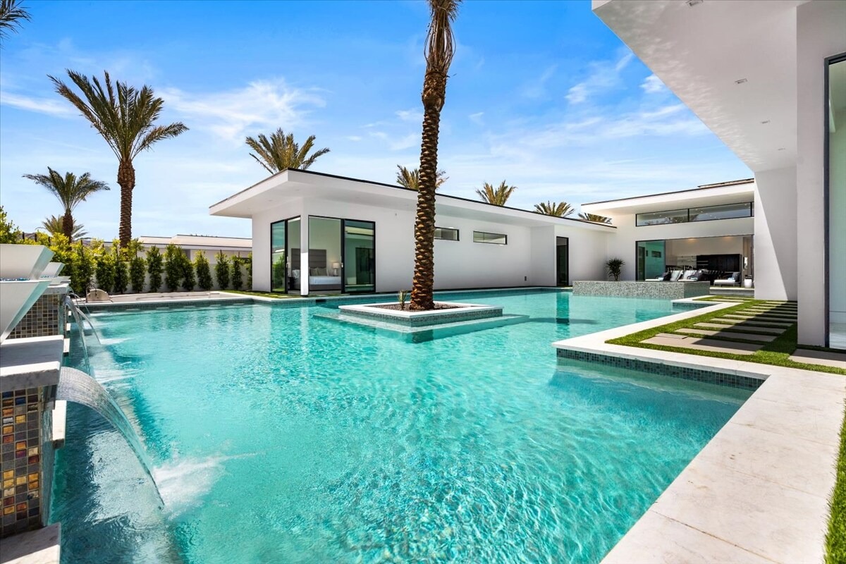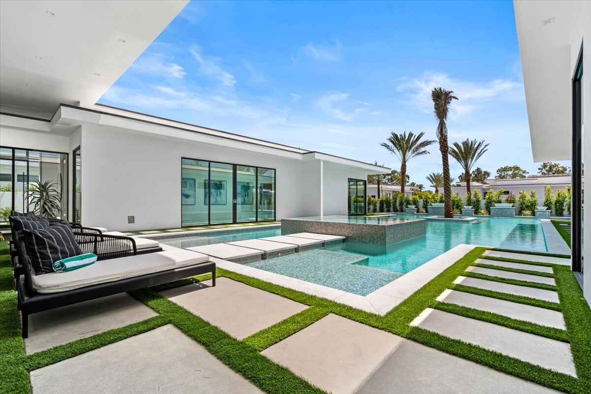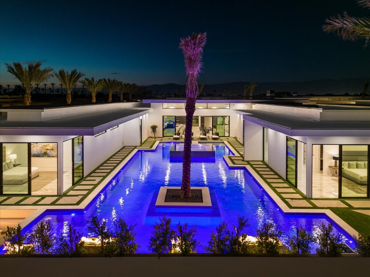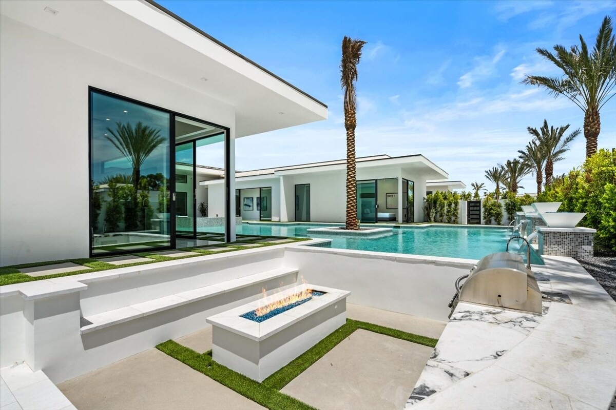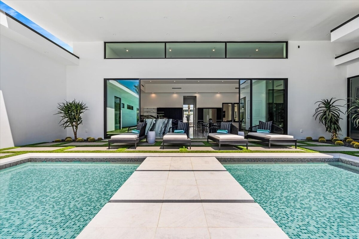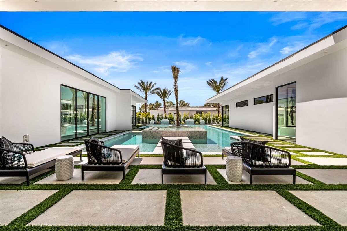 “Outdoor Music Allowed”. Welcome to this ultra-exclusive vacation rental , where this one-of-a-kind residence will exceed all of your expectations while embracing you, your family and your friends with the finest modern architecture and appointments available. Completely unprecedented in the world of short-term-rental properties, the gated community showcases a limited edition of 16 extraordinary residences of uncompromising luxury in a unique village-style enclave all located right across the street from the elegant Madison Club, and just minutes from restaurants and shopping. A massive pool with plenty of features such as very large tanning selves perfect for kids or to lie down in the sun, fire bowls, and LED waterfalls. Chic contemporary style with walls of glass and slideaway Fleetwood doors, oversized great room with 16′ ceilings, 12′ ceilings in other living areas and bedrooms, gorgeous floor tiles imported from Spain, and stunning open kitchens with European cabinetry and top-of-the-line Miele appliances. Every bedroom is a suite, complete with a private bath and large closet. Primary suites elevate personal luxury to new heights, with outdoor access, walk-in multi-head showers, freestanding tubs, and oversized walk-in closets with Italian-made custom built-ins. Enjoy the beauty of modern lighting, contemporary artwork, chic furnishings, Grohe plumbing fixtures and pivoting glass entry doors. Landscaping is impeccable and upscale, and select residences feature putting greens, fire bowls and fountains. Enviable location right next to the private communities of The Madison Club, The Citrus Club and Hideaway Golf Club makes it easy for guests to walk or bike to concerts, shops and restaurants. The Indian Wells Tennis Garden, high-end shopping on El Paseo, abundant recreation, and Palm Springs International Airport are all within easy reach. The ultimate luxury vacation awaits! Book your unforgettable stay today!