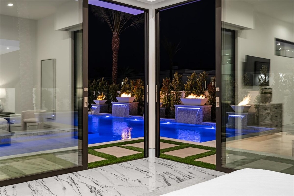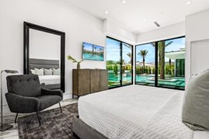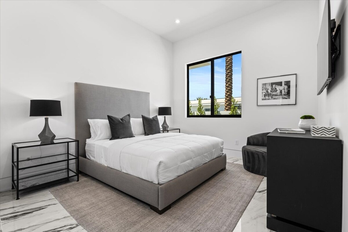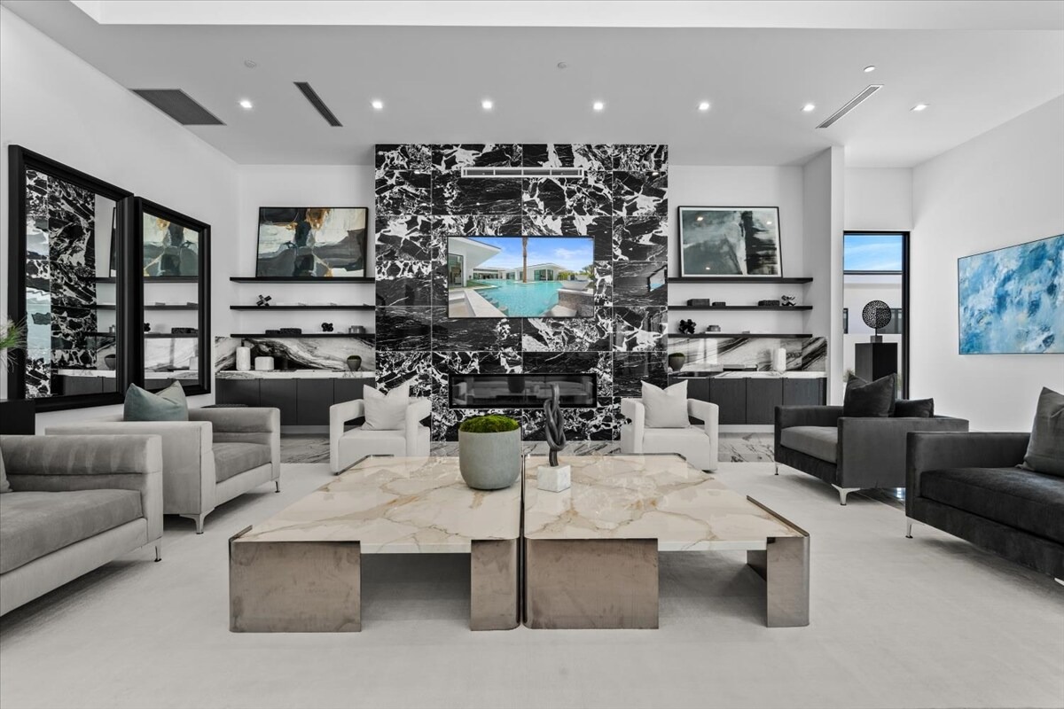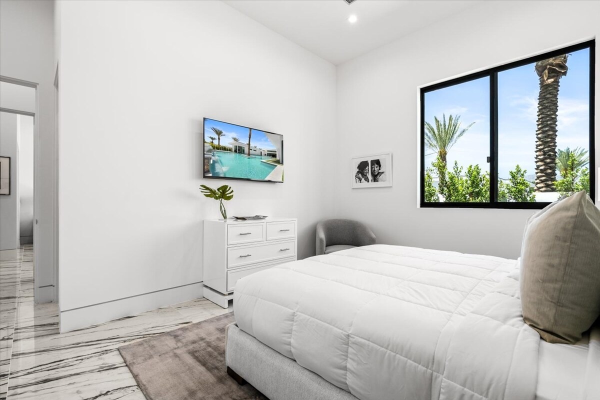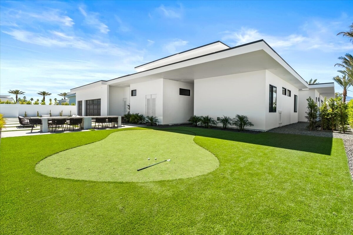 “Outdoor Music Allowed”. Welcome to this ultra-exclusive vacation rental , where this one-of-a-kind residence will exceed all of your expectations while embracing you, your family and your friends with the finest modern architecture and appointments available. Completely unprecedented in the world of short-term-rental properties, the gated community showcases a limited edition of 16 extraordinary residences of uncompromising luxury in a unique village-style enclave all located right across the street from the elegant Madison Club, and just minutes from restaurants and shopping. A massive pool with plenty of features such as very large tanning selves perfect for kids or to lie down in the sun, fire bowls, and LED waterfalls. Chic contemporary style with walls of glass and slideaway Fleetwood doors, oversized great room with 16′ ceilings, 12′ ceilings in other living areas and bedrooms, gorgeous floor tiles imported from Spain, and stunning open kitchens with European cabinetry and top-of-the-line Miele appliances. Every bedroom is a suite, complete with a private bath and large closet. Primary suites elevate personal luxury to new heights, with outdoor access, walk-in multi-head showers, freestanding tubs, and oversized walk-in closets with Italian-made custom built-ins. Enjoy the beauty of modern lighting, contemporary artwork, chic furnishings, Grohe plumbing fixtures and pivoting glass entry doors. Landscaping is impeccable and upscale, and select residences feature putting greens, fire bowls and fountains. Enviable location right next to the private communities of The Madison Club, The Citrus Club and Hideaway Golf Club makes it easy for guests to walk or bike to concerts, shops and restaurants. The Indian Wells Tennis Garden, high-end shopping on El Paseo, abundant recreation, and Palm Springs International Airport are all within easy reach. The ultimate luxury vacation awaits! Book your unforgettable stay today!