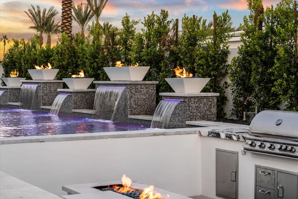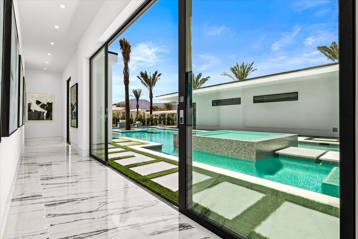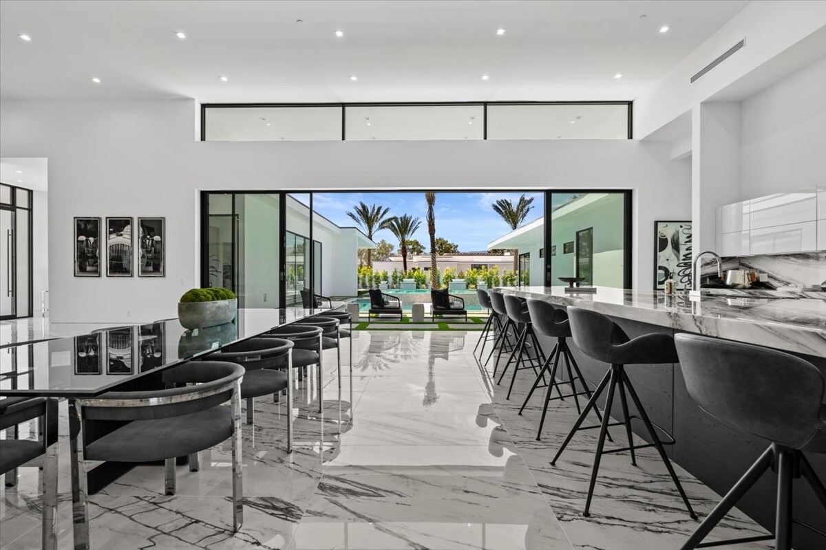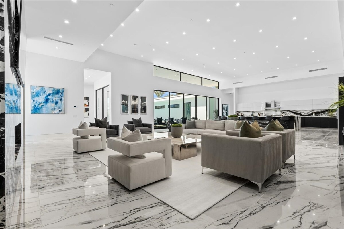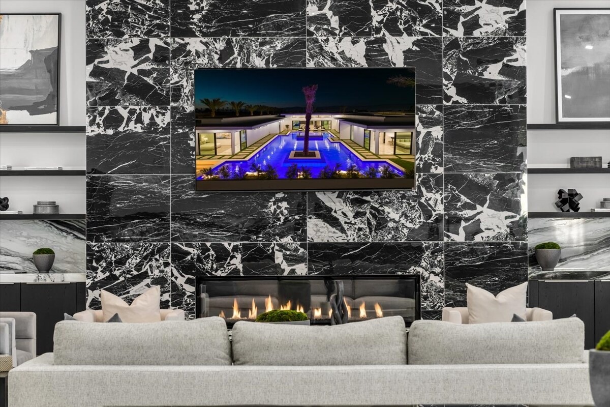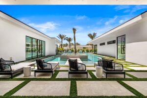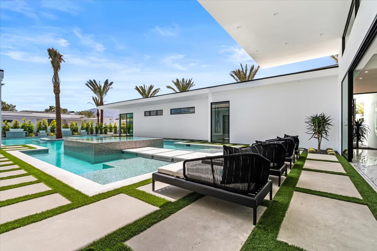 “Outdoor Music Allowed”. Welcome to this ultra-exclusive vacation rental , where this one-of-a-kind residence will exceed all of your expectations while embracing you, your family and your friends with the finest modern architecture and appointments available. Completely unprecedented in the world of short-term-rental properties, the gated community showcases a limited edition of 16 extraordinary residences of uncompromising luxury in a unique village-style enclave all located right across the street from the elegant Madison Club, and just minutes from restaurants and shopping. A massive pool with plenty of features such as very large tanning selves perfect for kids or to lie down in the sun, fire bowls, and LED waterfalls. Chic contemporary style with walls of glass and slideaway Fleetwood doors, oversized great room with 16′ ceilings, 12′ ceilings in other living areas and bedrooms, gorgeous floor tiles imported from Spain, and stunning open kitchens with European cabinetry and top-of-the-line Miele appliances. Every bedroom is a suite, complete with a private bath and large closet. Primary suites elevate personal luxury to new heights, with outdoor access, walk-in multi-head showers, freestanding tubs, and oversized walk-in closets with Italian-made custom built-ins. Enjoy the beauty of modern lighting, contemporary artwork, chic furnishings, Grohe plumbing fixtures and pivoting glass entry doors. Landscaping is impeccable and upscale, and select residences feature putting greens, fire bowls and fountains. Enviable location right next to the private communities of The Madison Club, The Citrus Club and Hideaway Golf Club makes it easy for guests to walk or bike to concerts, shops and restaurants. The Indian Wells Tennis Garden, high-end shopping on El Paseo, abundant recreation, and Palm Springs International Airport are all within easy reach. The ultimate luxury vacation awaits! Book your unforgettable stay today!