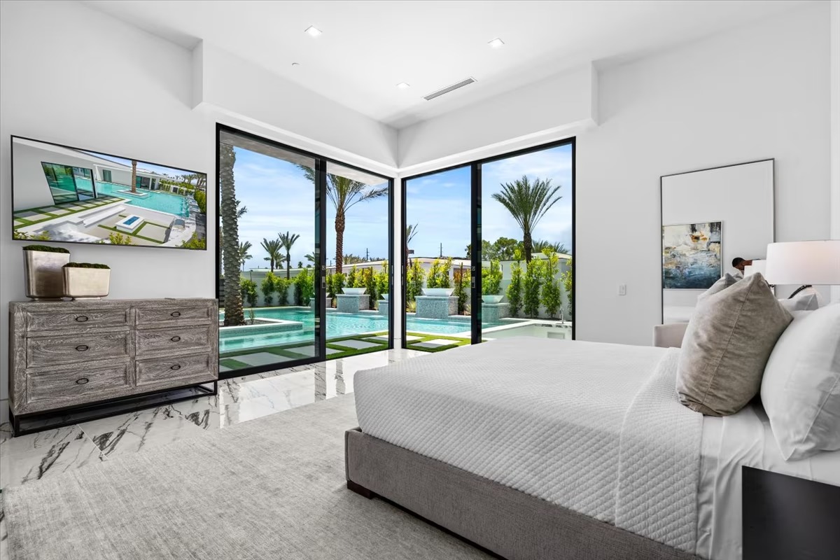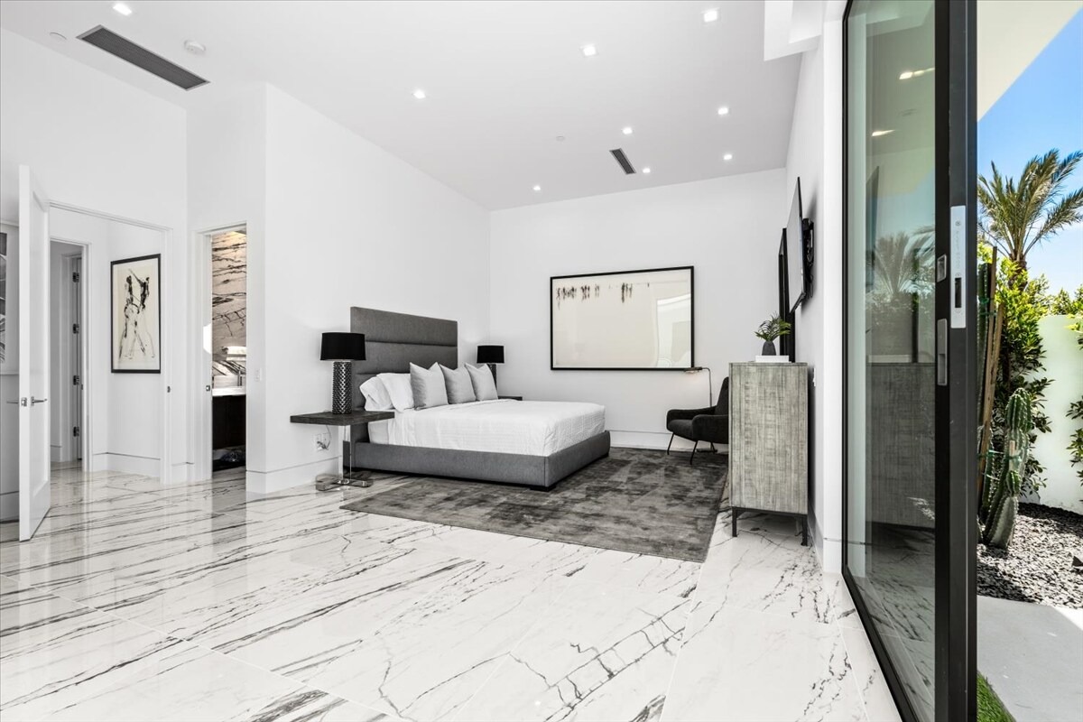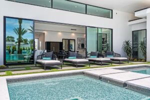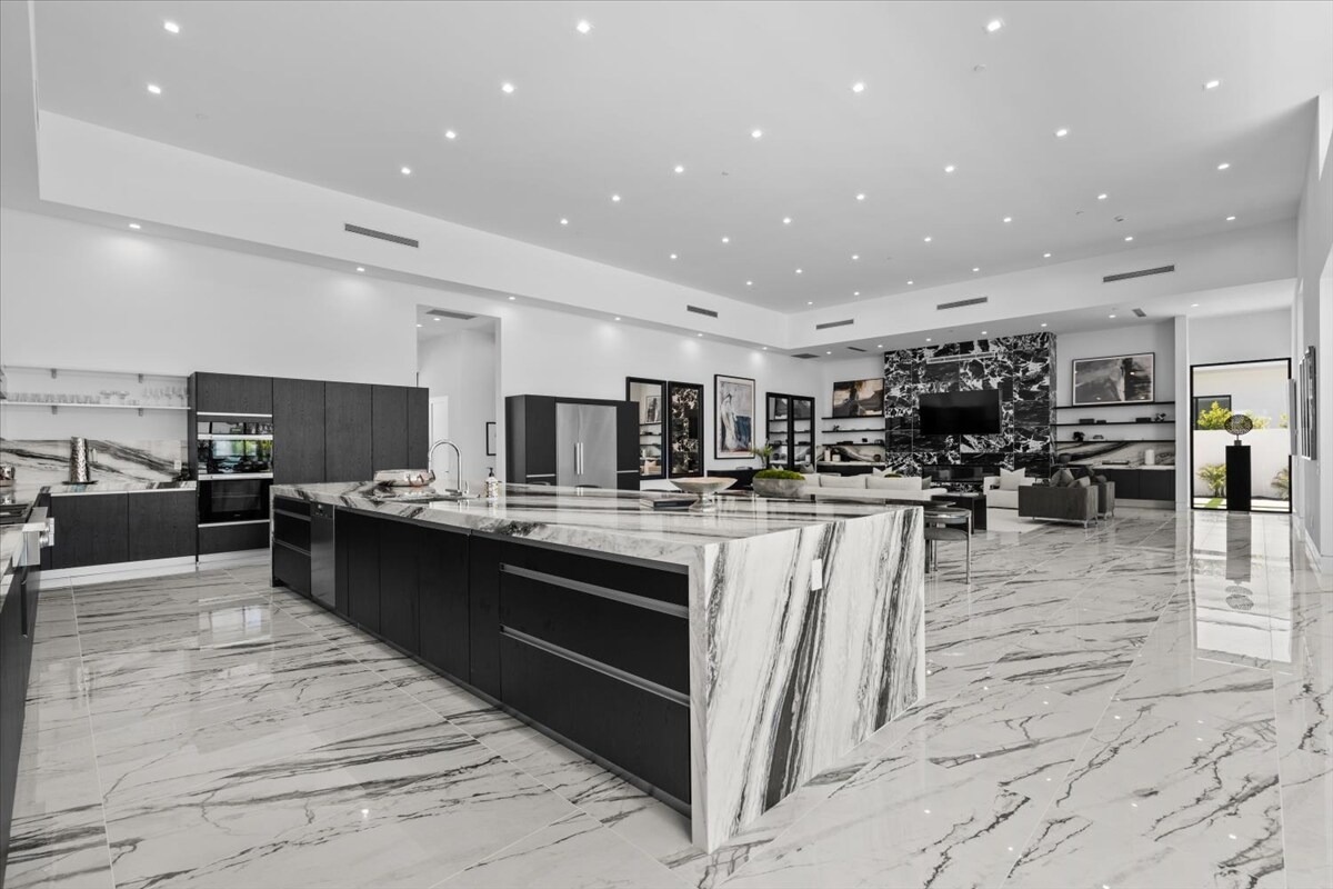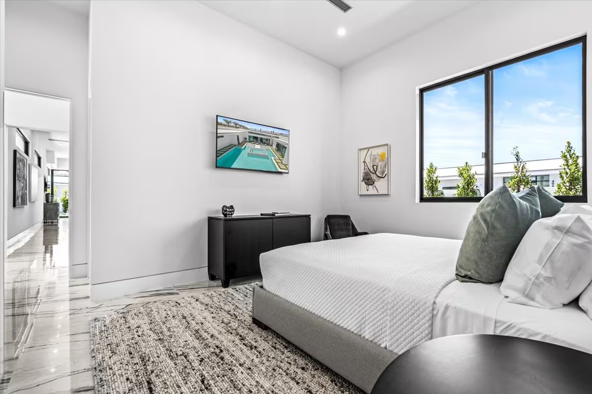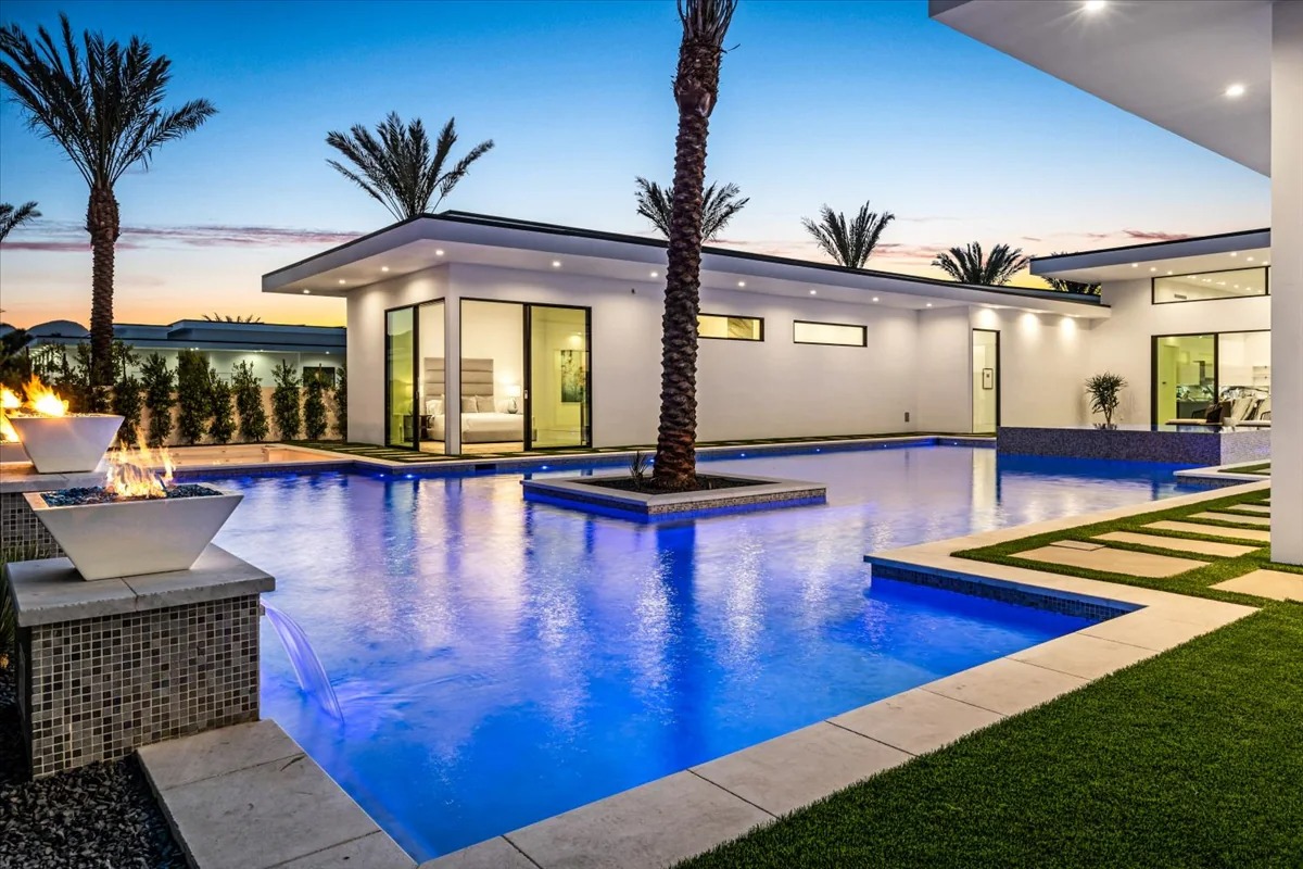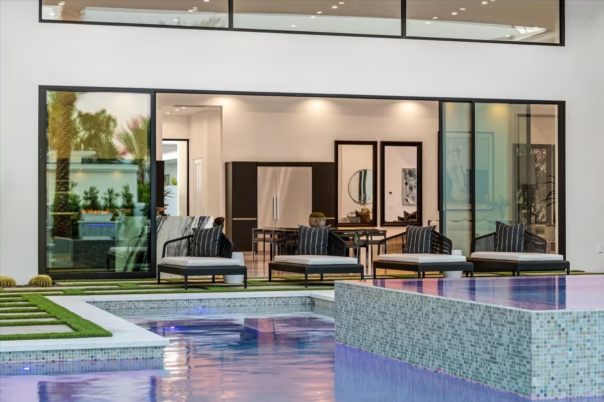 “Outdoor Music Allowed”. Welcome to this ultra-exclusive vacation rental , where this one-of-a-kind residence will exceed all of your expectations while embracing you, your family and your friends with the finest modern architecture and appointments available. Completely unprecedented in the world of short-term-rental properties, the gated community showcases a limited edition of 16 extraordinary residences of uncompromising luxury in a unique village-style enclave all located right across the street from the elegant Madison Club, and just minutes from restaurants and shopping. A massive pool with plenty of features such as very large tanning selves perfect for kids or to lie down in the sun, fire bowls, and LED waterfalls. Chic contemporary style with walls of glass and slideaway Fleetwood doors, oversized great room with 16′ ceilings, 12′ ceilings in other living areas and bedrooms, gorgeous floor tiles imported from Spain, and stunning open kitchens with European cabinetry and top-of-the-line Miele appliances. Every bedroom is a suite, complete with a private bath and large closet. Primary suites elevate personal luxury to new heights, with outdoor access, walk-in multi-head showers, freestanding tubs, and oversized walk-in closets with Italian-made custom built-ins. Enjoy the beauty of modern lighting, contemporary artwork, chic furnishings, Grohe plumbing fixtures and pivoting glass entry doors. Landscaping is impeccable and upscale, and select residences feature putting greens, fire bowls and fountains. Enviable location right next to the private communities of The Madison Club, The Citrus Club and Hideaway Golf Club makes it easy for guests to walk or bike to concerts, shops and restaurants. The Indian Wells Tennis Garden, high-end shopping on El Paseo, abundant recreation, and Palm Springs International Airport are all within easy reach. The ultimate luxury vacation awaits! Book your unforgettable stay today!