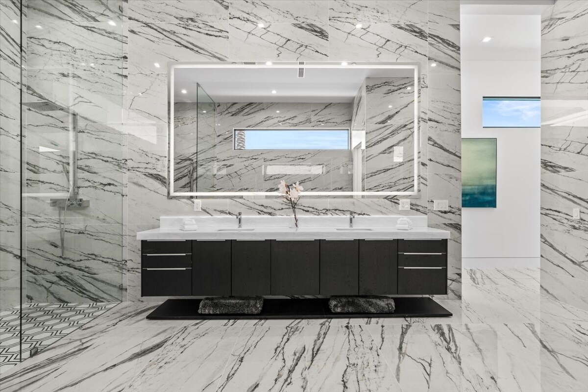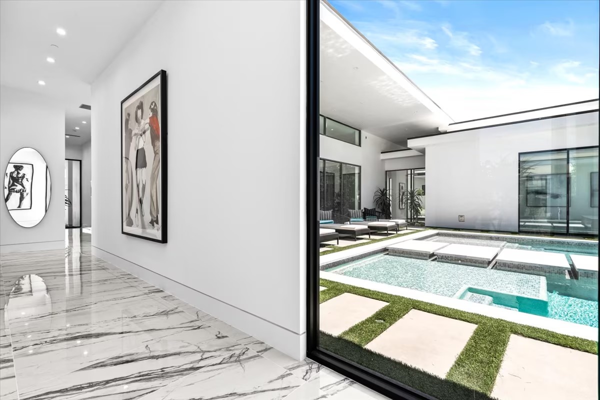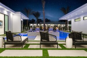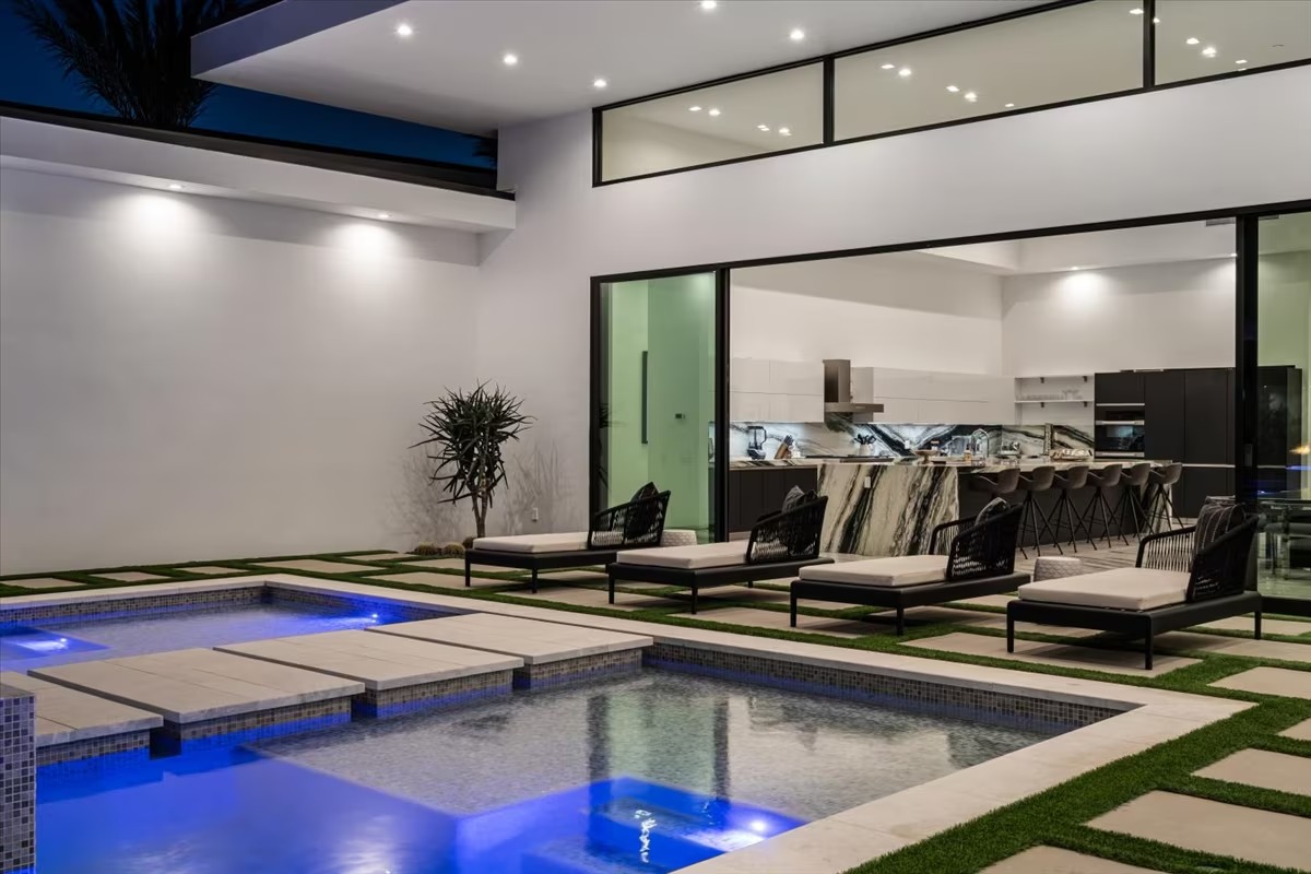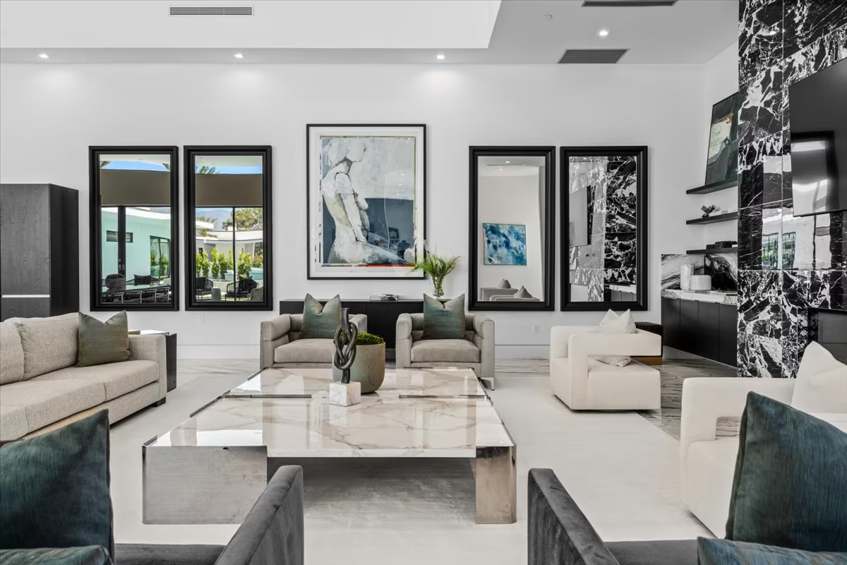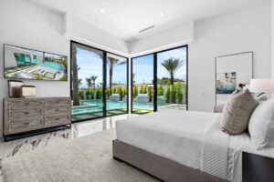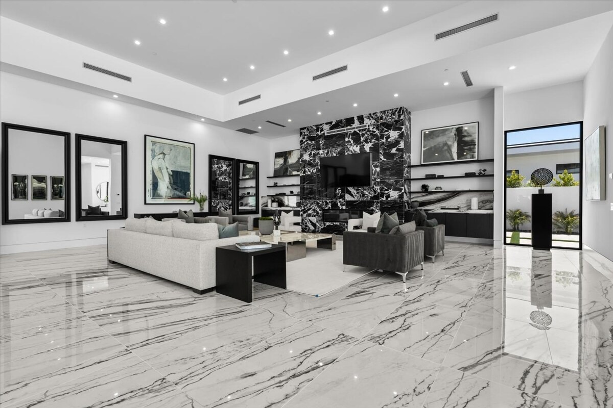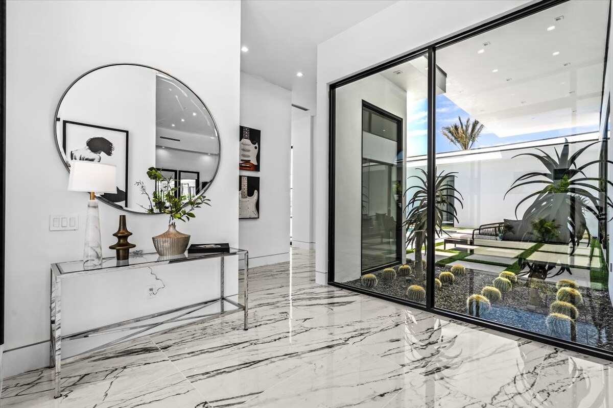 “Outdoor Music Allowed”. Welcome to this ultra-exclusive vacation rental , where this one-of-a-kind residence will exceed all of your expectations while embracing you, your family and your friends with the finest modern architecture and appointments available. Completely unprecedented in the world of short-term-rental properties, the gated community showcases a limited edition of 16 extraordinary residences of uncompromising luxury in a unique village-style enclave all located right across the street from the elegant Madison Club, and just minutes from restaurants and shopping. A massive pool with plenty of features such as very large tanning selves perfect for kids or to lie down in the sun, fire bowls, and LED waterfalls. Chic contemporary style with walls of glass and slideaway Fleetwood doors, oversized great room with 16′ ceilings, 12′ ceilings in other living areas and bedrooms, gorgeous floor tiles imported from Spain, and stunning open kitchens with European cabinetry and top-of-the-line Miele appliances. Every bedroom is a suite, complete with a private bath and large closet. Primary suites elevate personal luxury to new heights, with outdoor access, walk-in multi-head showers, freestanding tubs, and oversized walk-in closets with Italian-made custom built-ins. Enjoy the beauty of modern lighting, contemporary artwork, chic furnishings, Grohe plumbing fixtures and pivoting glass entry doors. Landscaping is impeccable and upscale, and select residences feature putting greens, fire bowls and fountains. Enviable location right next to the private communities of The Madison Club, The Citrus Club and Hideaway Golf Club makes it easy for guests to walk or bike to concerts, shops and restaurants. The Indian Wells Tennis Garden, high-end shopping on El Paseo, abundant recreation, and Palm Springs International Airport are all within easy reach. The ultimate luxury vacation awaits! Book your unforgettable stay today!