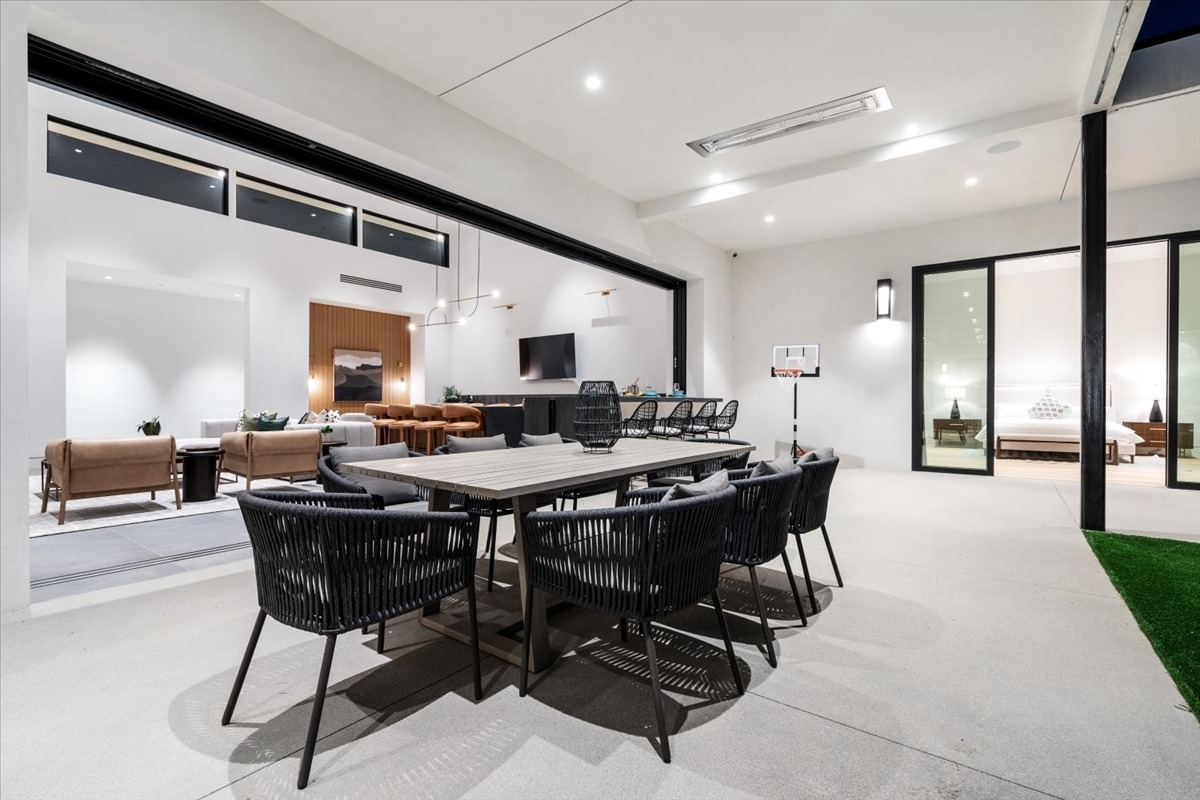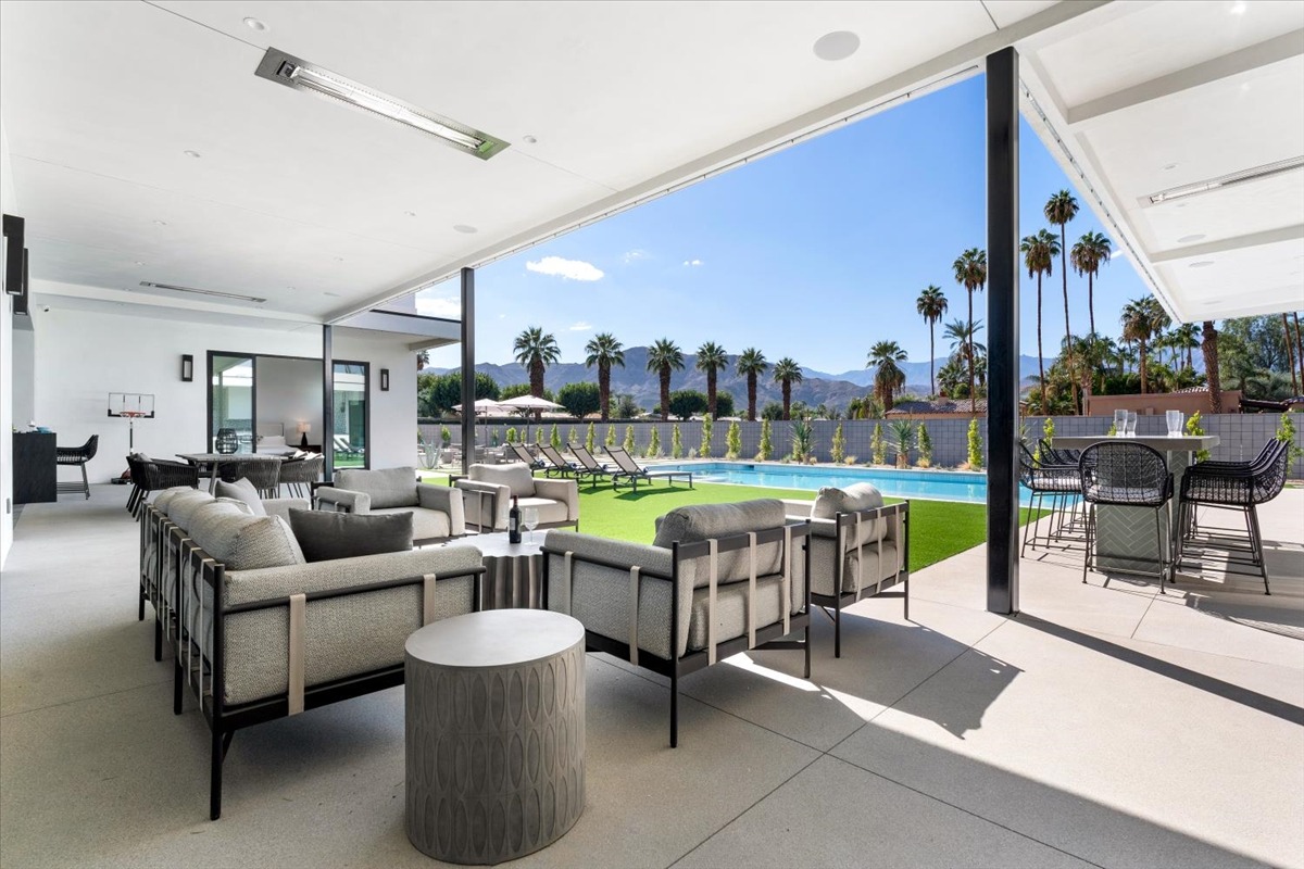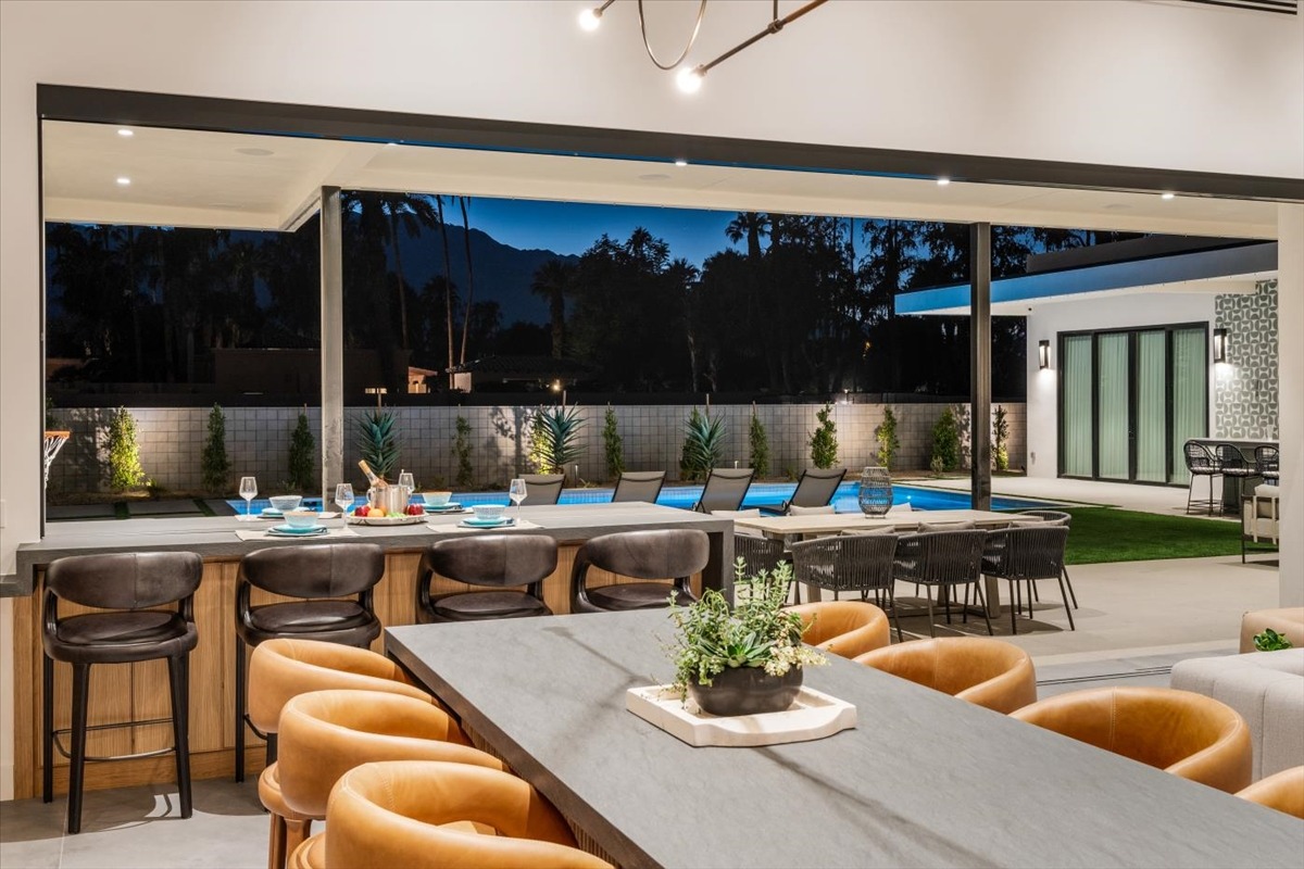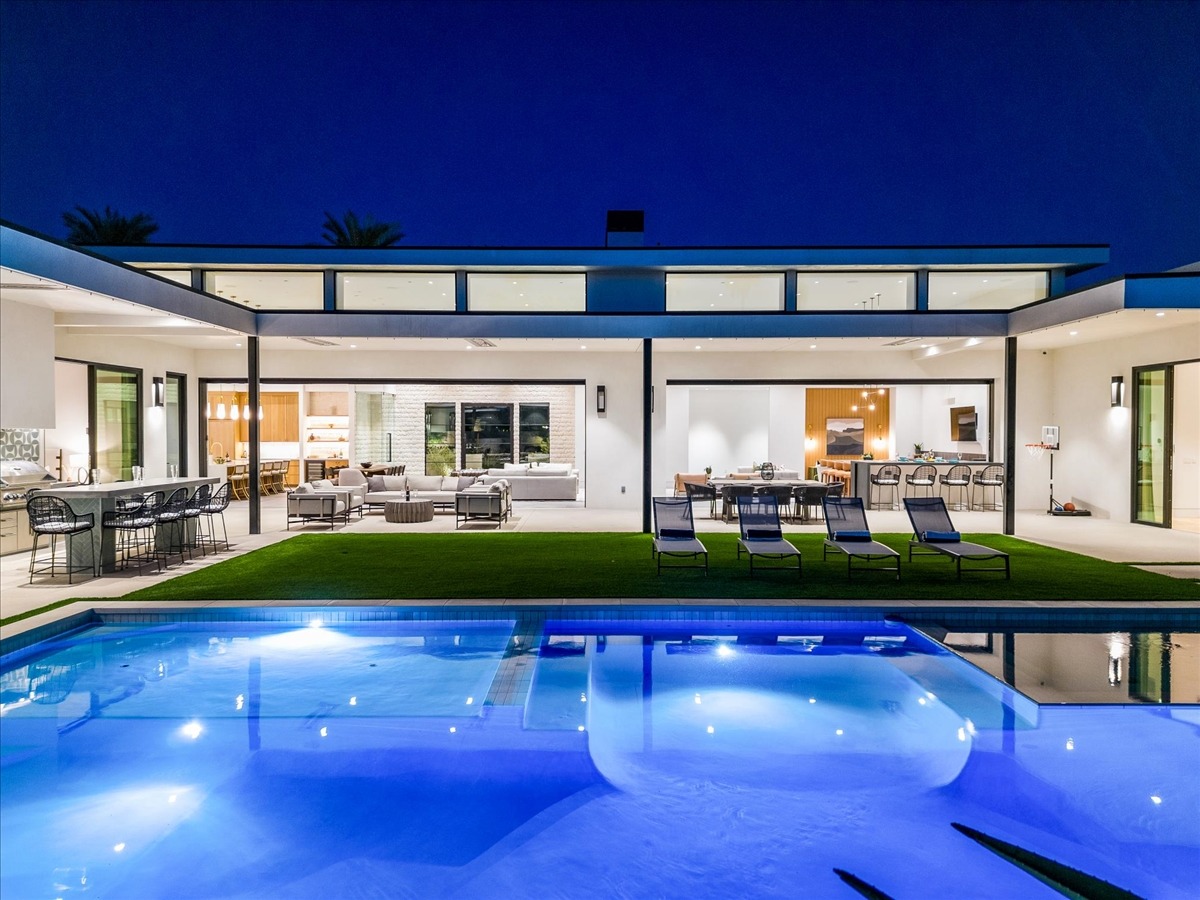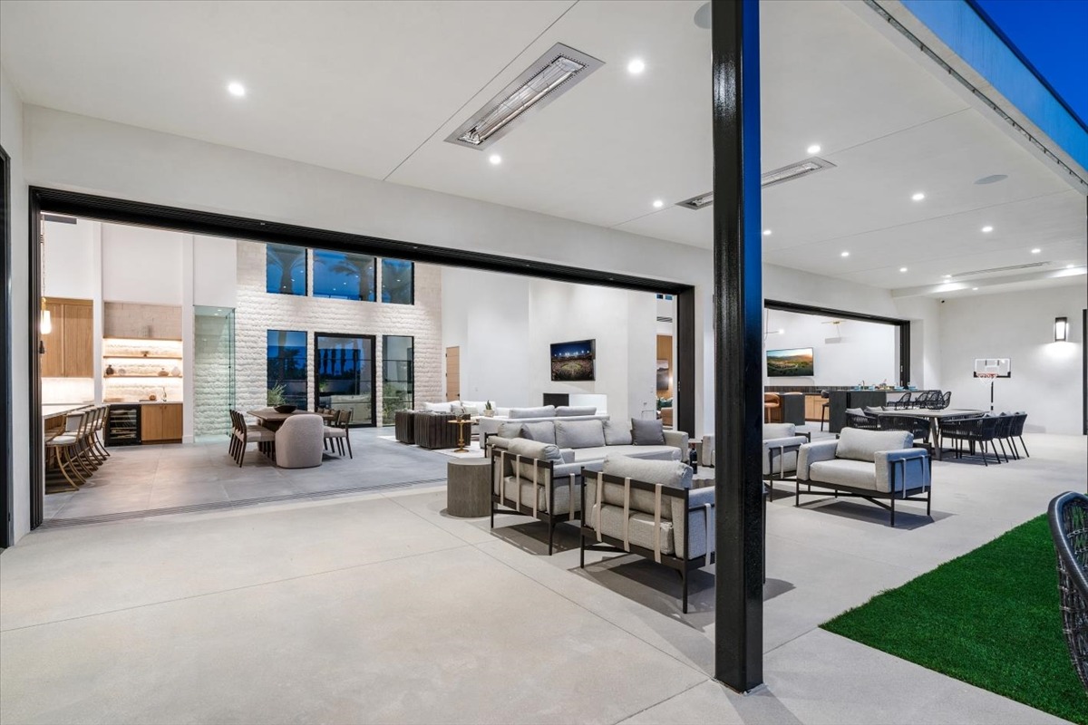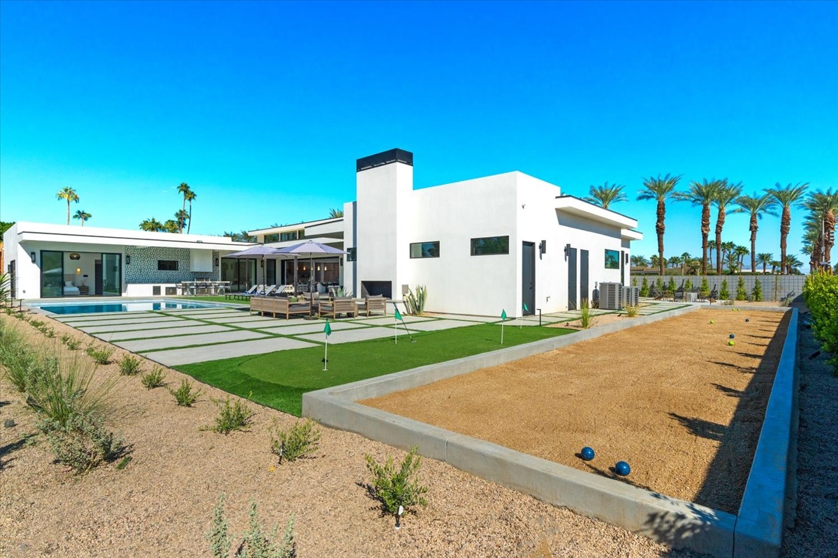 Welcome to one of the most luxurious and spectacular brand new construction vacation rental homes in the desert. This stunning custom vacation brings contemporary luxury with outstanding panoramic views. Every inch of this luxurious house has been created for our more exquisite guest providing maximum comfort and full entertainment. Indoor/outdoor bar, two living room areas, pocket windows/pocket doors, indoor/outdoor fire pits, bocce ball,putting green and much more awaits your family/friends.